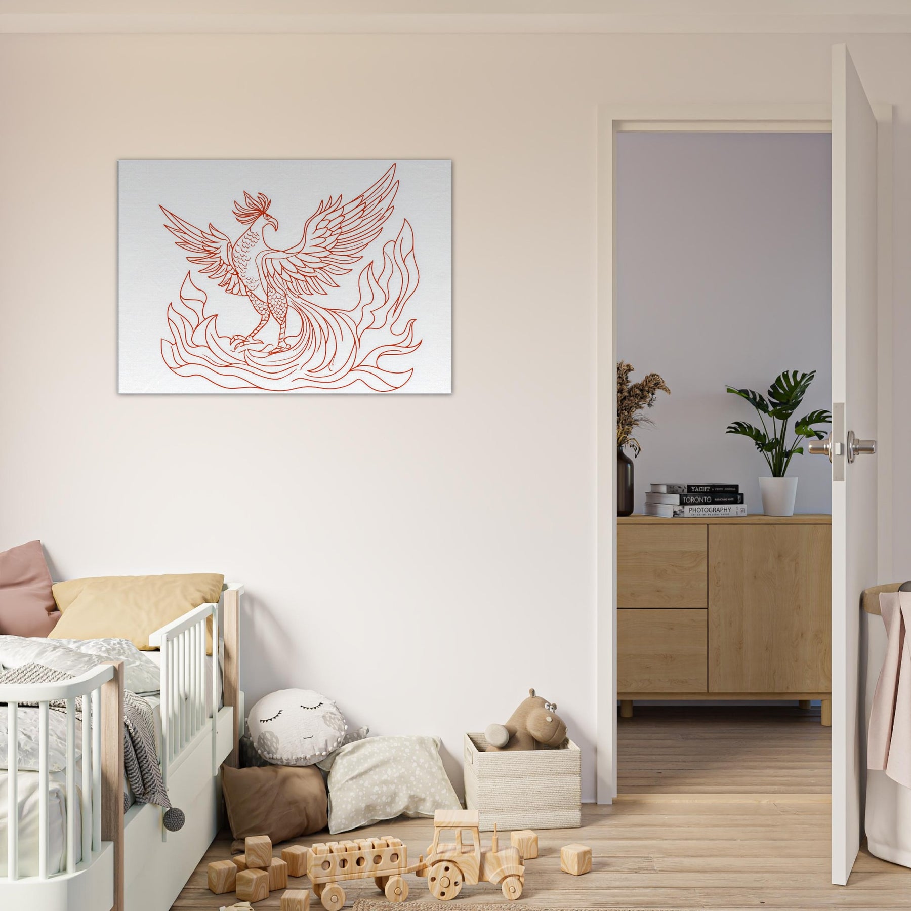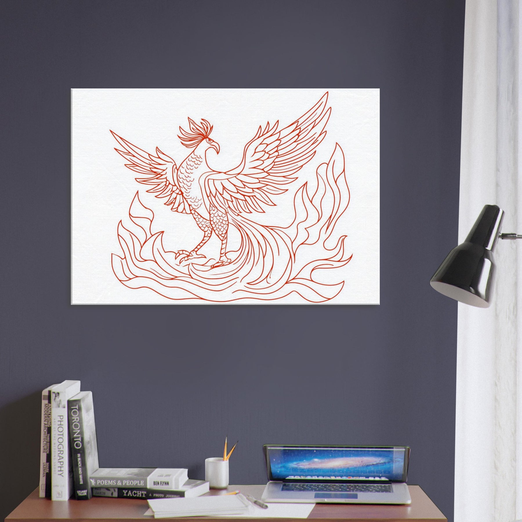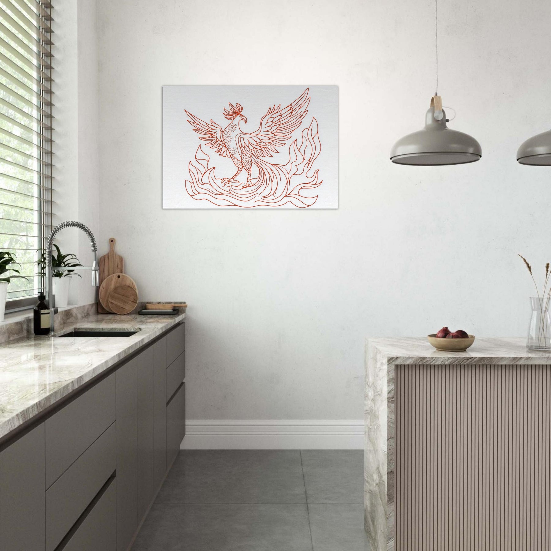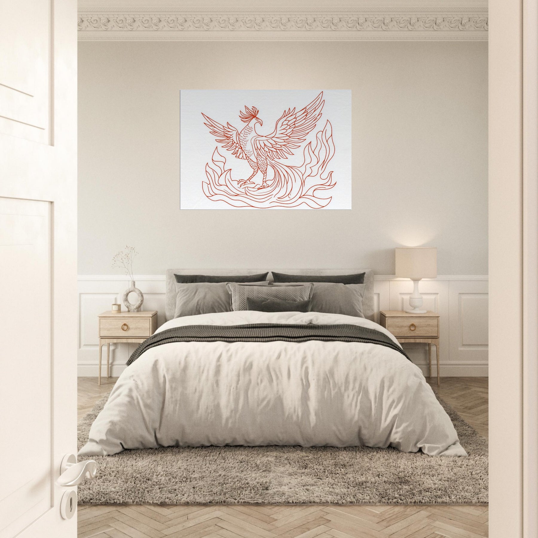 Vermilion Bird of the South Reborn from Sacred Fire unfurls in crisp red lines that glow with ancient energy. The line art silhouette dances above a calm space, its wings tracing the air with quiet drama, as if a fiery omen had settled into your living room. This artwork lends warmth without clutter, inviting contemplation and breath. Sense the heat of ritual flames softened by elegant contour, turning any wall into a portal for myth, memory, and renewal.
