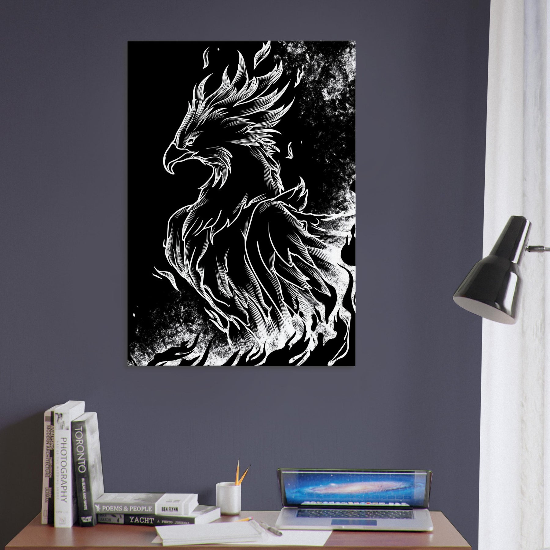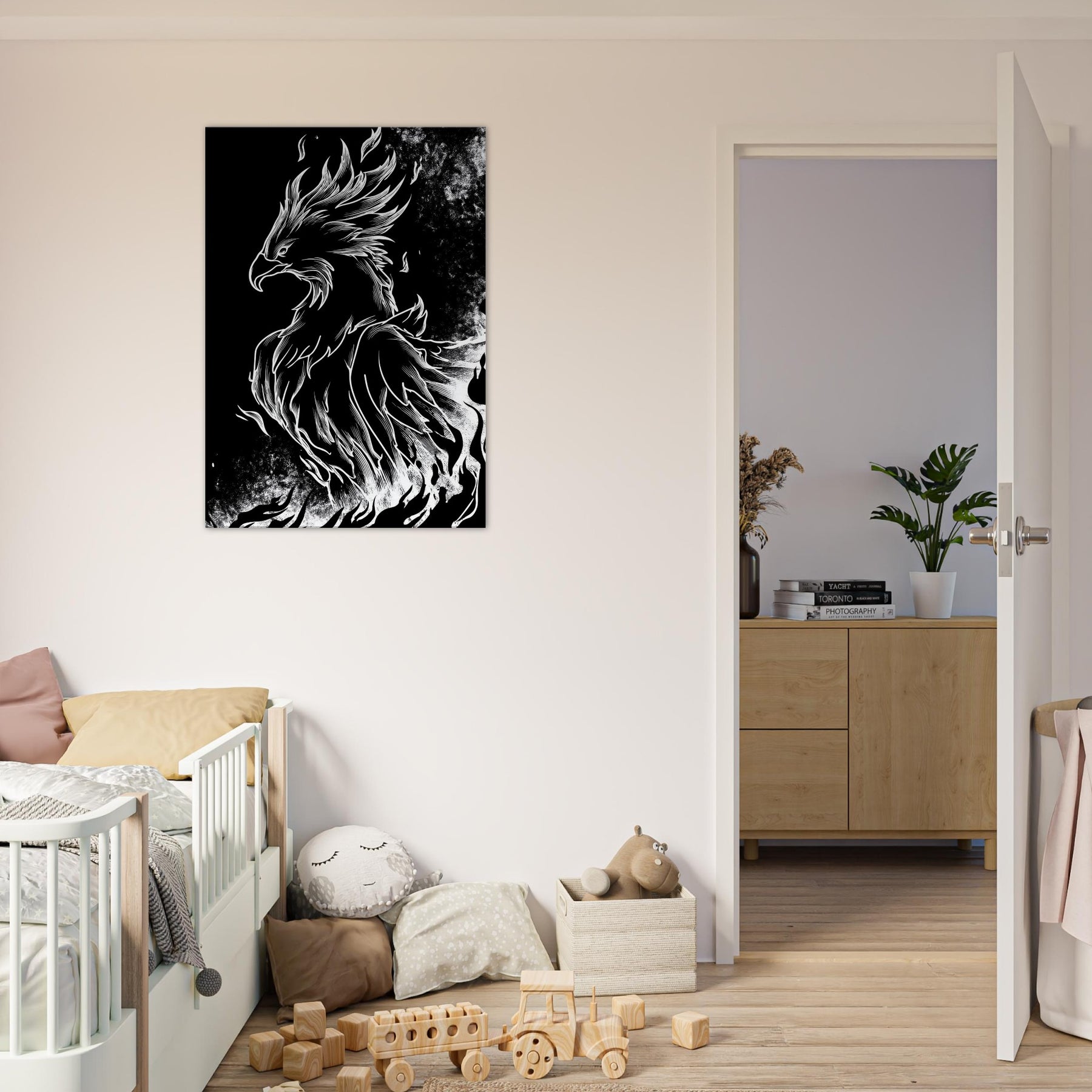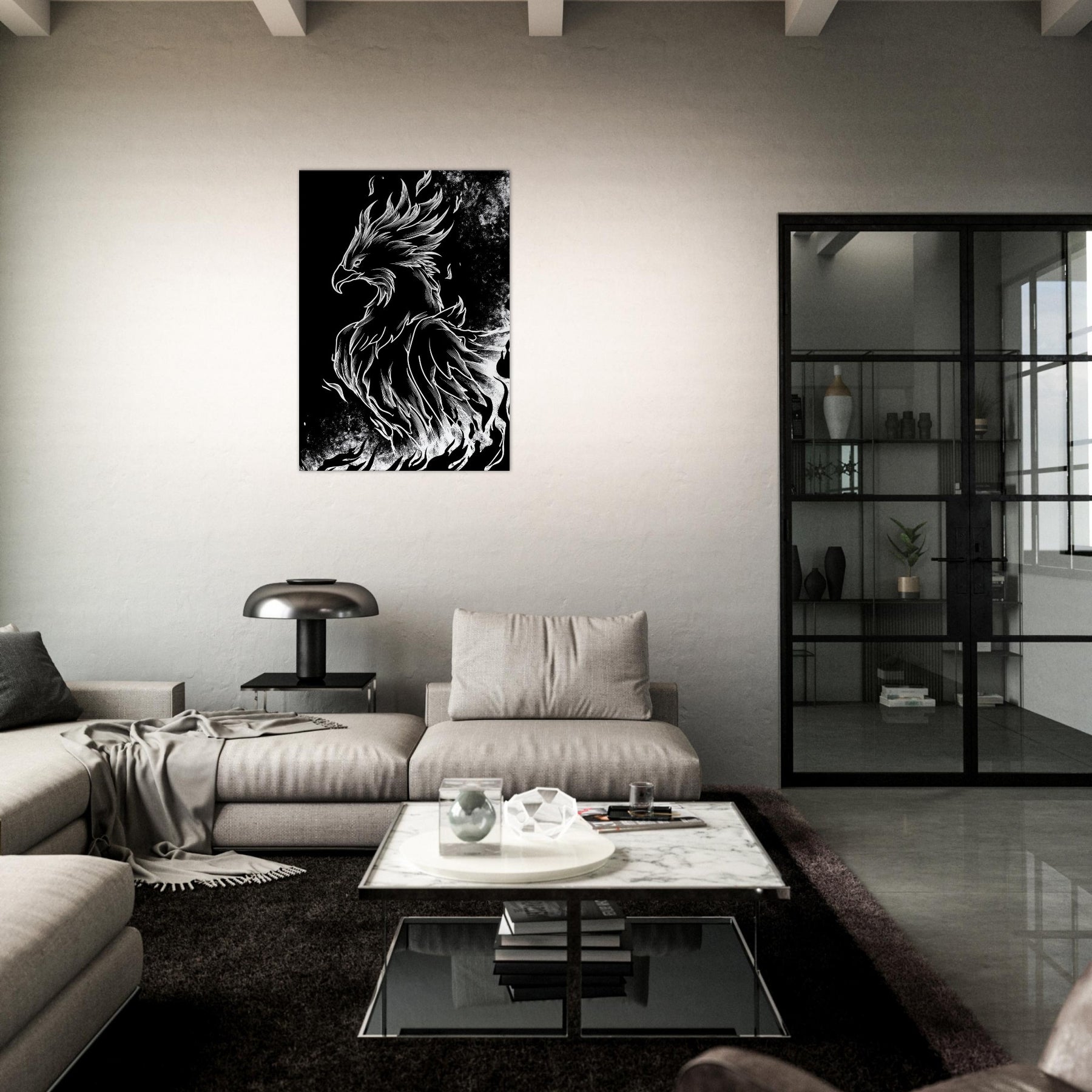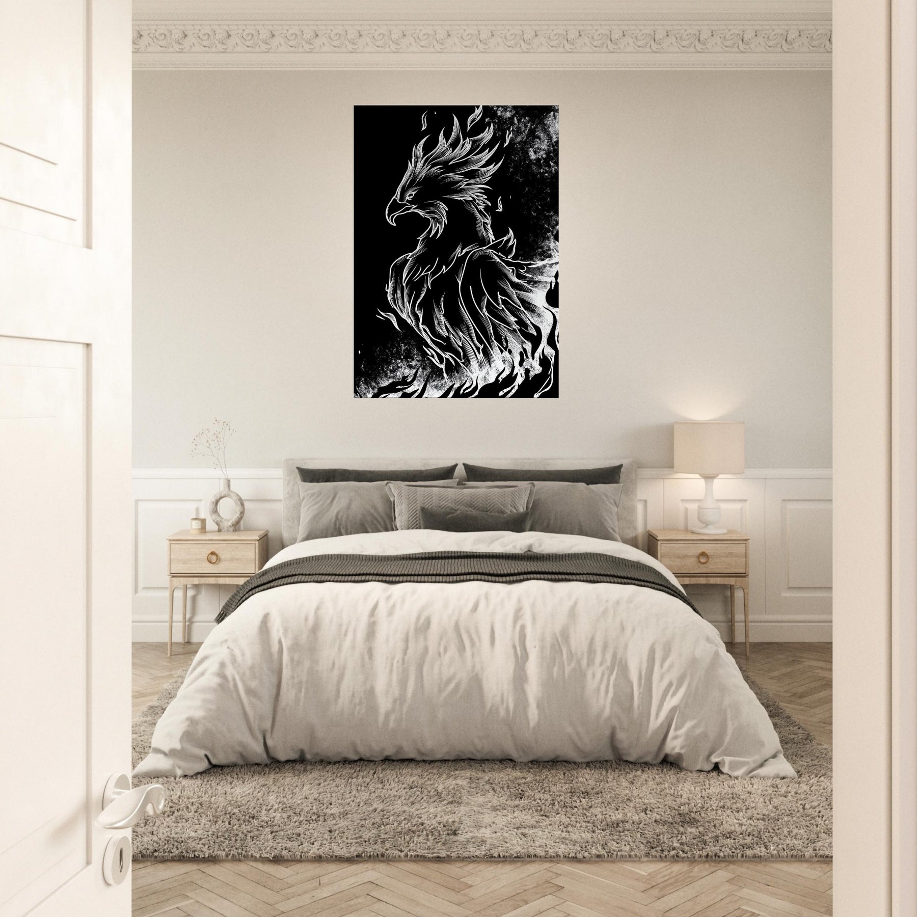 Let the Fiery Phoenix rise from the black, inked horizon with a breath of heat and light. This line art glows in negative space, its white strokes curling like sparks that warm a cool room. Placed above a sofa or in a reading nook, it lends myths and movement to quiet evenings, offering drama without clutter. The artwork invites focus, courage, and renewal a collector's favorite for modern interiors that crave a touch of mythic flame.