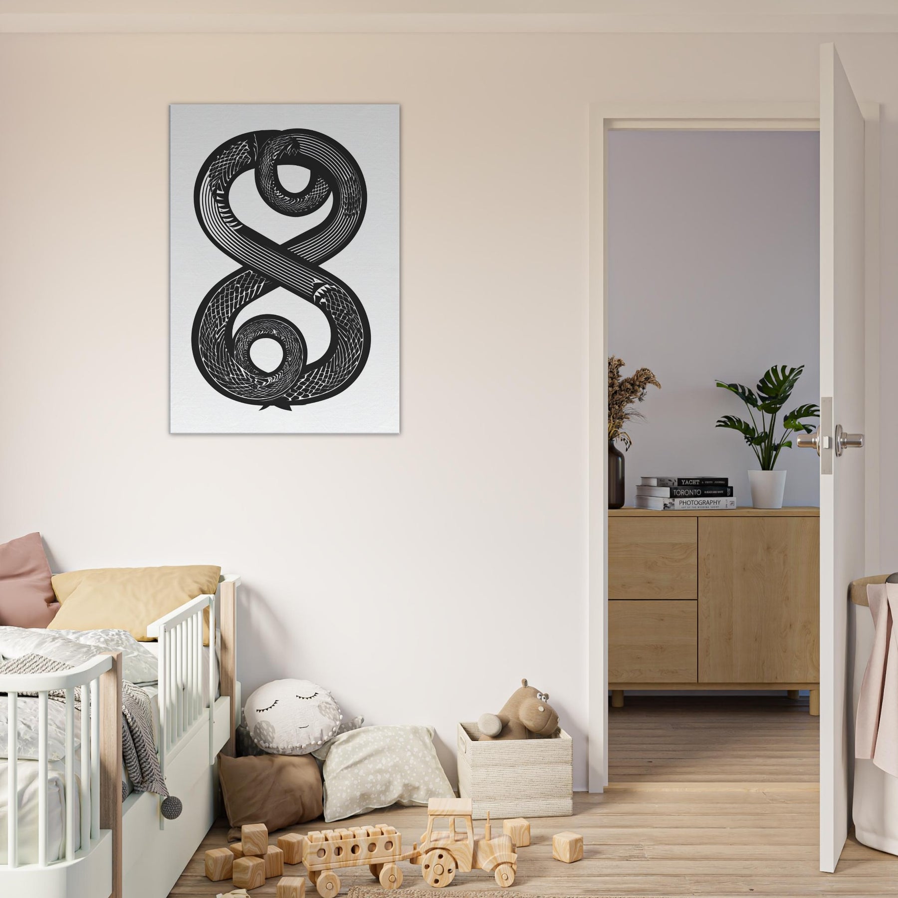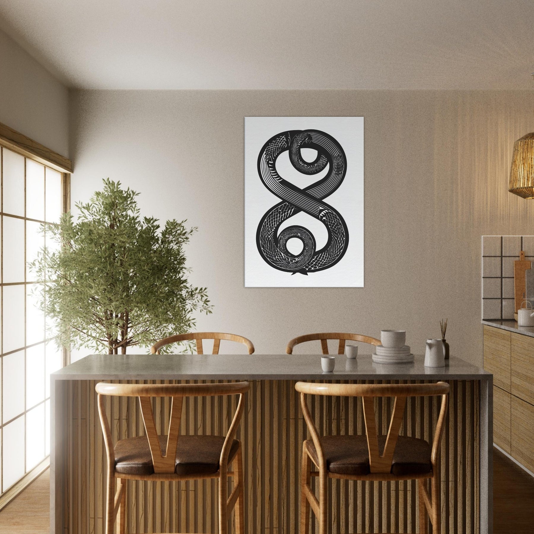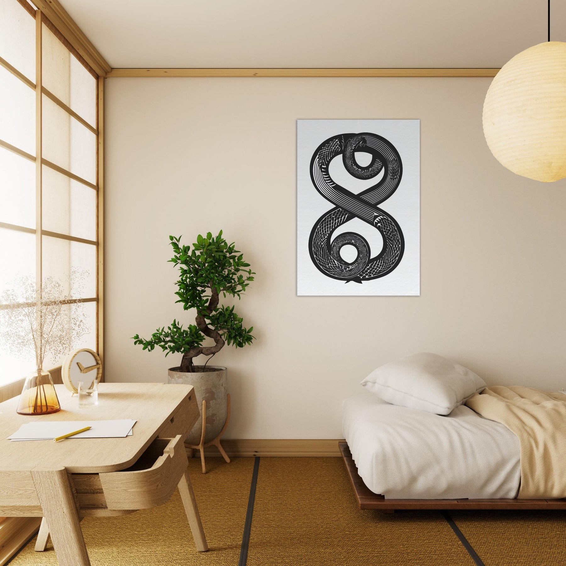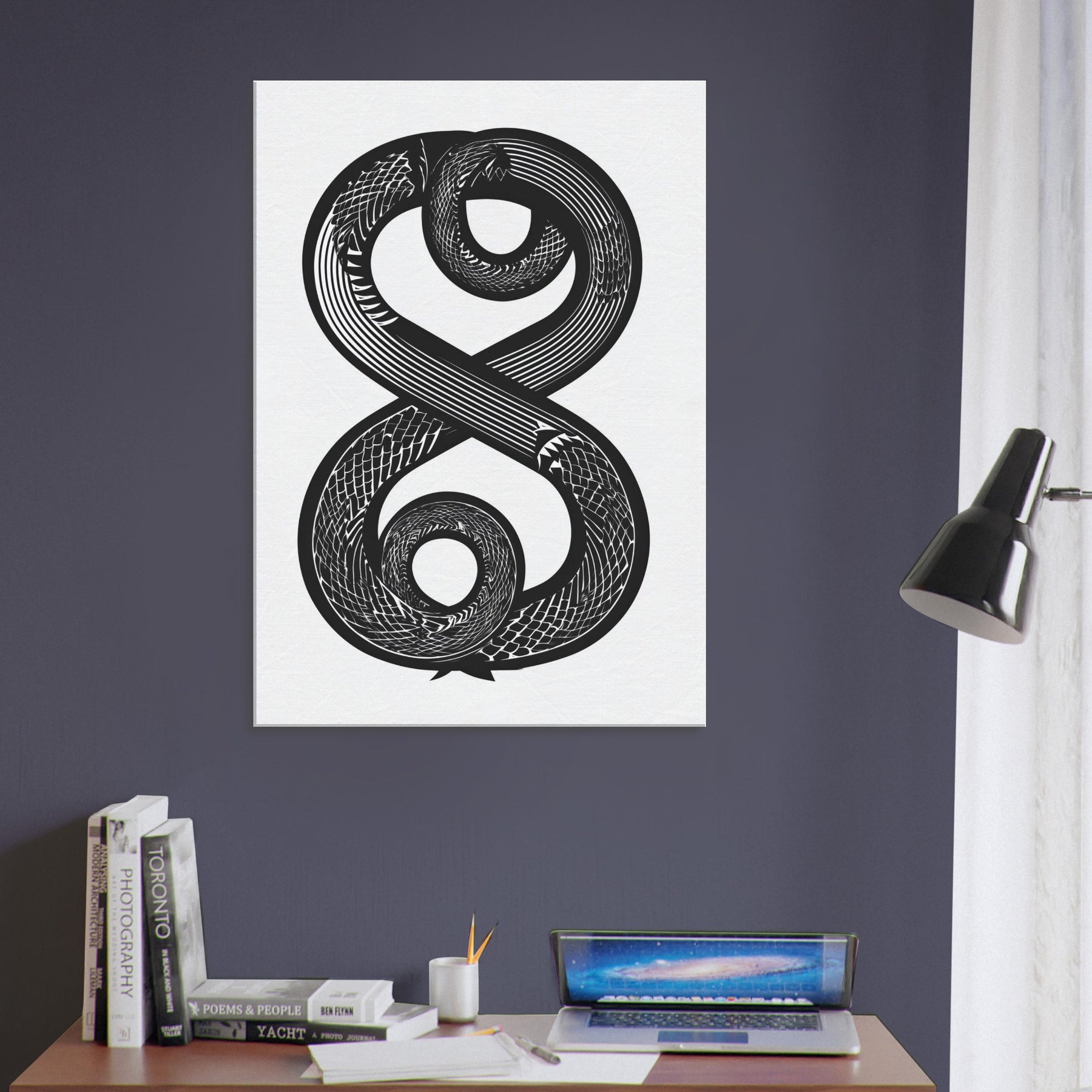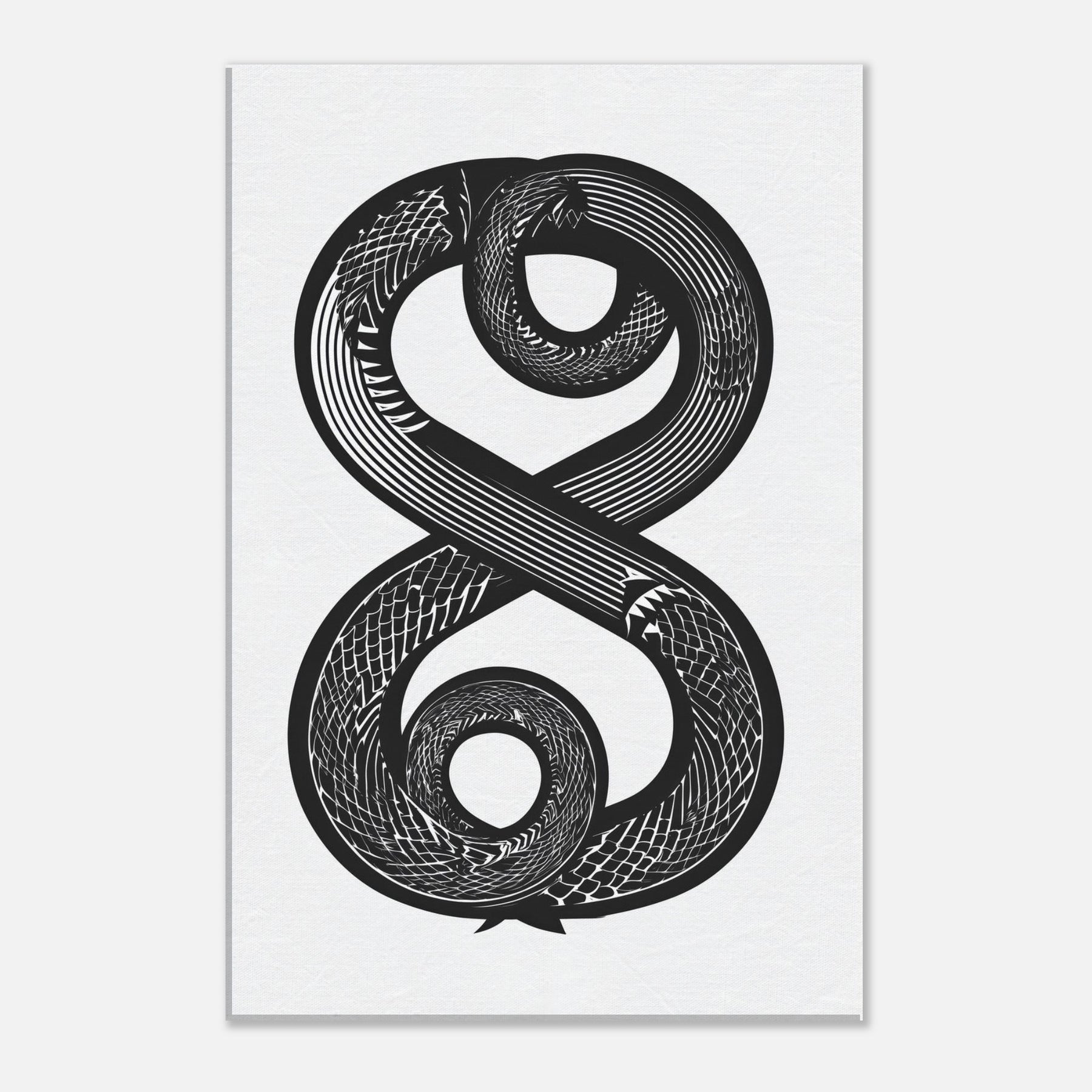 Immerse your space in the hush of ink and motion with the Infinity Serpent. This elegant line art study spirals into an infinite loop, its bold curves weaving a nocturnal rhythm across white space. The piece invites calm focus, turning a wall into a meditative horizon perfect above a sofa, in a hallway, or beside a reading nook. Its monochrome contrast adds depth without noise, making the room feel both timeless and awake, as if the serpent trails light through shadow.