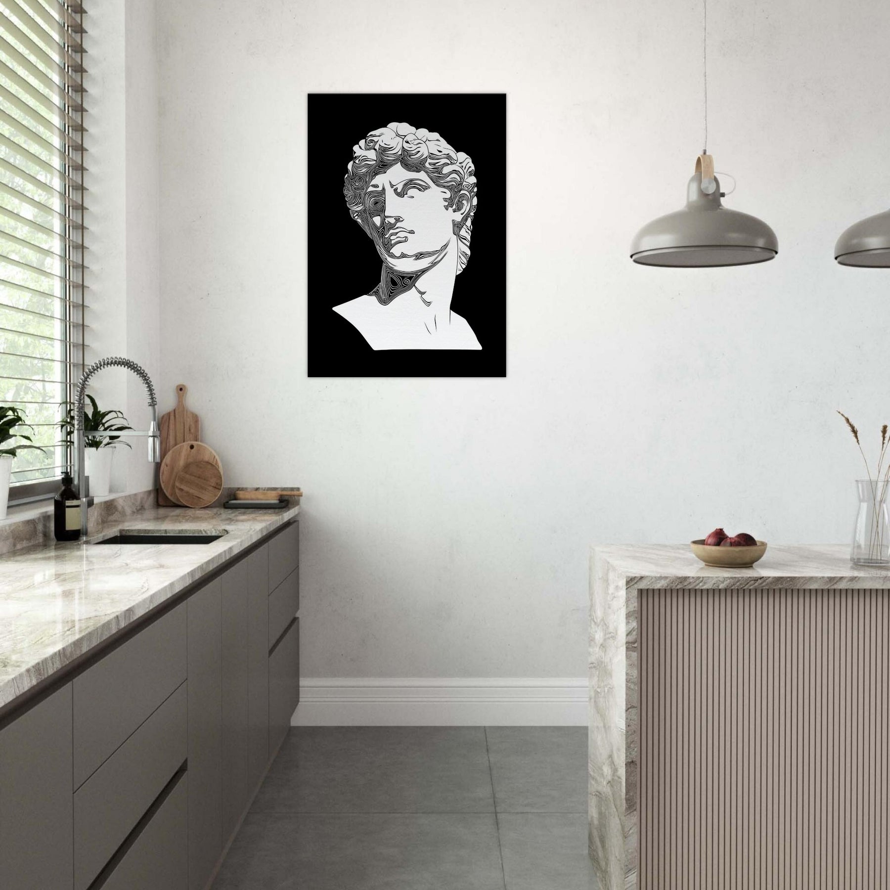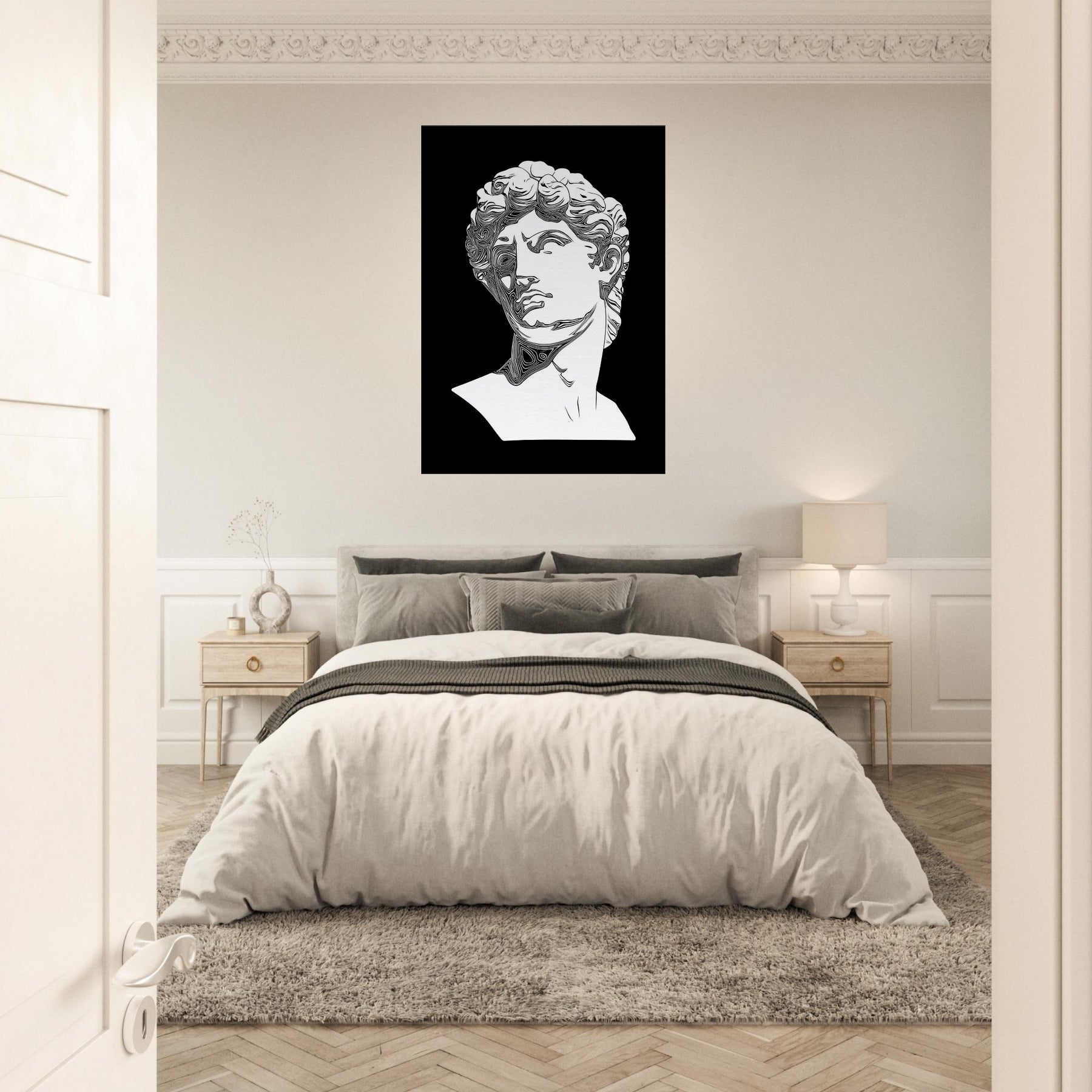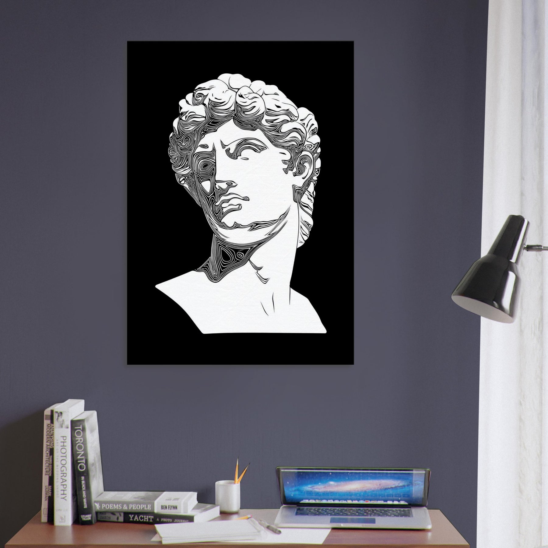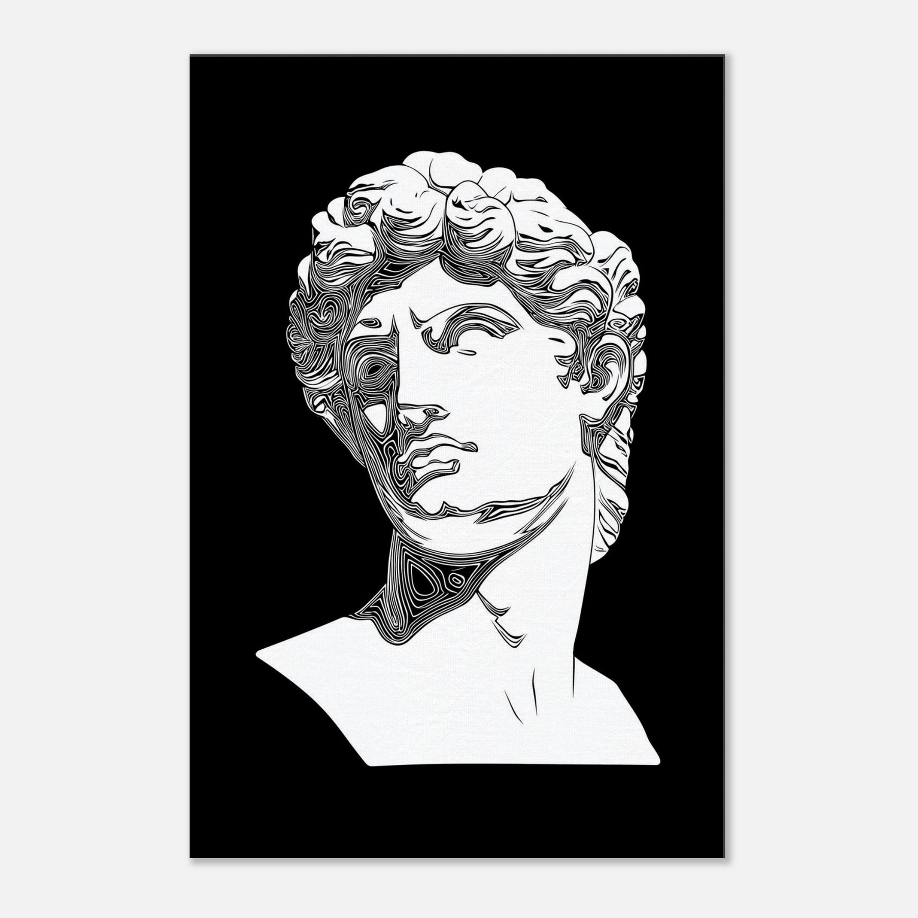 Venus and David appear in a timeless line drawing, their classical profiles etched in clean, monochrome contours. The restrained elegance creates a quiet, reflective mood, turning any wall into a stage for myth and memory. Perfect for a living room or study, this piece invites slow gaze and soft conversation as light skim across its curves. It lends architectural grace and a cool, poetic aura, inviting you to linger with beauty made present. The central subject is Mythical Figures (Venus, David).