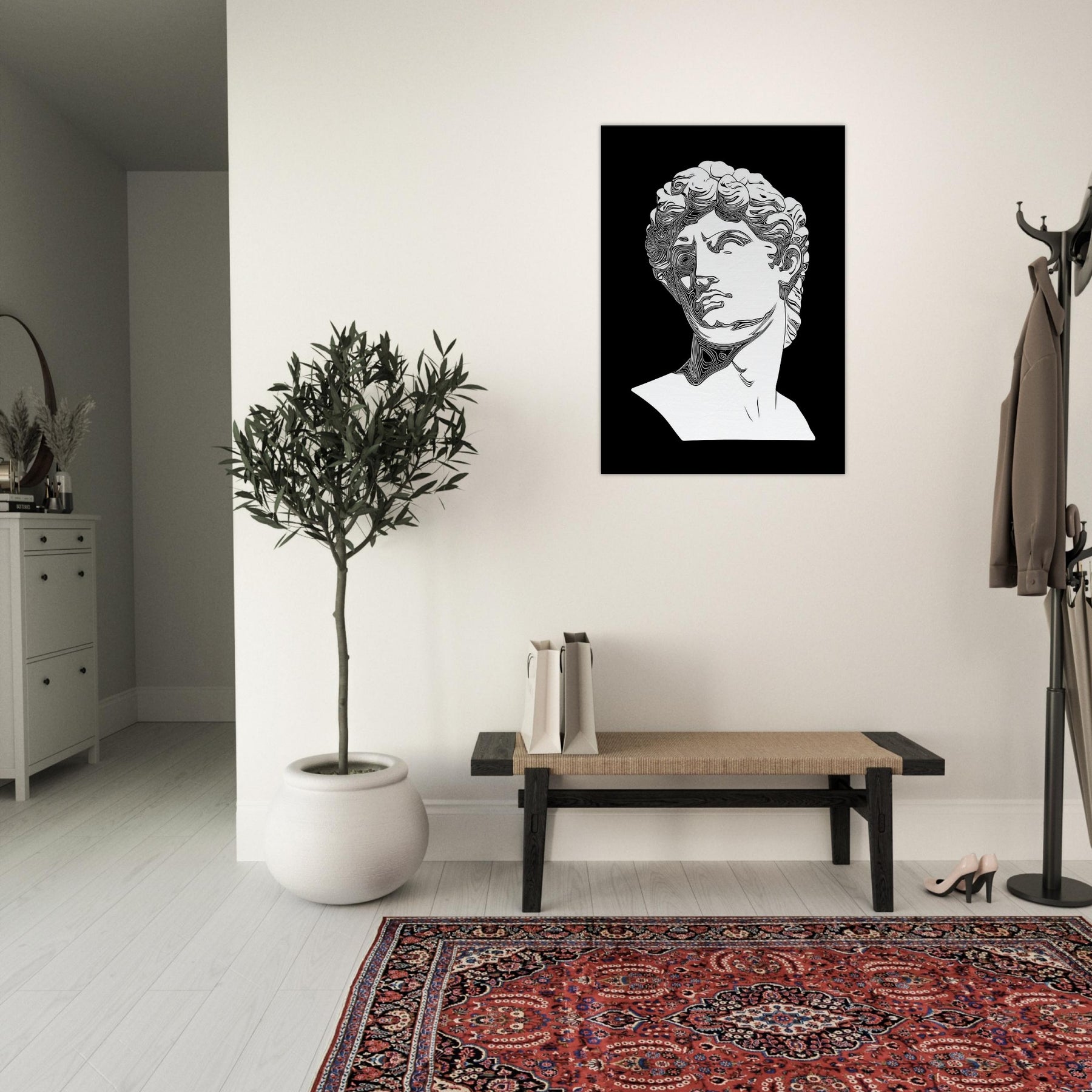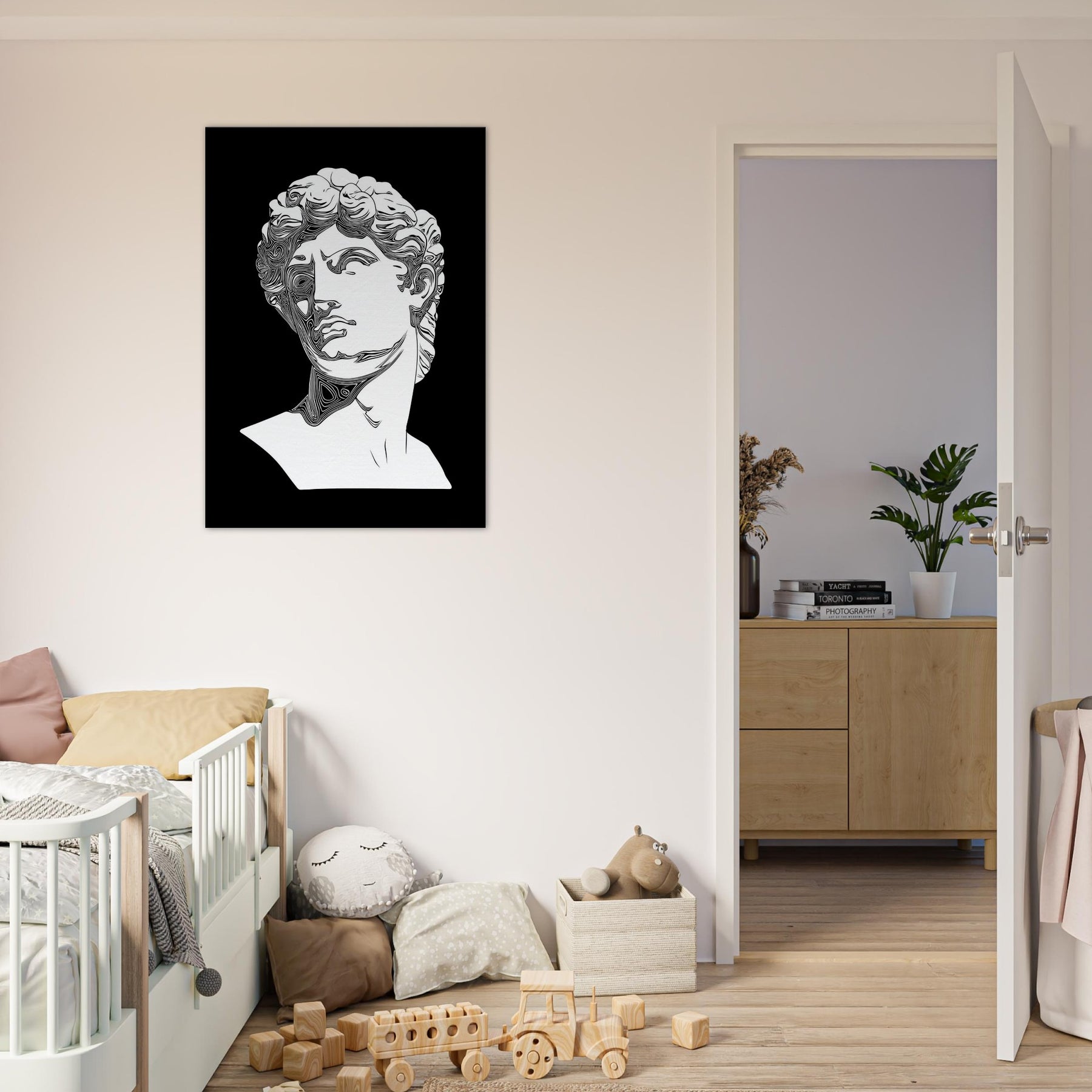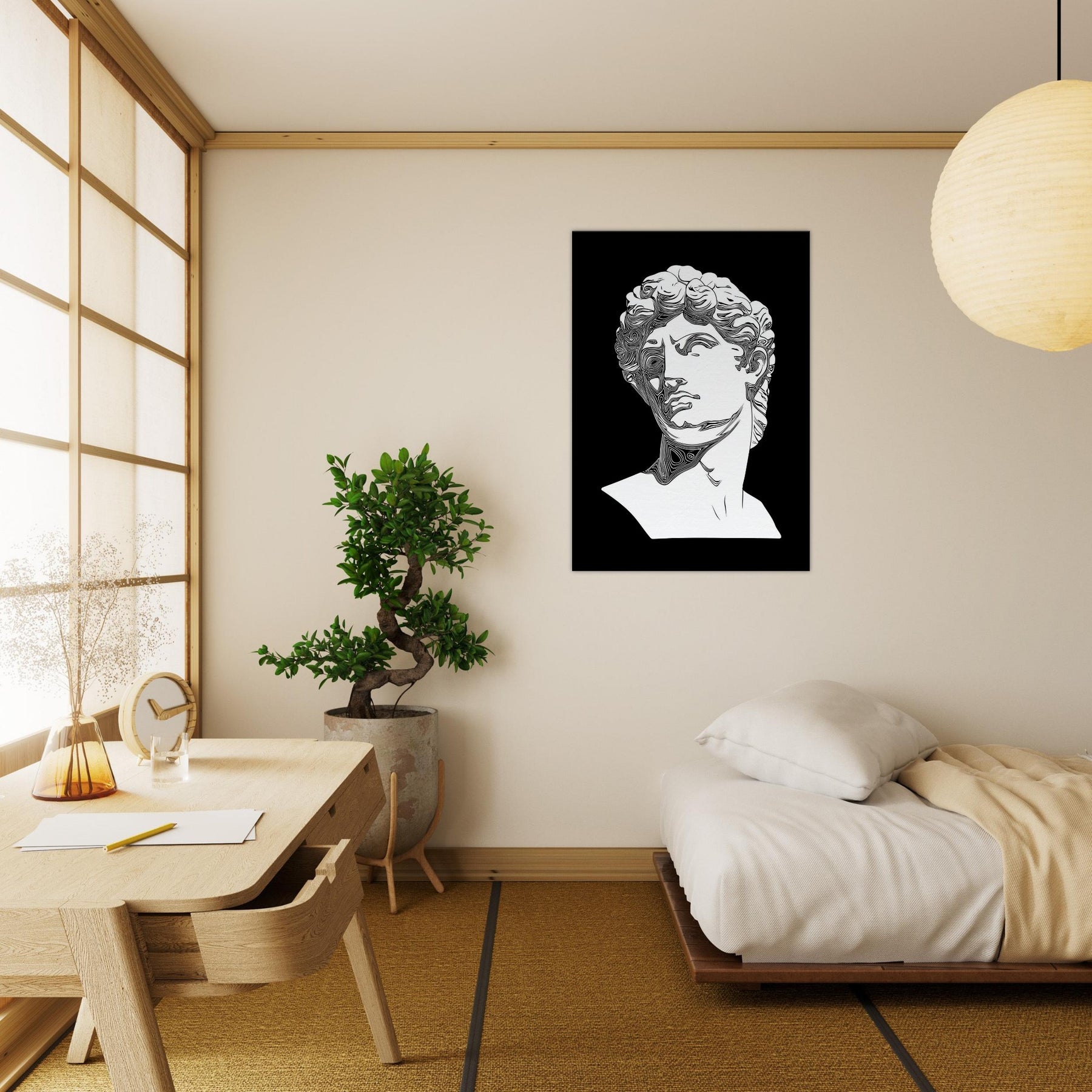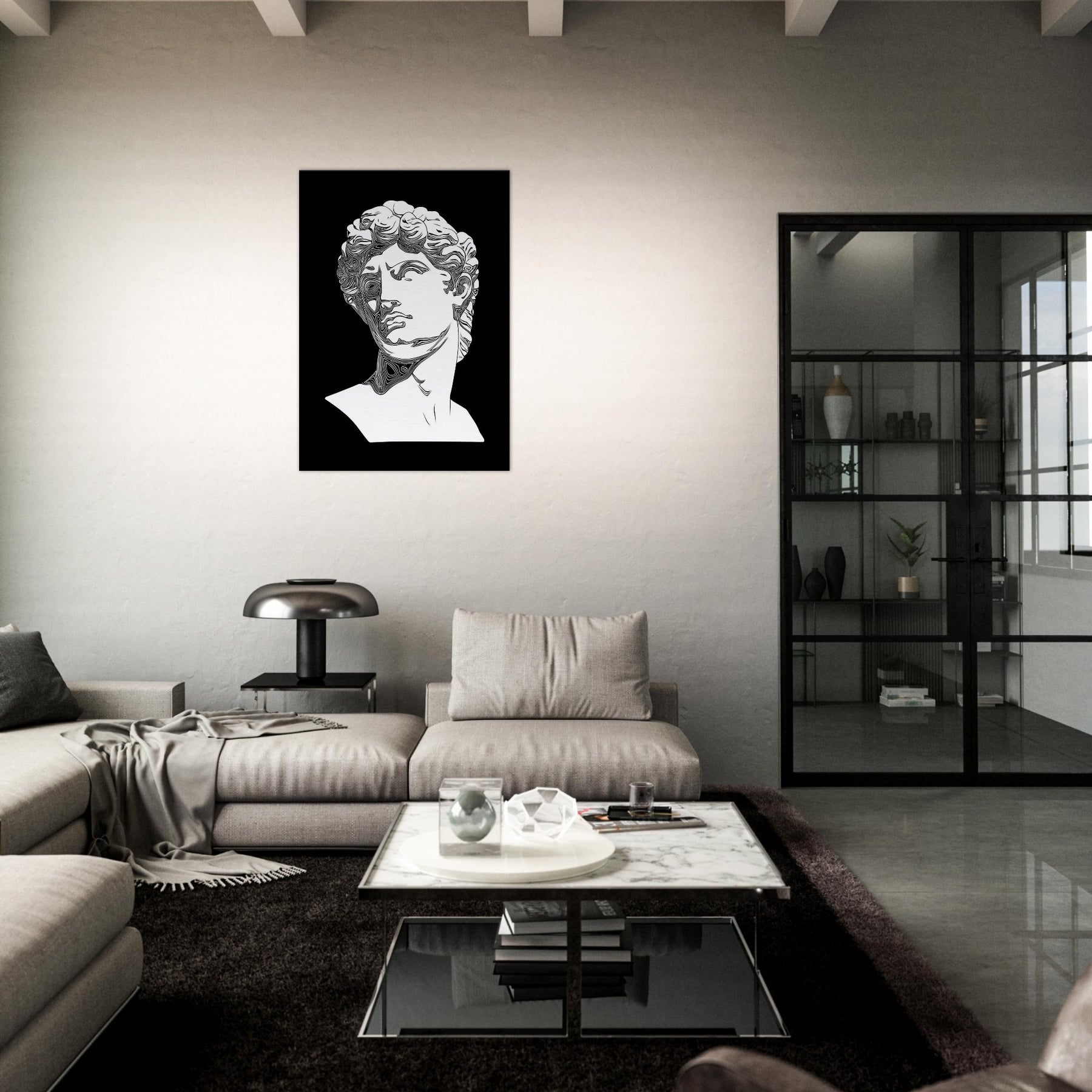 Venus and David appear in a timeless line drawing, their classical profiles etched in clean, monochrome contours. The restrained elegance creates a quiet, reflective mood, turning any wall into a stage for myth and memory. Perfect for a living room or study, this piece invites slow gaze and soft conversation as light skim across its curves. It lends architectural grace and a cool, poetic aura, inviting you to linger with beauty made present. The central subject is Mythical Figures (Venus, David).