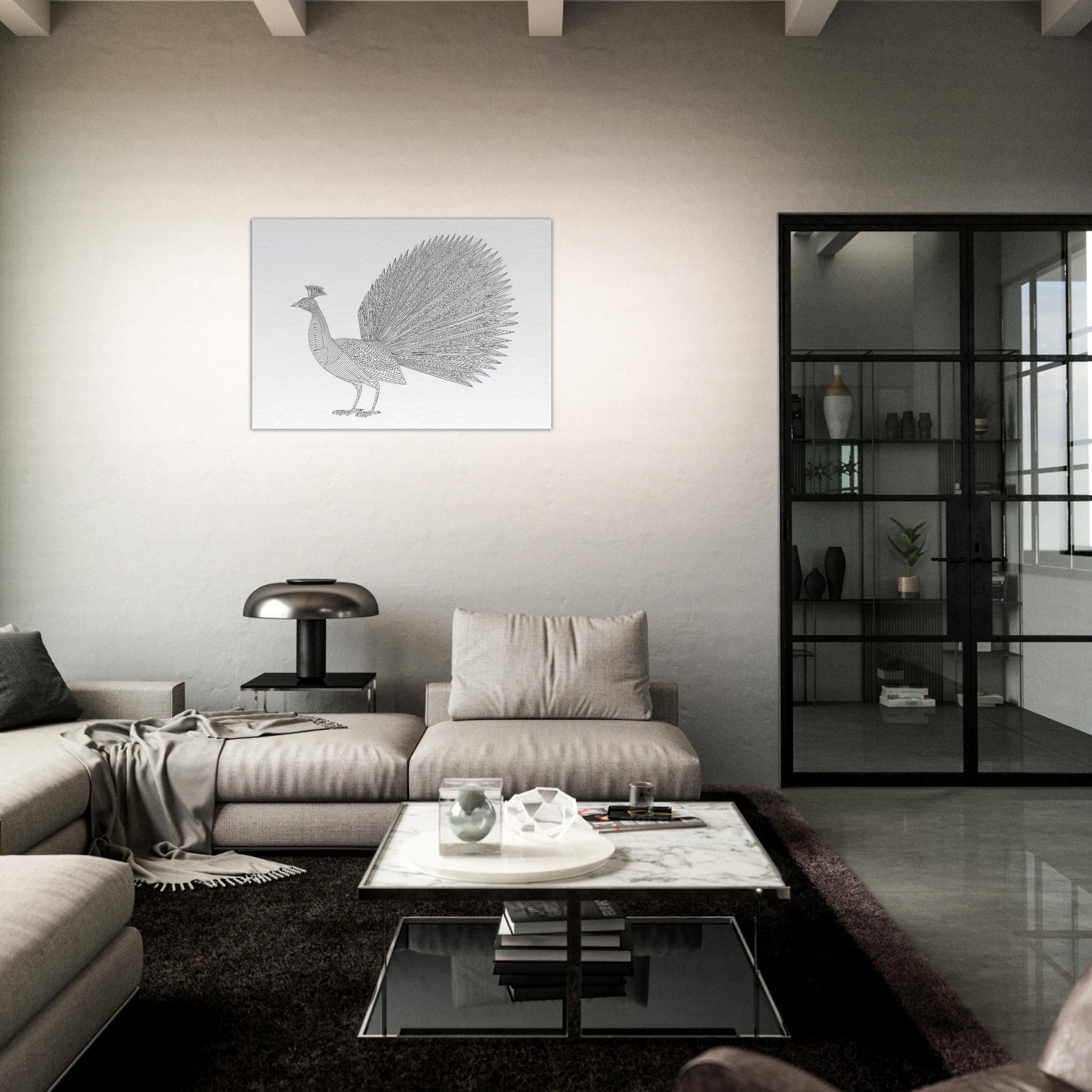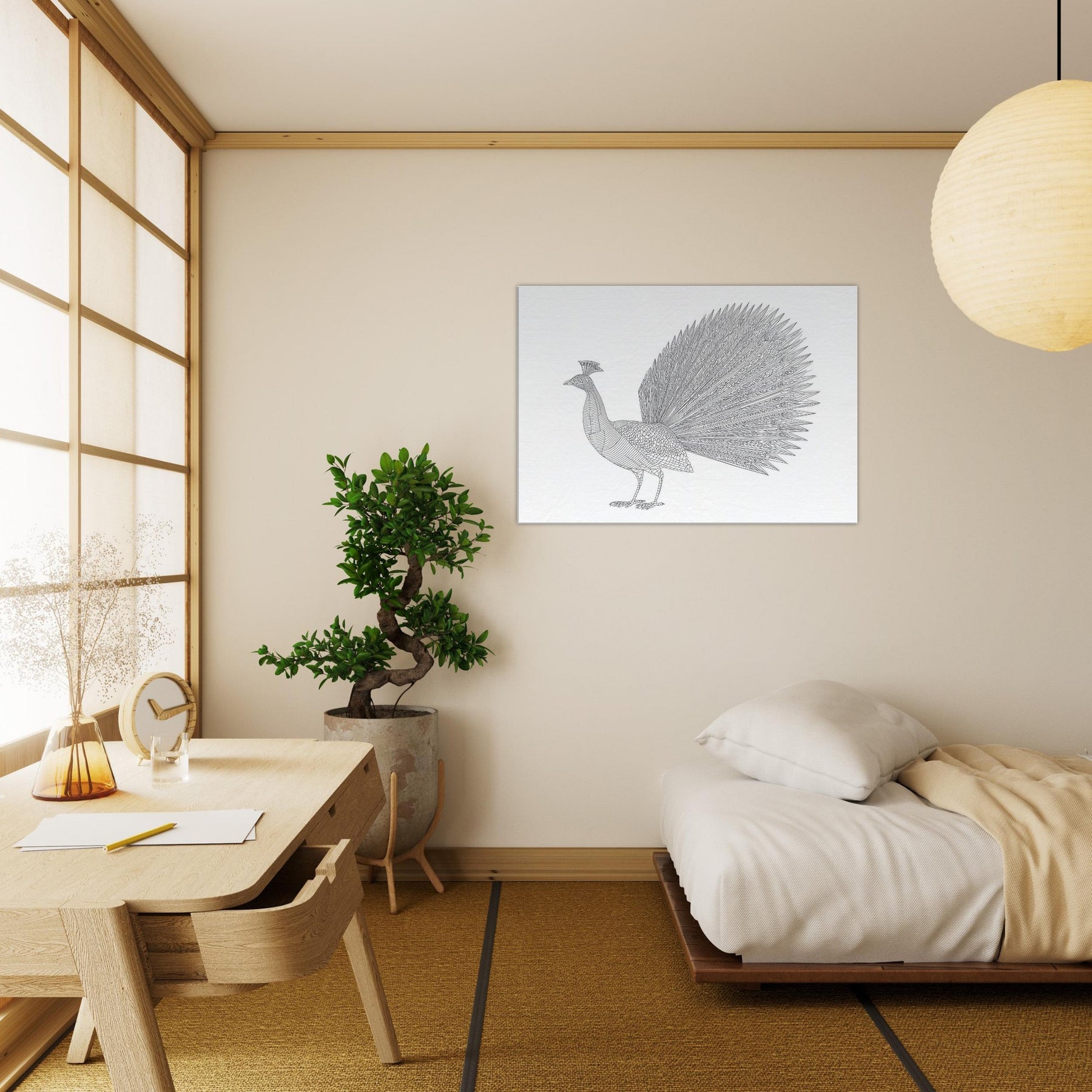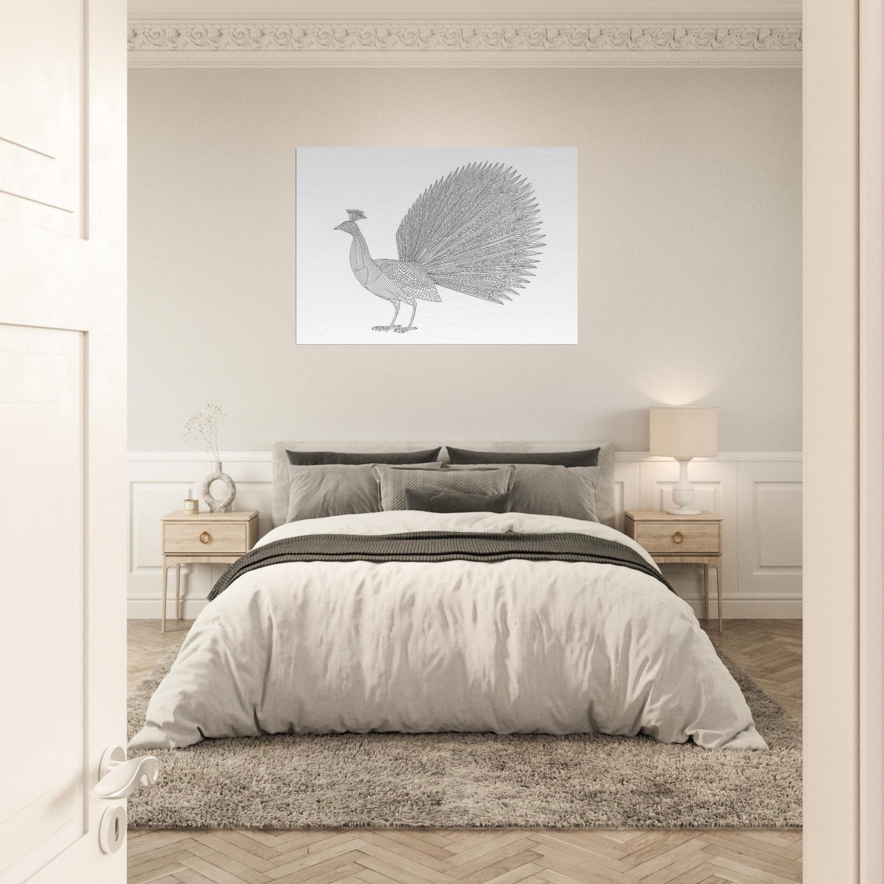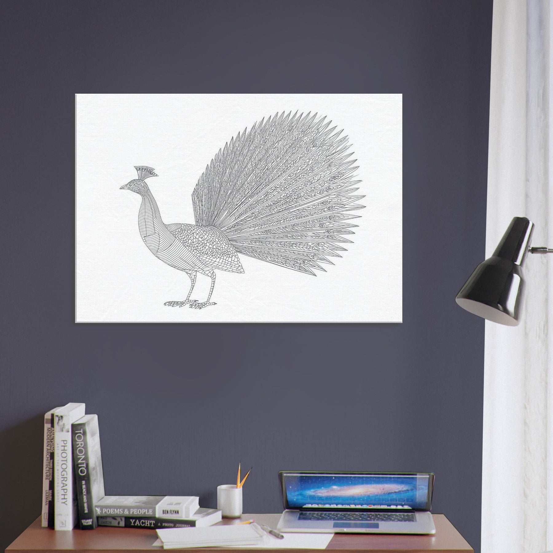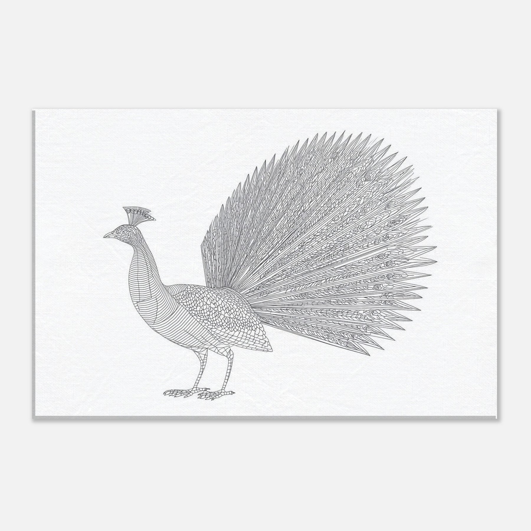 Rise to quiet grandeur with this minimalist rendering of a Peacock. Crafted from clean, continuous lines, the composition captures the bird's poised grace from the carriage of its neck to the fan of iridescent plumes, distilled into a single, refined silhouette. The generous white space invites calm, while the intricate feather pattern adds texture without clutter. Perfect for a living room or study, it lends a serene focal point, a whisper of nature that elevates minimalist interiors with timeless elegance.