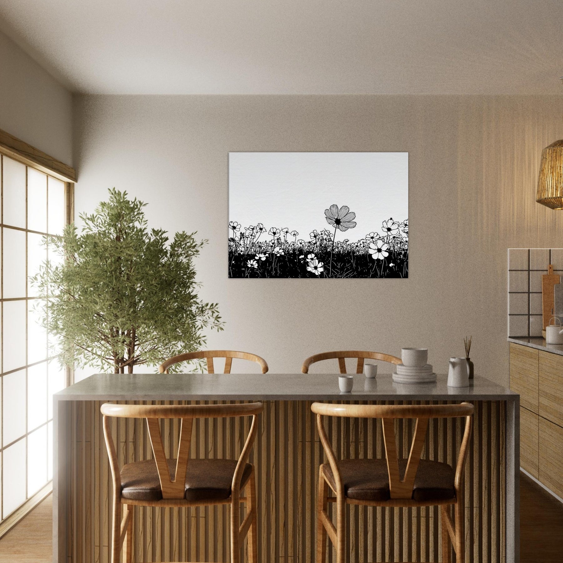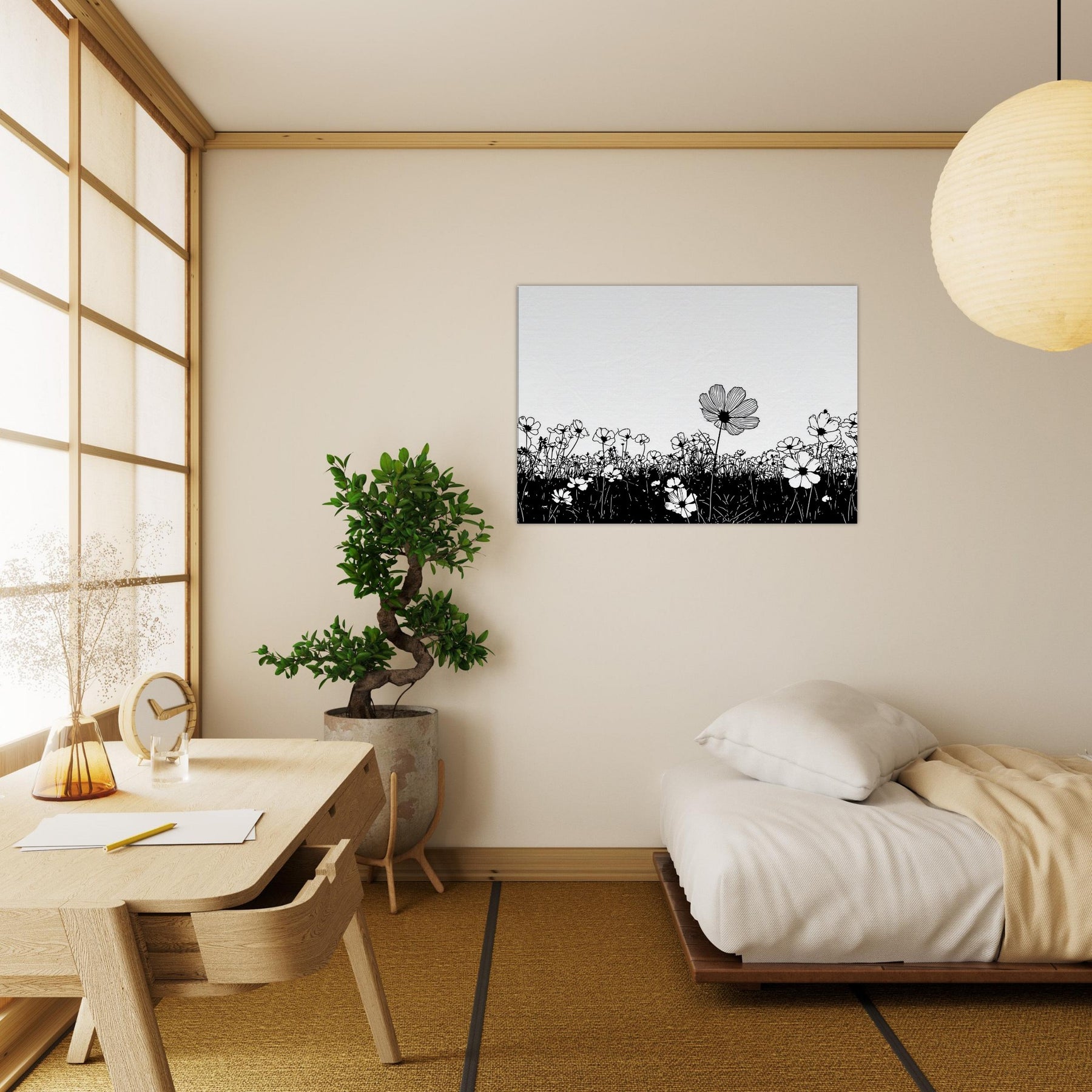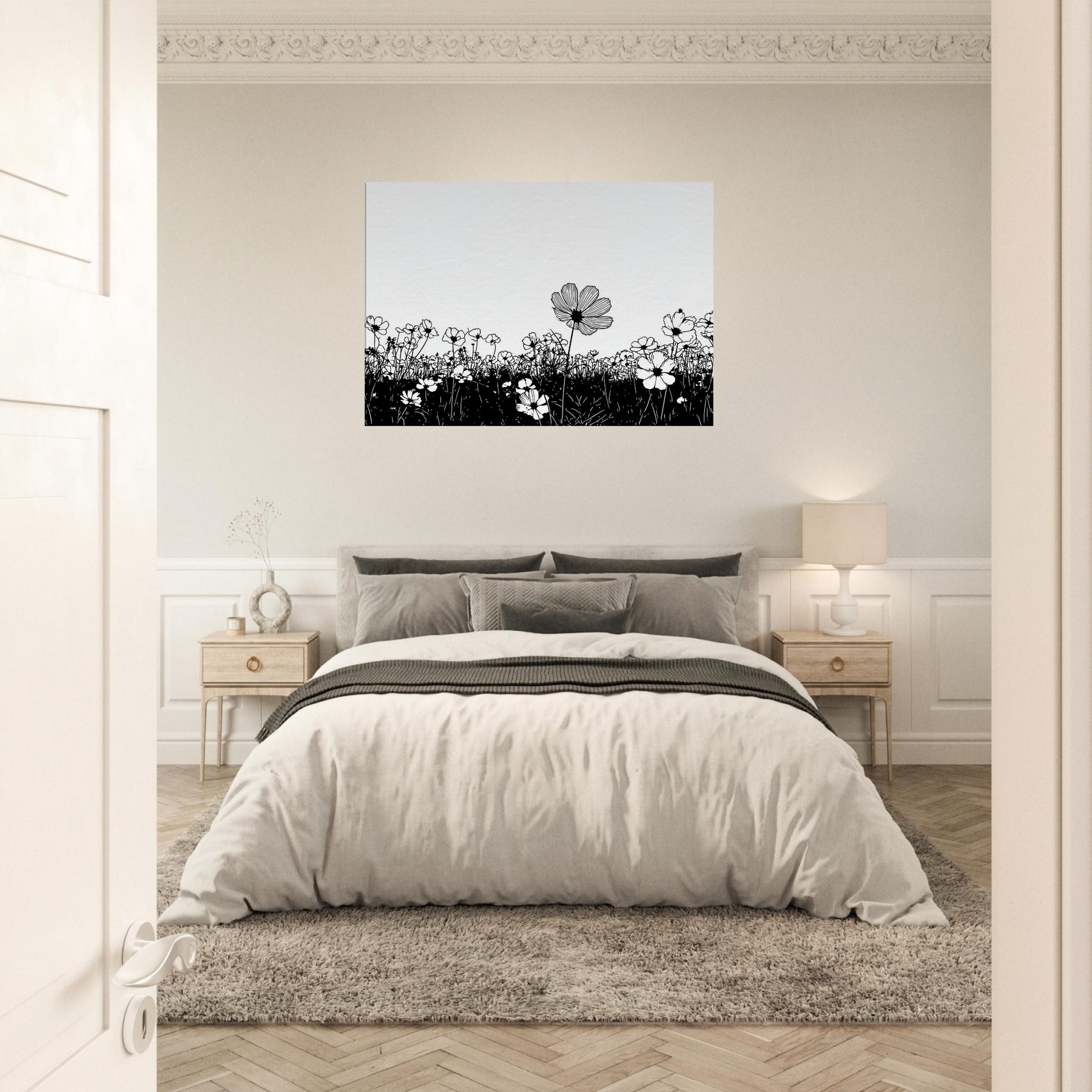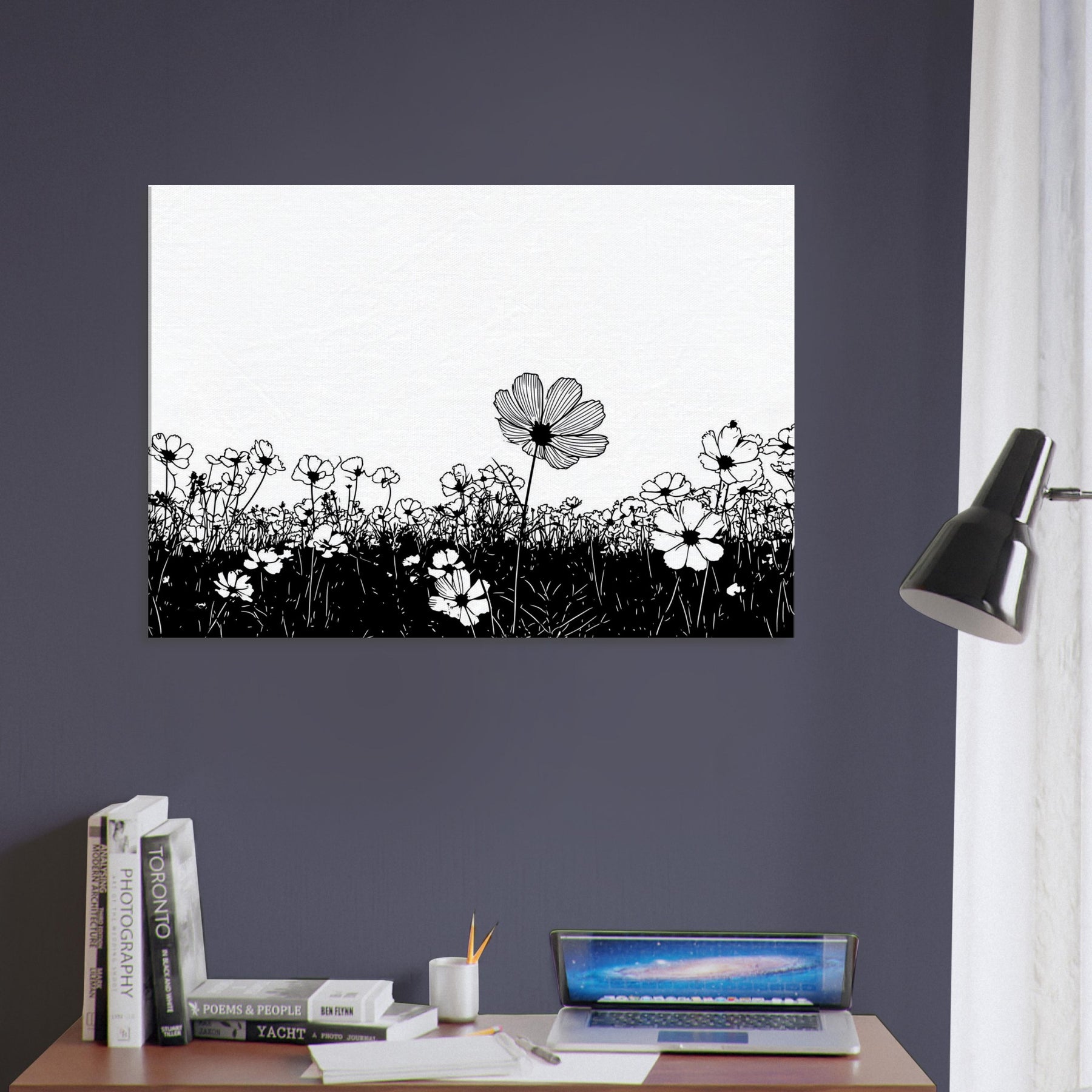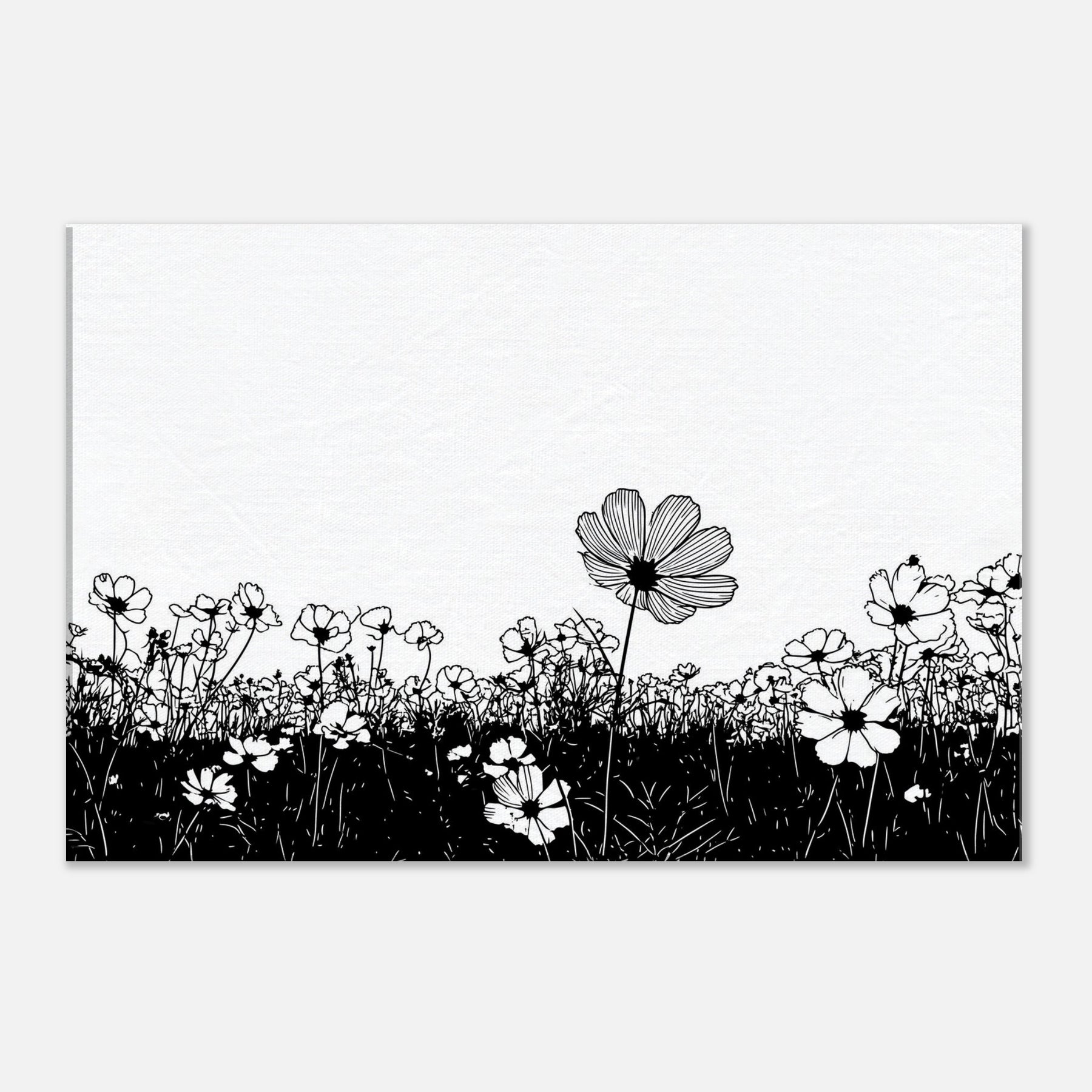 Like a breath drawn across a quiet horizon, this Flower Field in line art captures nature with delicate grace. The slender black outlines rise from a ink dark meadow, surrendering to unspoken light that fills the page. It elevates a room with calm, contemporary rhythm, inviting contemplation and everyday wonder. Perfect above a sofa or in a quiet corner, it pairs minimal contrast with generous air, turning walls into a serene field where memory and garden breeze mingle.