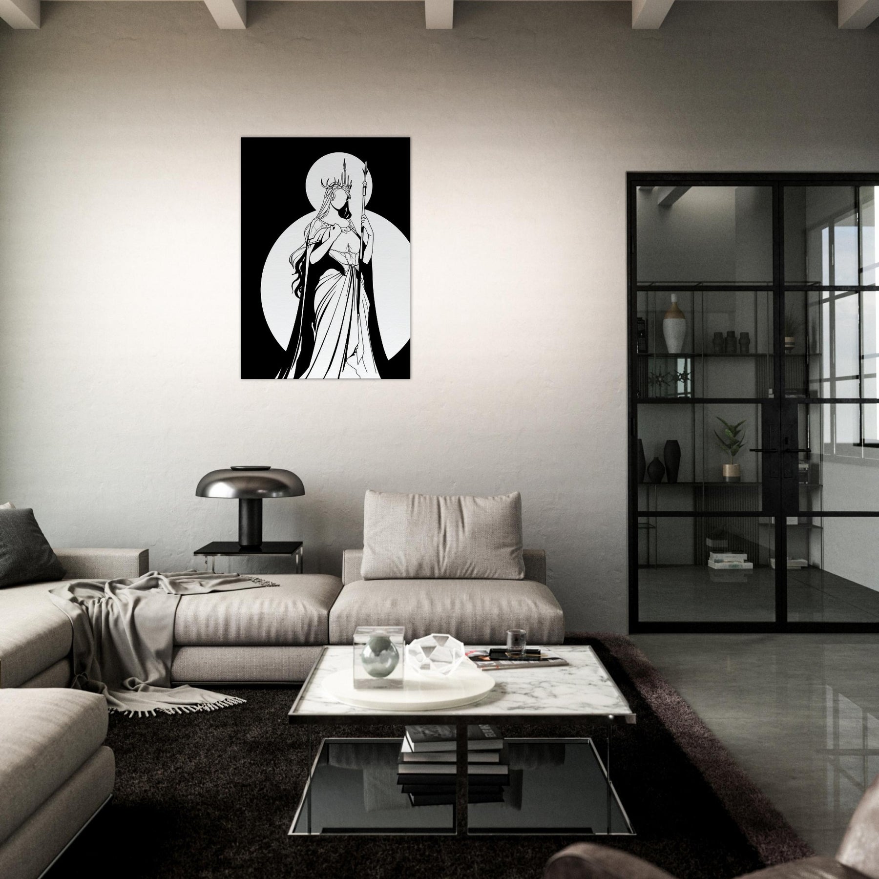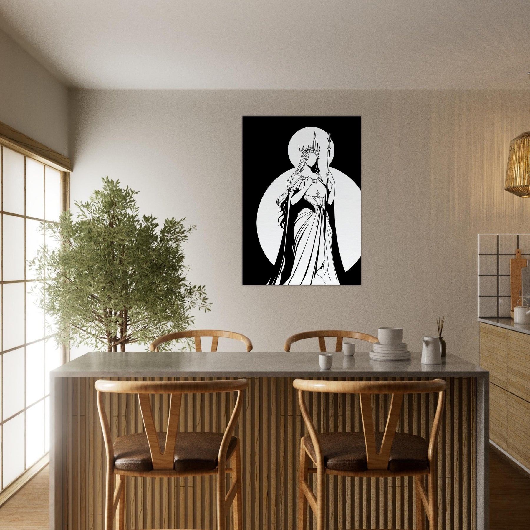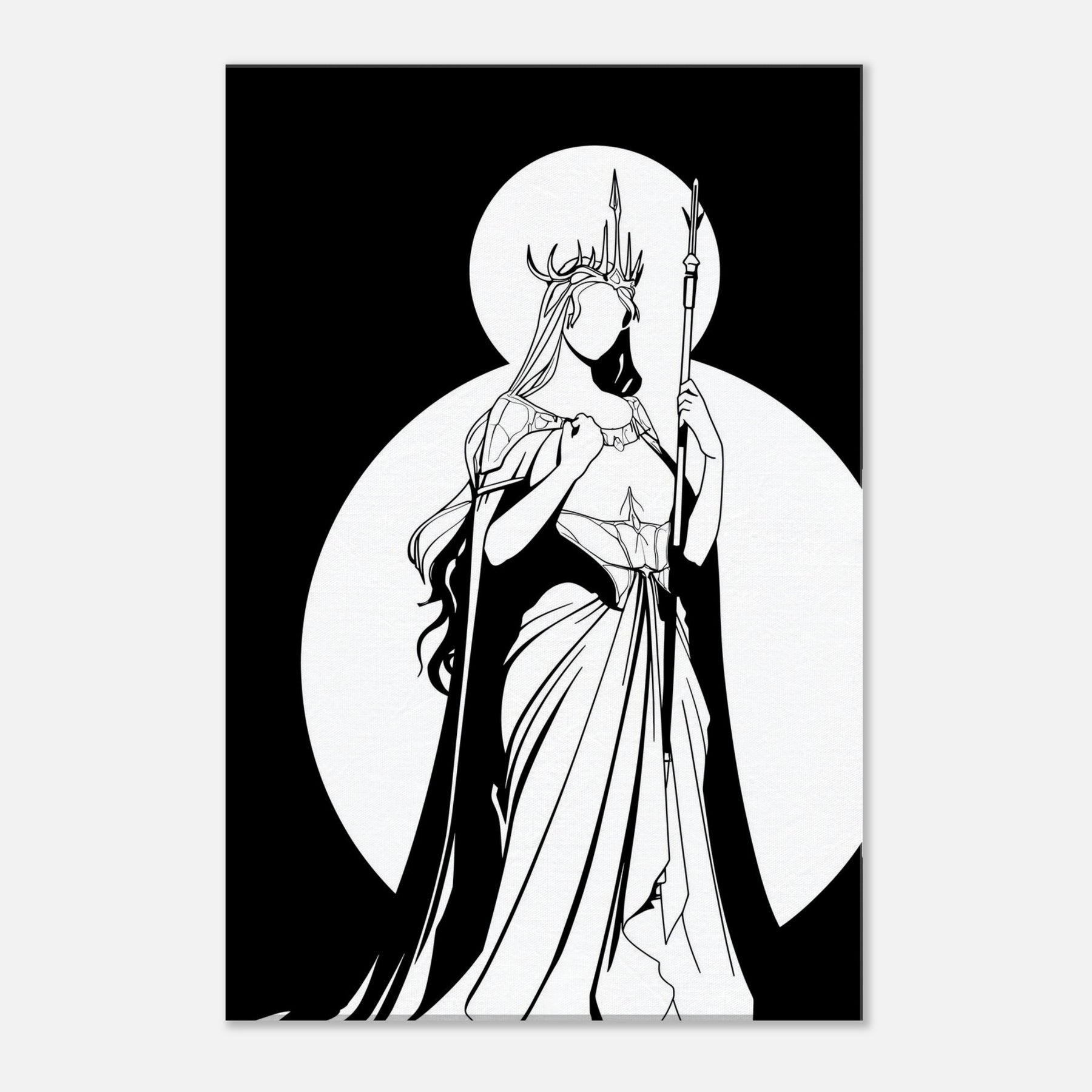 Freyja, Goddess of Love, Beauty, and War, is rendered in pristine line work that feels both intimate and epic. The stark contrast of black ink against white space captures her as a luminous silhouette, crowned with antlers and holding a slender spear. The composition exudes serene strength romantic yet fearless making it a focal point that elevates a living room or study with mythic grace. Perfect for lovers of fantasy and Nordic myth, it invites quiet reflection and bold style.