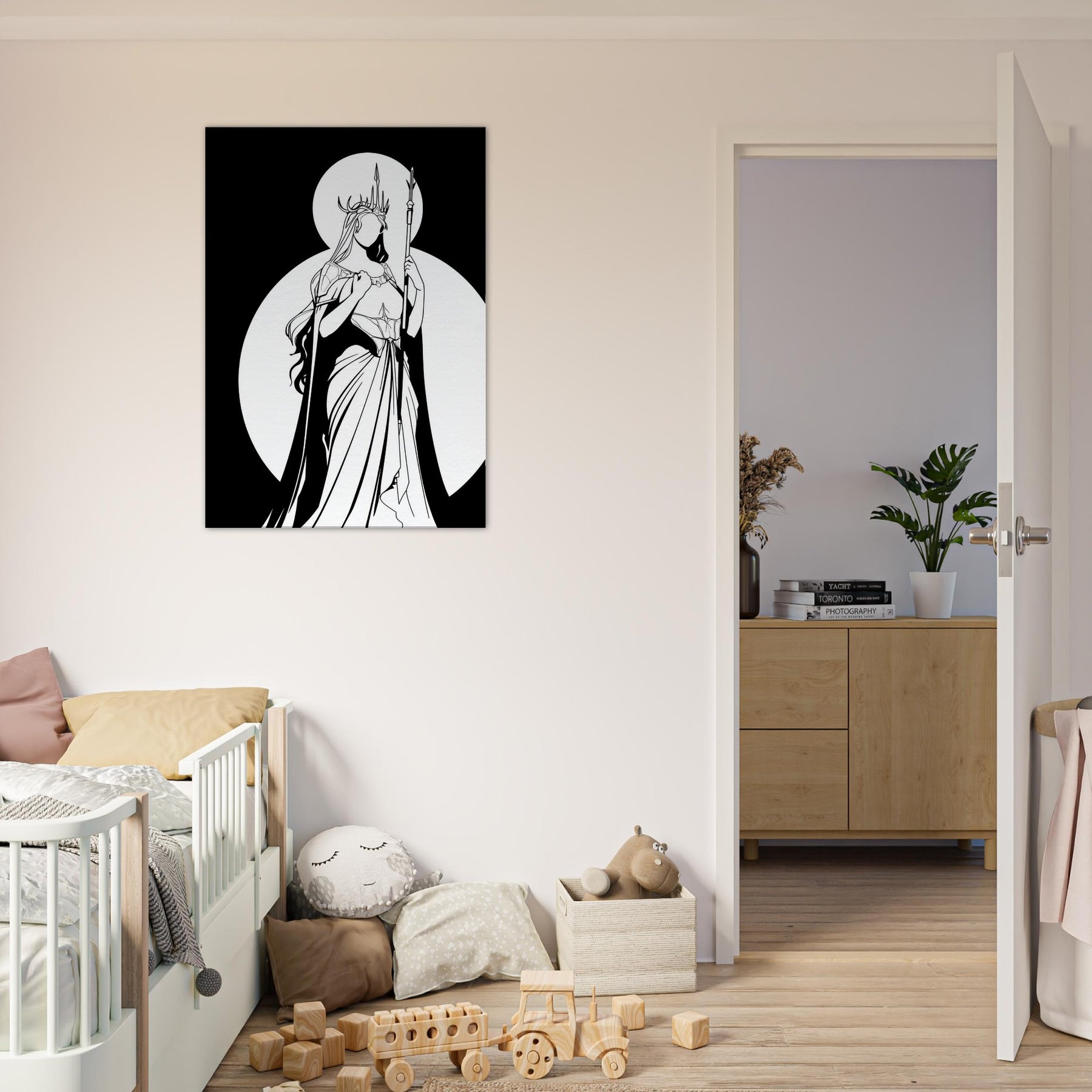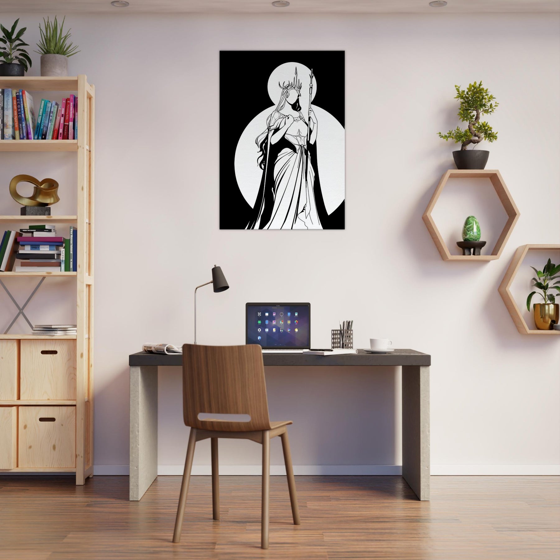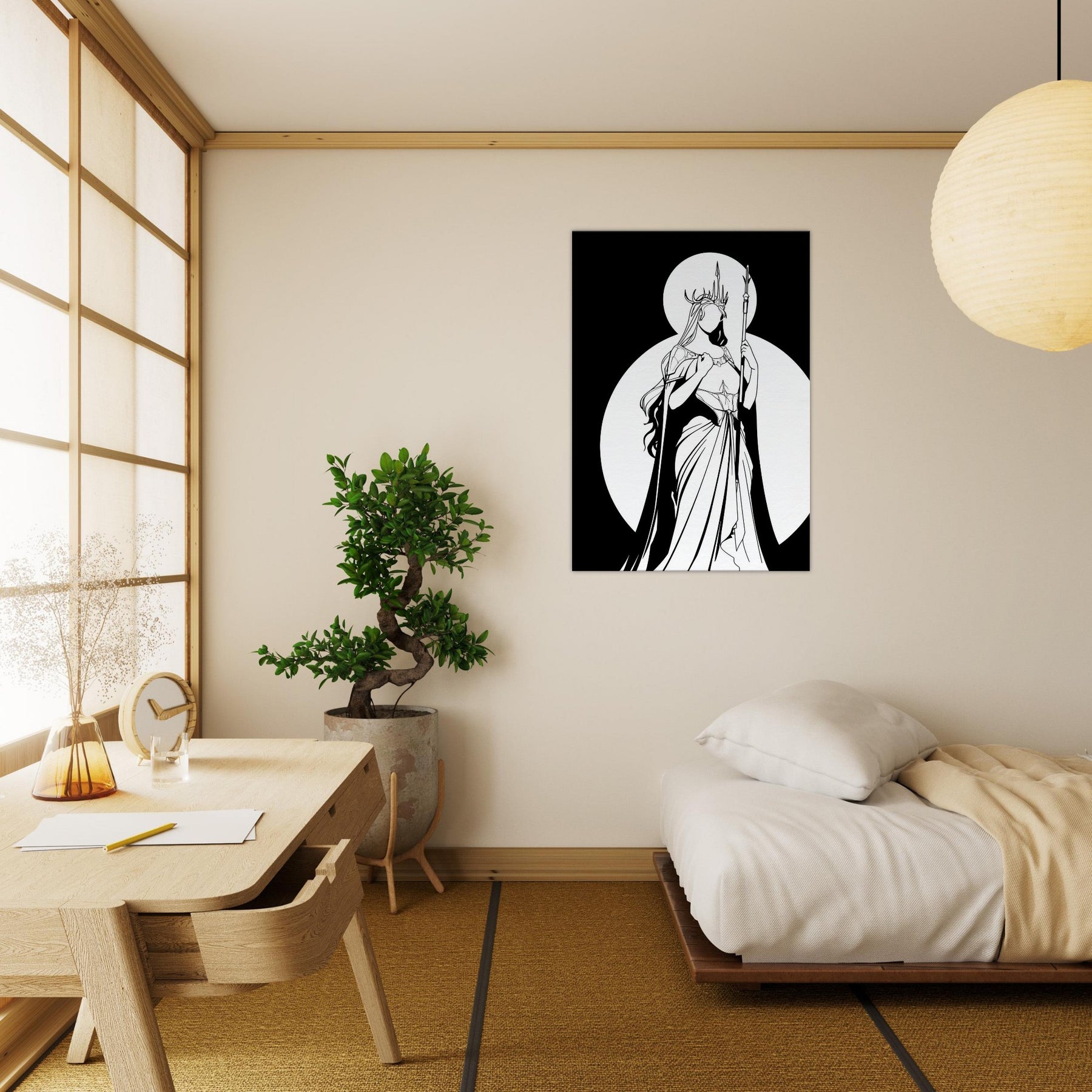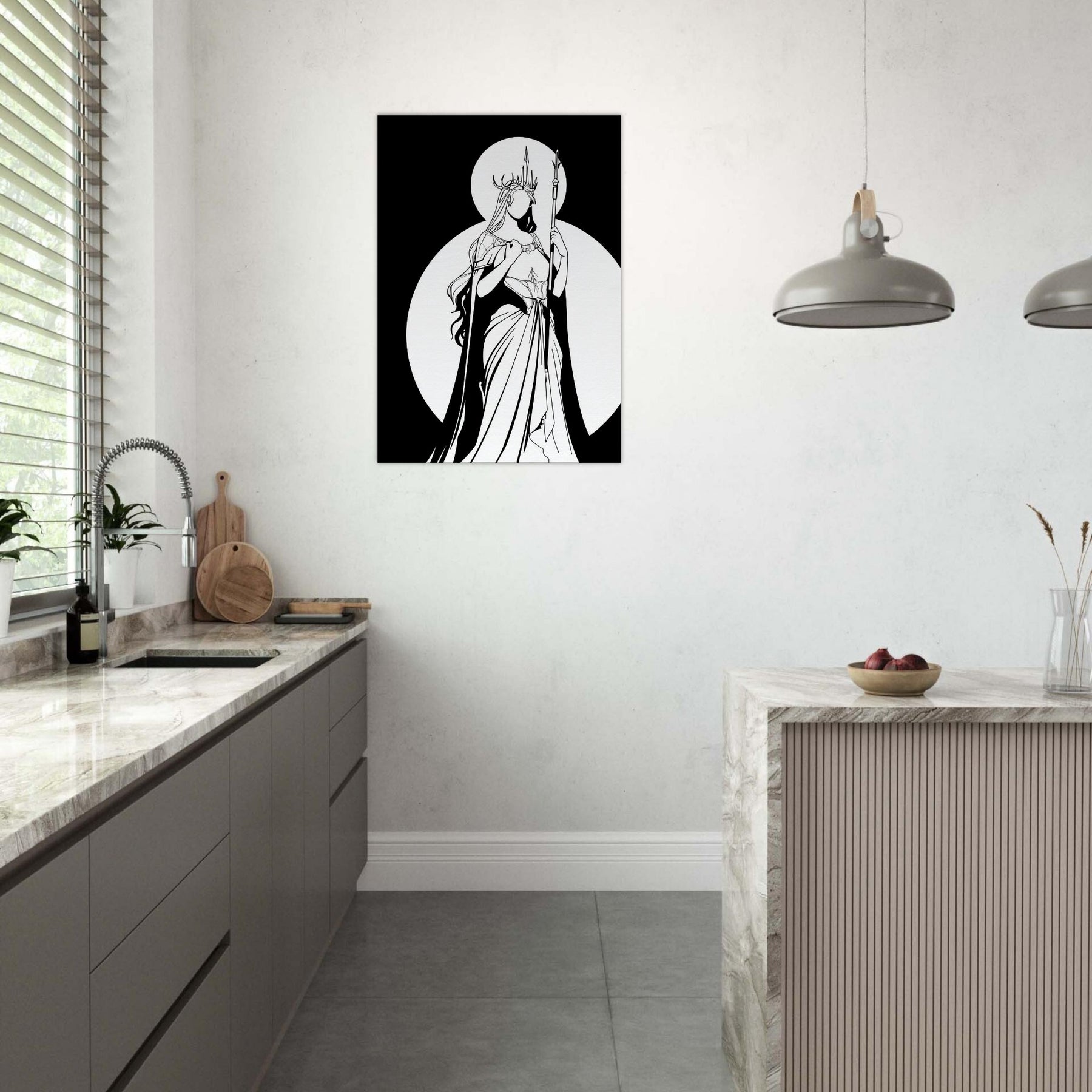 Freyja, Goddess of Love, Beauty, and War, is rendered in pristine line work that feels both intimate and epic. The stark contrast of black ink against white space captures her as a luminous silhouette, crowned with antlers and holding a slender spear. The composition exudes serene strength romantic yet fearless making it a focal point that elevates a living room or study with mythic grace. Perfect for lovers of fantasy and Nordic myth, it invites quiet reflection and bold style.