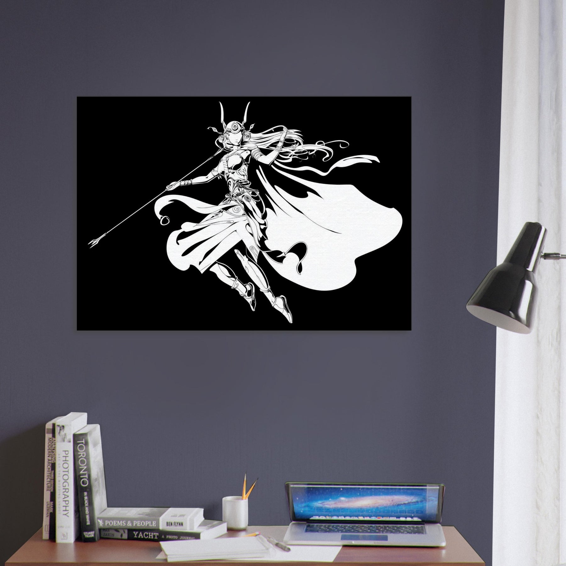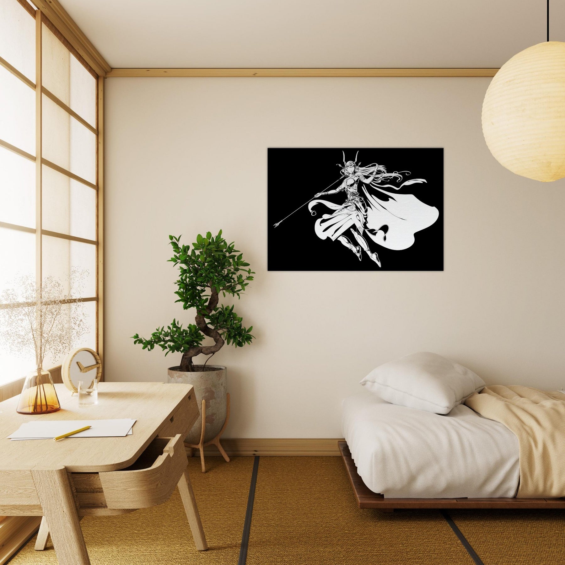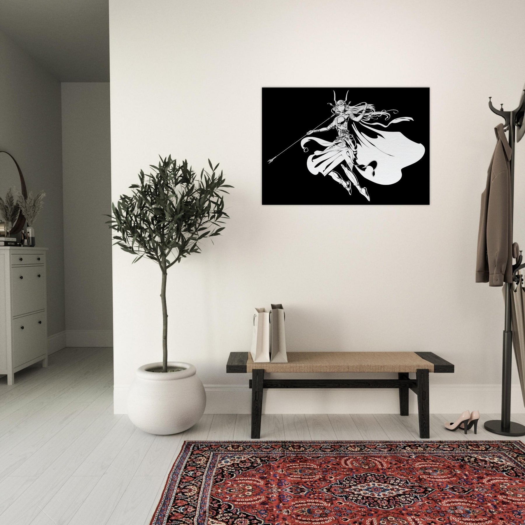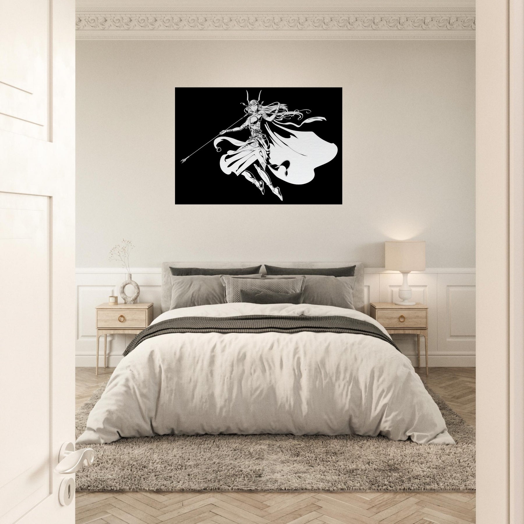 Freyja, Goddess of Love, Beauty, and War, strides through a stark, fluid linework against a deep black field. This monochrome figure brims with grace and steel armor of wind swept ribbons and razor sharp angles that suggest both tenderness and battle ready resolve. The elegant movement of scarf and cape creates a living sculpture you can inhabit with your gaze, turning a wall into a storytelling alter. Perfect for a modern living room, study, or hallway seeking mythic atmosphere.