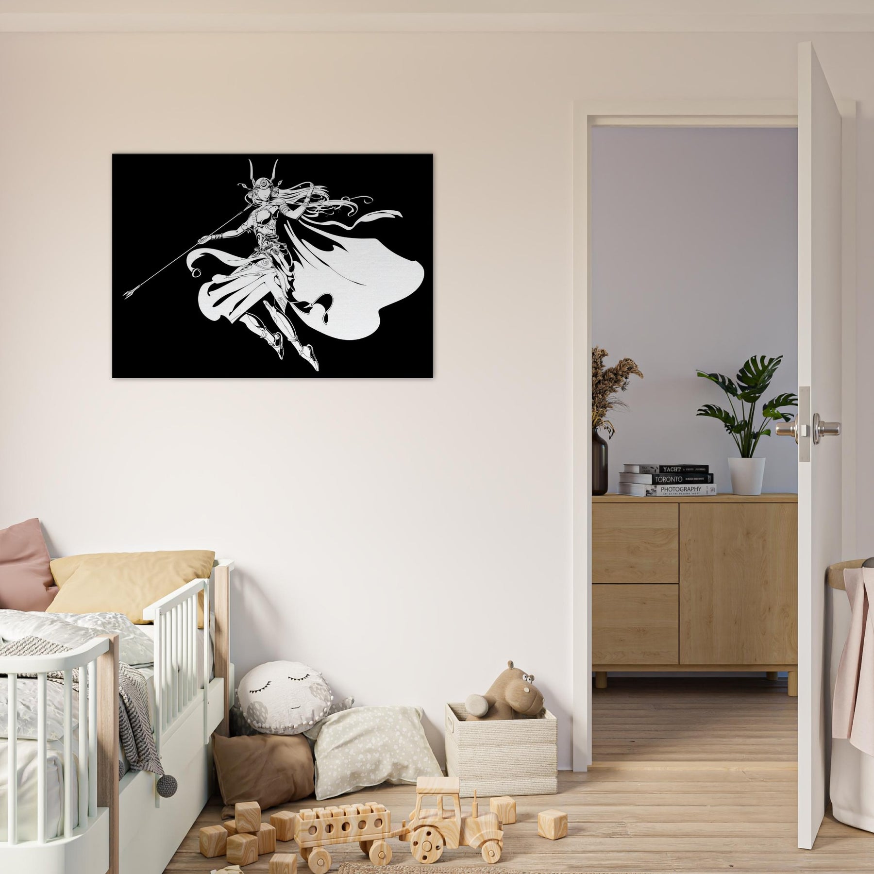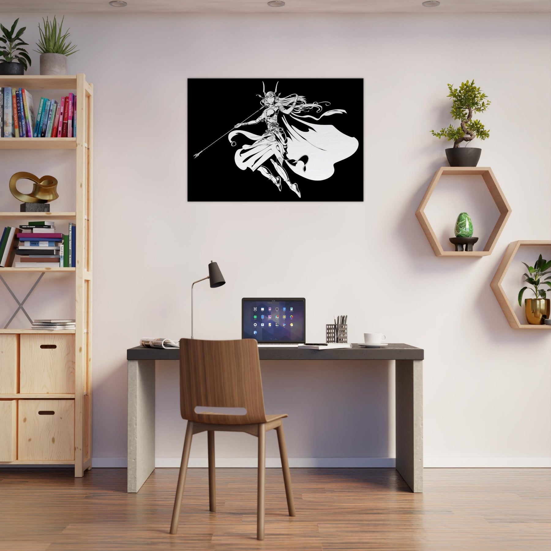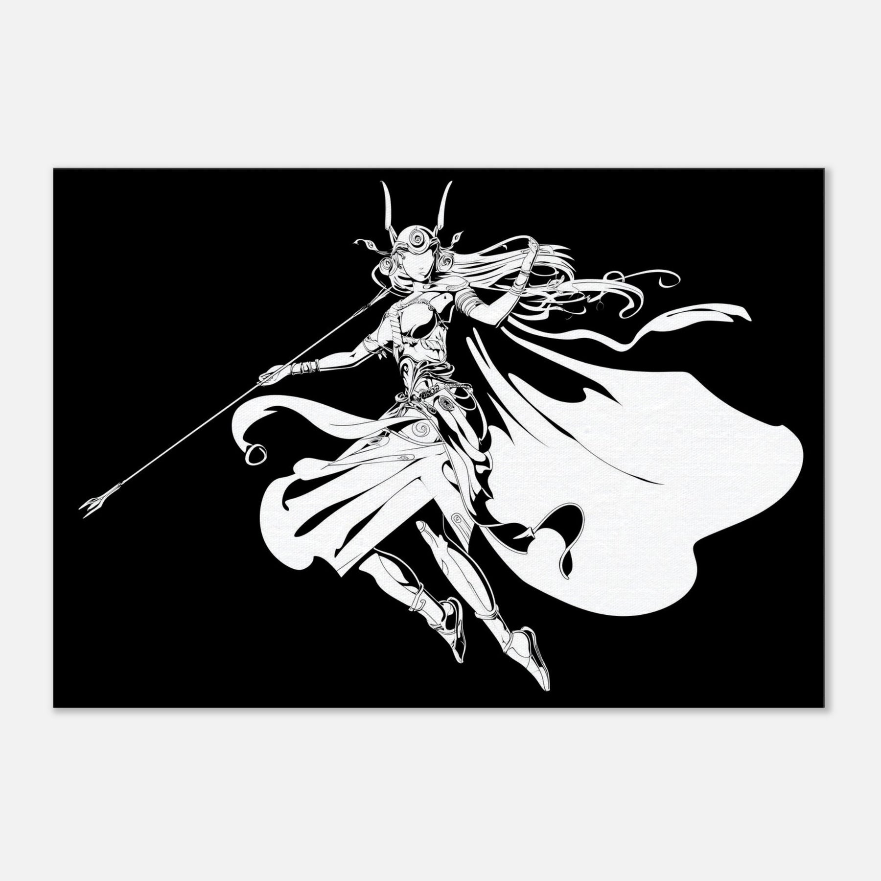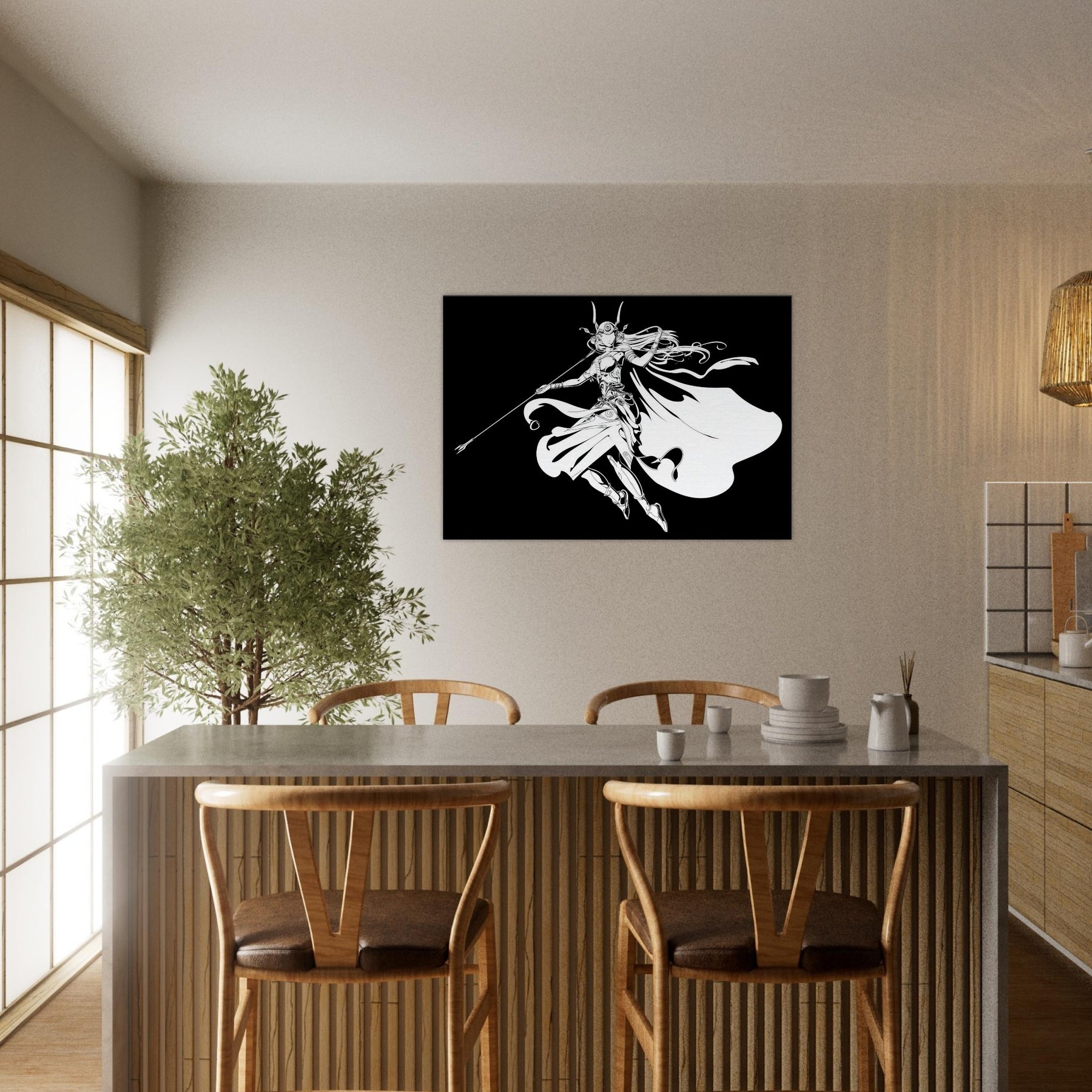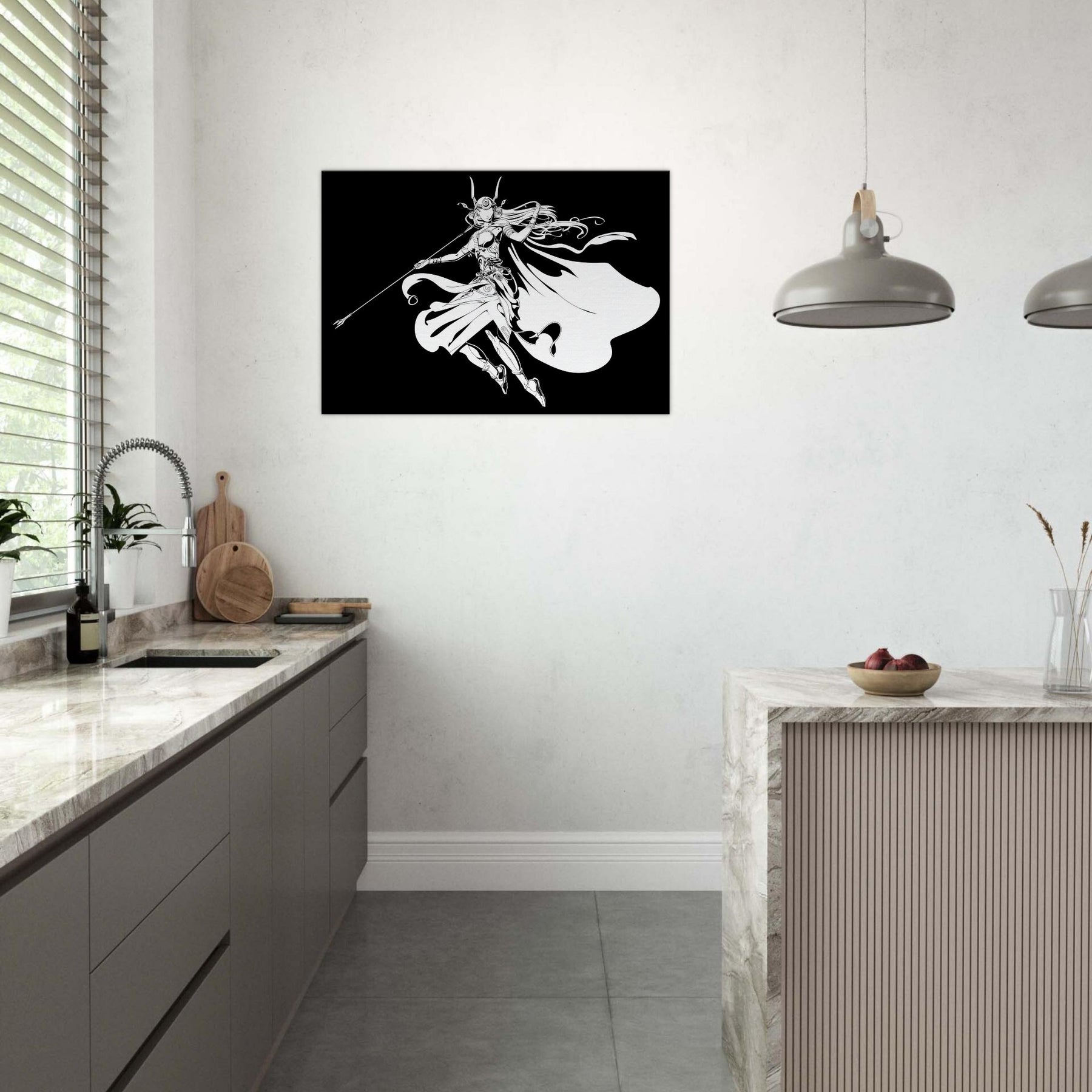 Freyja, Goddess of Love, Beauty, and War, strides through a stark, fluid linework against a deep black field. This monochrome figure brims with grace and steel armor of wind swept ribbons and razor sharp angles that suggest both tenderness and battle ready resolve. The elegant movement of scarf and cape creates a living sculpture you can inhabit with your gaze, turning a wall into a storytelling alter. Perfect for a modern living room, study, or hallway seeking mythic atmosphere.