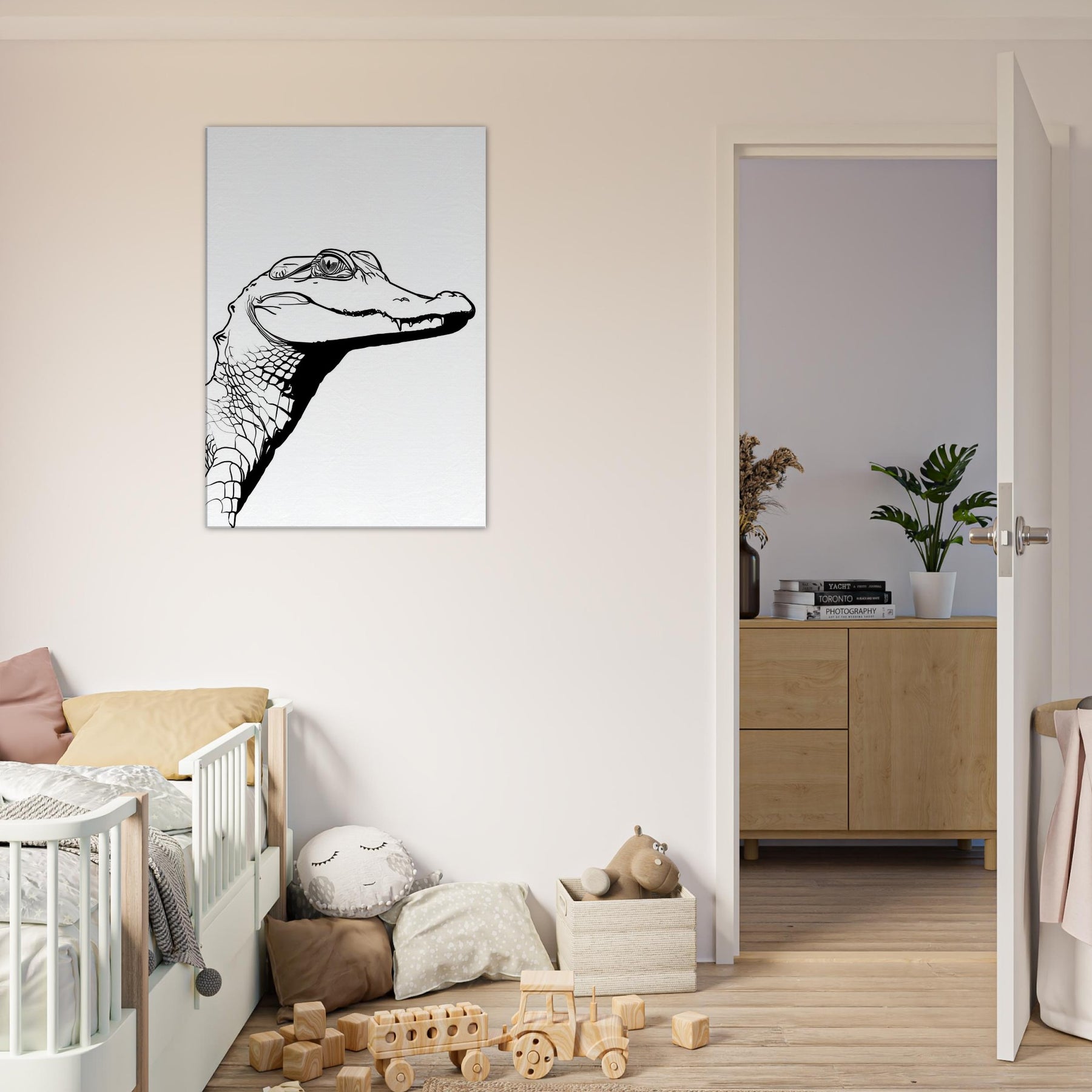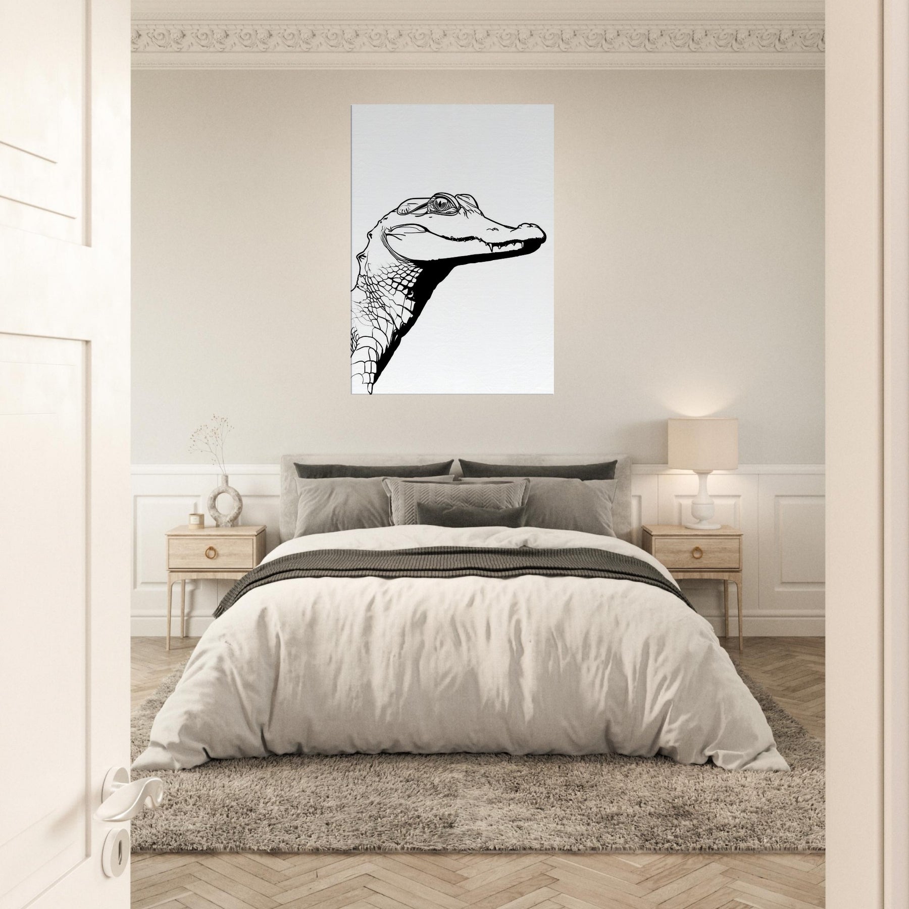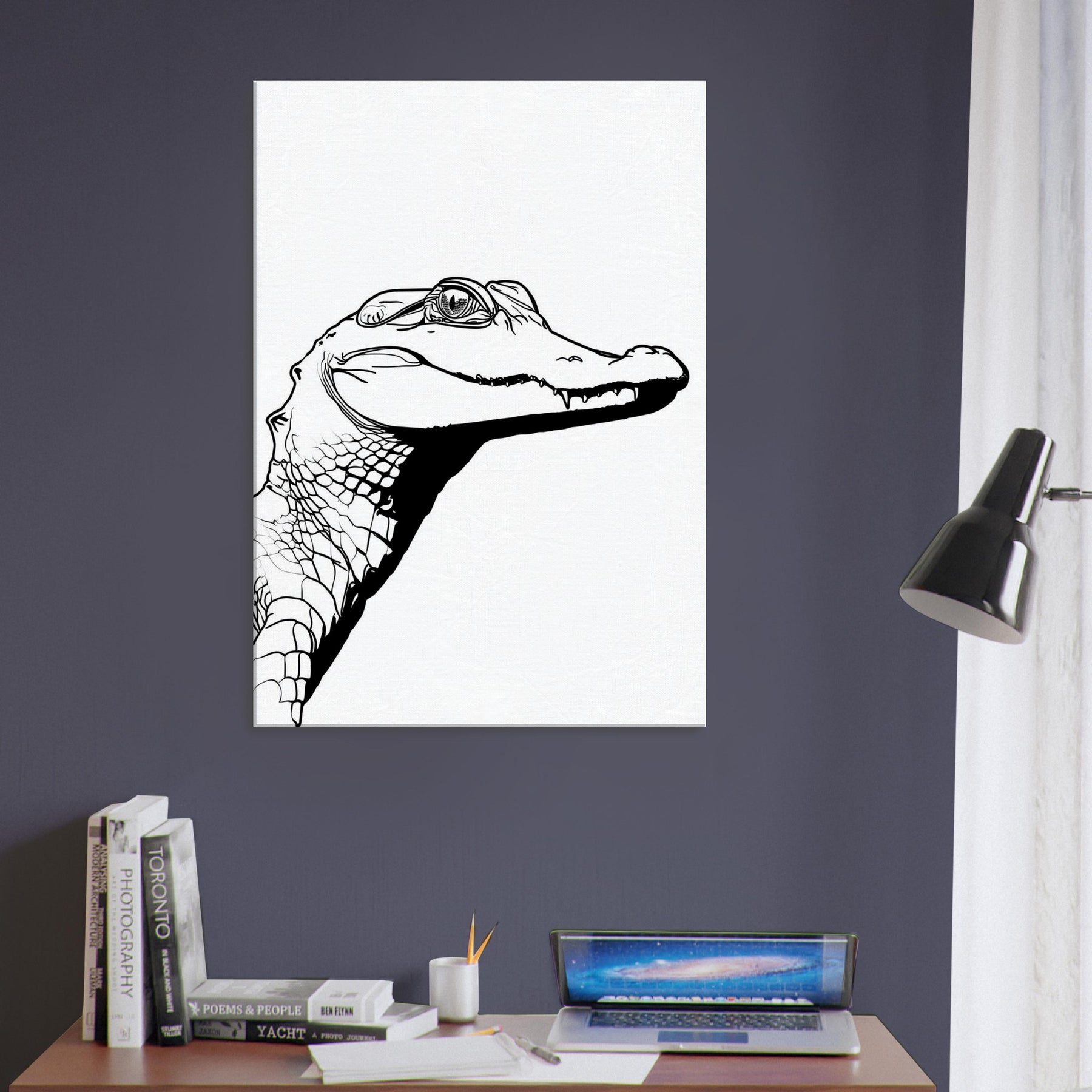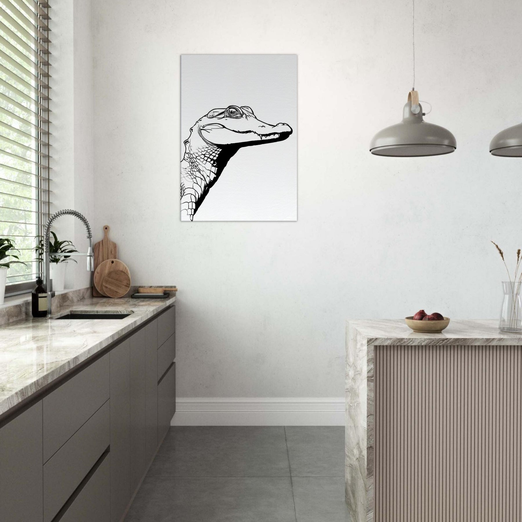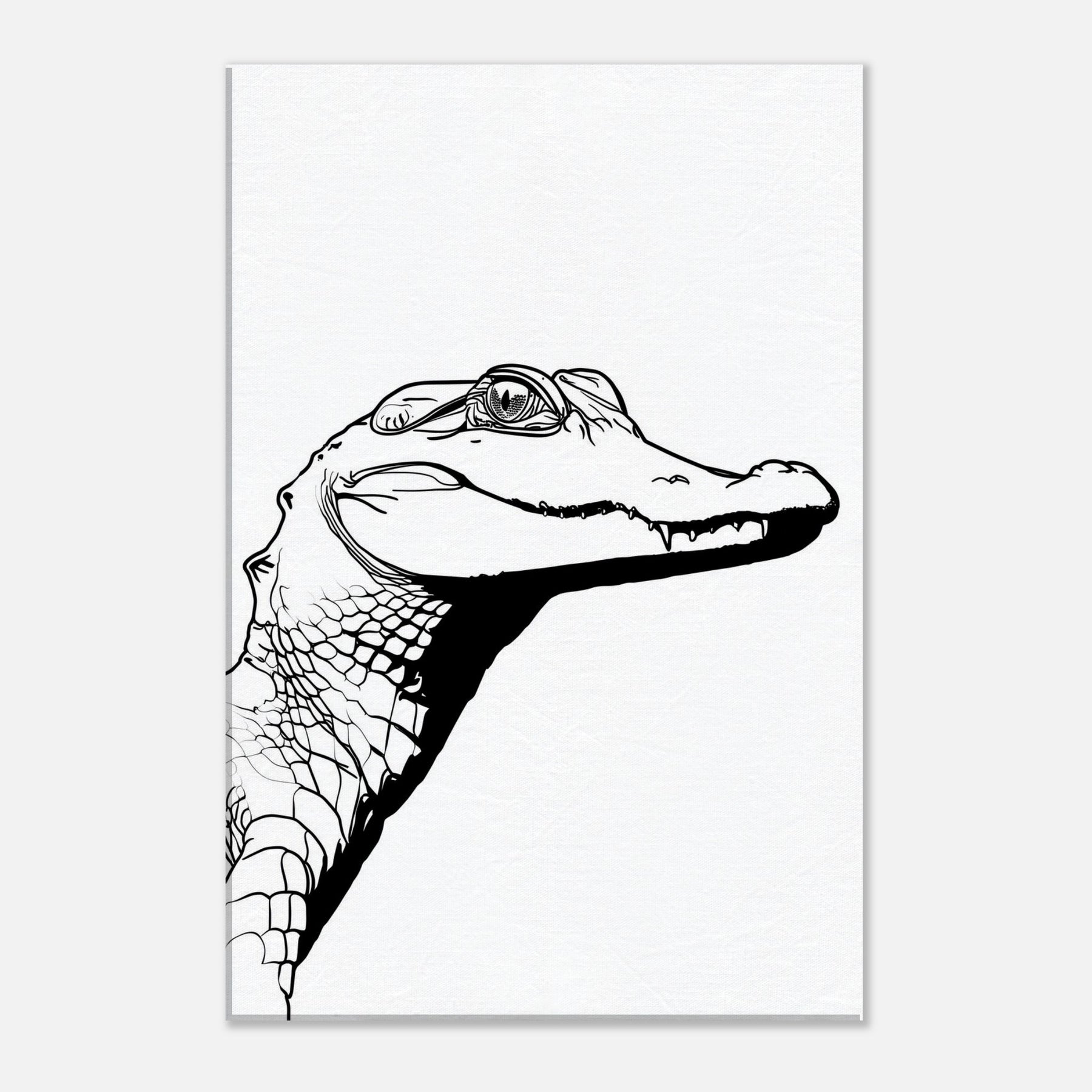 An unbroken sweep of ink renders the Alligator with a quiet, confident gaze. This line drawing captures the animal's ancient poise in a minimalist silhouette, where every contour suggests texture and strength without excess. Hung in a sunlit living room or a study, it invites a moment of stillness, a pause before the day begins. The stark black on white creates a modern focal point that pairs with natural wood tones or cool neutrals, turning a corridor or lounge into a gallery worthy moment of pared down elegance.
