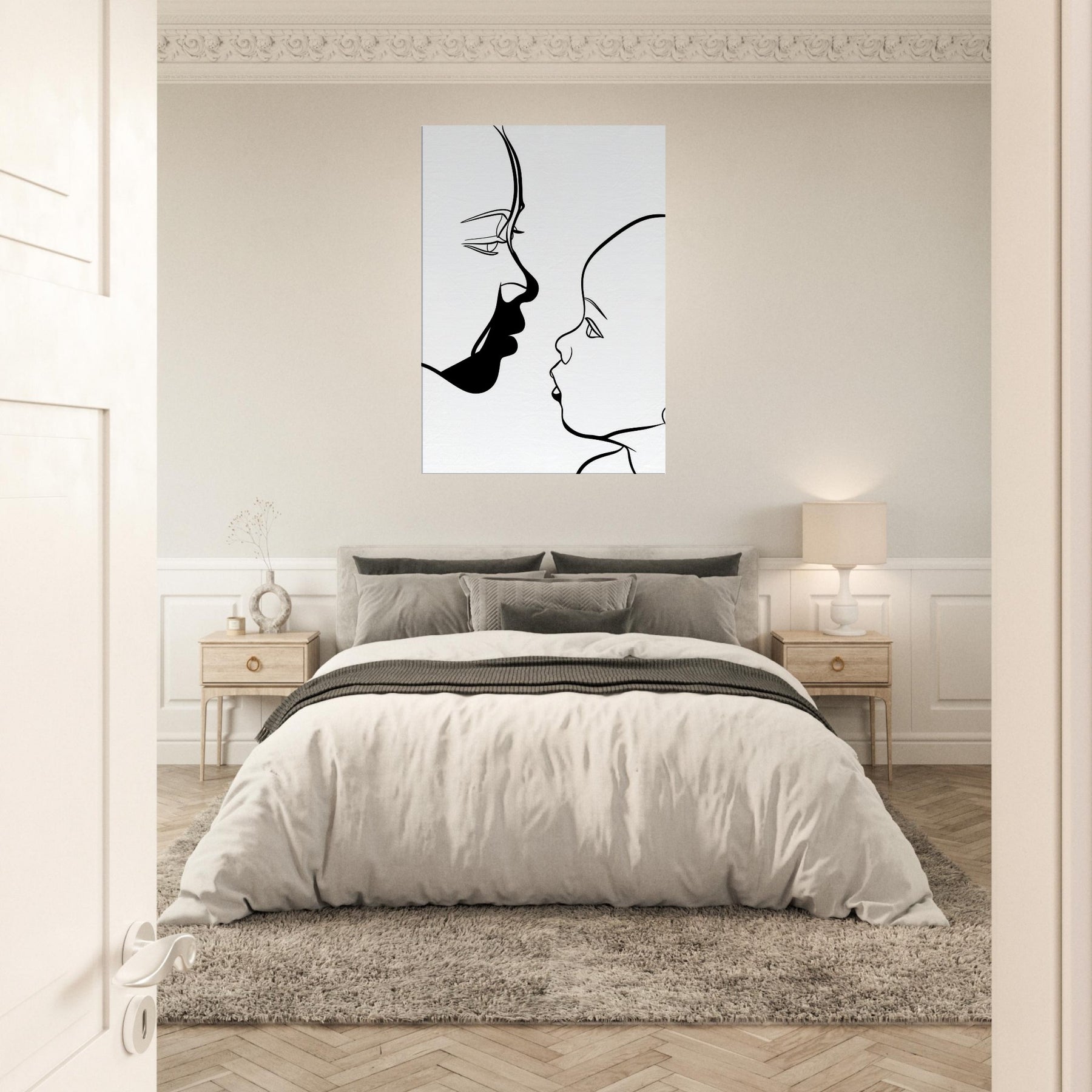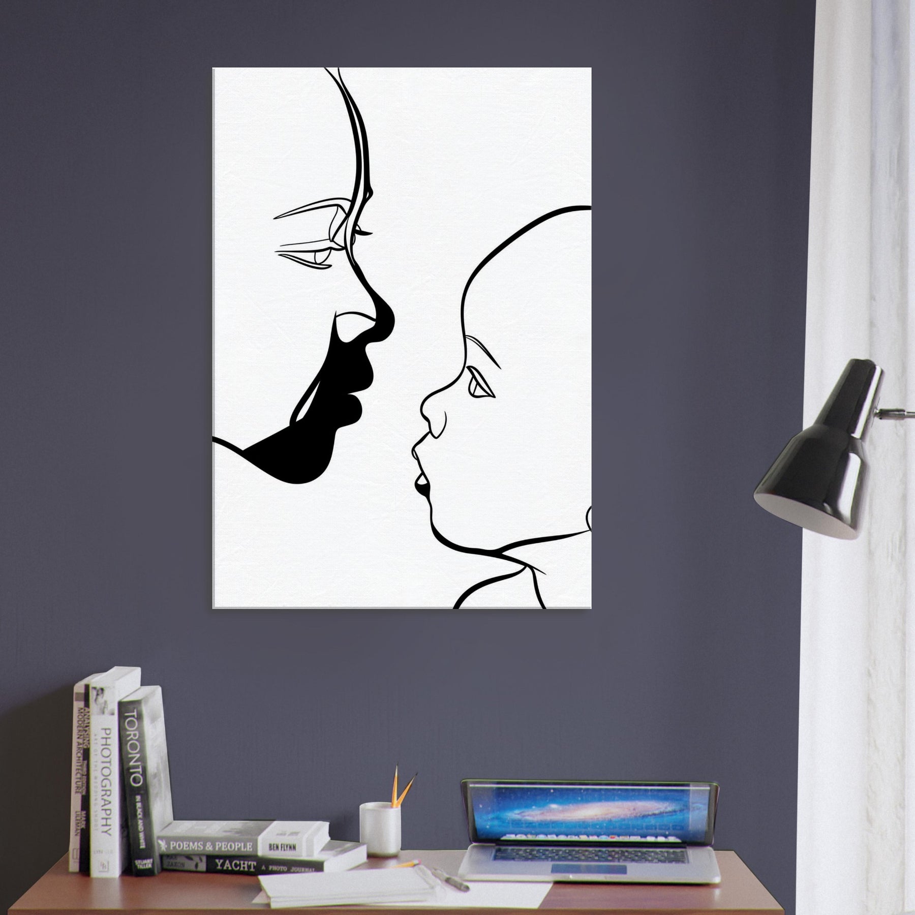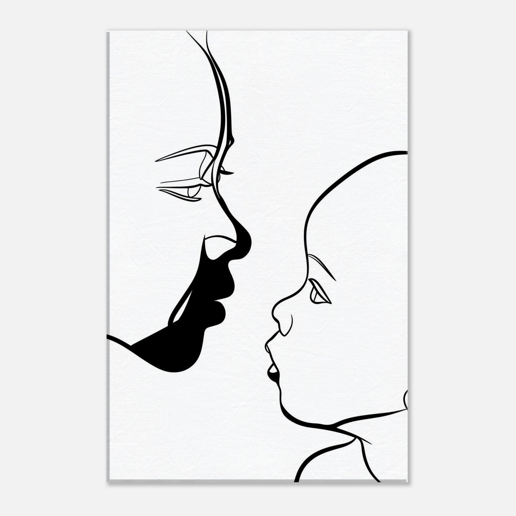 Touching in its simplicity, this line art study traces the quiet silhouette of a Parent and Child, capturing a moment of connection with nothing but graceful curves. The bold black line against pristine white evokes the intimacy of a held gaze, a breath between generations. Framed in a sunlit living room or a serene nursery, it invites soft contemplation and warmth, turning a wall into a tender focal point that makes everyday spaces feel more human and alive.