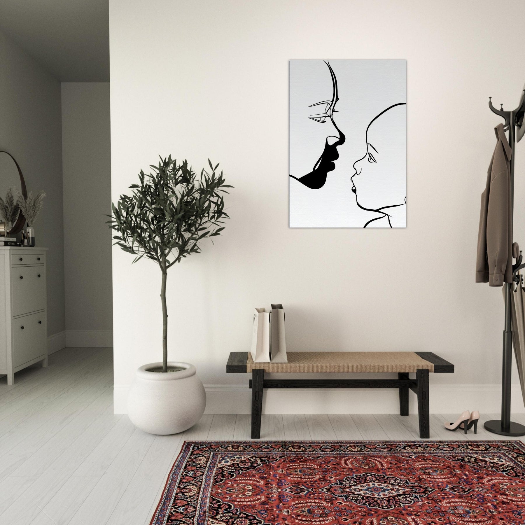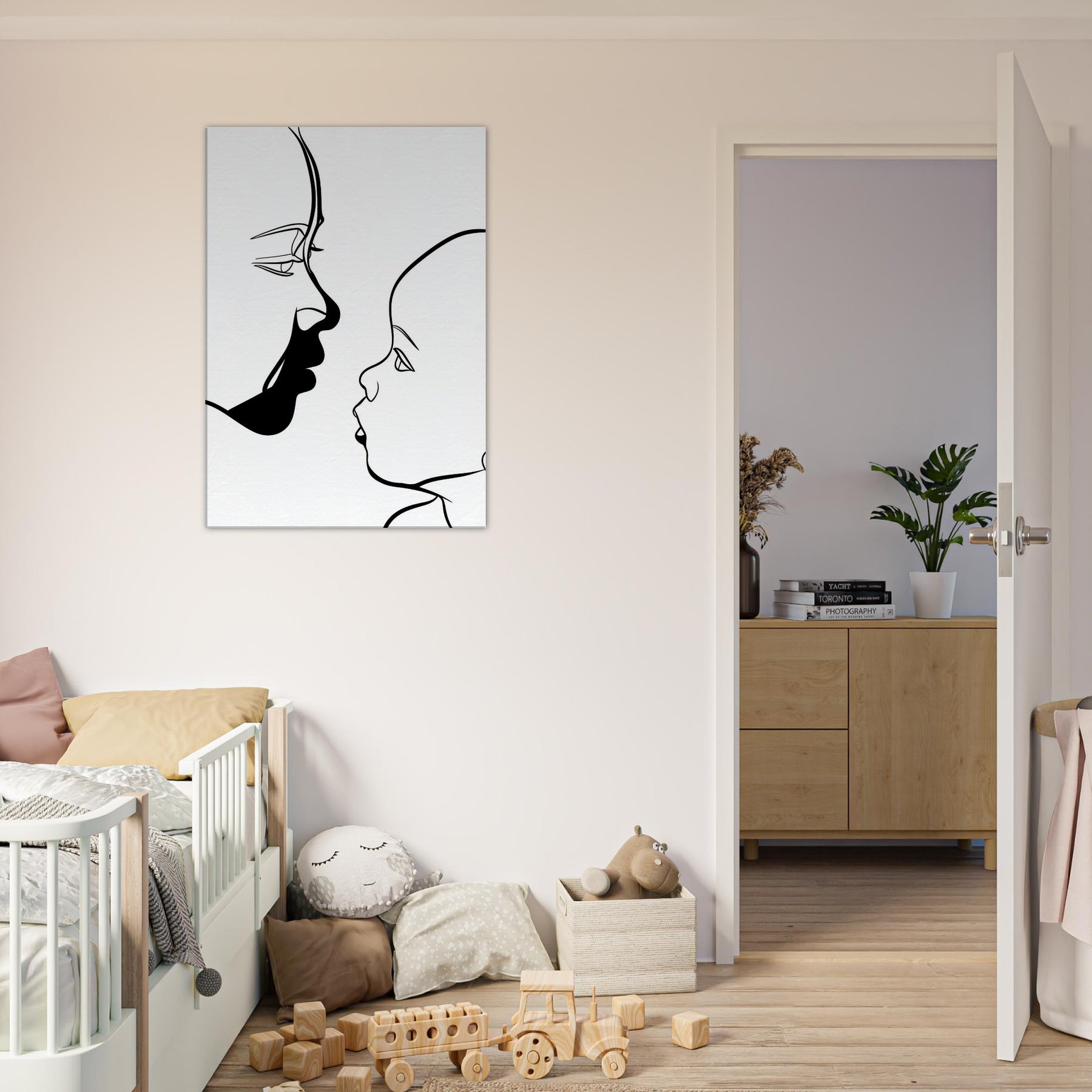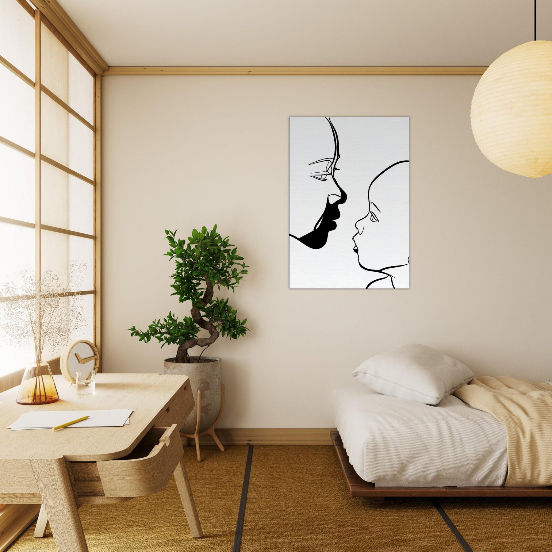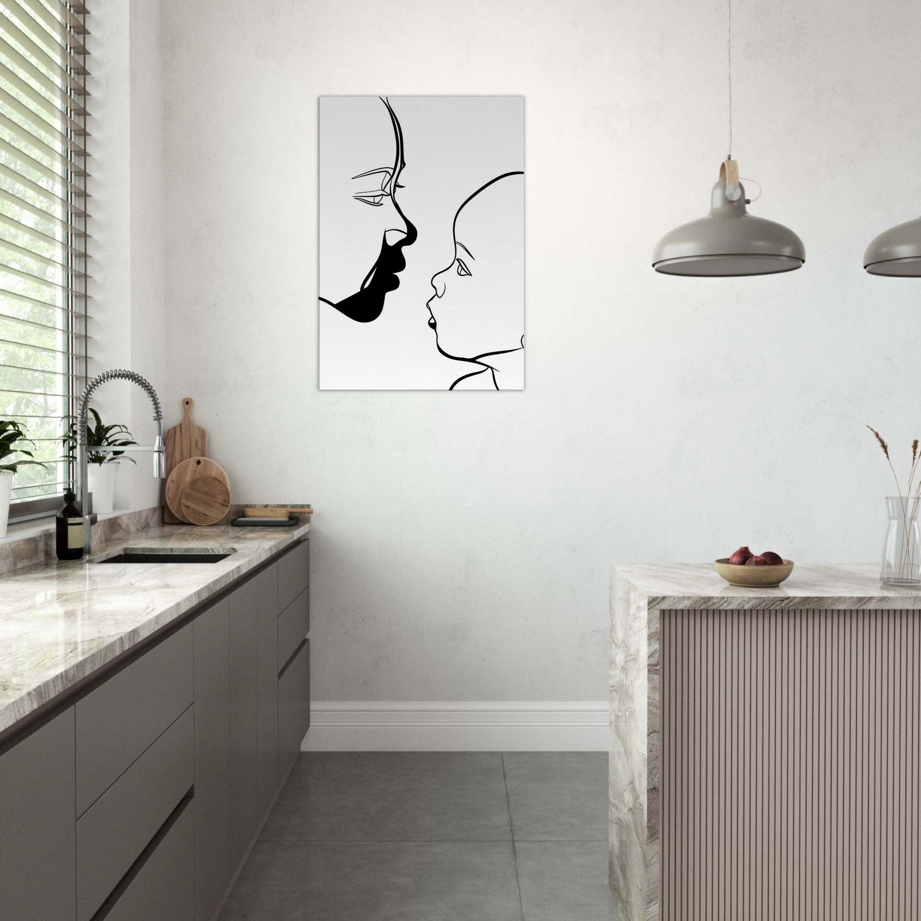 Touching in its simplicity, this line art study traces the quiet silhouette of a Parent and Child, capturing a moment of connection with nothing but graceful curves. The bold black line against pristine white evokes the intimacy of a held gaze, a breath between generations. Framed in a sunlit living room or a serene nursery, it invites soft contemplation and warmth, turning a wall into a tender focal point that makes everyday spaces feel more human and alive.