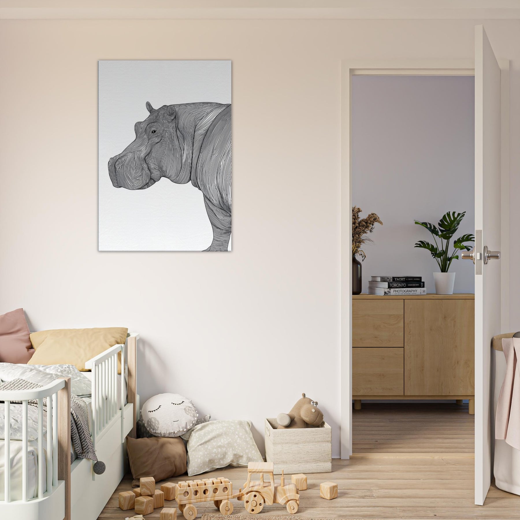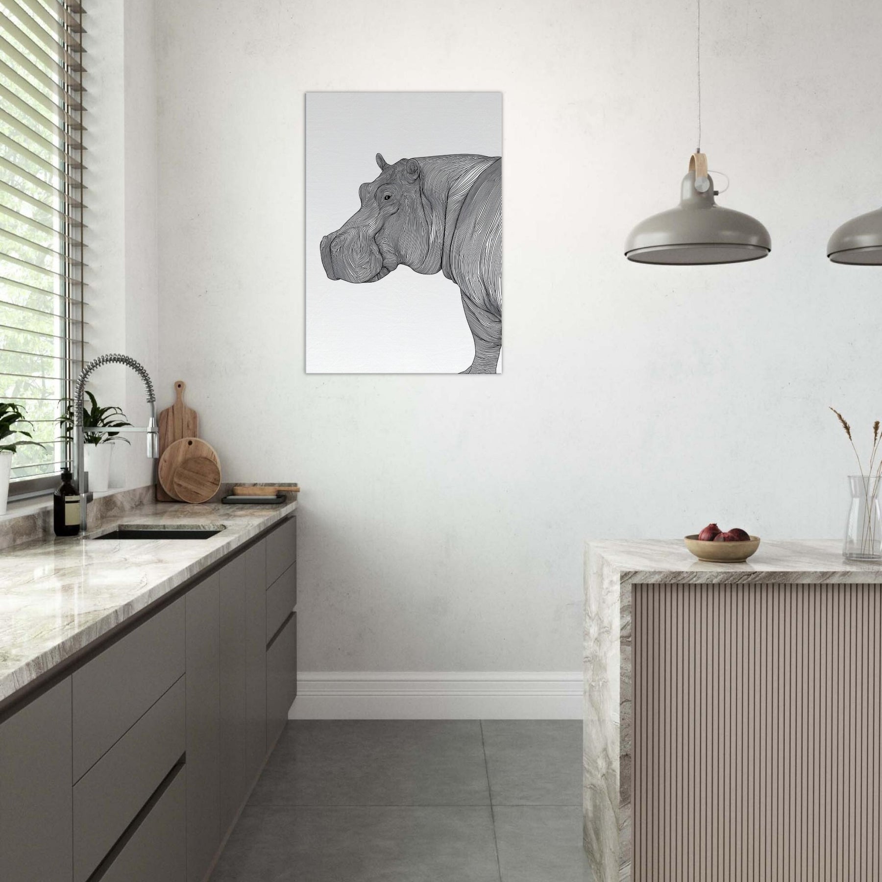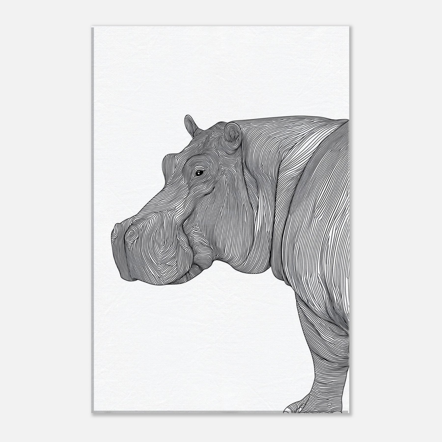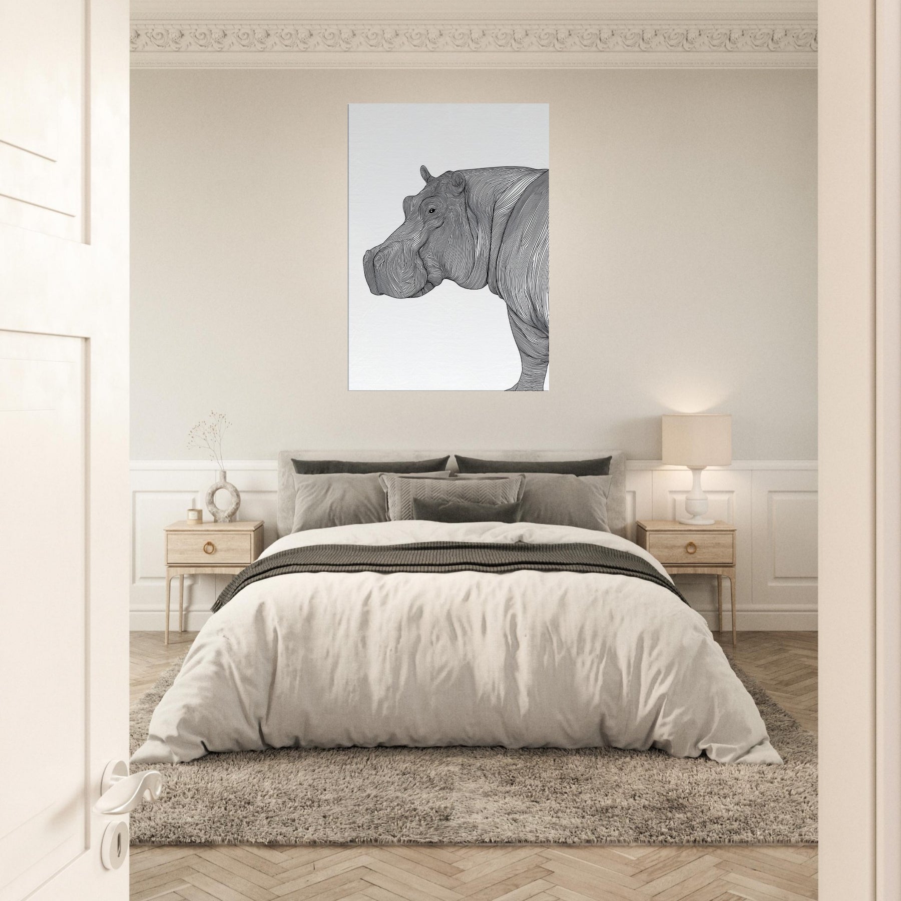 Poised in quiet repose, this minimalist line drawing captures the Hippopotamus with a chorus of tactile curves. The dense, continuous contours melt into negative space, conjuring the hush of a sunlit riverside at dawn. Printed on crisp white, it invites soft, reflective light into the room and pairs effortlessly with a calm color palette charcoal, ivory, and warm woods. A singular focal point, it bestows modern grace and a whisper of wilderness, making any living space feel grounded, serene, and infinitely chic.