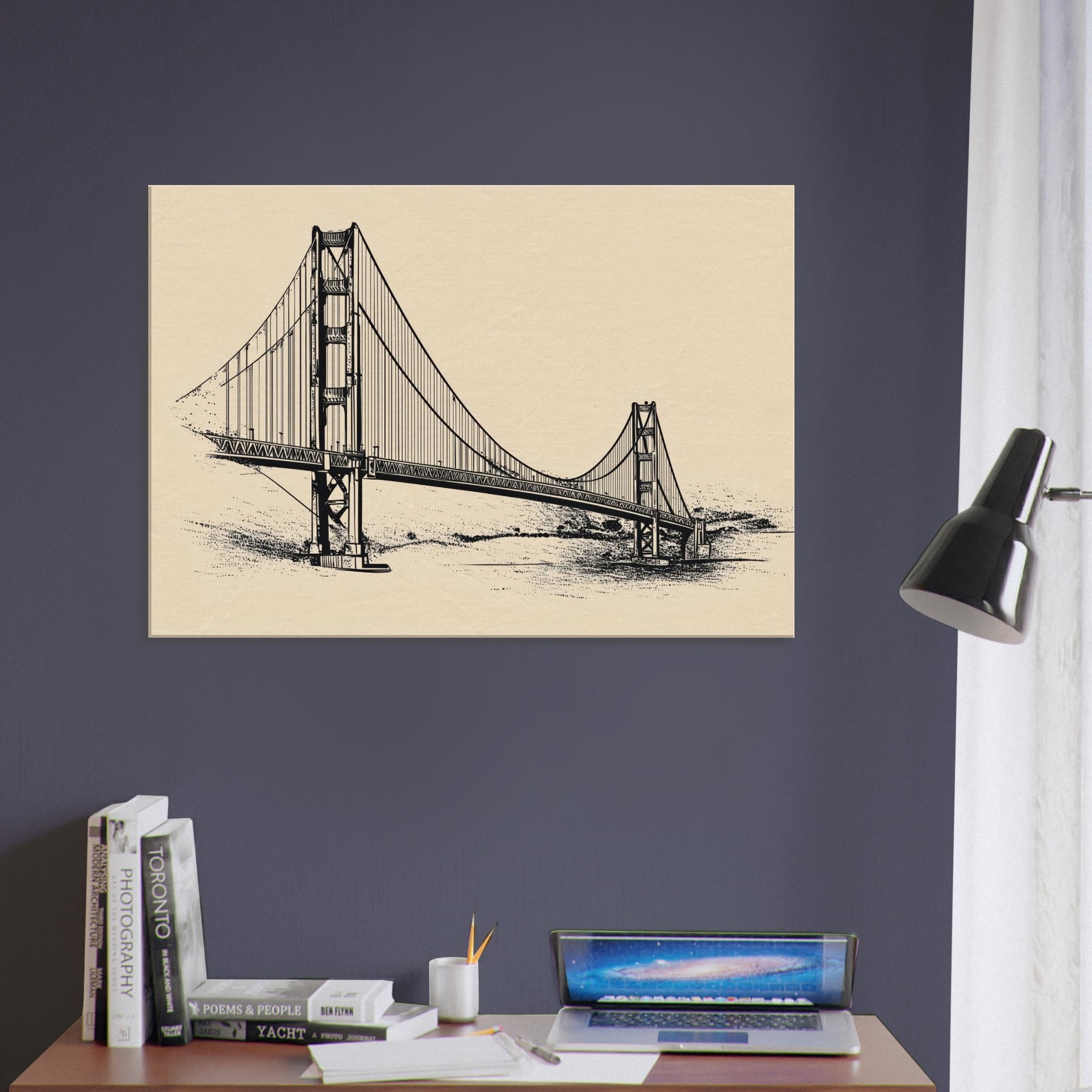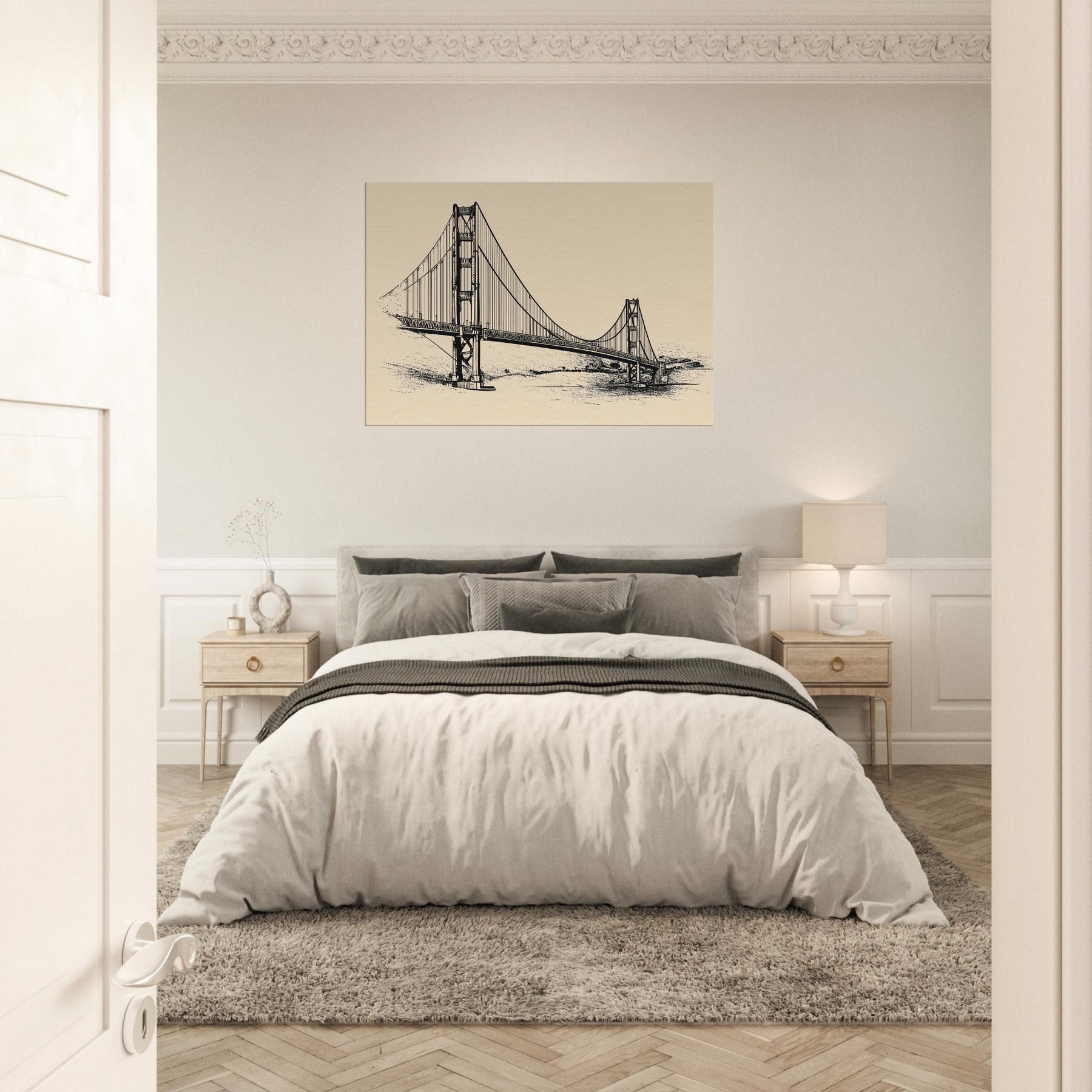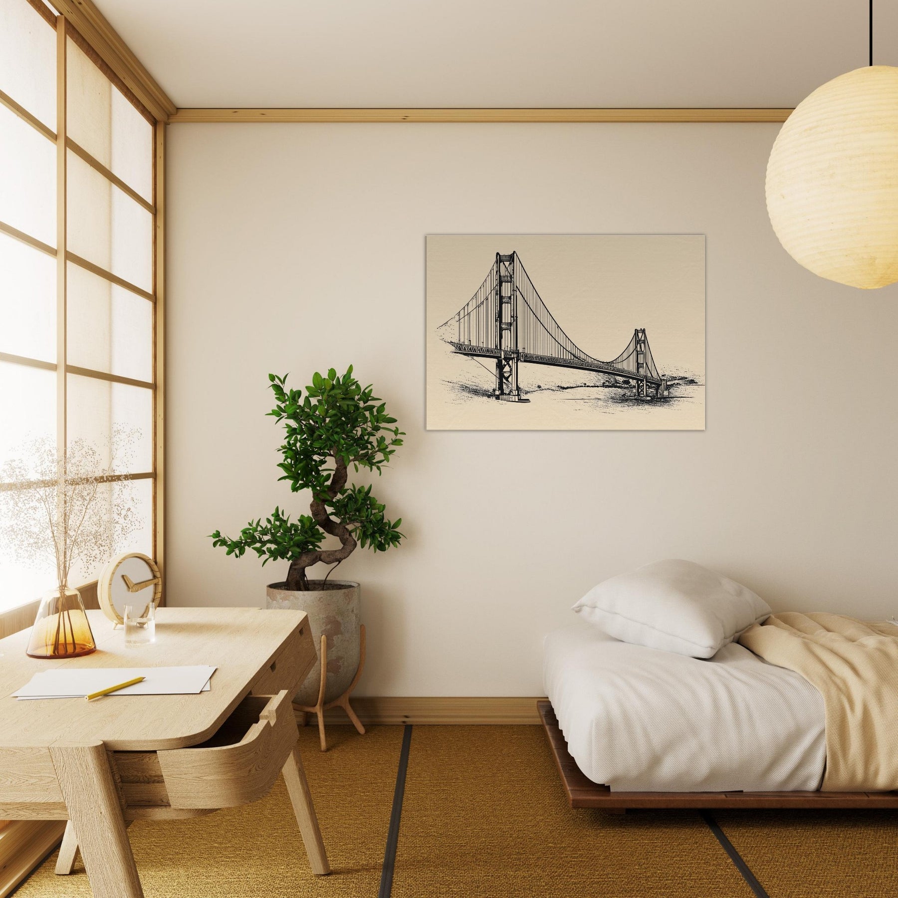 Silhouette and sea in quiet conversation, this line drawn interpretation of the Golden Gate Bridge invites a calm, contemplative mood into any room. The clean black contours glide over a warm parchment backdrop, tracing arches and cables with a whisper of wind. It pairs with modern neutrals or moody blues, turning a living space into a harbor of focus and grace, where every glance feels anchored, and the pace slows as if you were standing at the edge of a softly lit bay.