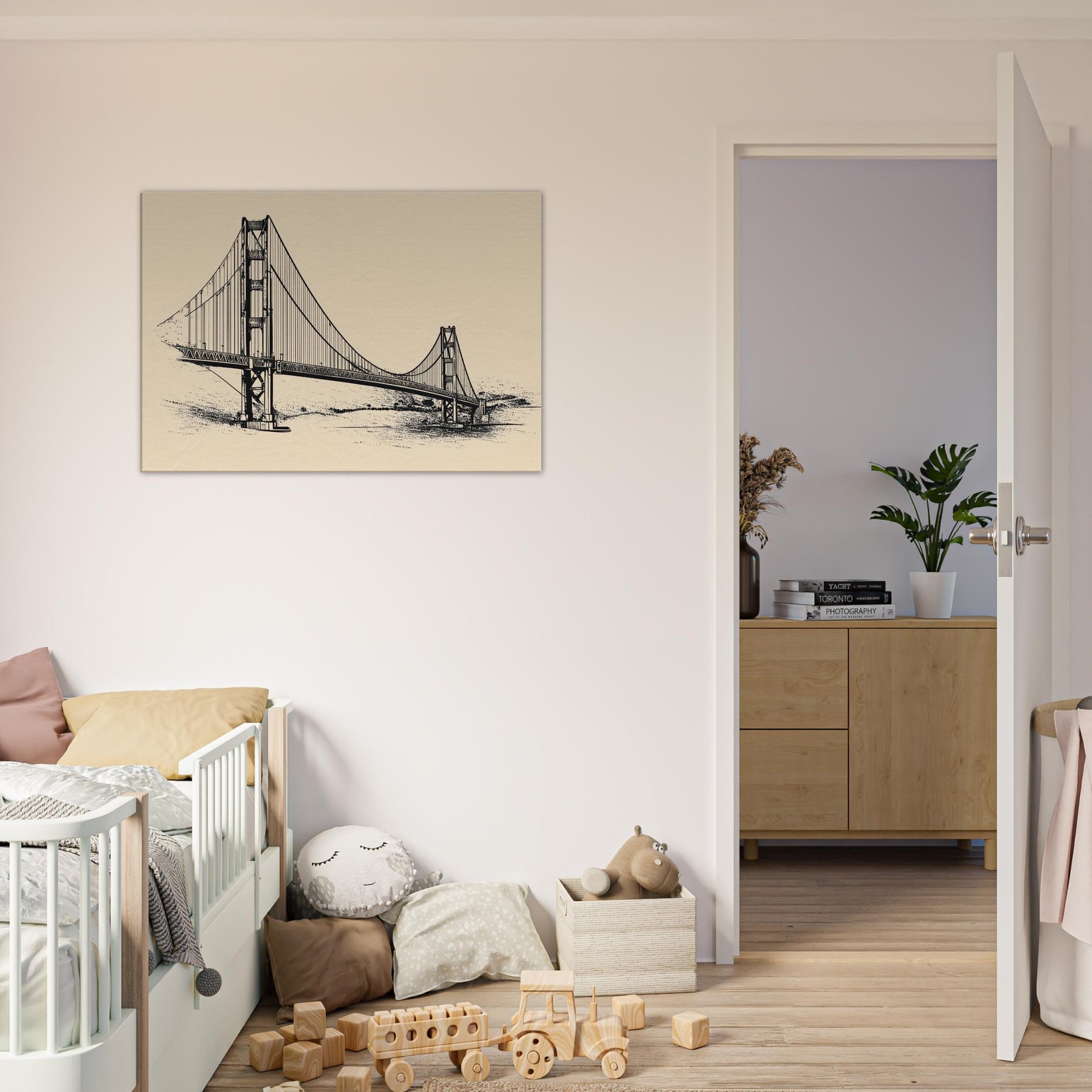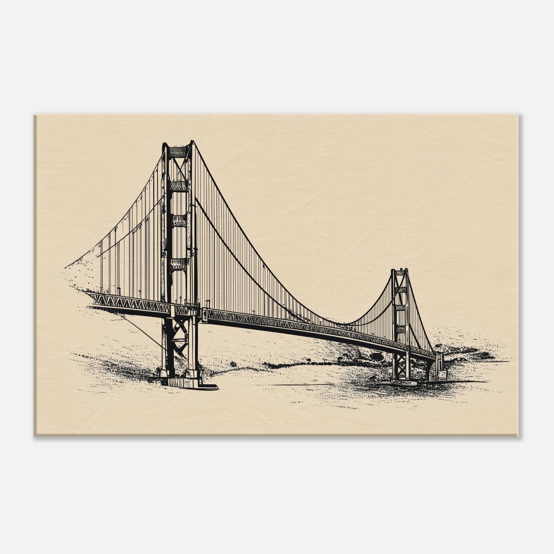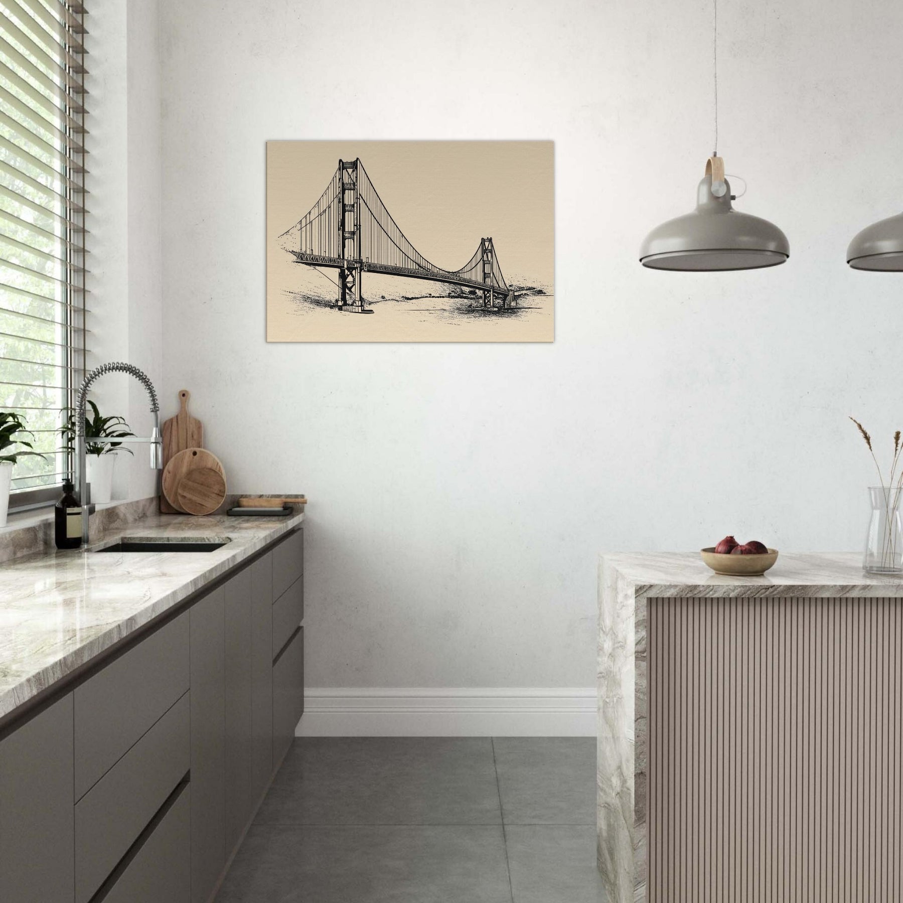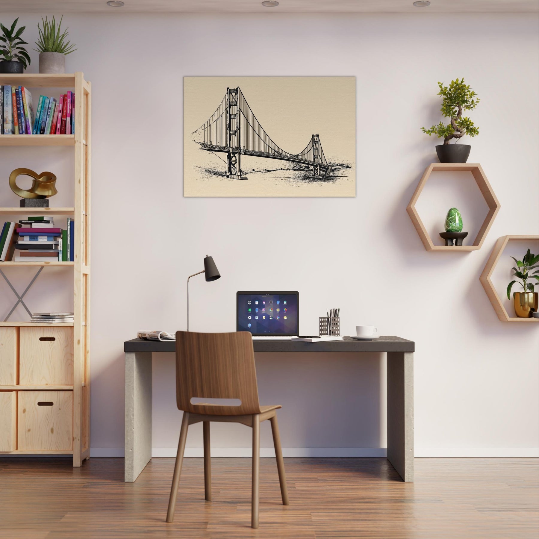 Silhouette and sea in quiet conversation, this line drawn interpretation of the Golden Gate Bridge invites a calm, contemplative mood into any room. The clean black contours glide over a warm parchment backdrop, tracing arches and cables with a whisper of wind. It pairs with modern neutrals or moody blues, turning a living space into a harbor of focus and grace, where every glance feels anchored, and the pace slows as if you were standing at the edge of a softly lit bay.