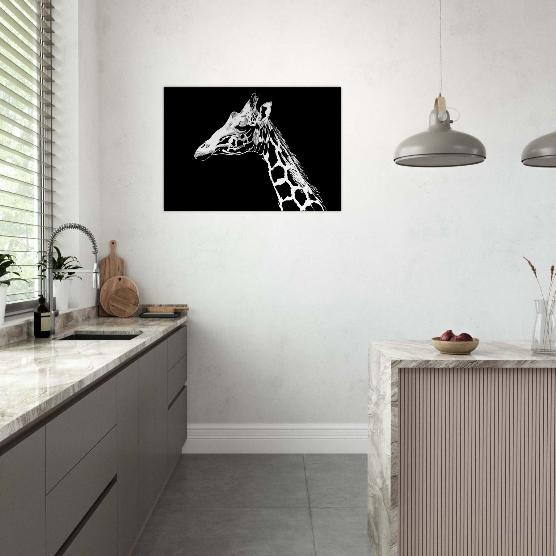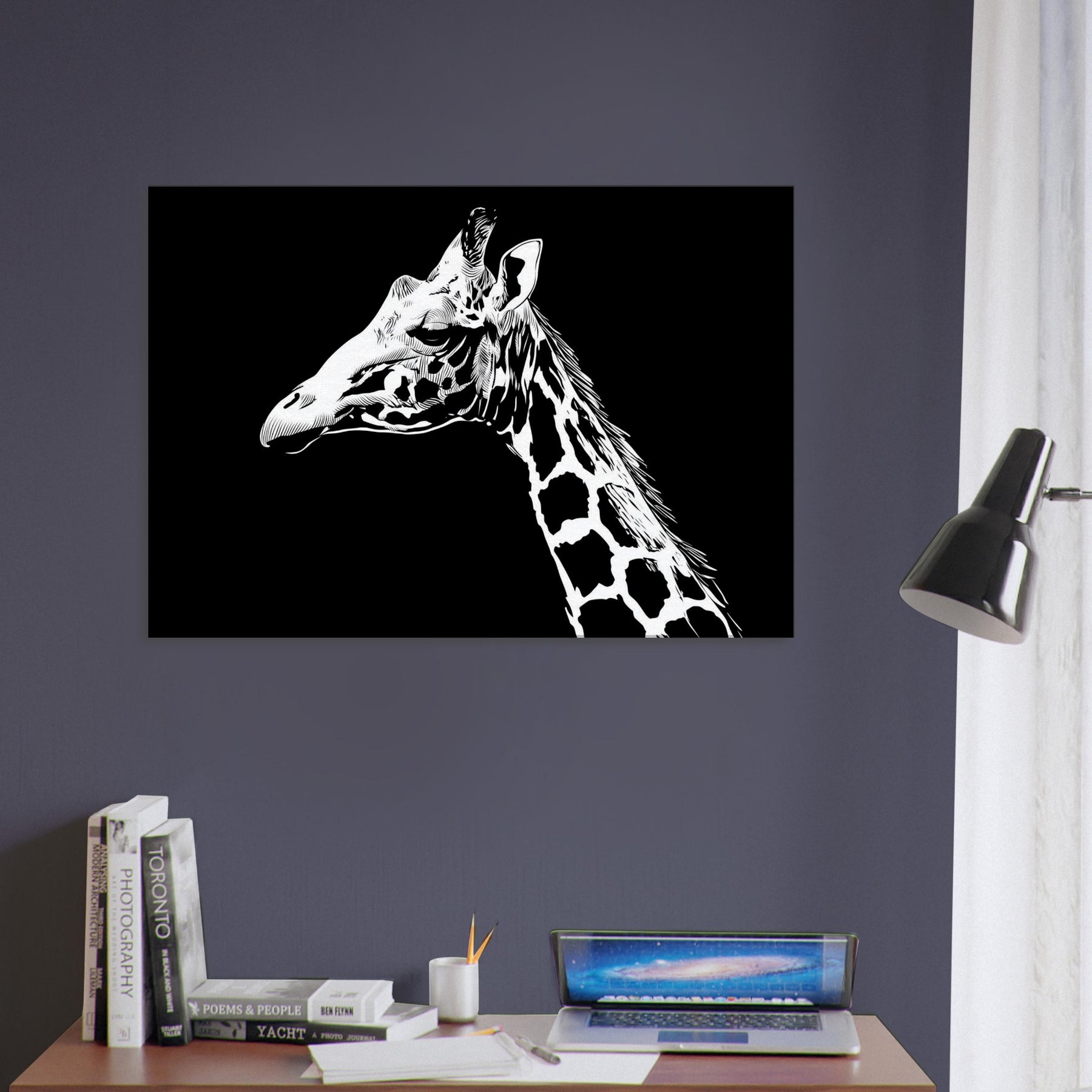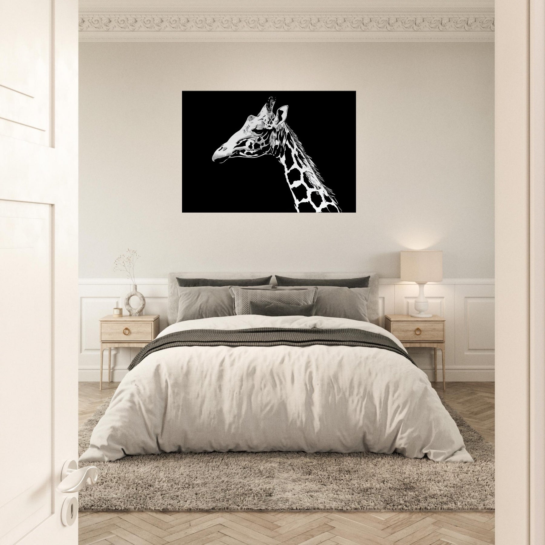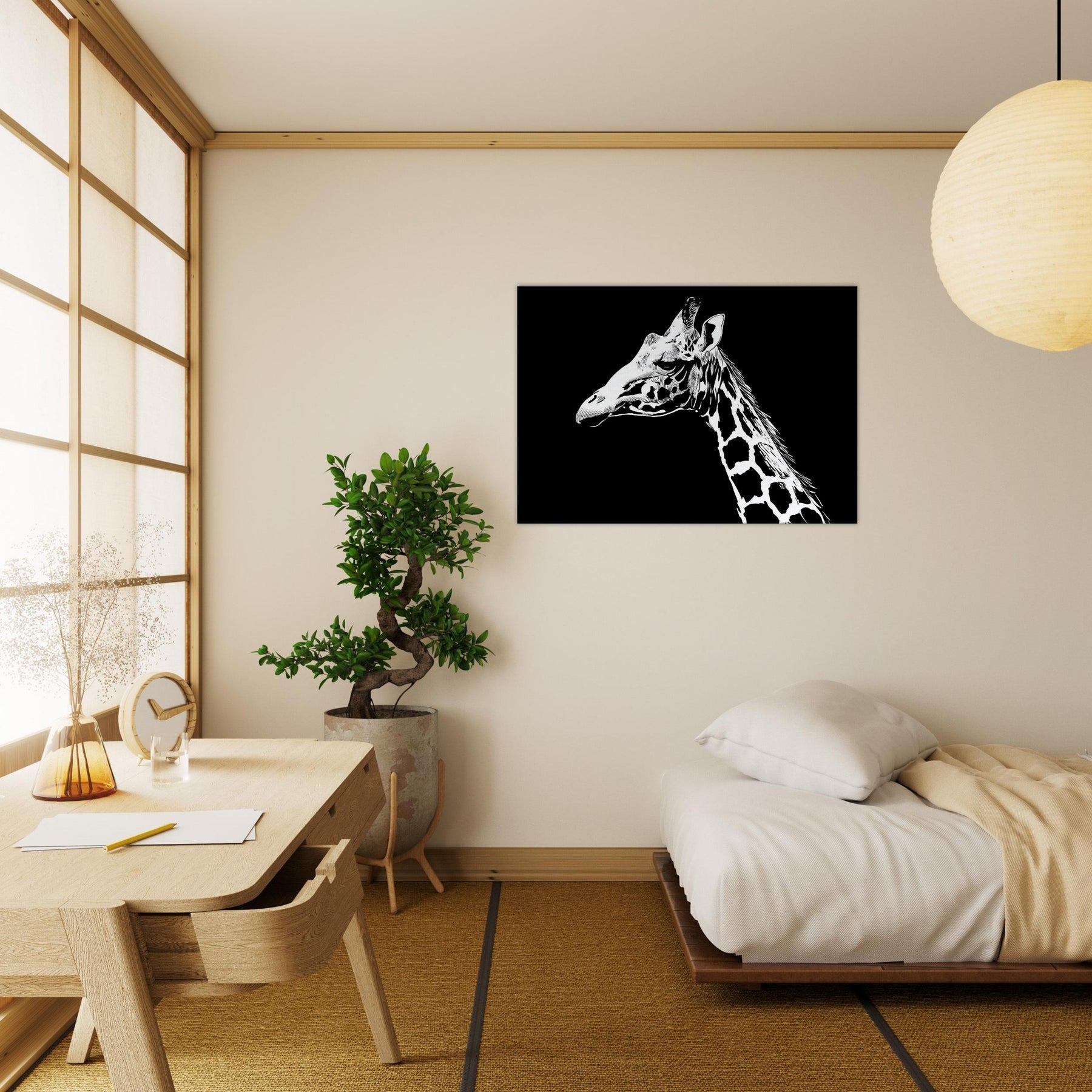 Rendered in bold black and white, this line art captures the giraffe in a single, flowing contour that feels both disciplined and dreamlike. The generous negative space invites breath and stillness, turning any wall into a quiet gallery. Hang it where morning light or lamp glow can skim its edges, and watch the room soften textures, tones, and furniture echo its elegant arcs. A timeless centerpiece for a modern living space.