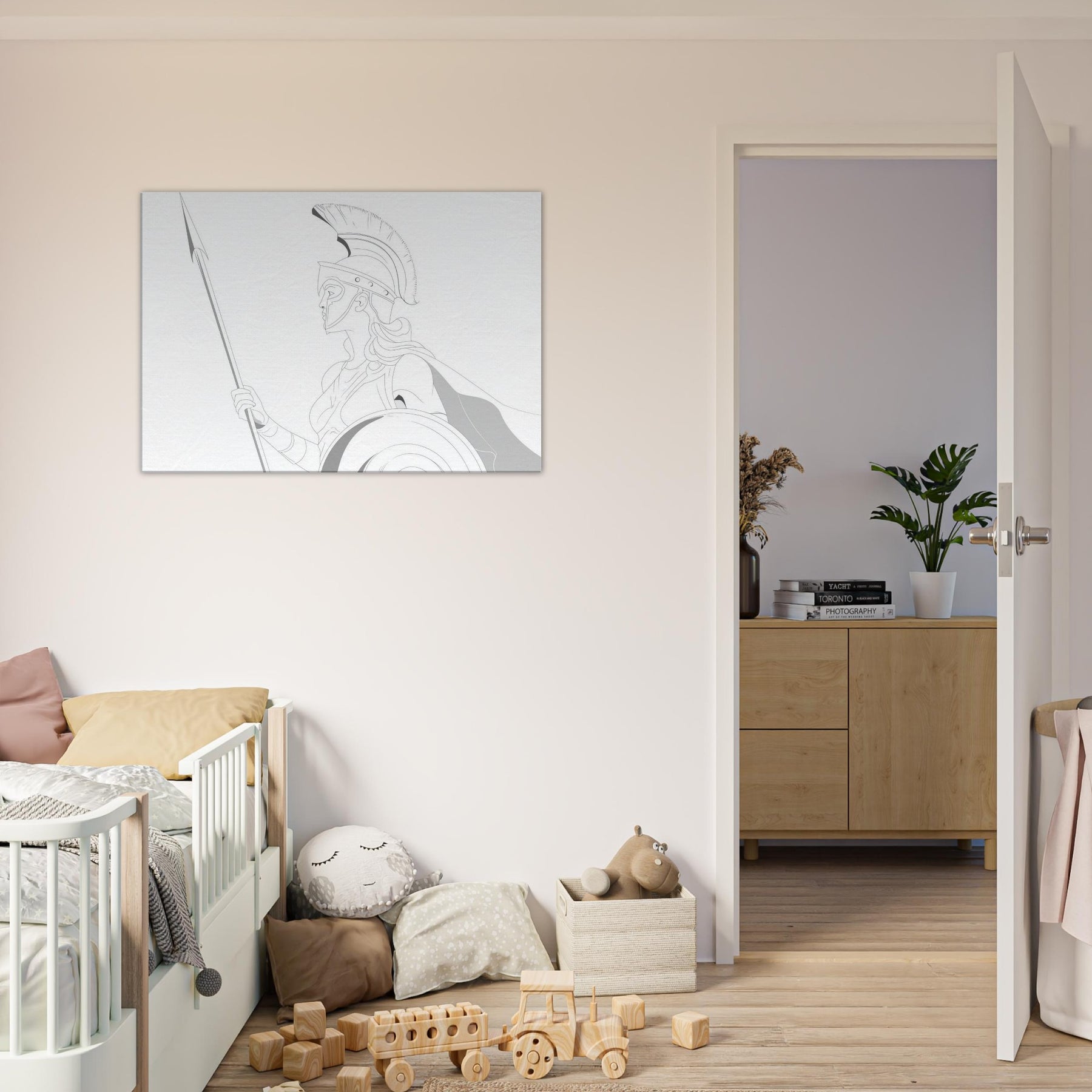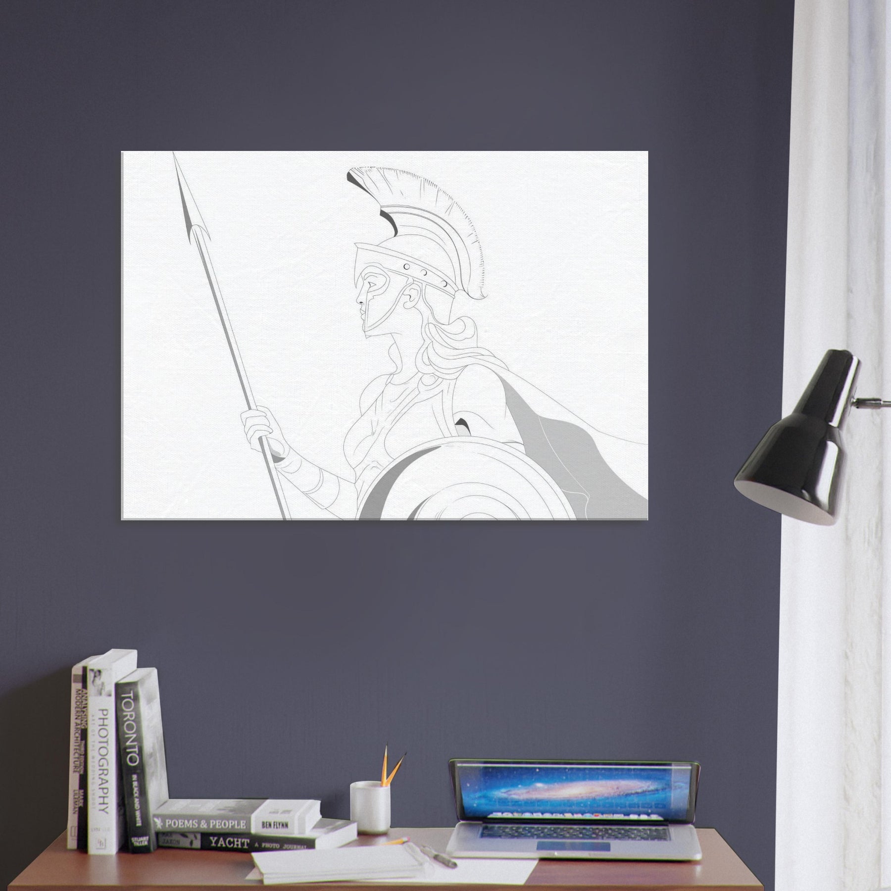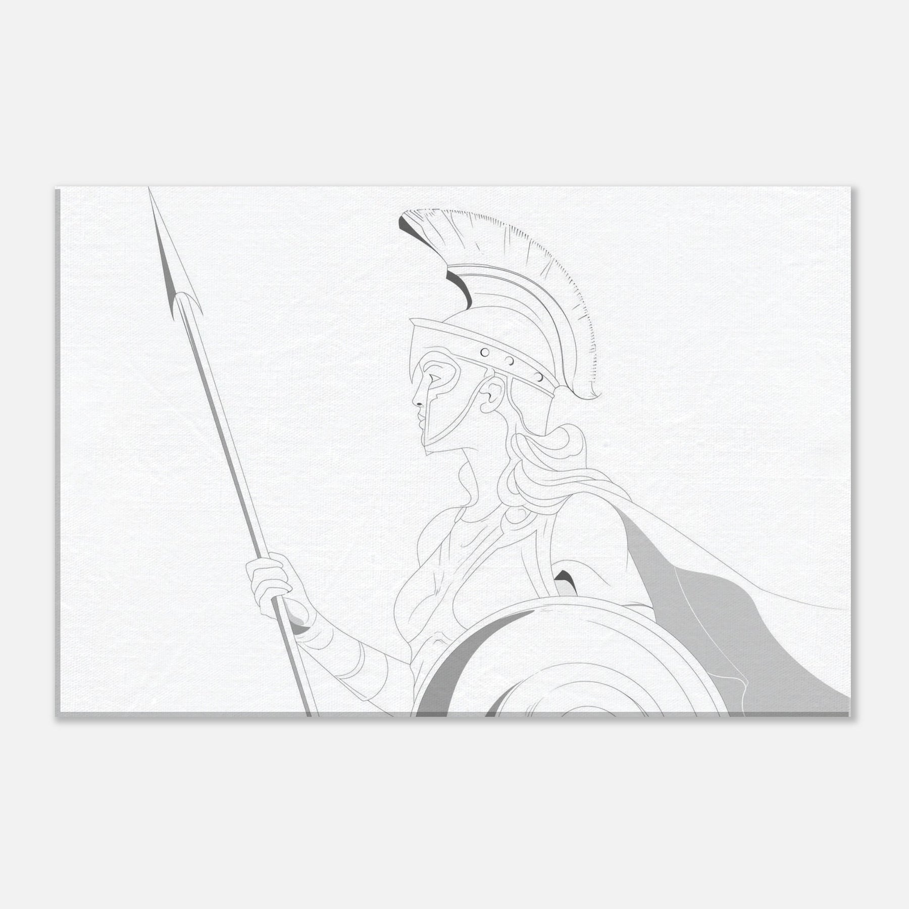 An elegant line art of Athena, Goddess of Wisdom and Strategy, poised with spear and shield. The restrained, graphite lines hum with quiet authority, inviting calm focus and thoughtful reflection. This image anchors a living room or study, lending a timeless aura that heightens depth and conversation. The goddess's poised gaze and deft contours evoke courage, strategy, and clarity, turning any space into a sanctuary for ideas and elegant, contemplative living.