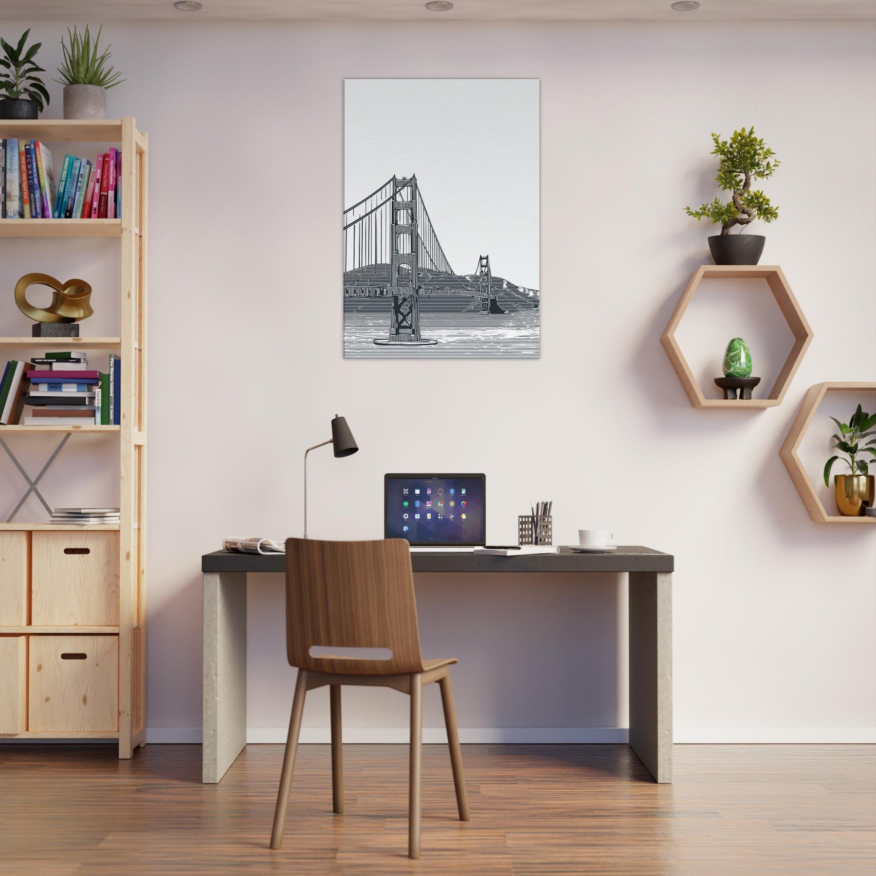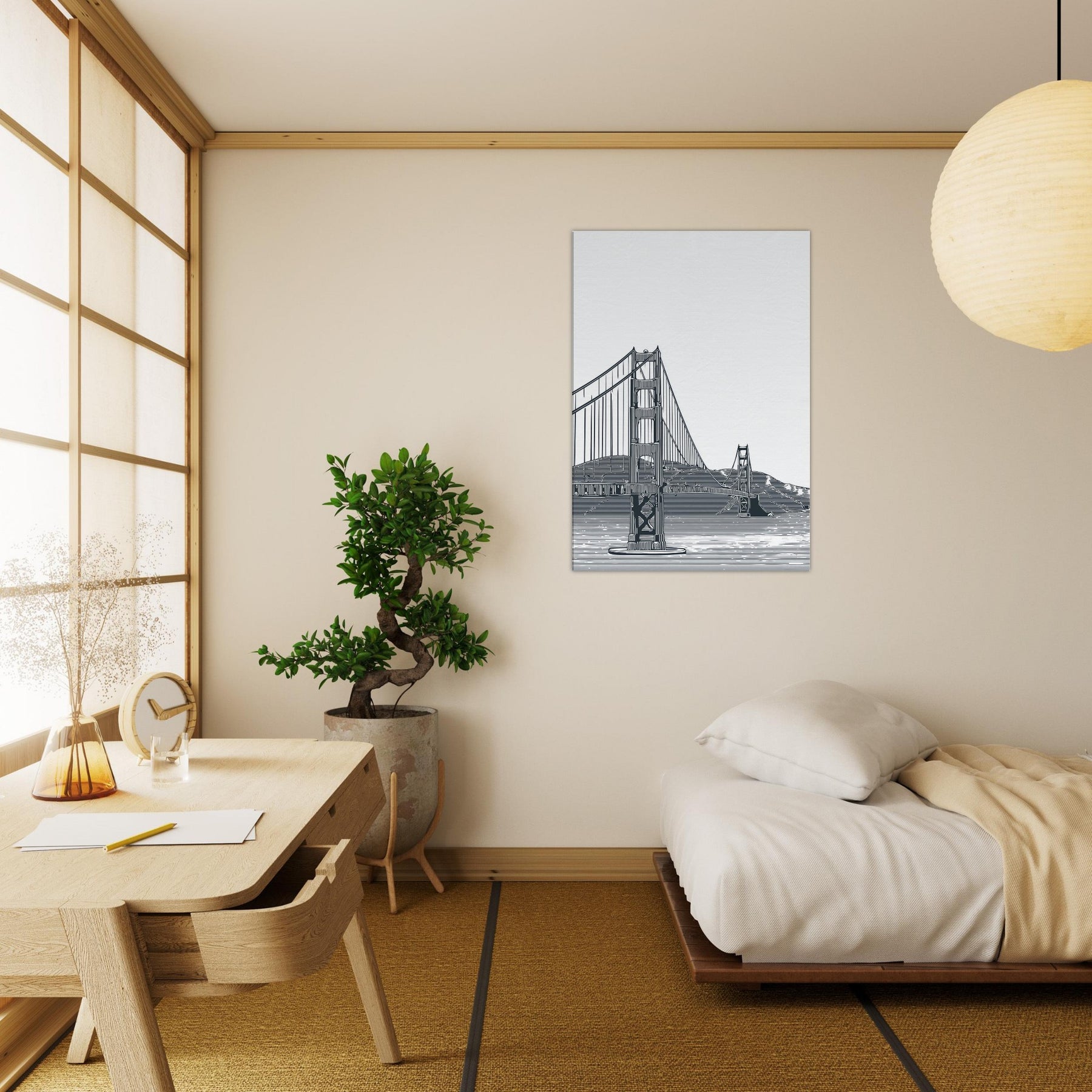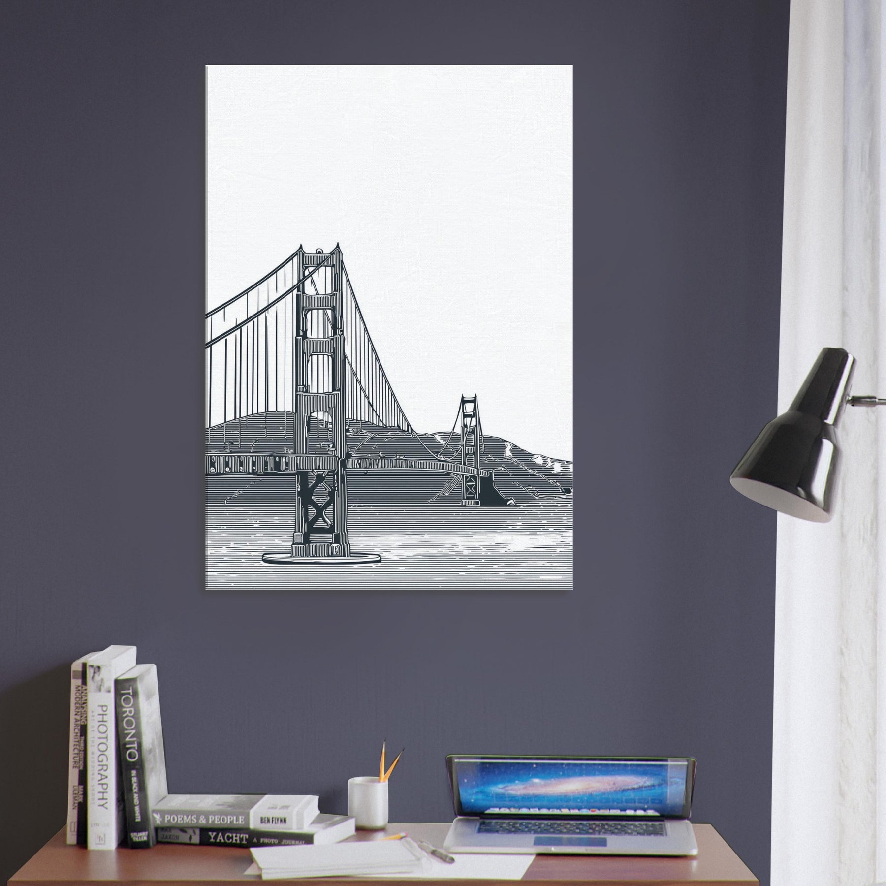 Immerse your space in the quiet elegance of a city silhouette. This line art depiction of the Golden Gate Bridge captures the tension of taut cables and soaring towers with restrained, precise strokes. The high contrast composition suggests dawn over the bay, inviting calm, focus, and spaciousness. Perfect above a sofa or in a study, it adds architectural rhythm without overpowering color schemes a sophisticated nod to urban craft and timeless distance, inviting you to pause, breathe, and frame your everyday moments with quiet grandeur.