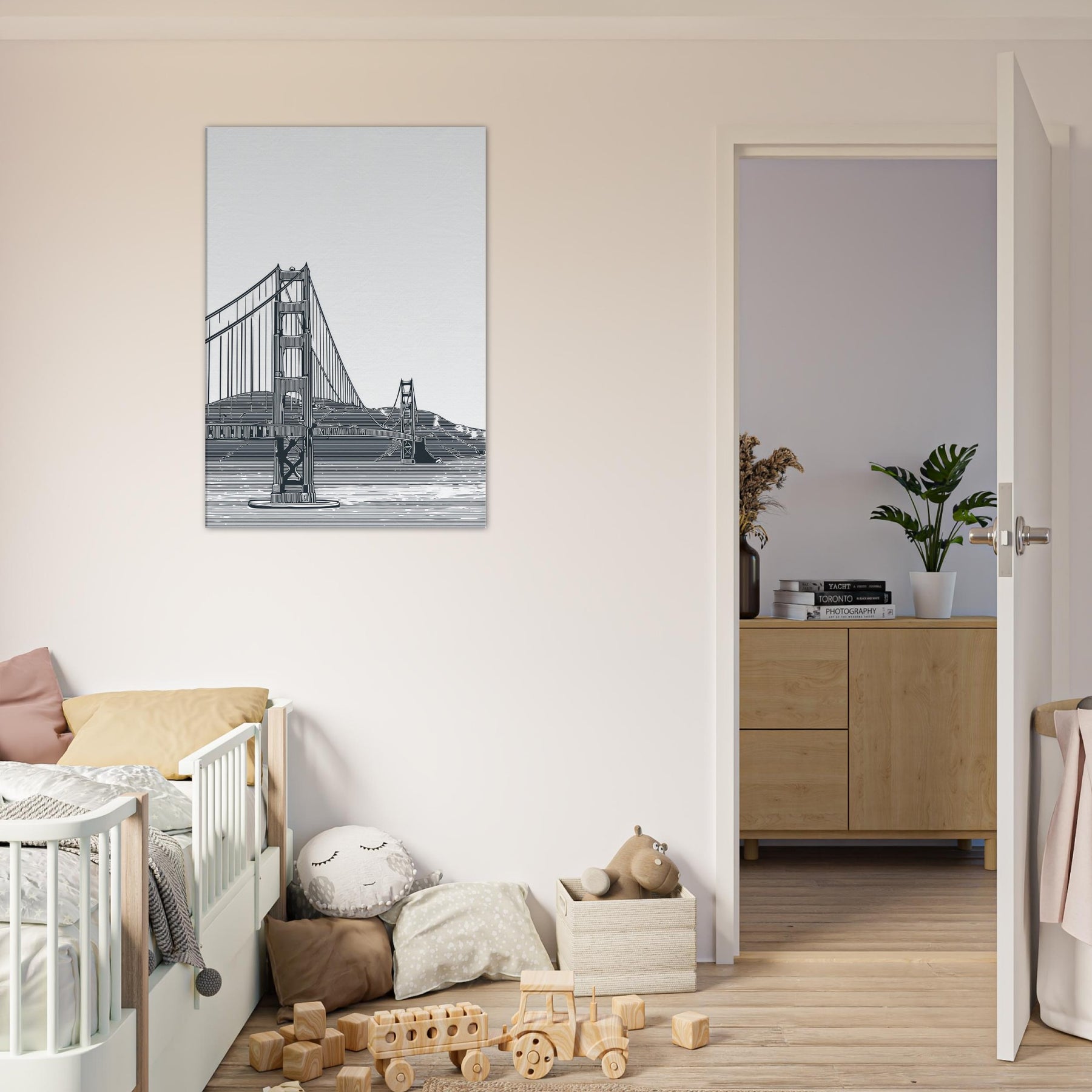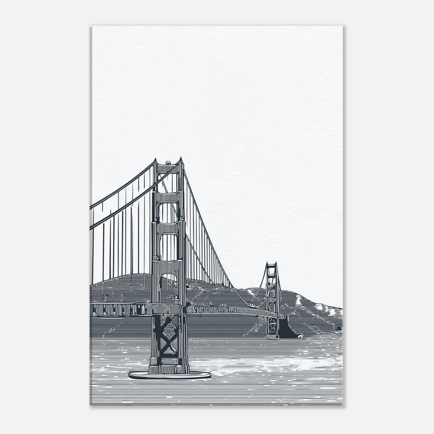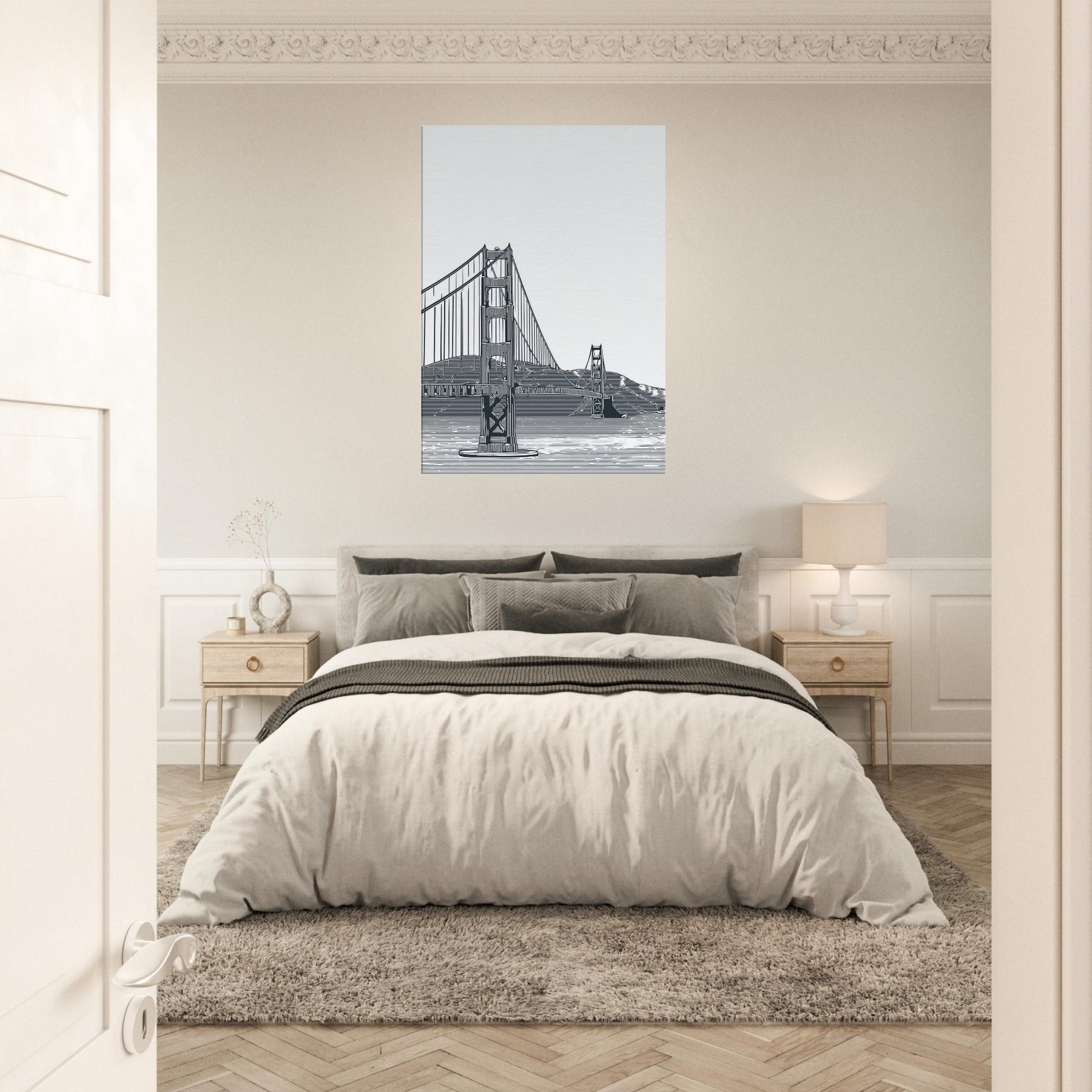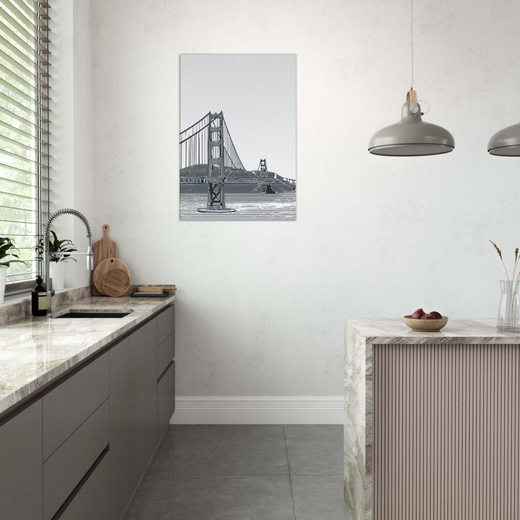 Immerse your space in the quiet elegance of a city silhouette. This line art depiction of the Golden Gate Bridge captures the tension of taut cables and soaring towers with restrained, precise strokes. The high contrast composition suggests dawn over the bay, inviting calm, focus, and spaciousness. Perfect above a sofa or in a study, it adds architectural rhythm without overpowering color schemes a sophisticated nod to urban craft and timeless distance, inviting you to pause, breathe, and frame your everyday moments with quiet grandeur.