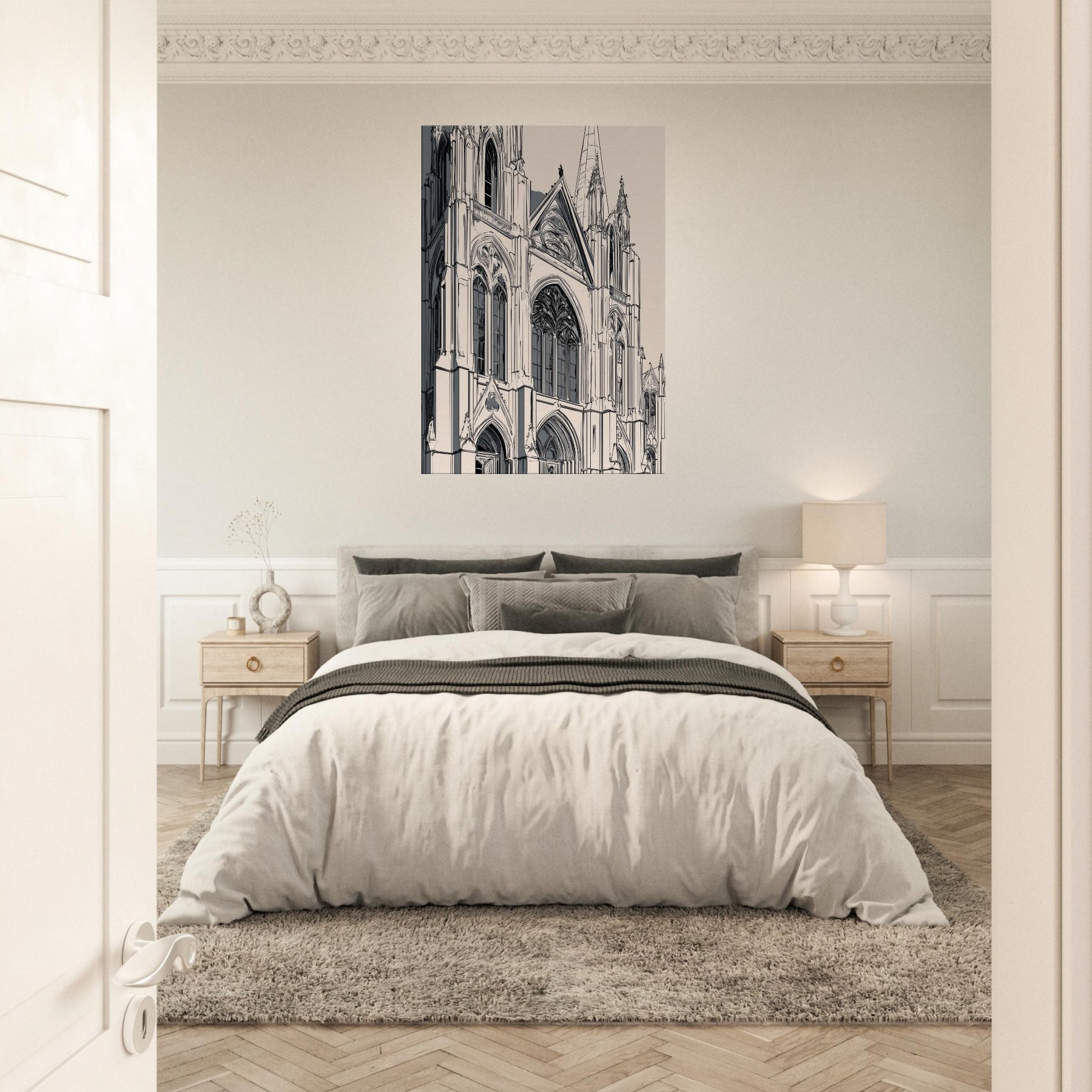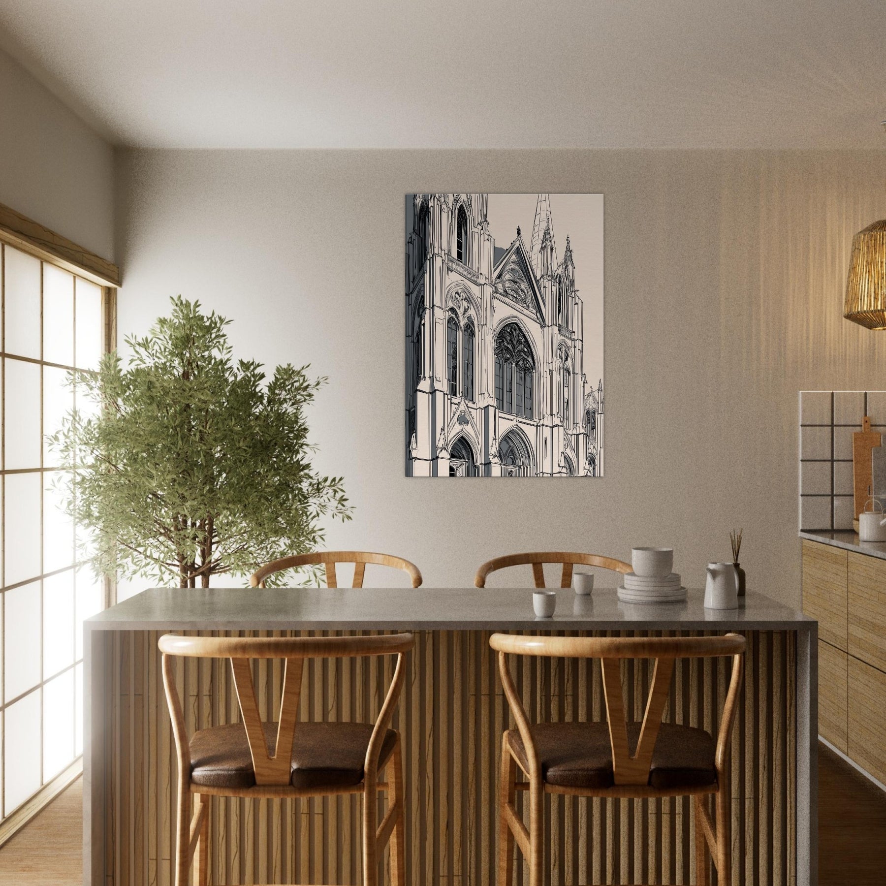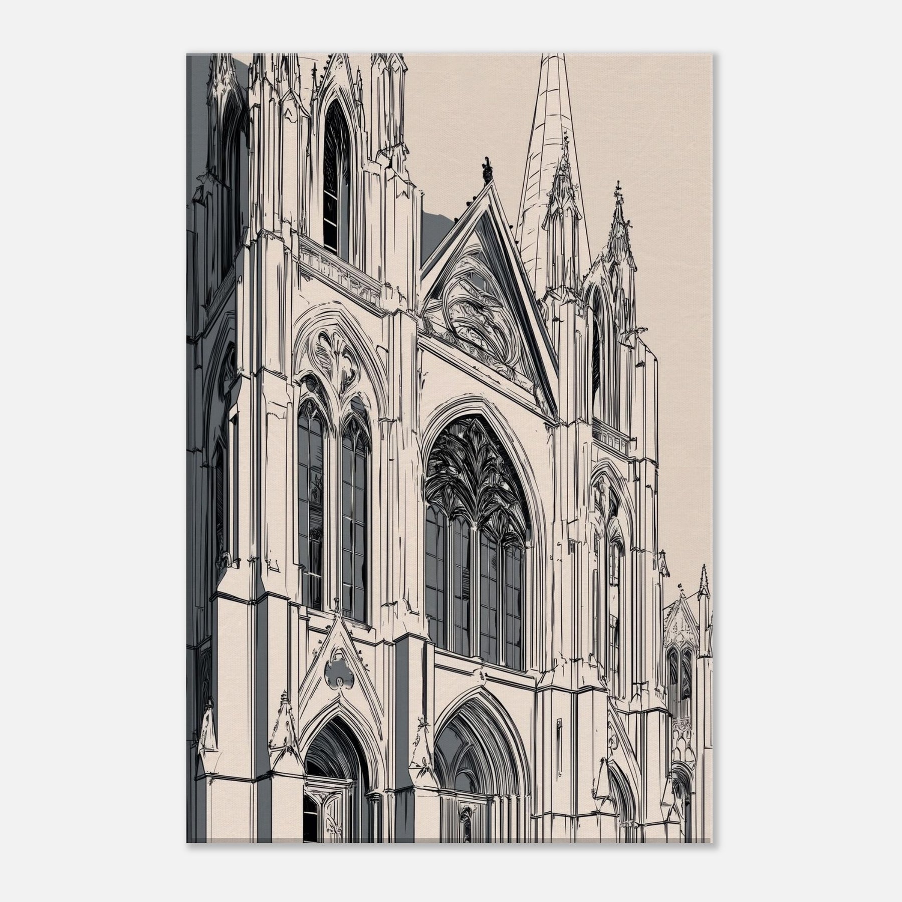 Immerse your space in the quiet grandeur of a Gothic Cathedral rendered in elegant line art. This monochrome study traces soaring arches, tracery, and stone shadows with delicate precision, inviting stillness and reflection. Printed on a warm beige ground, it complements modern interiors while evoking cathedral hush and timeless architecture. Perfect over a sofa or console, it sharpens the room's atmosphere without shouting, turning hallways of light into a gallery of calm, contemplation, and refined, architectural poetry.
