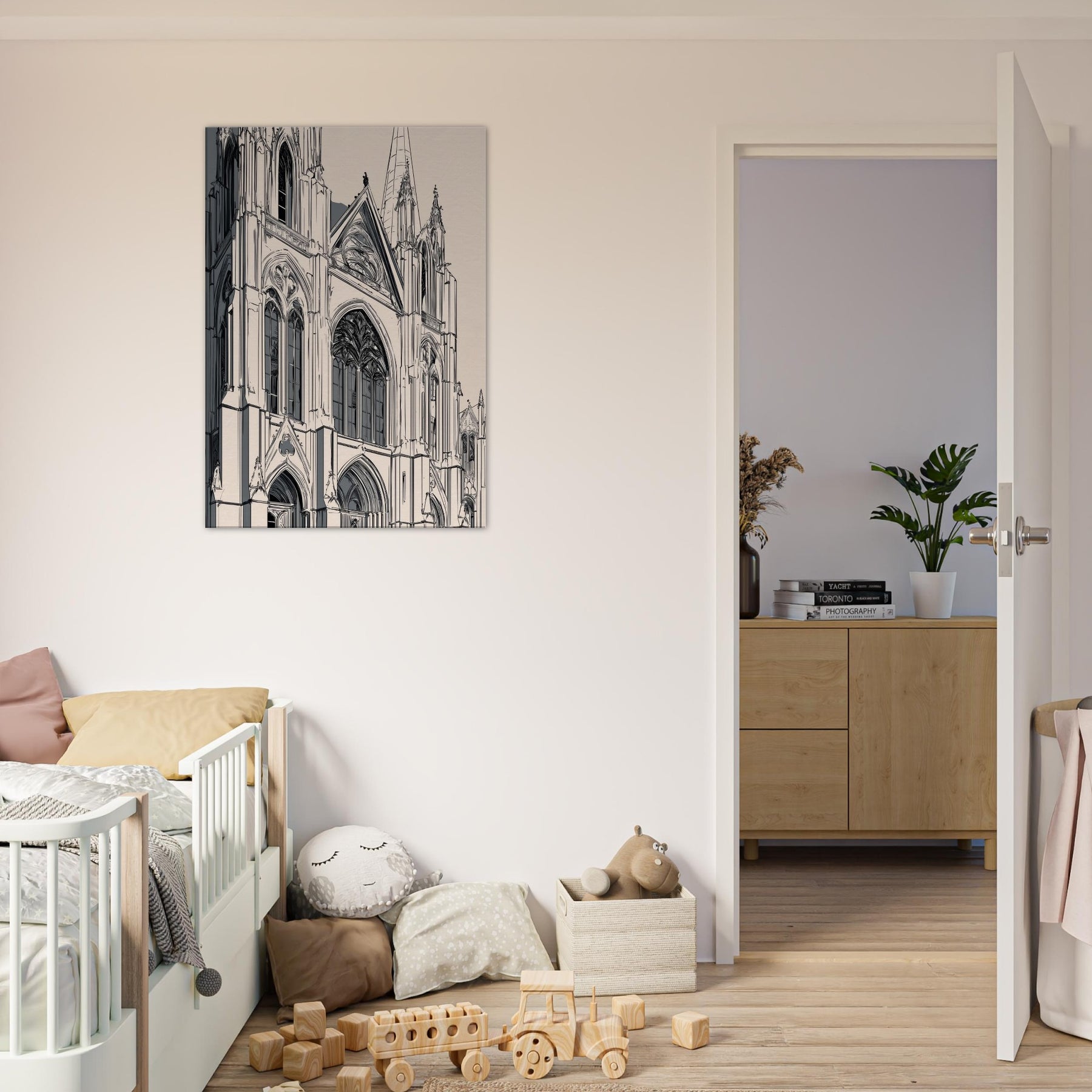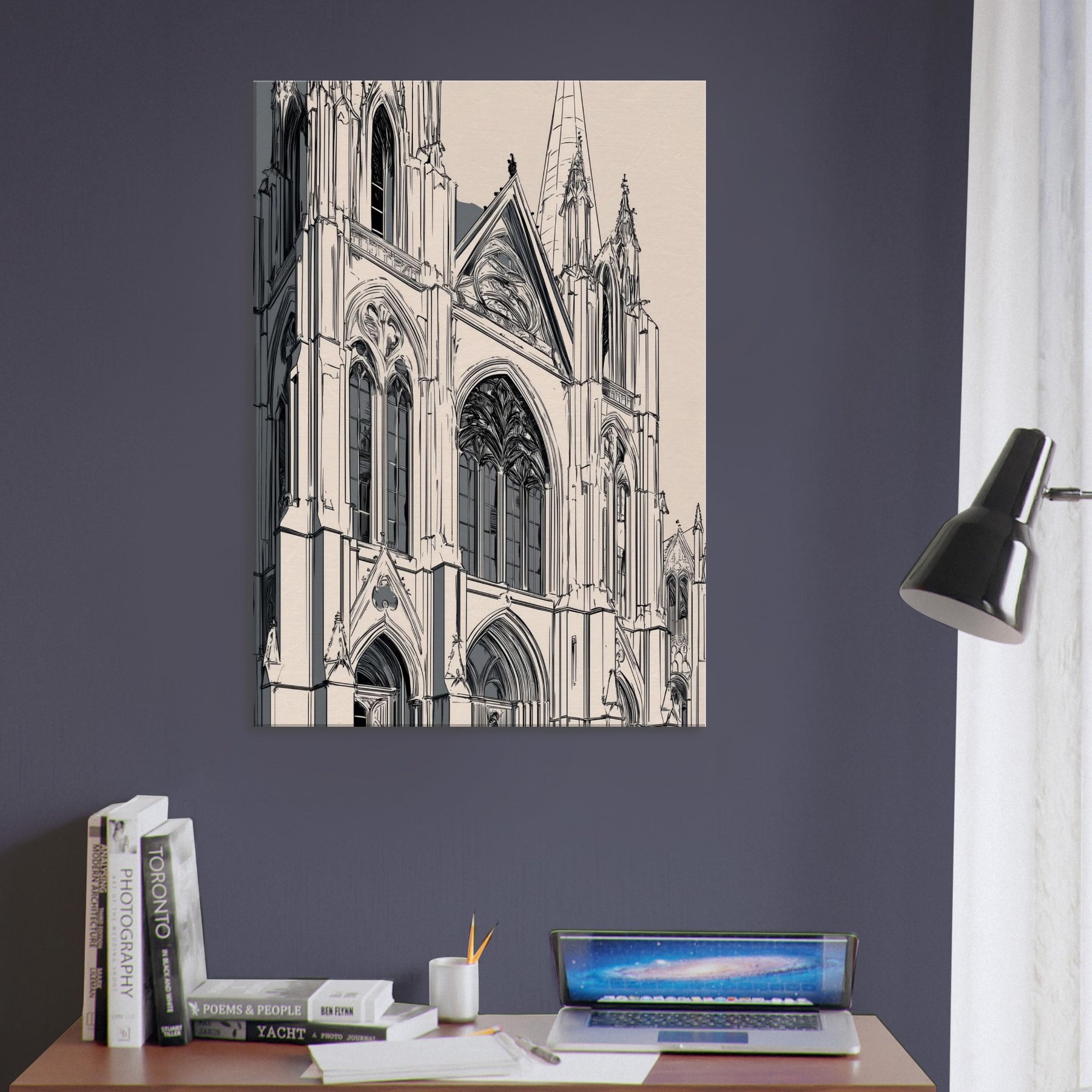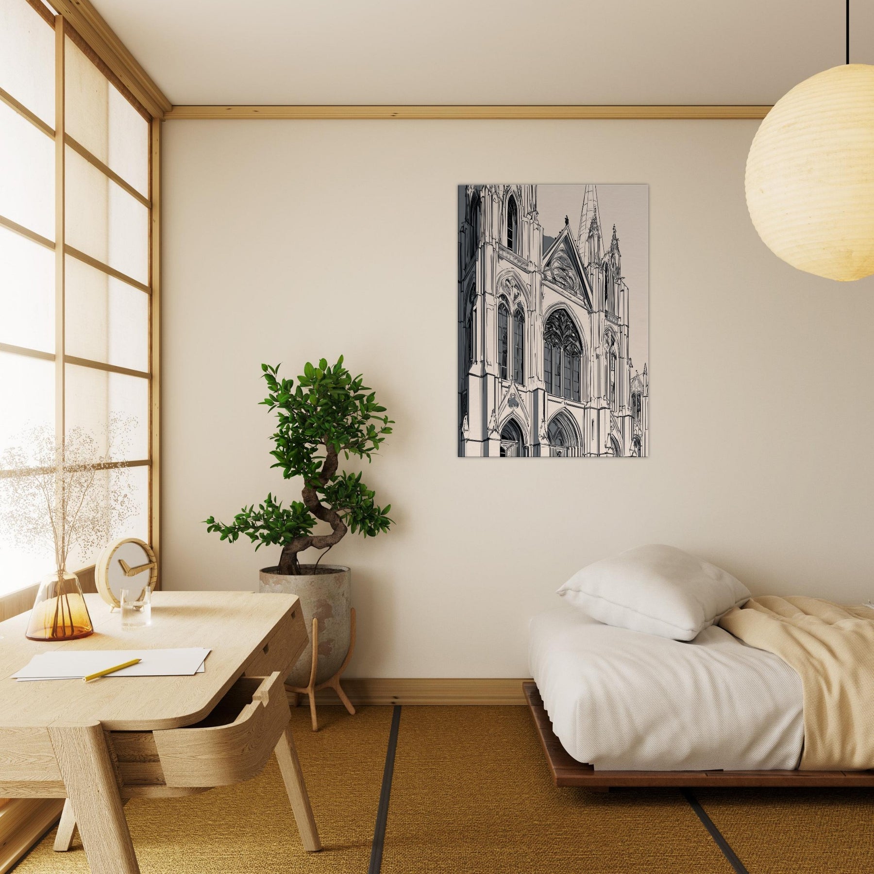 Immerse your space in the quiet grandeur of a Gothic Cathedral rendered in elegant line art. This monochrome study traces soaring arches, tracery, and stone shadows with delicate precision, inviting stillness and reflection. Printed on a warm beige ground, it complements modern interiors while evoking cathedral hush and timeless architecture. Perfect over a sofa or console, it sharpens the room's atmosphere without shouting, turning hallways of light into a gallery of calm, contemplation, and refined, architectural poetry.