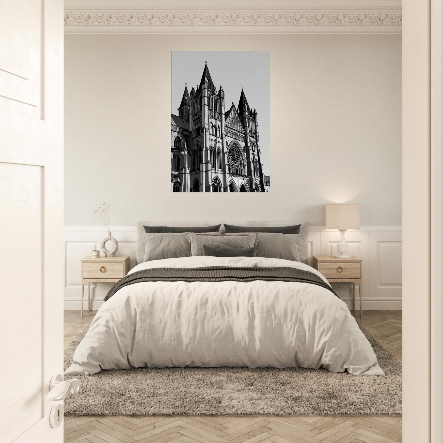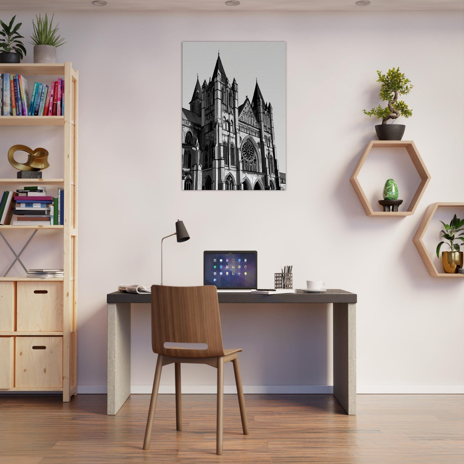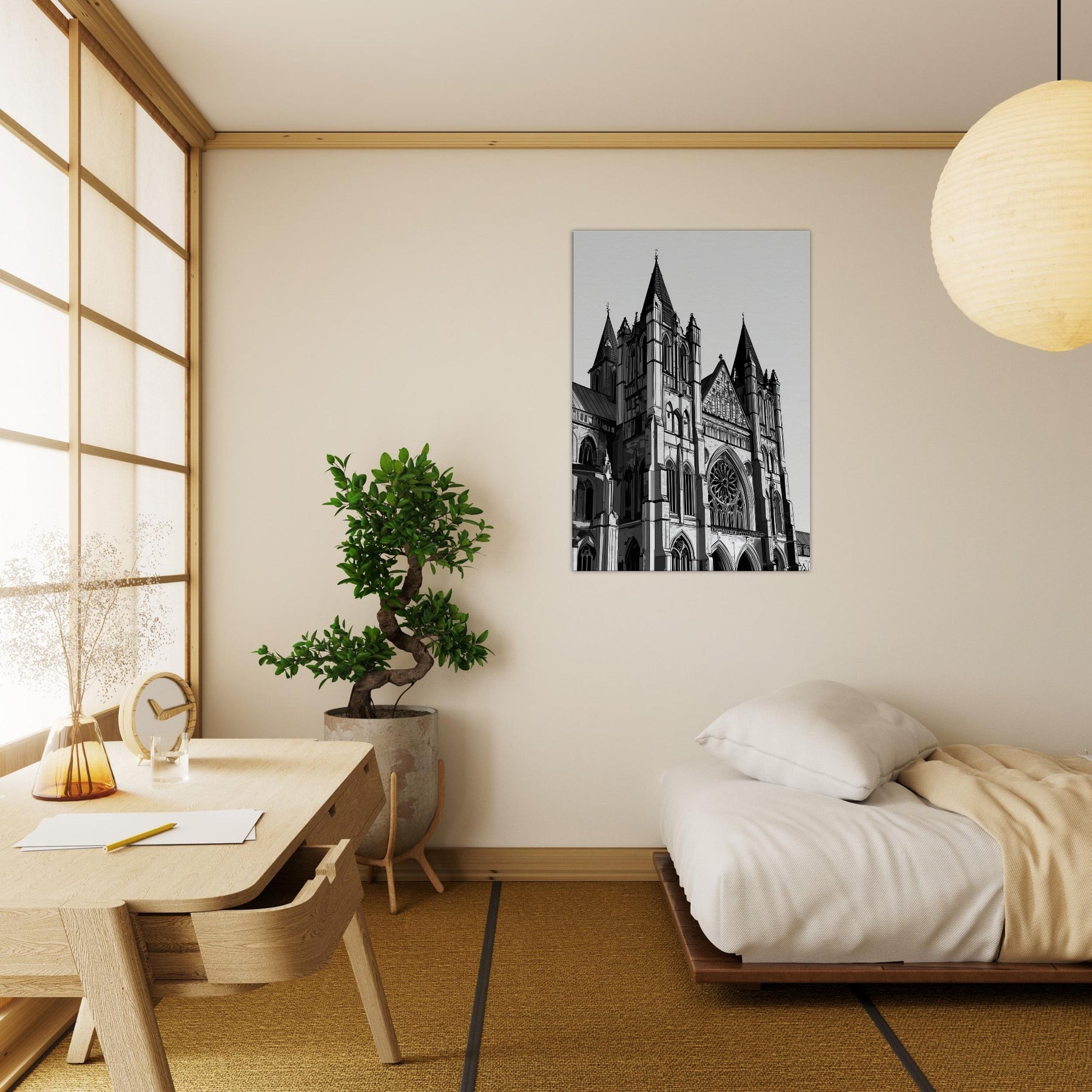Let your space breathe with the presence of a Gothic Cathedral, rendered in crisp architectural lines that invite quiet reflection. The stark black and gray contrast creates a dramatic focal point, while towering arches and a radiant rosette evoke centuries of craftsmanship. Ideal for living rooms, studies, or hallways, this piece adds depth without crowding, catching light as the day shifts. It transforms walls into a contemplative horizon where stone, shadow, and memory meet in serene, sophisticated balance.