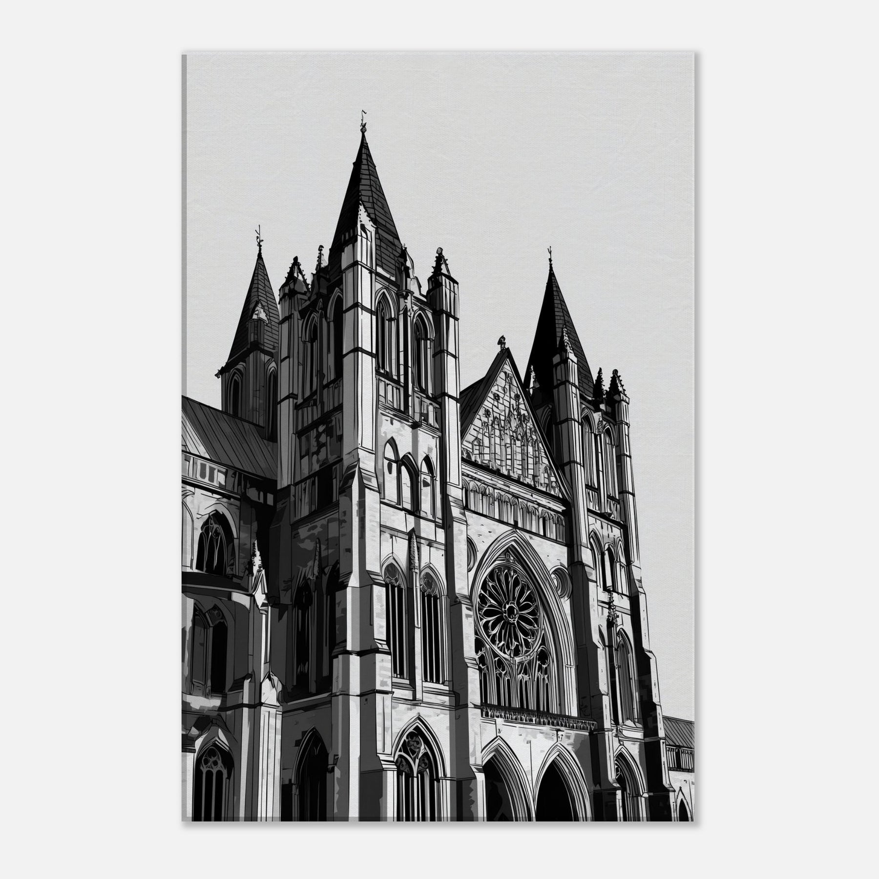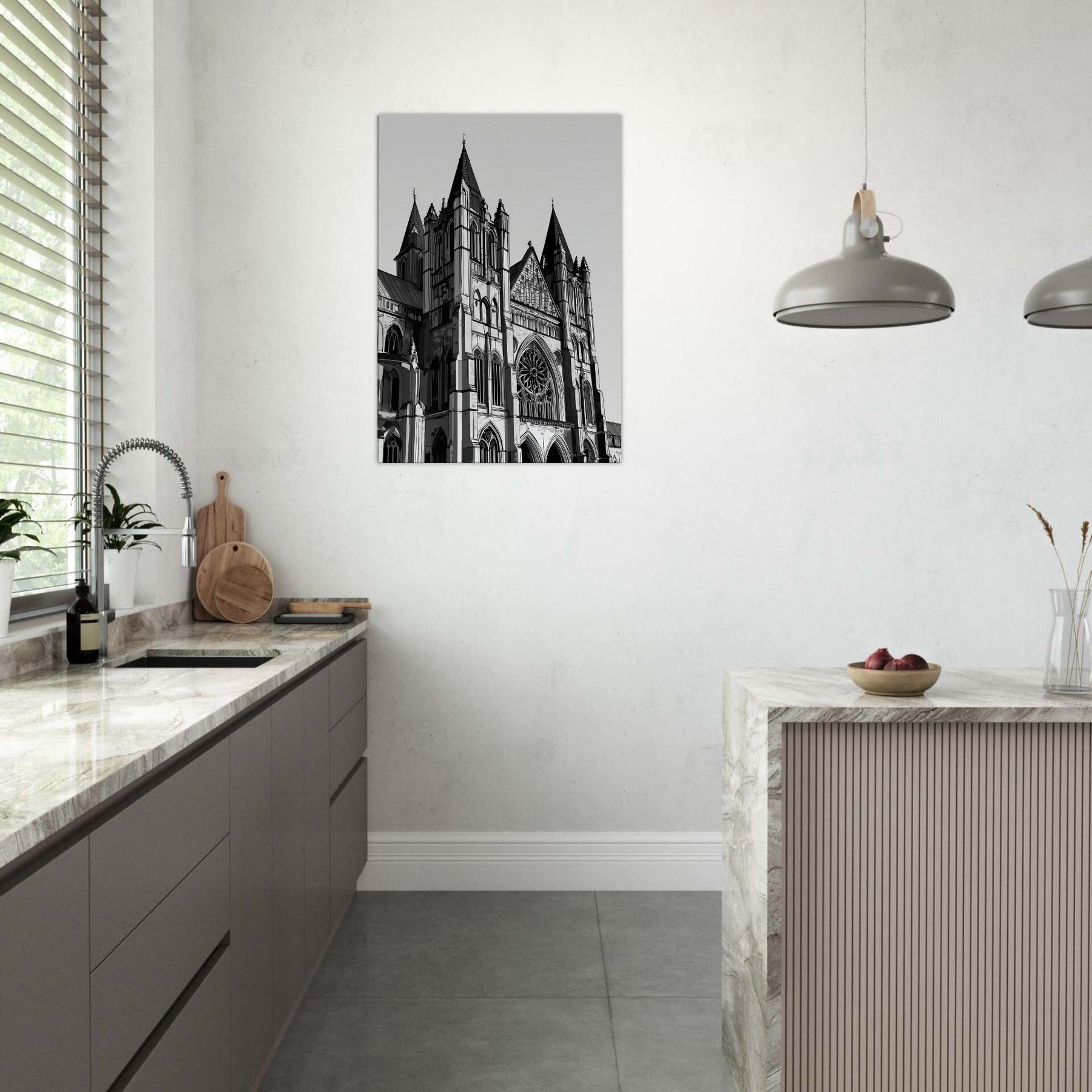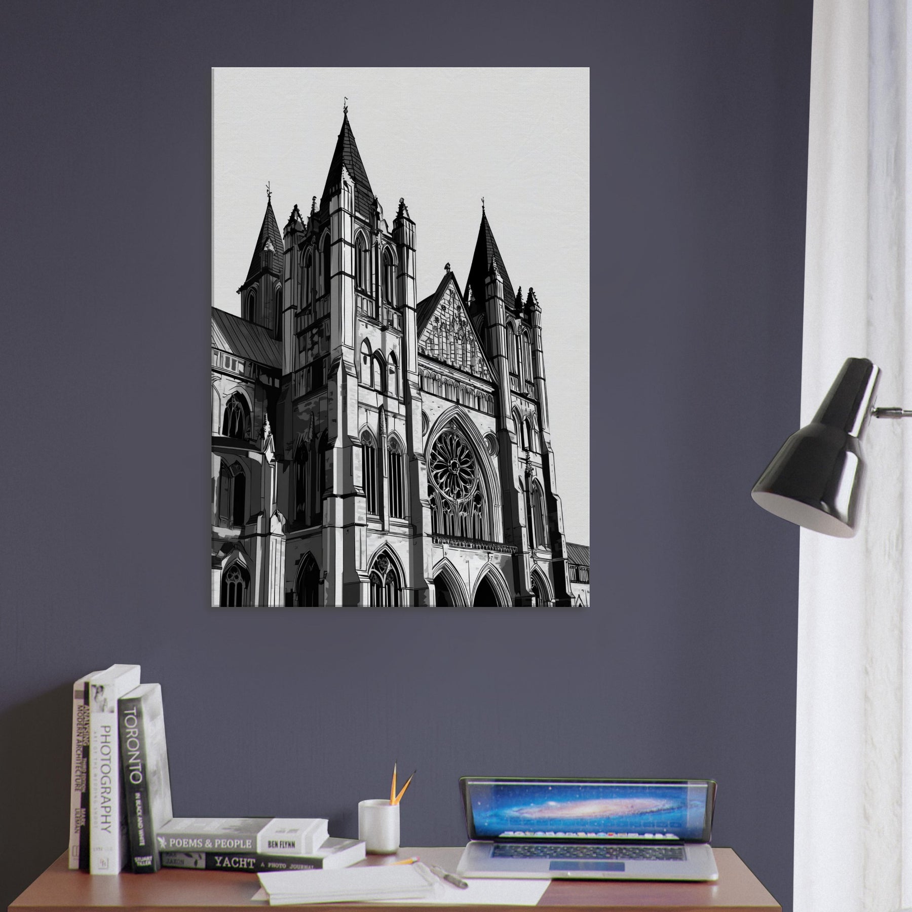 Let your space breathe with the presence of a Gothic Cathedral, rendered in crisp architectural lines that invite quiet reflection. The stark black and gray contrast creates a dramatic focal point, while towering arches and a radiant rosette evoke centuries of craftsmanship. Ideal for living rooms, studies, or hallways, this piece adds depth without crowding, catching light as the day shifts. It transforms walls into a contemplative horizon where stone, shadow, and memory meet in serene, sophisticated balance.