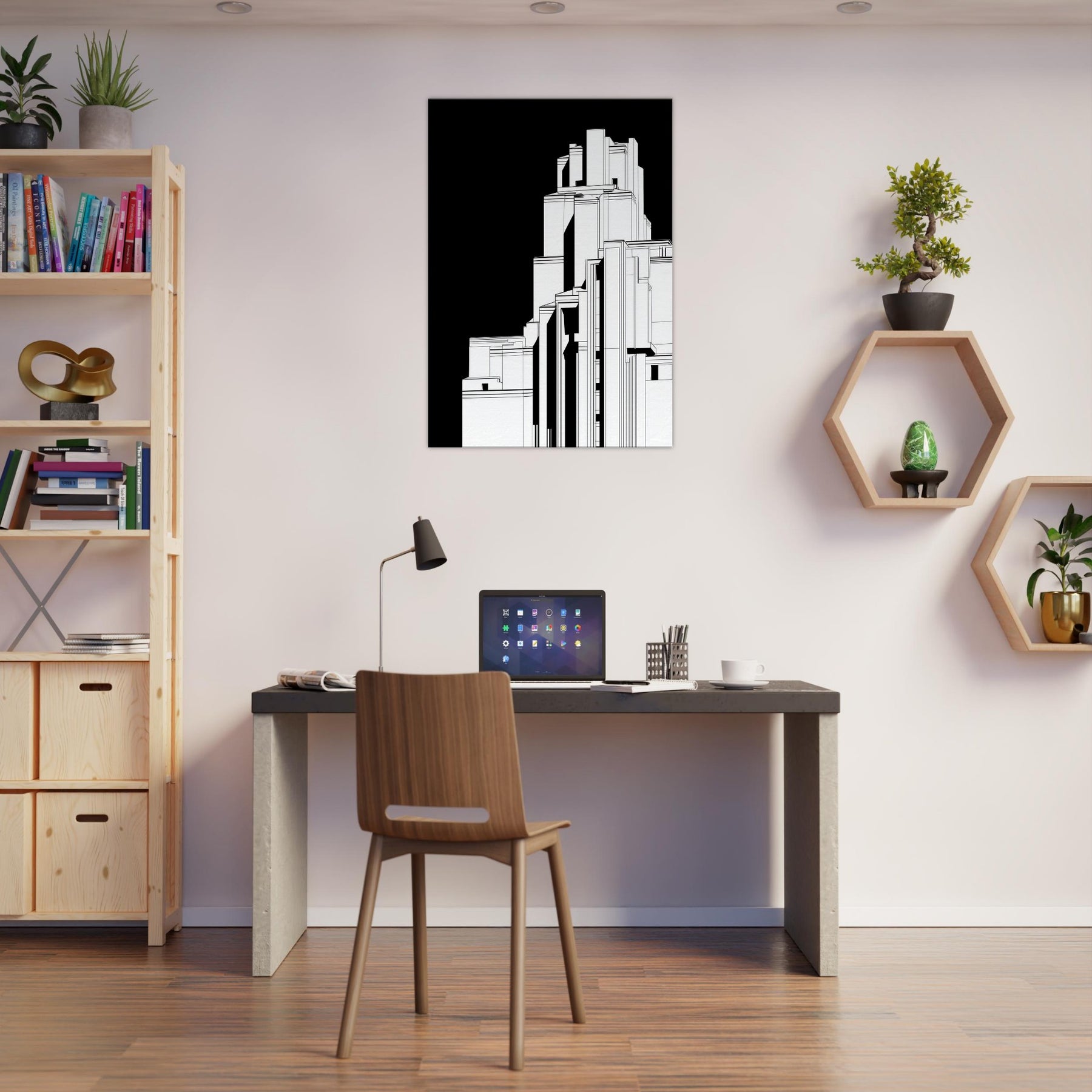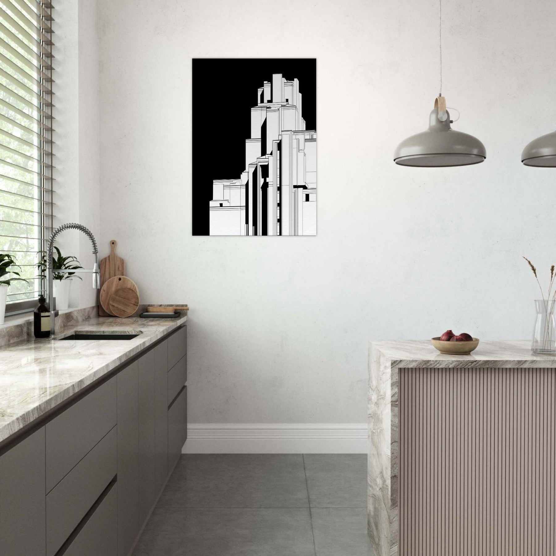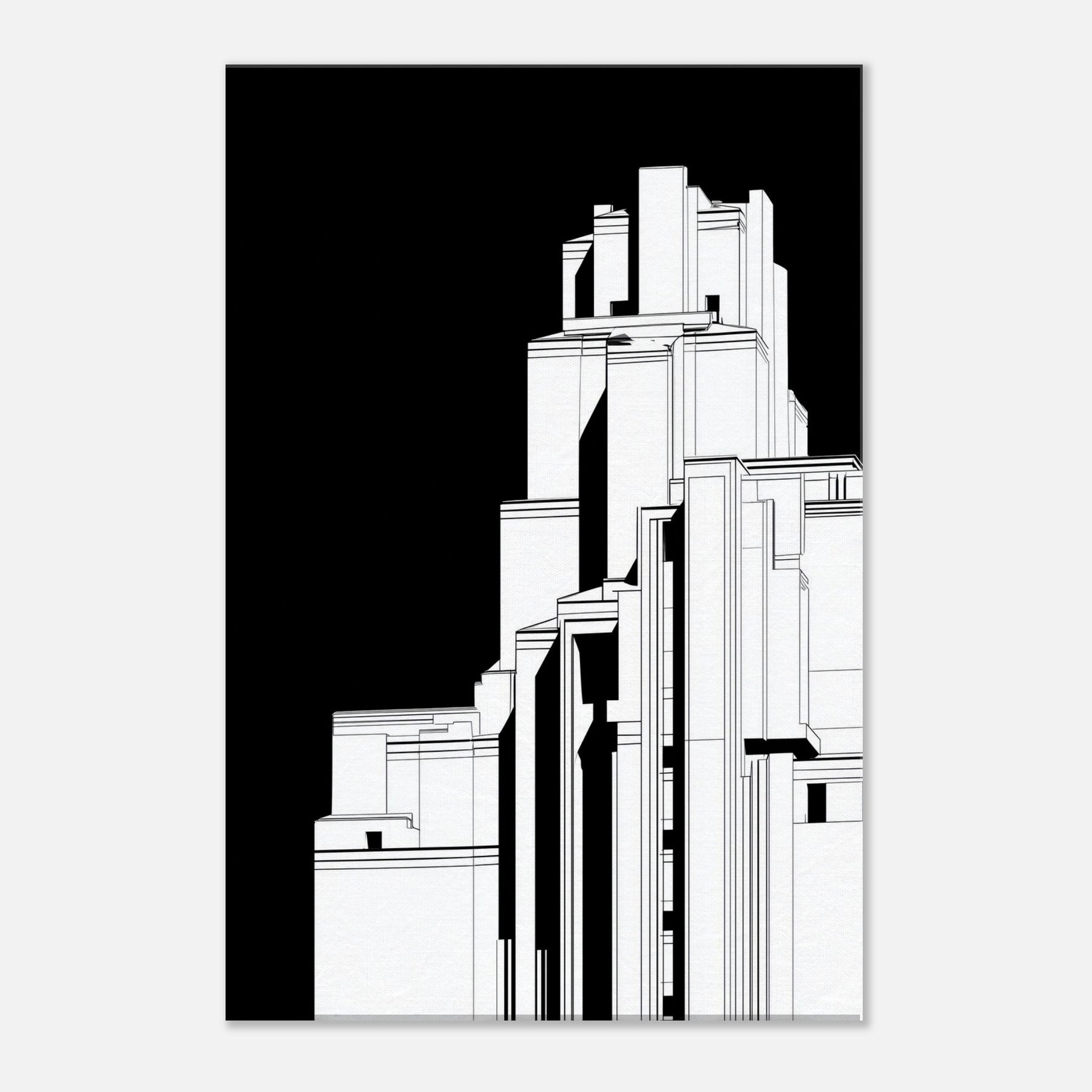 Step into a cityscape where sacred monument meets urban form. This line art renders Christ the Redeemer as a poised silhouette within towering geometric structures, the black backdrop whispering focus and reverence. The crisp white lines trace light and shadow, inviting calm to settle over a living room or study. In its reductive elegance, the piece becomes a contemplative window the sense of height and horizon encouraging quiet reflection, while the architectural rhythm lends modern, timeless grace to any space.