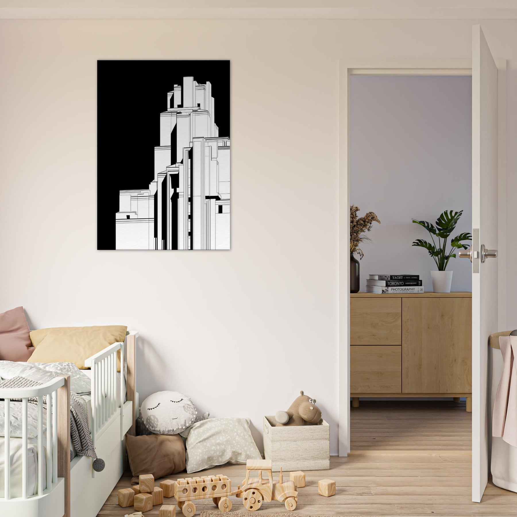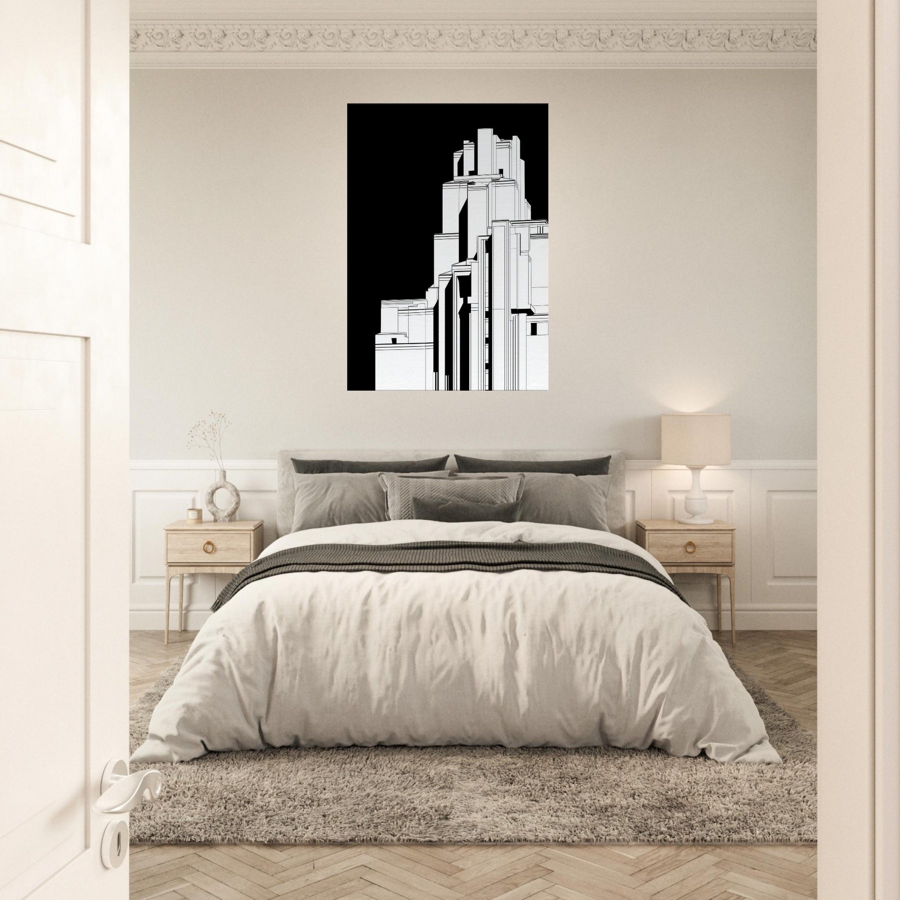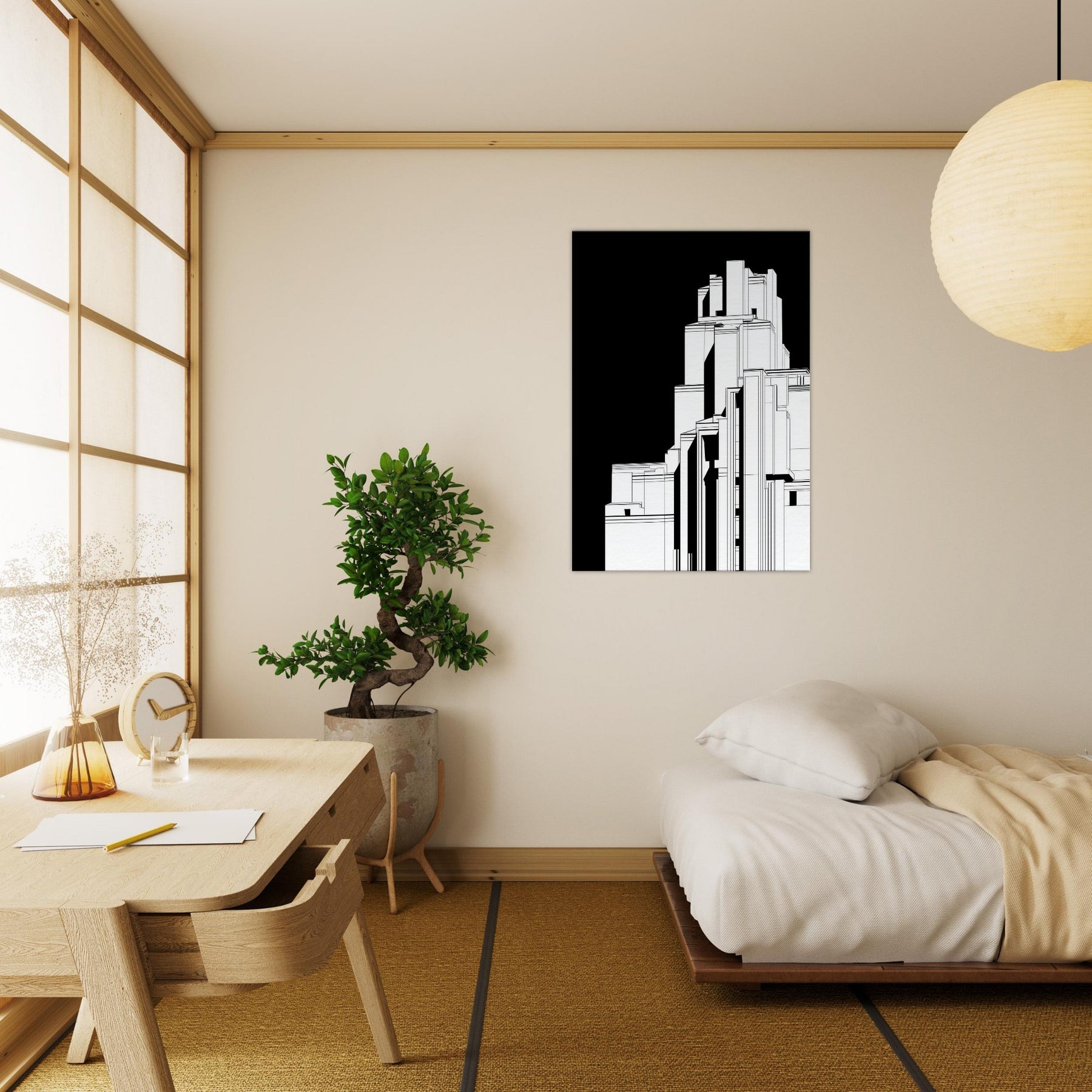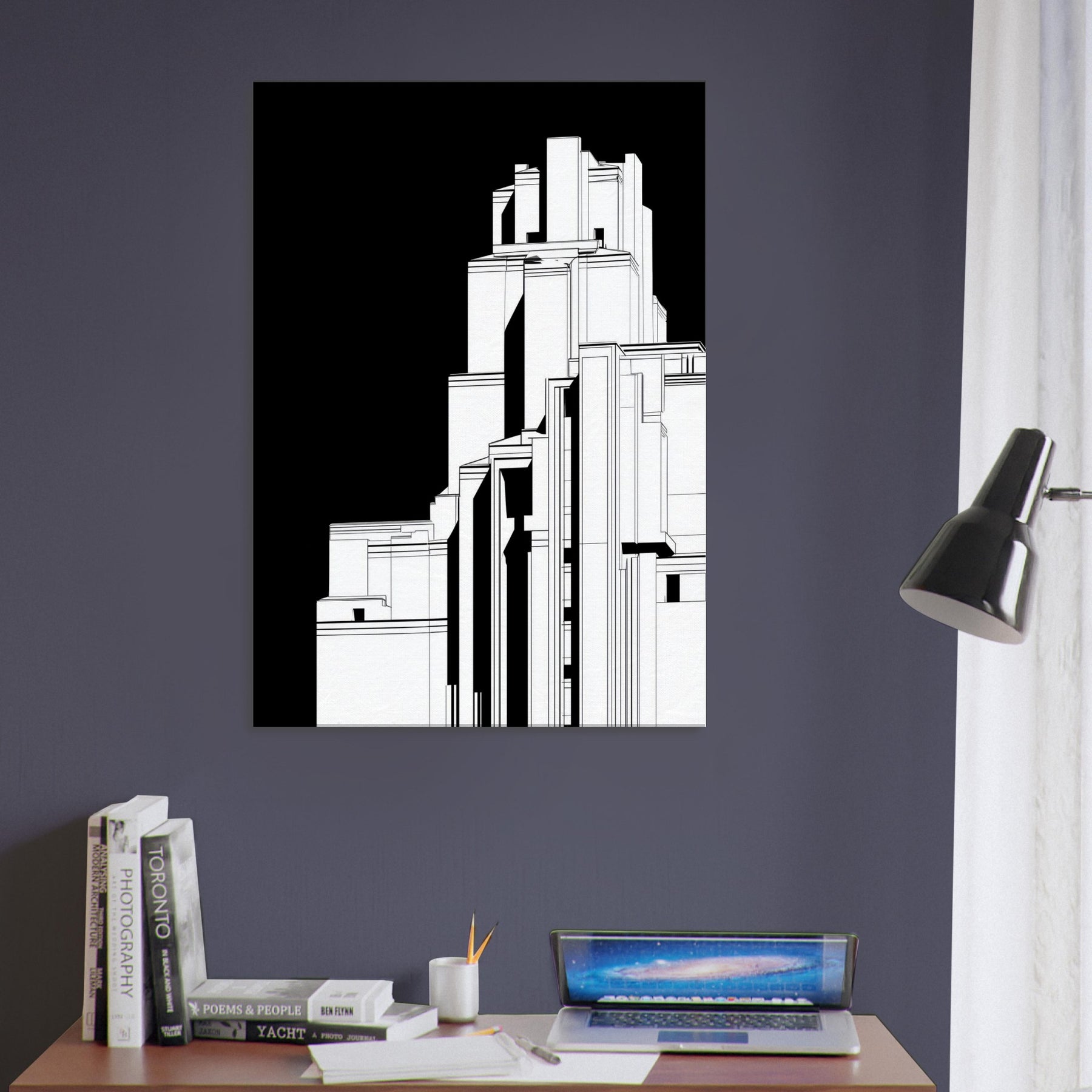 Step into a cityscape where sacred monument meets urban form. This line art renders Christ the Redeemer as a poised silhouette within towering geometric structures, the black backdrop whispering focus and reverence. The crisp white lines trace light and shadow, inviting calm to settle over a living room or study. In its reductive elegance, the piece becomes a contemplative window the sense of height and horizon encouraging quiet reflection, while the architectural rhythm lends modern, timeless grace to any space.
