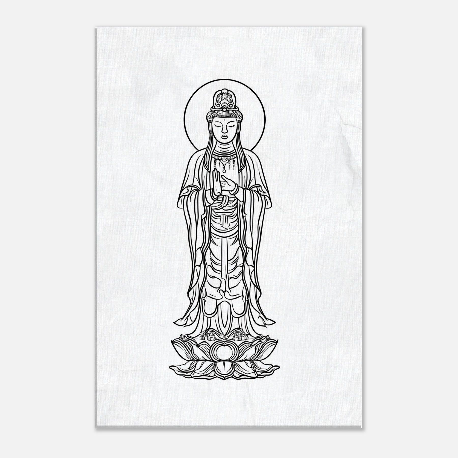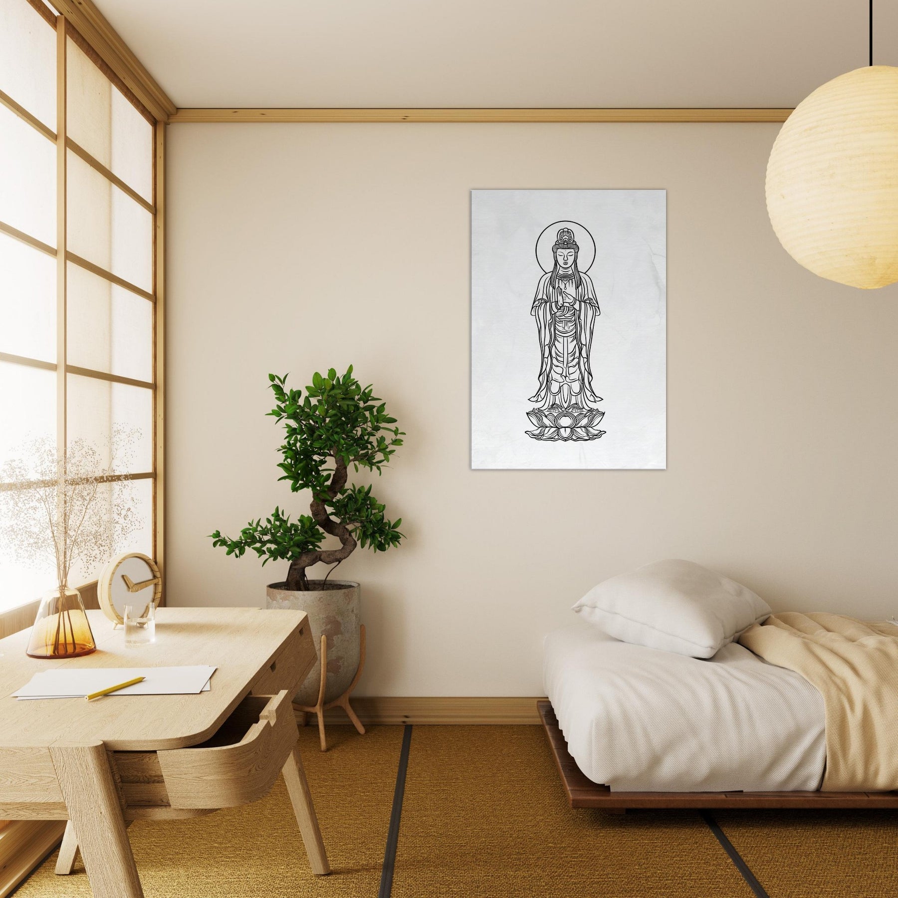 Guanyin stands in tranquil vow, rendered in clean, continuous lines that glow with quiet grace. This mystic figure, poised on a lotus, radiates calm even in the busiest room, inviting a slower breath and deeper focus. The minimalist linework creates an airy silhouette that feels contemporary yet timeless, pairing softly with neutral palettes or bold accents. Hang it at eye level to anchor a meditation corner, living room, or bedroom, and let the purity of Guanyin inspire daily moments of clarity. The central subject is Kuan Yin (Guanyin).
