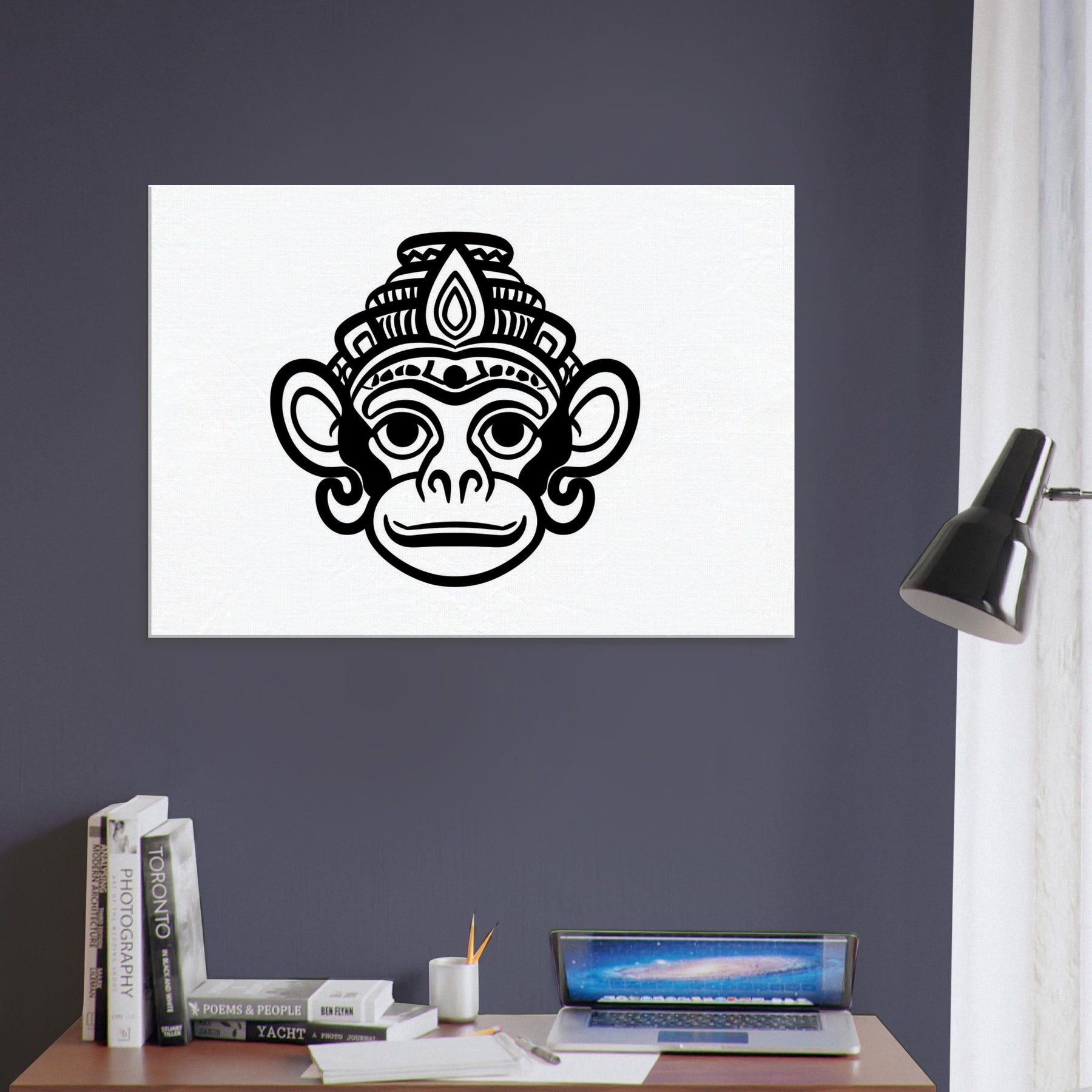 An exalted silhouette of Hanuman unfurls in luminous line work, inviting a quiet reverence into your living space. This mystical threads devotion with modern restraint, offering bold black contours that glow against pale walls. The artwork hums with grace and playful energy, making a room feel brighter, calmer, and more mindful, like a whispered mantra in motion. Hang it where morning light meets evening shadows, and let the presence of Hanuman inspire courage, focus, and compassionate strength daily.
