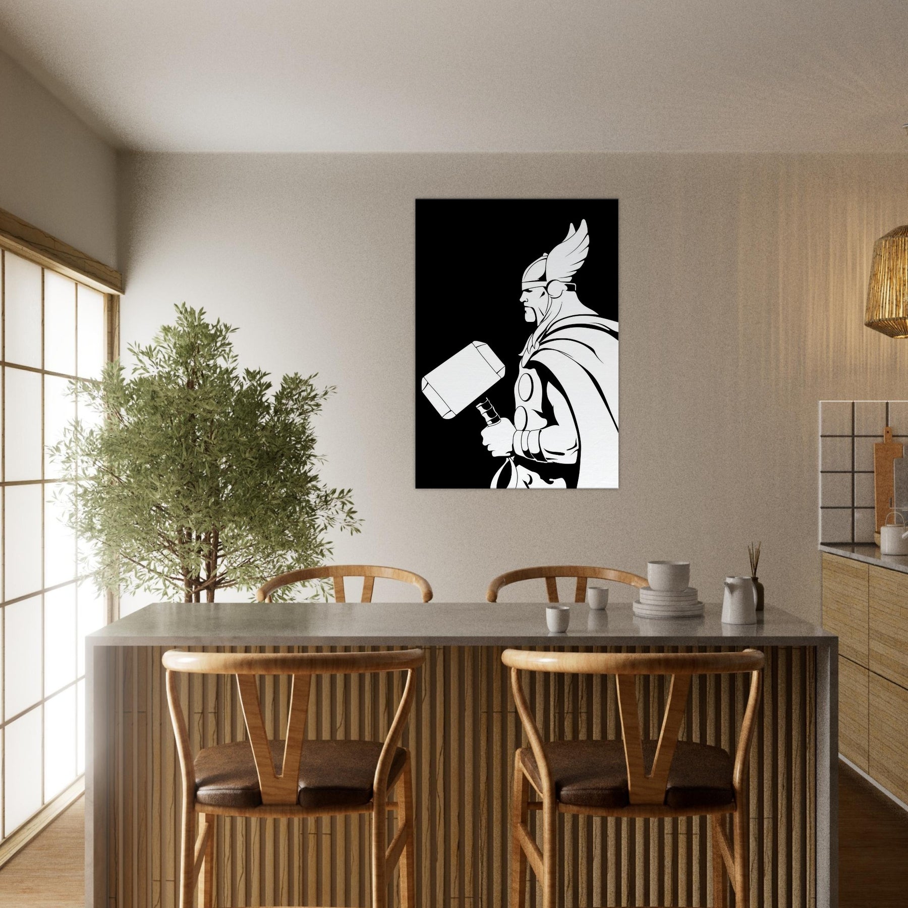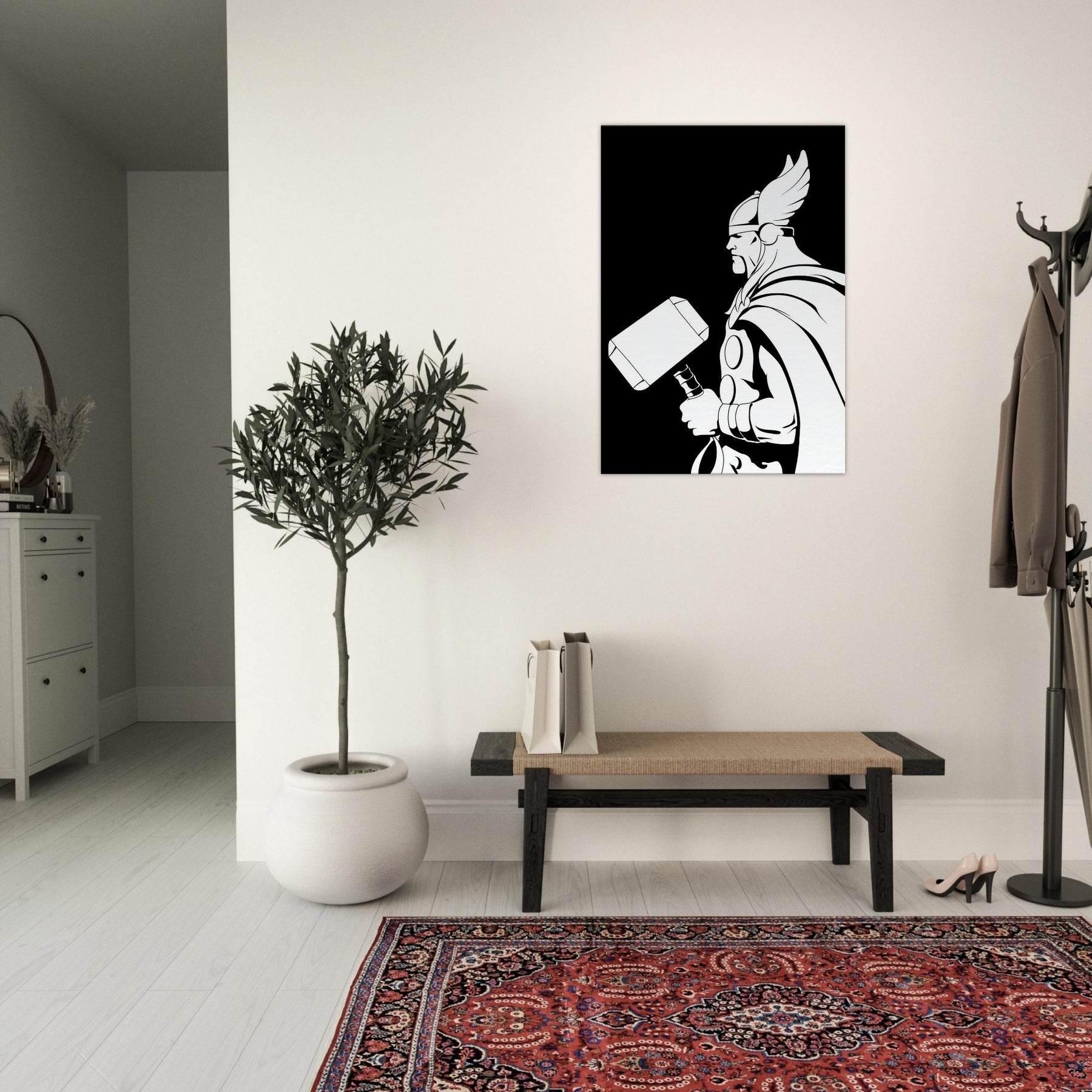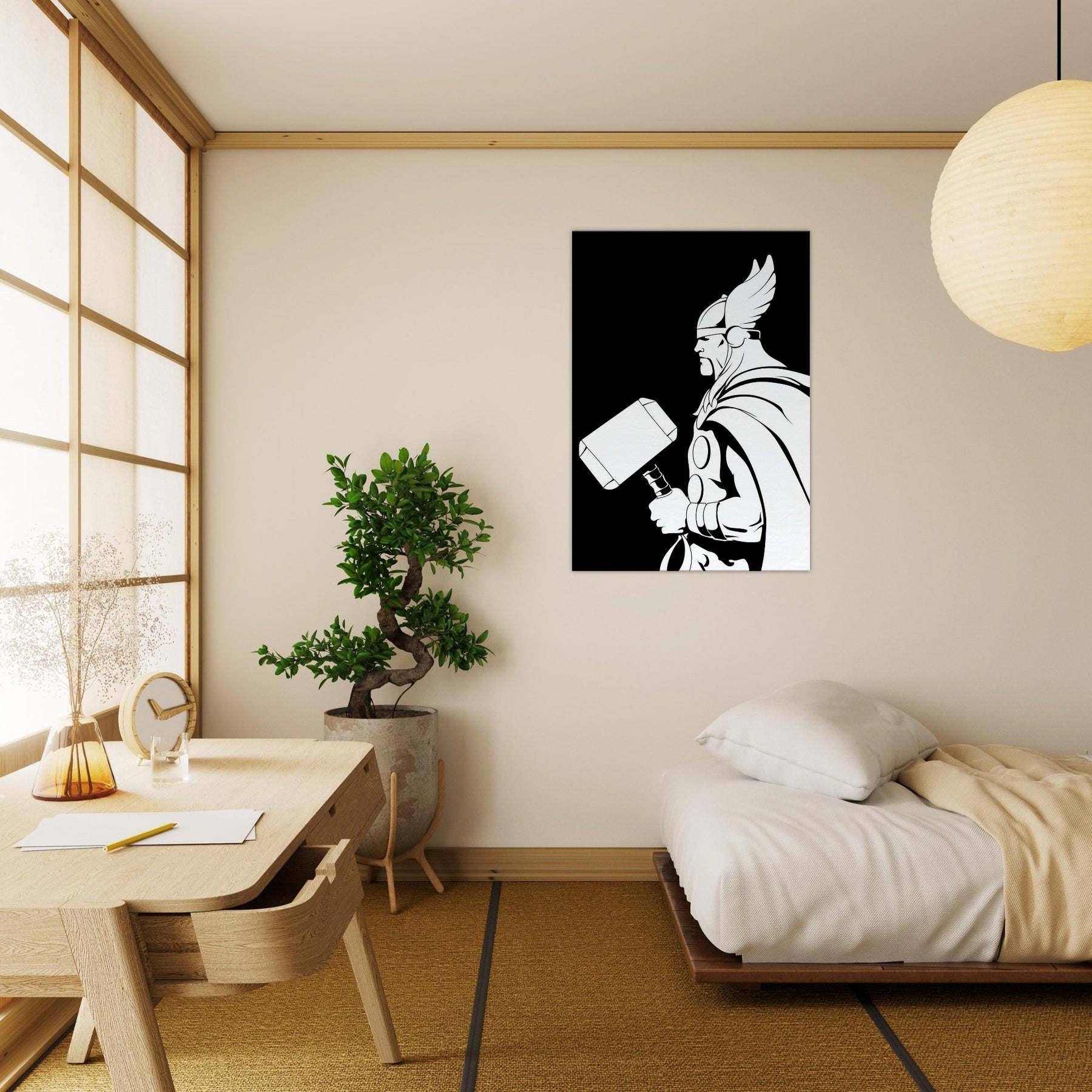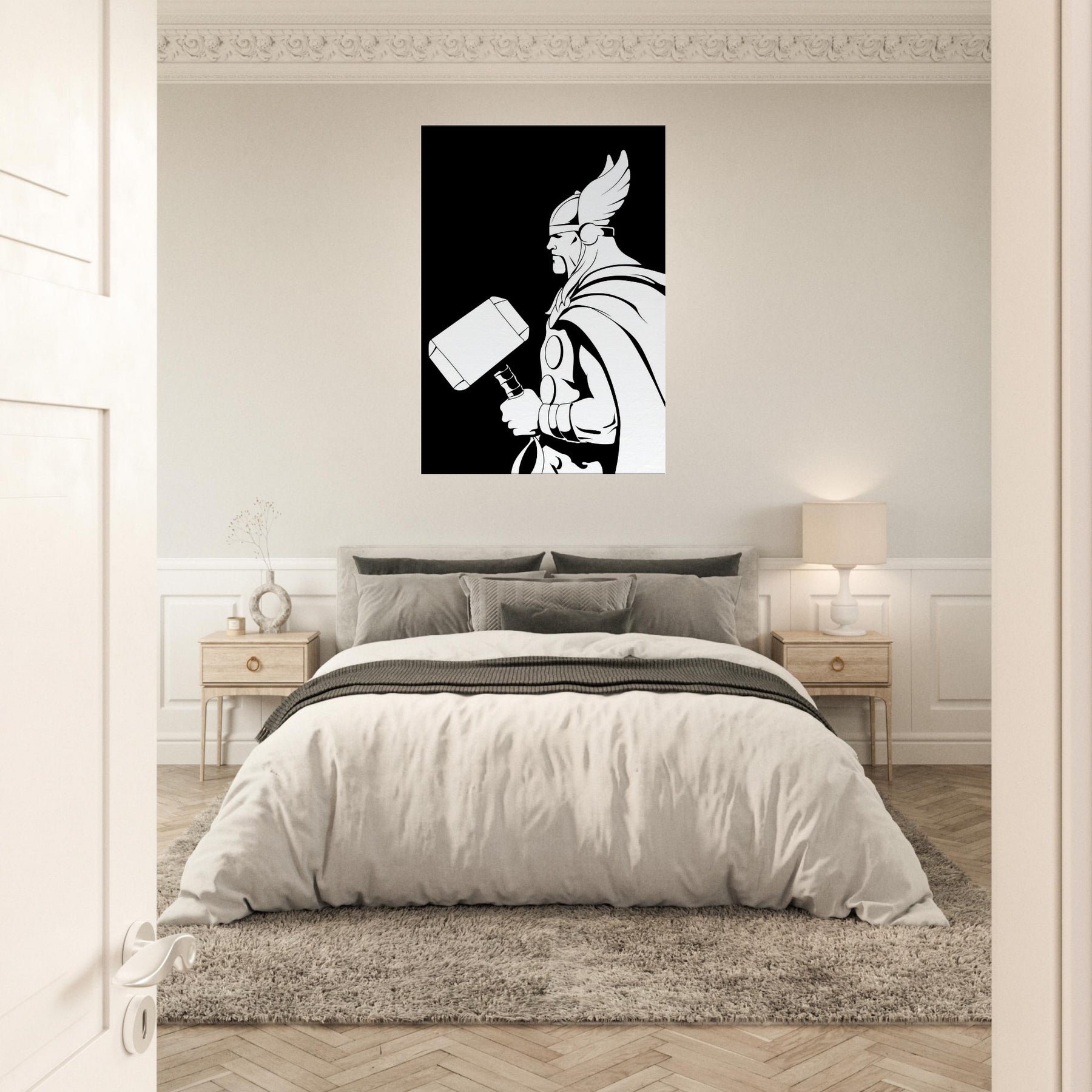 Thor, God of Thunder Wielding Mjölnir steps forward in pure line, a silhouette carved with rhythm and resolve. This striking black and white study bends light and shadow into a single, electric gesture, inviting a room to pause and feel a quiet storm. The clean, continuous strokes make the subject feel monumental yet intimate, ideal for a modern living space or study. Hang it where the eye rests it's heighten atmosphere, spark imagination, and turn everyday walls into a gallery of myth and power.