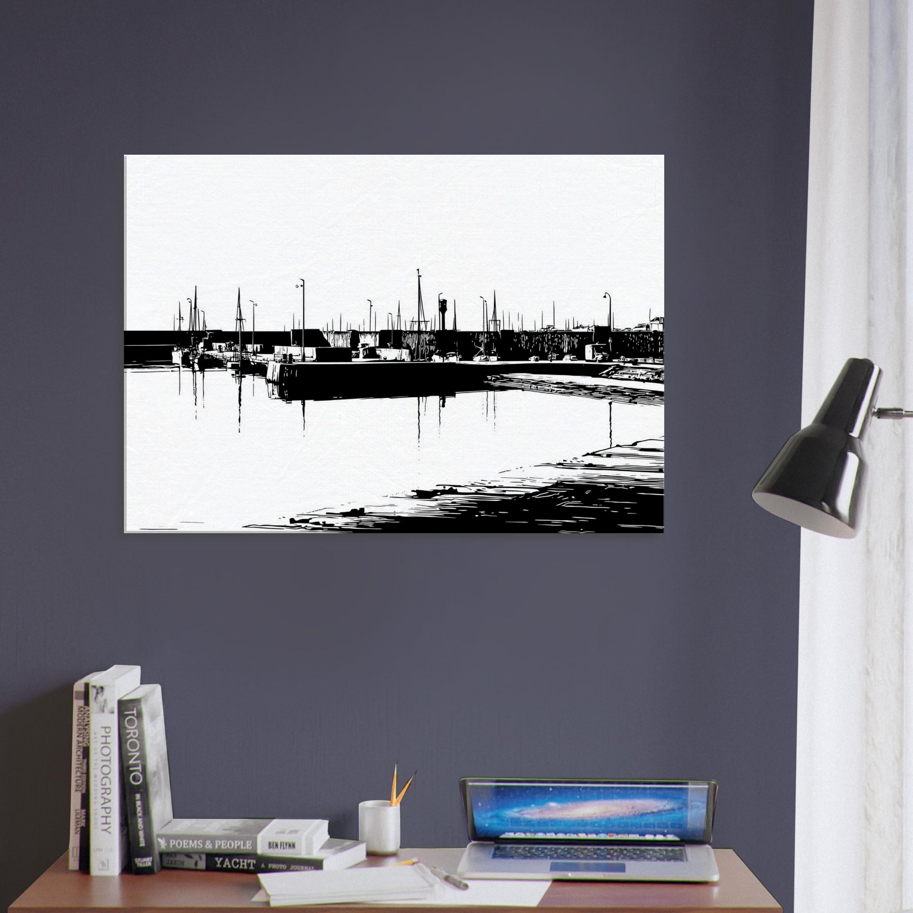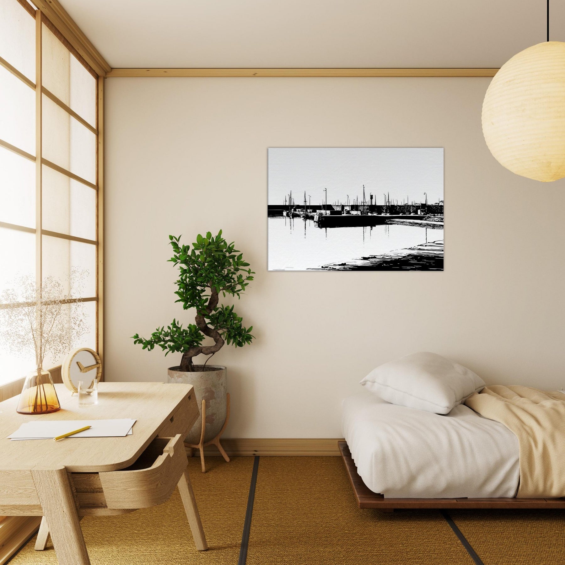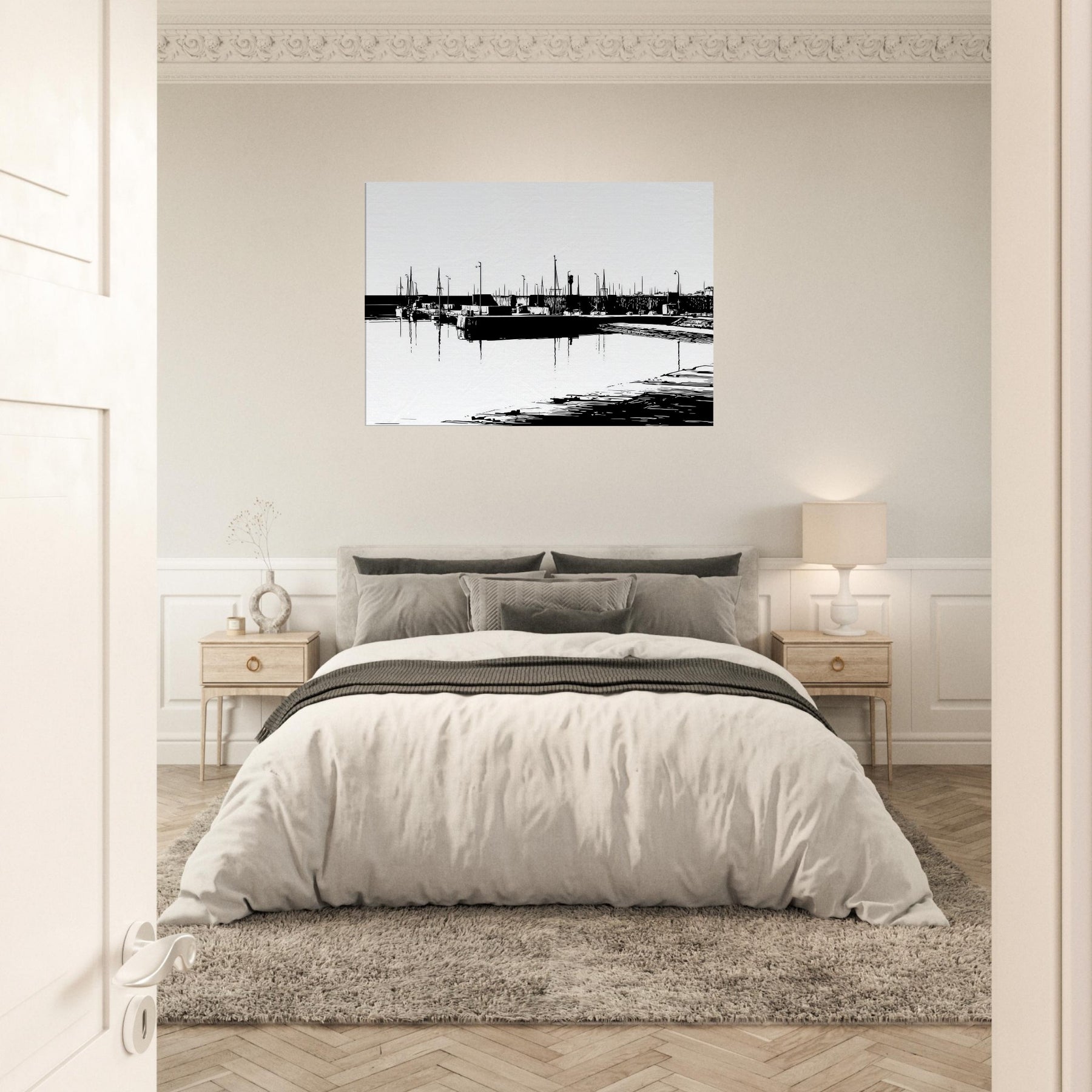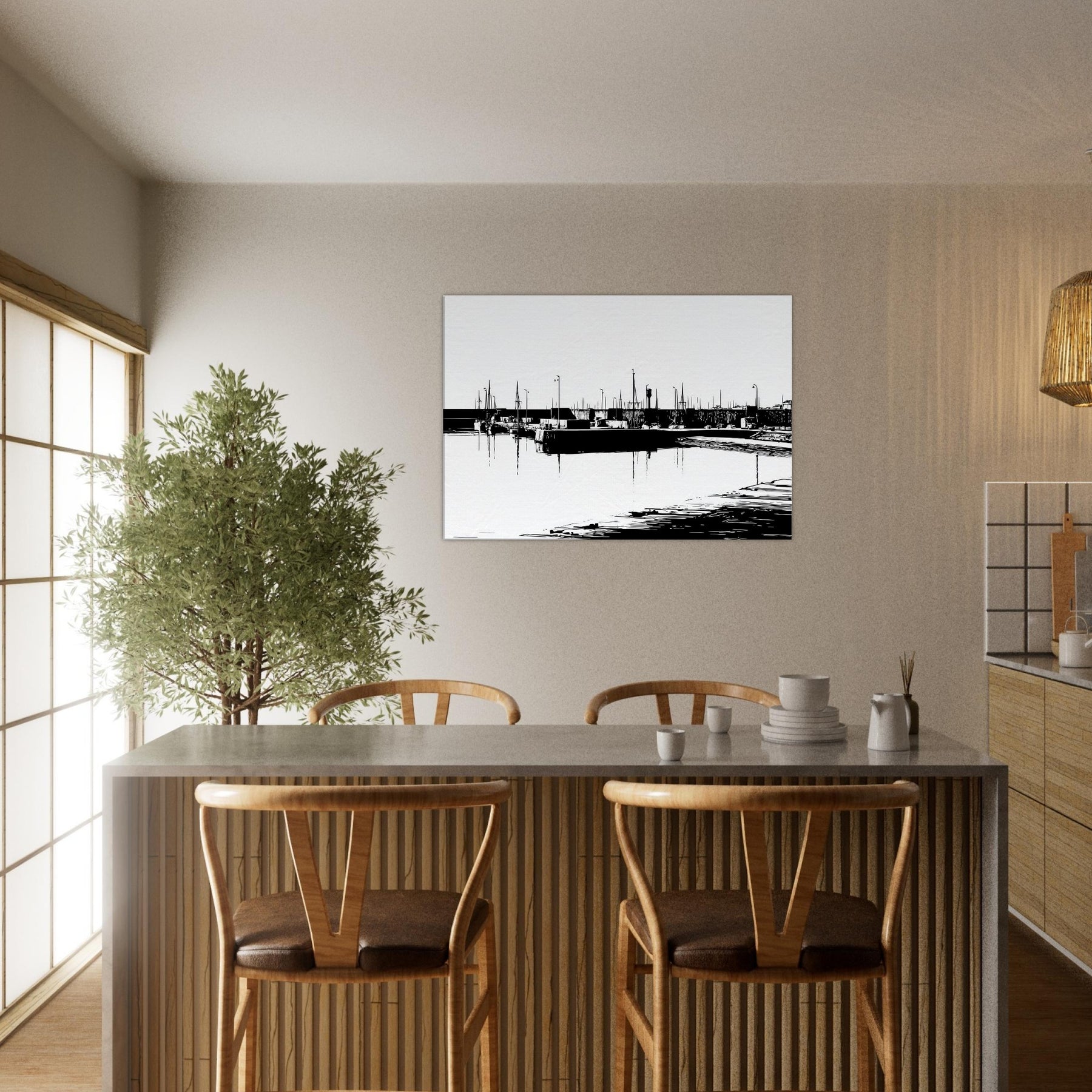 Line art renders the Harbor with clean, confident strokes, where the silhouettes of masts and piers form a quiet, musical rhythm. The stark black and white contrast evokes sea air, distant lights, and a calm horizon, rendering a mood of quiet, collected energy. Framed in a living room, hallway, or study, this piece introduces space, balance, and a serene focal point that grows more intimate in candlelight. It invites slow, thoughtful gazing and elevates everyday spaces with refined urban poetry.