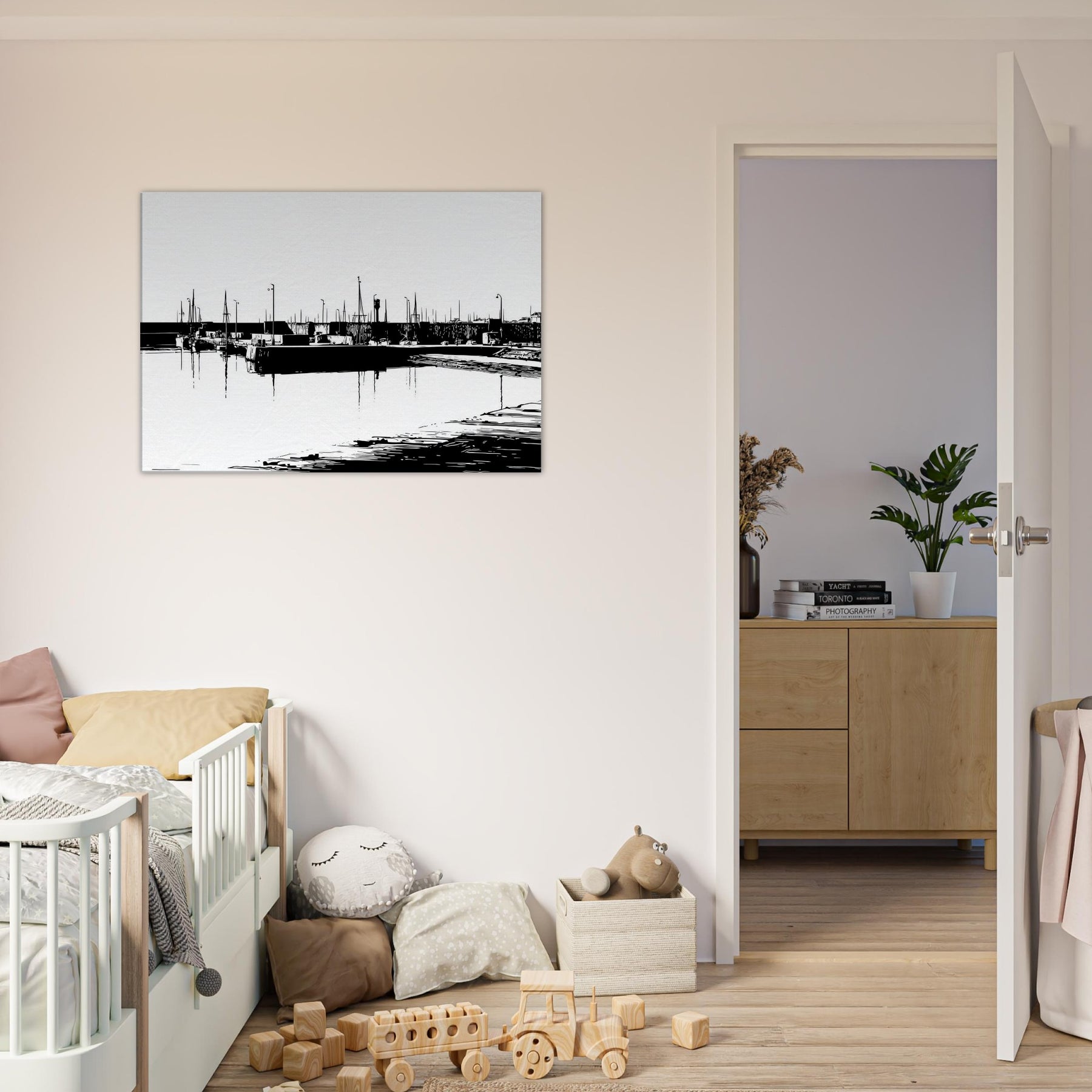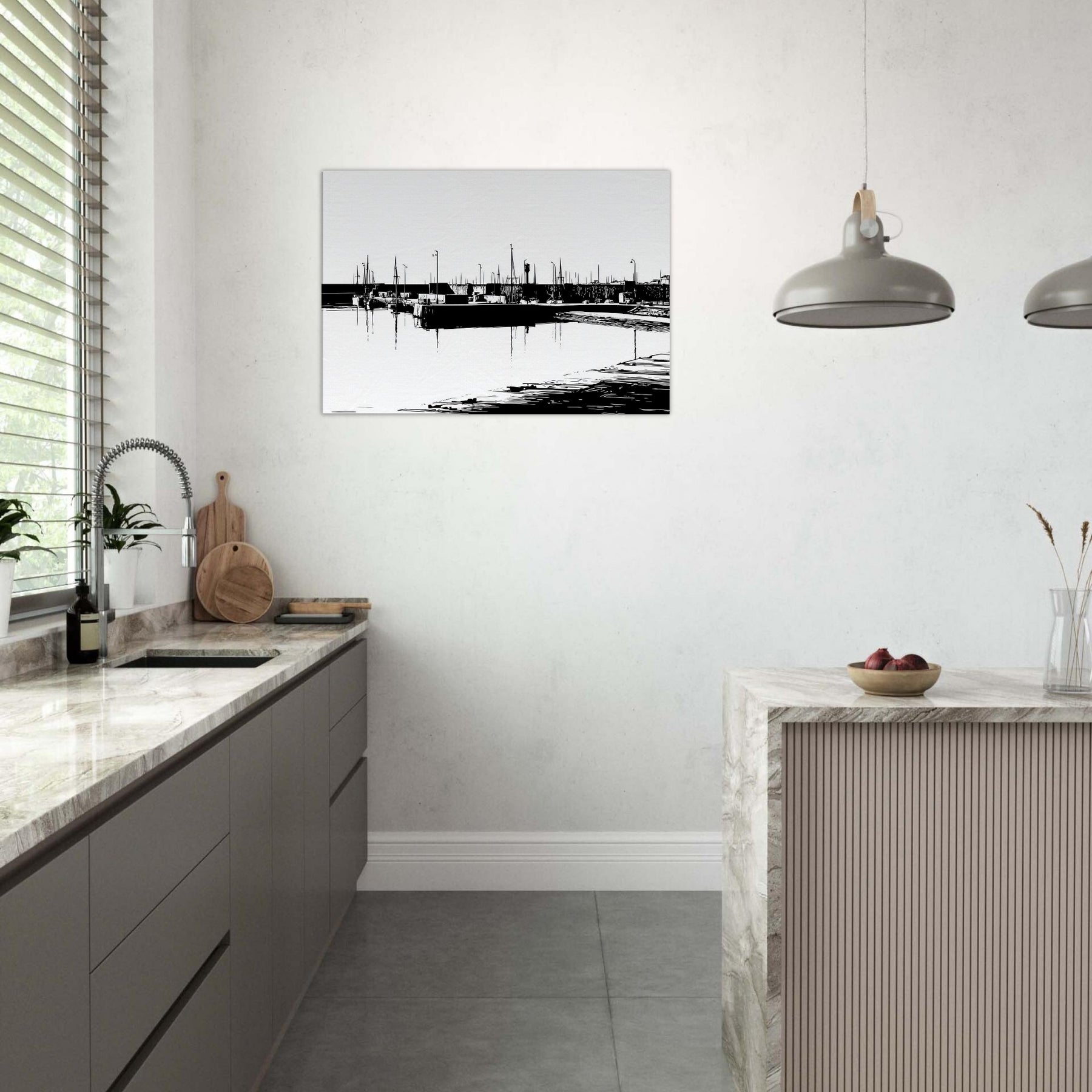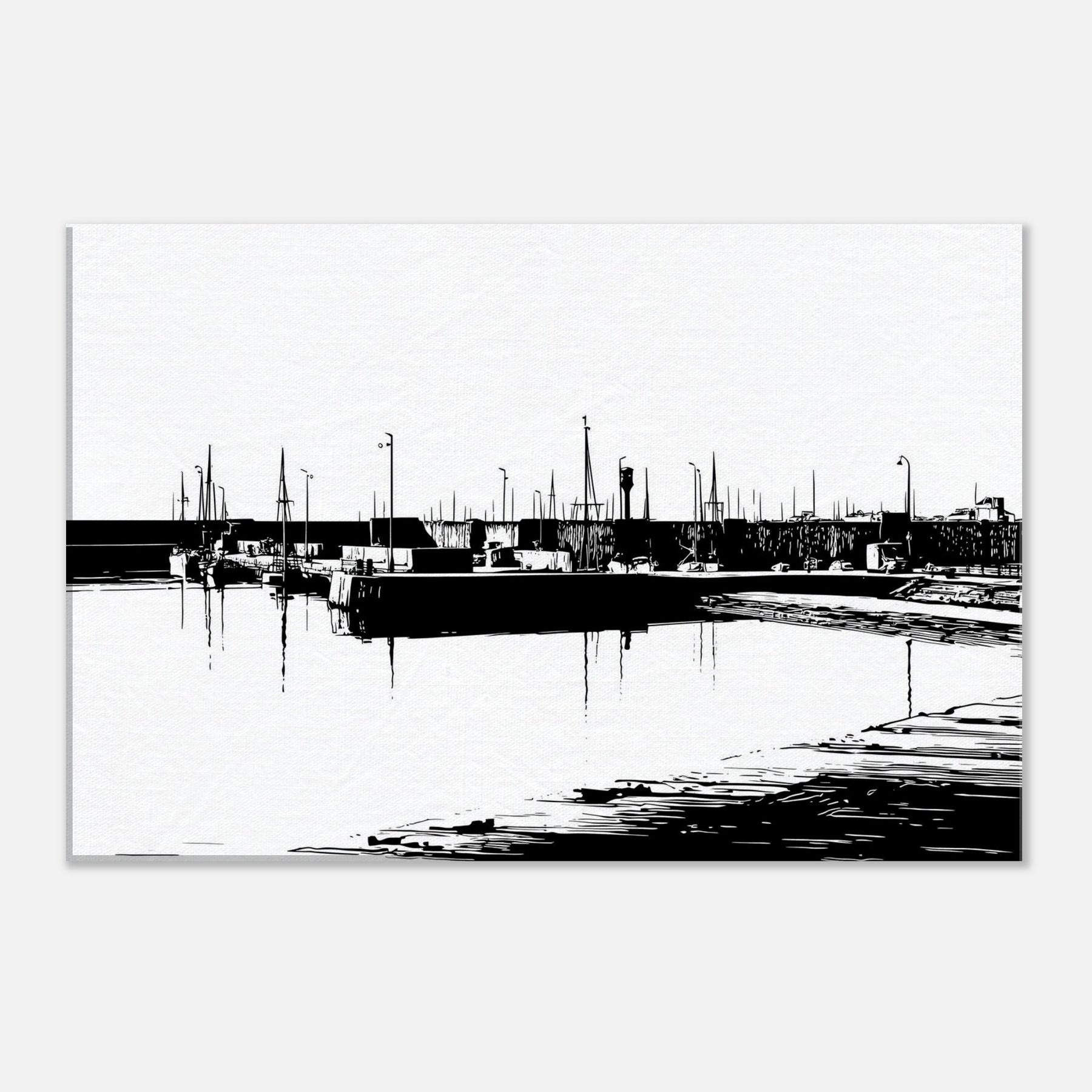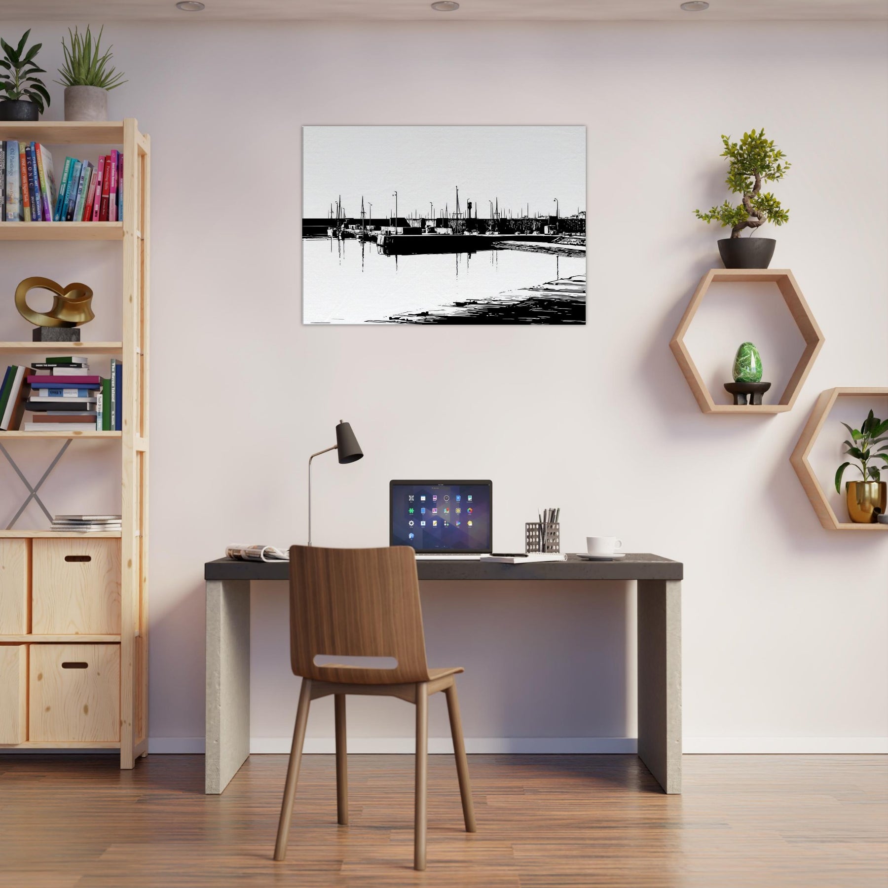 Line art renders the Harbor with clean, confident strokes, where the silhouettes of masts and piers form a quiet, musical rhythm. The stark black and white contrast evokes sea air, distant lights, and a calm horizon, rendering a mood of quiet, collected energy. Framed in a living room, hallway, or study, this piece introduces space, balance, and a serene focal point that grows more intimate in candlelight. It invites slow, thoughtful gazing and elevates everyday spaces with refined urban poetry.