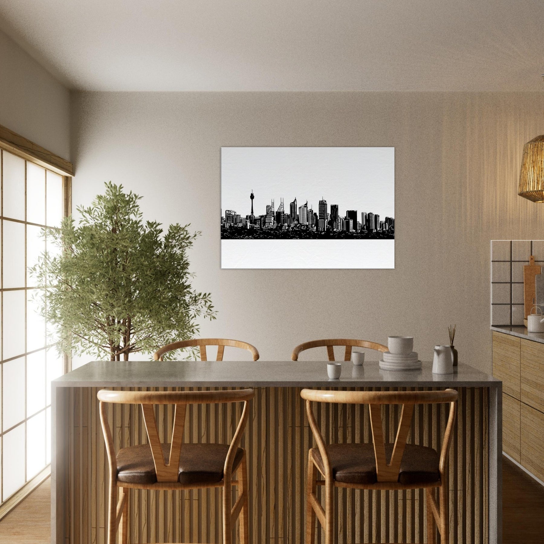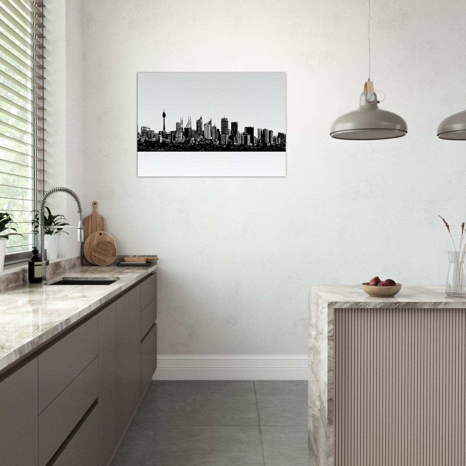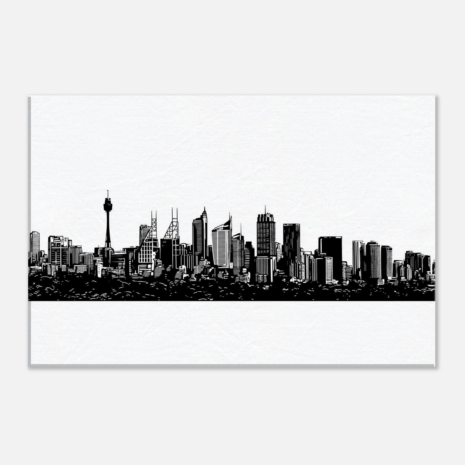 A study in quiet drama, this ink black skyline frames the horizon with delicate, confident lines. Sydney rises in a whisper of architecture the spire and towers etched with precision, the harbor tucking beneath like a secret. Hang it to slow the pace of a room, letting light bounce along the white space and guiding the eye to every silhouette. A modern keepsake for living rooms, bedrooms, or studios that crave urban poetry and a sense of place.