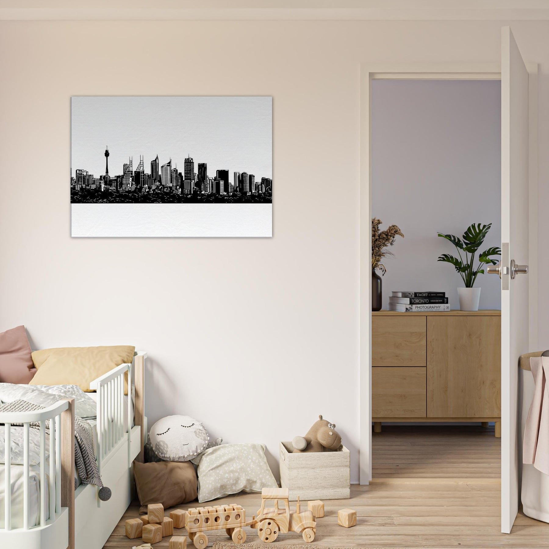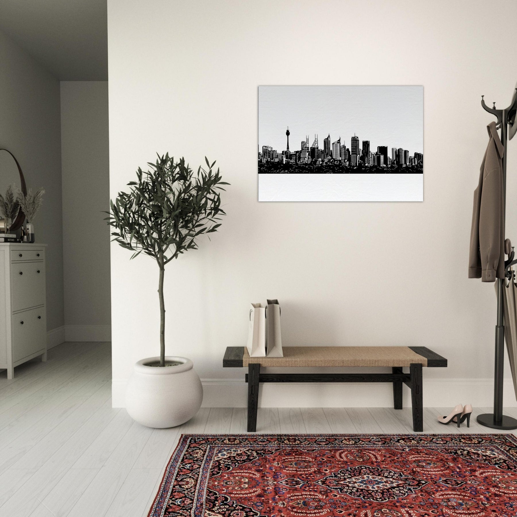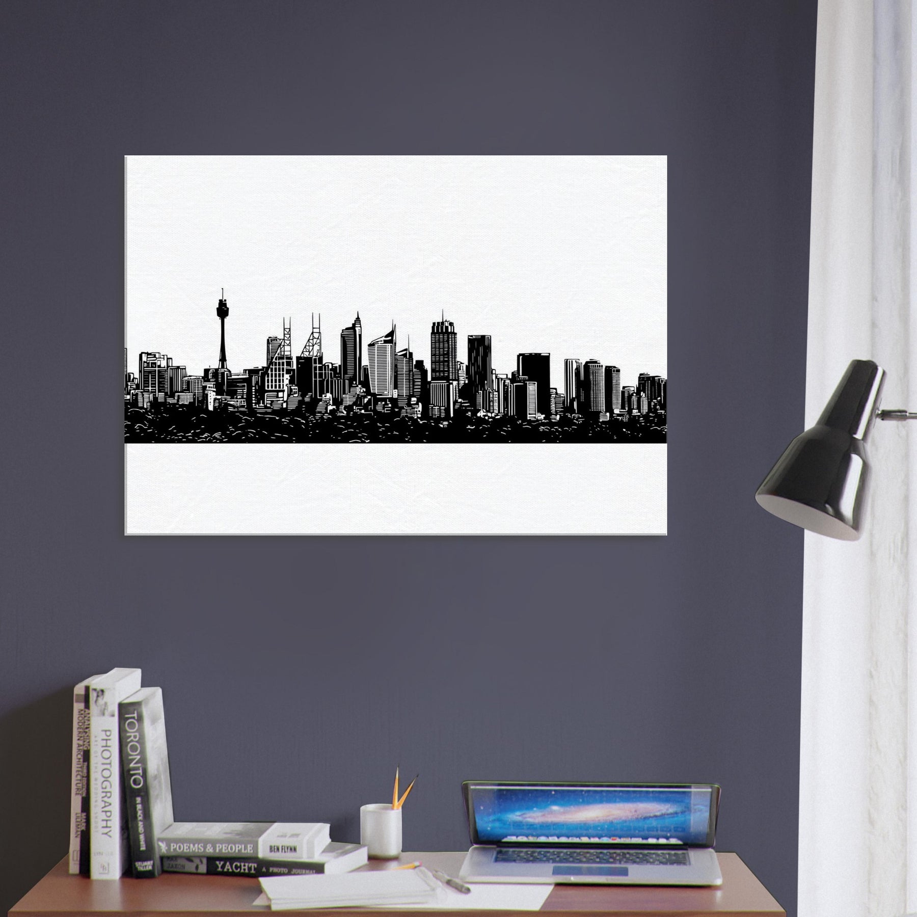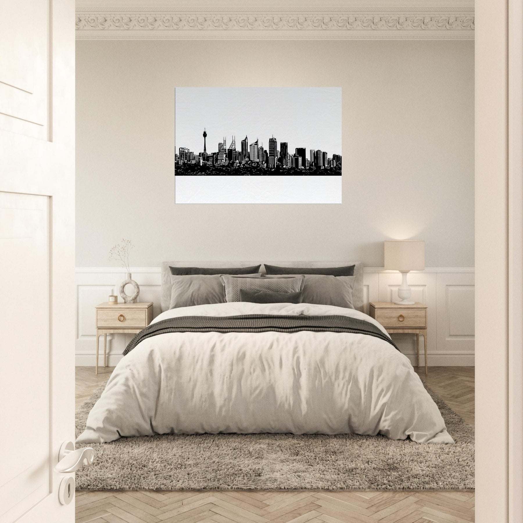A study in quiet drama, this ink black skyline frames the horizon with delicate, confident lines. Sydney rises in a whisper of architecture the spire and towers etched with precision, the harbor tucking beneath like a secret. Hang it to slow the pace of a room, letting light bounce along the white space and guiding the eye to every silhouette. A modern keepsake for living rooms, bedrooms, or studios that crave urban poetry and a sense of place.