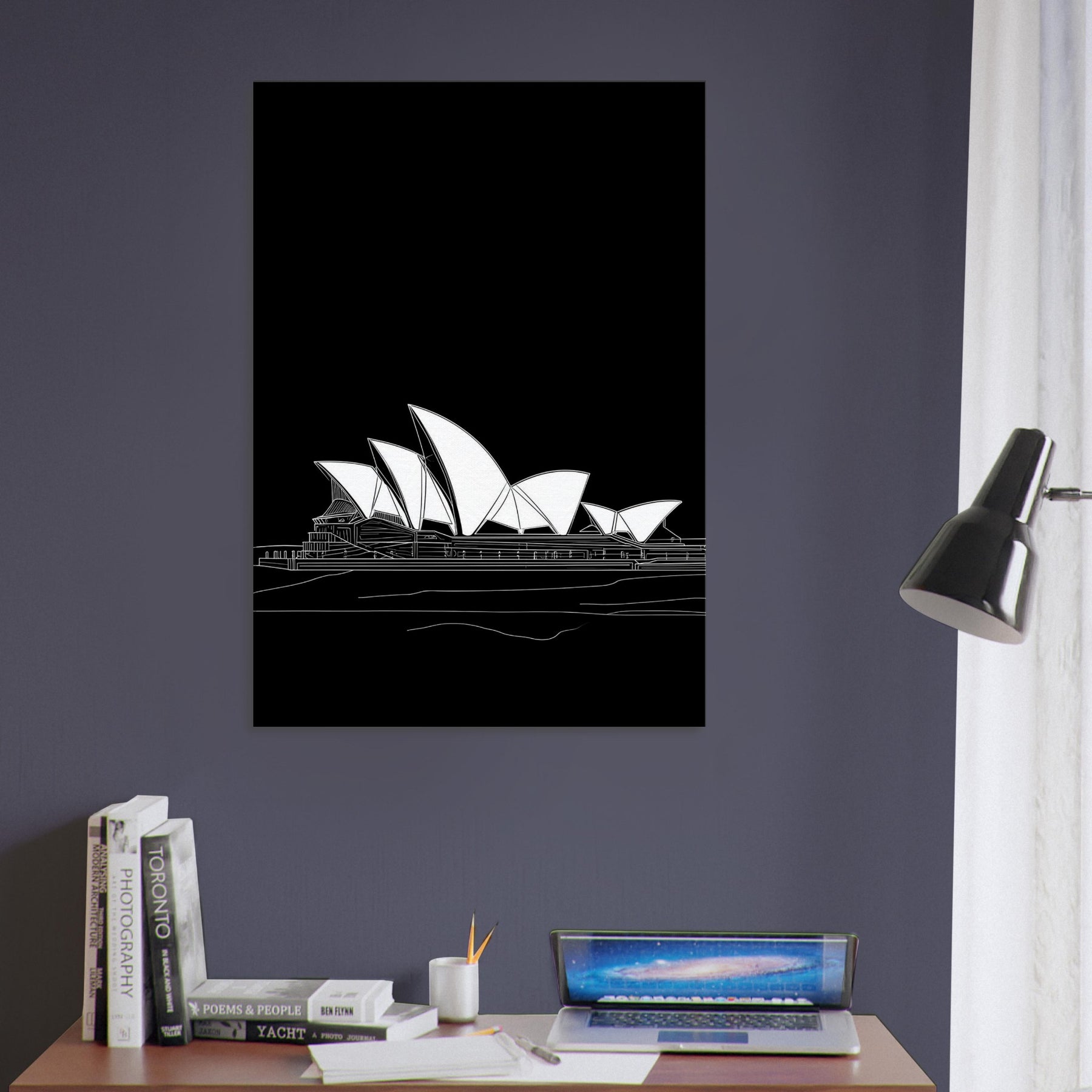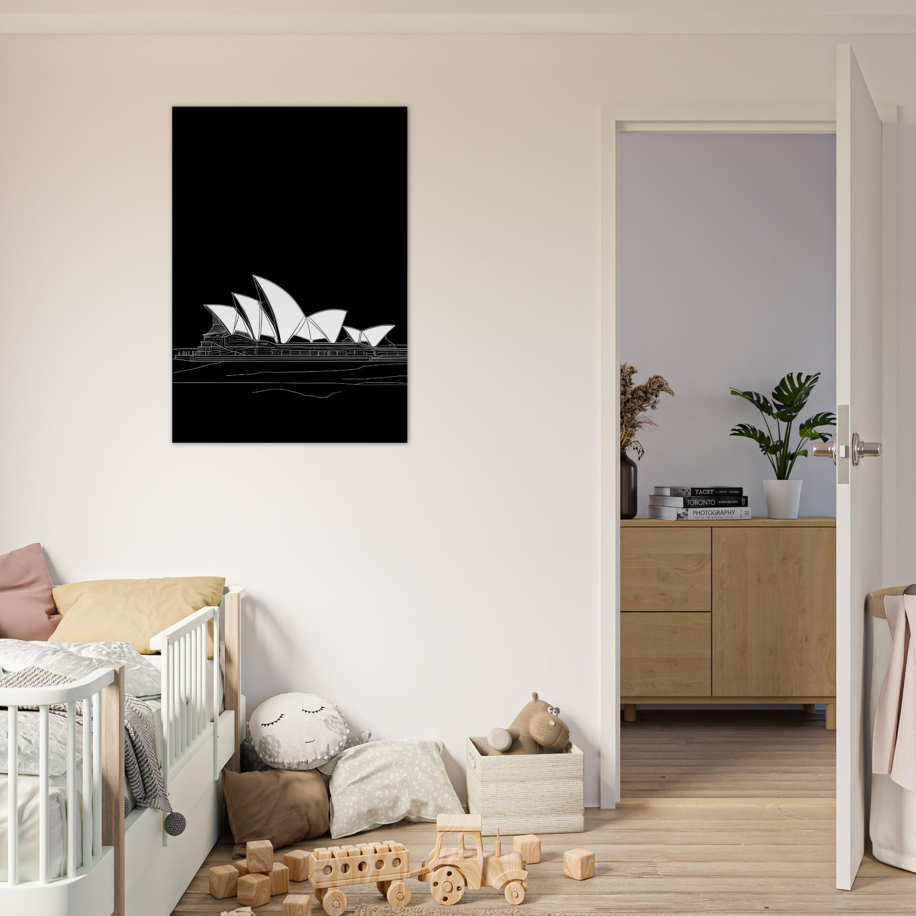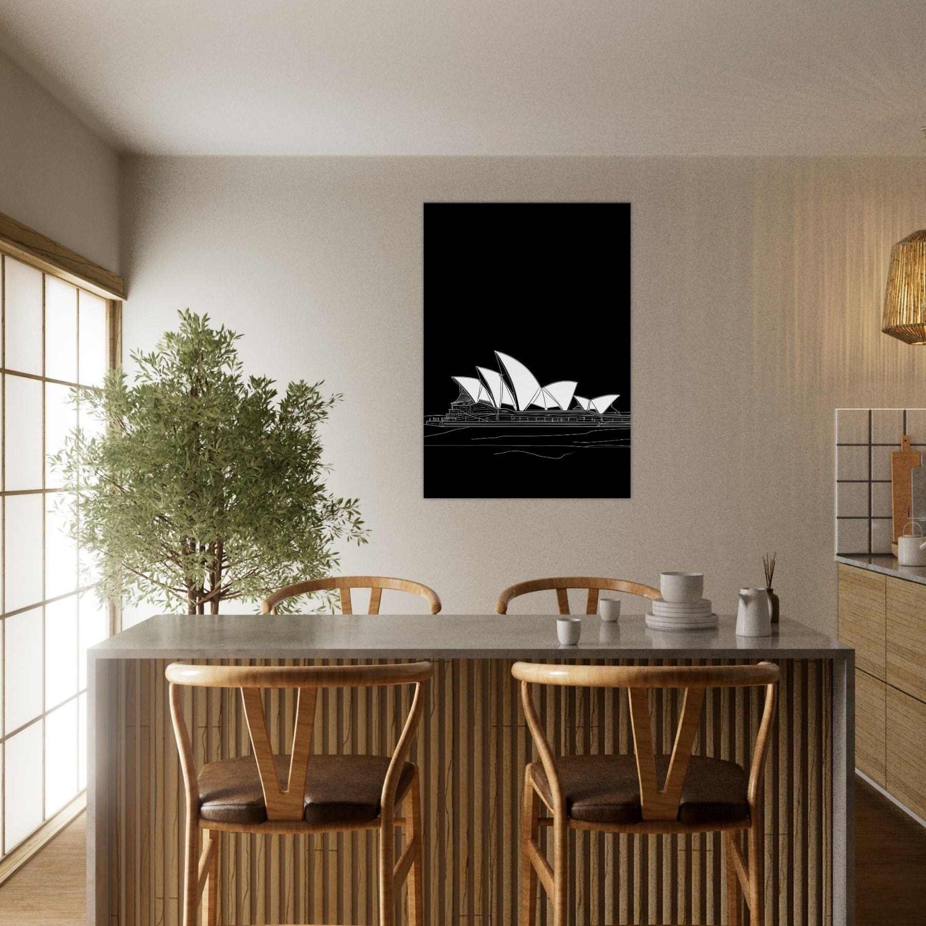 Let your space breathe with an elegant rendering of the Sydney Opera House in clean white lines against a velvet black backdrop. This line art study captures the opera house's sculptural sails, inviting the eye to travel along the harbor's quiet horizon. The atmosphere is calm, cinematic, and modern perfect for a contemporary living room or study. It adds architectural poetry, a subtle drama, and a welcoming glow when framed above a sofa or console.