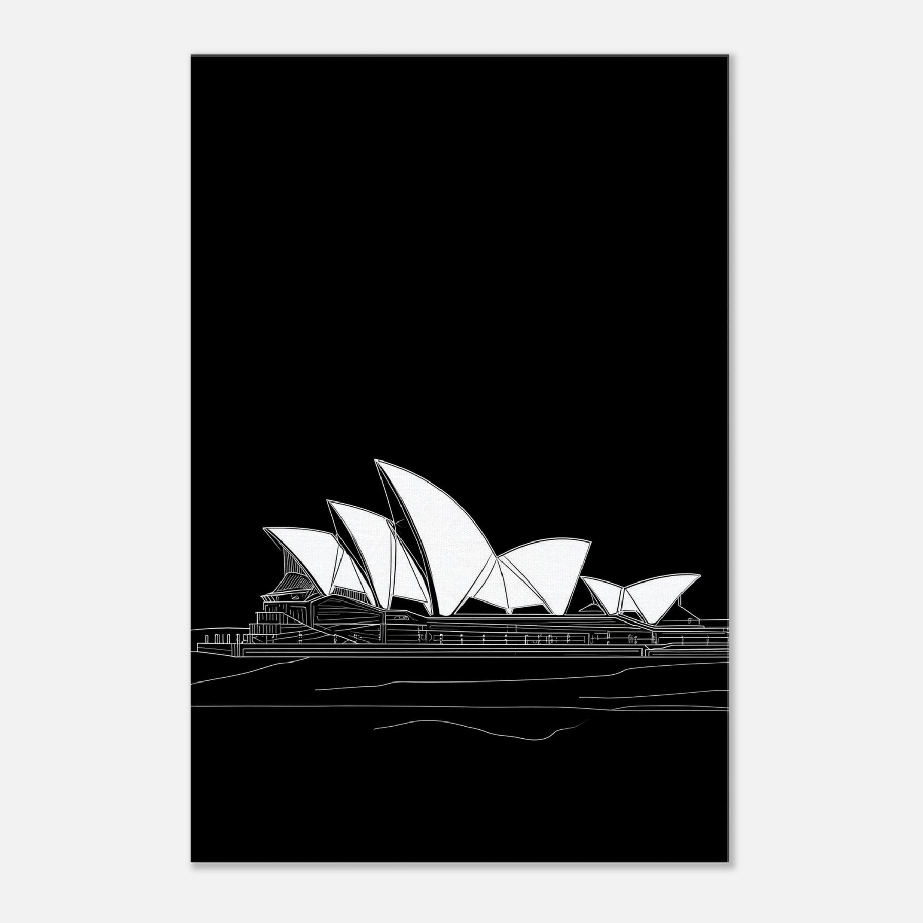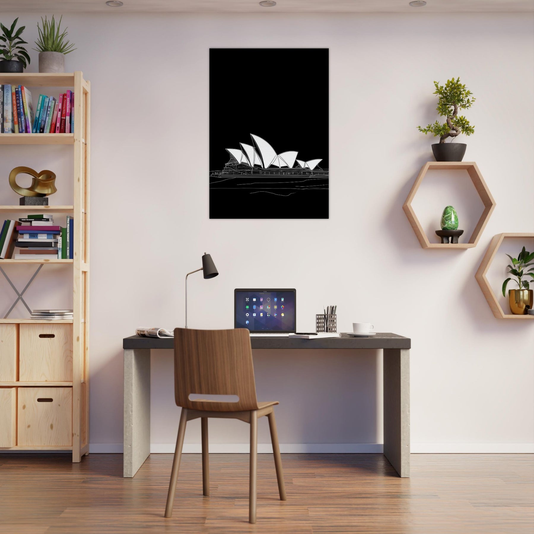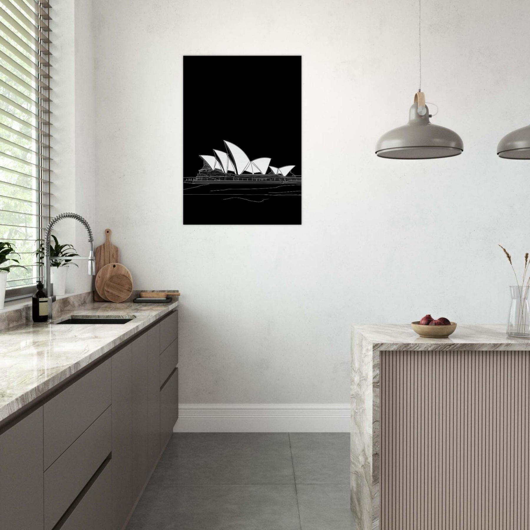 Let your space breathe with an elegant rendering of the Sydney Opera House in clean white lines against a velvet black backdrop. This line art study captures the opera house's sculptural sails, inviting the eye to travel along the harbor's quiet horizon. The atmosphere is calm, cinematic, and modern perfect for a contemporary living room or study. It adds architectural poetry, a subtle drama, and a welcoming glow when framed above a sofa or console.