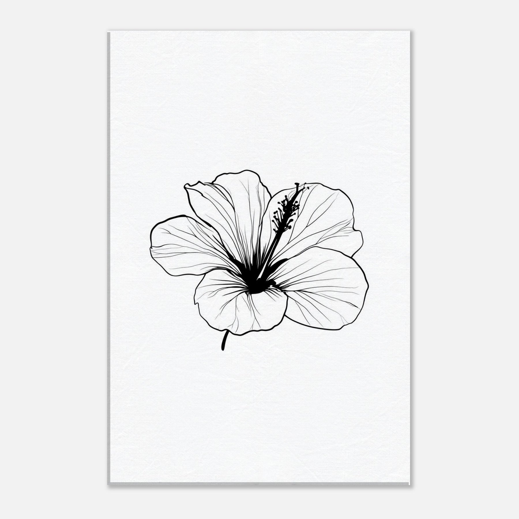 Within a field of white, a single hibiscus unfurls in crisp, black line art. The elegant contour captures delicate veins and a quiet bloom, offering a serene focal point that invites reflection. This graphic hibiscus fosters a sense of airiness and calm, pairing with warm woods or cool neutrals. In a living room or meditation nook, the minimalist line work casts gentle shadows, turning everyday moments into a small ceremony of nature and craft.