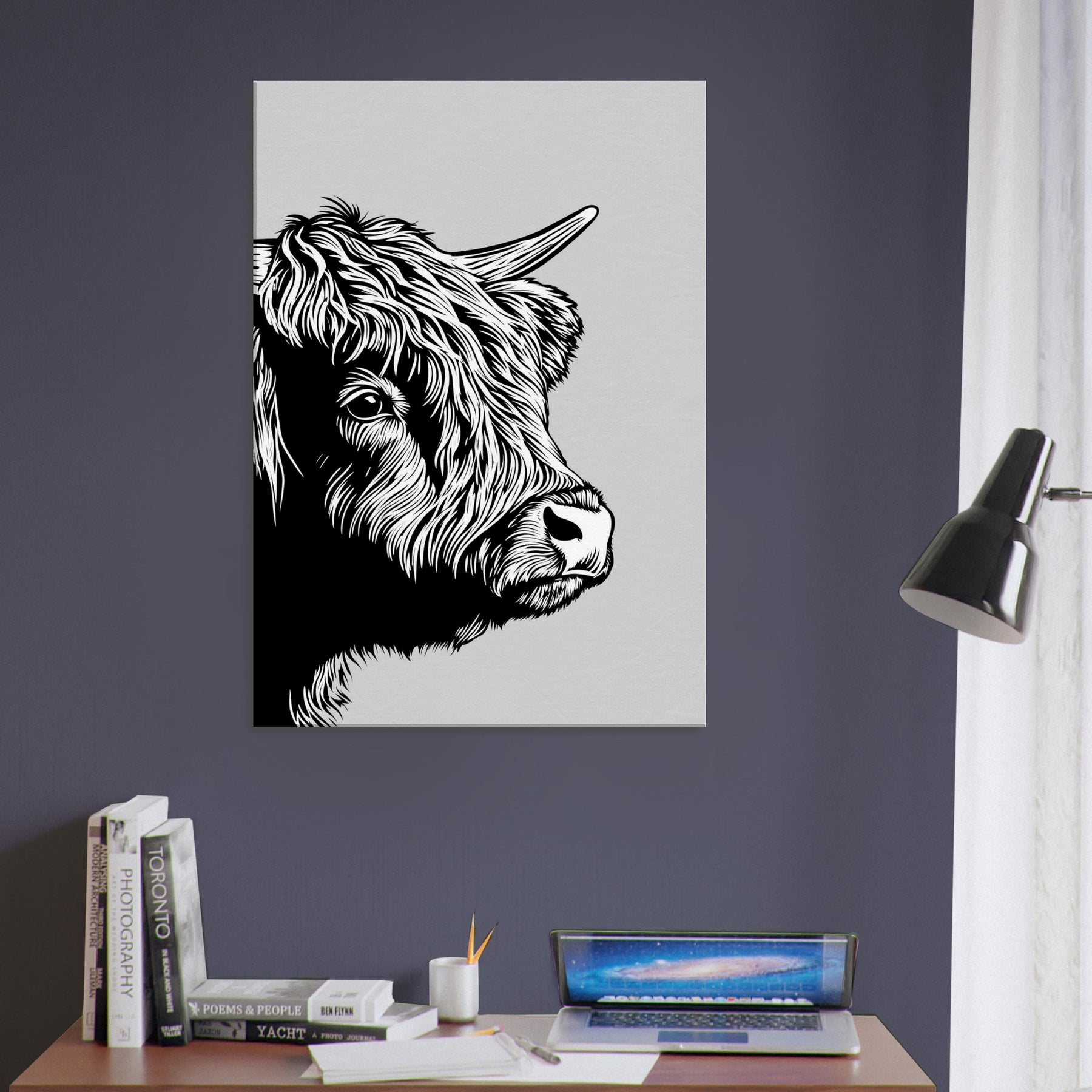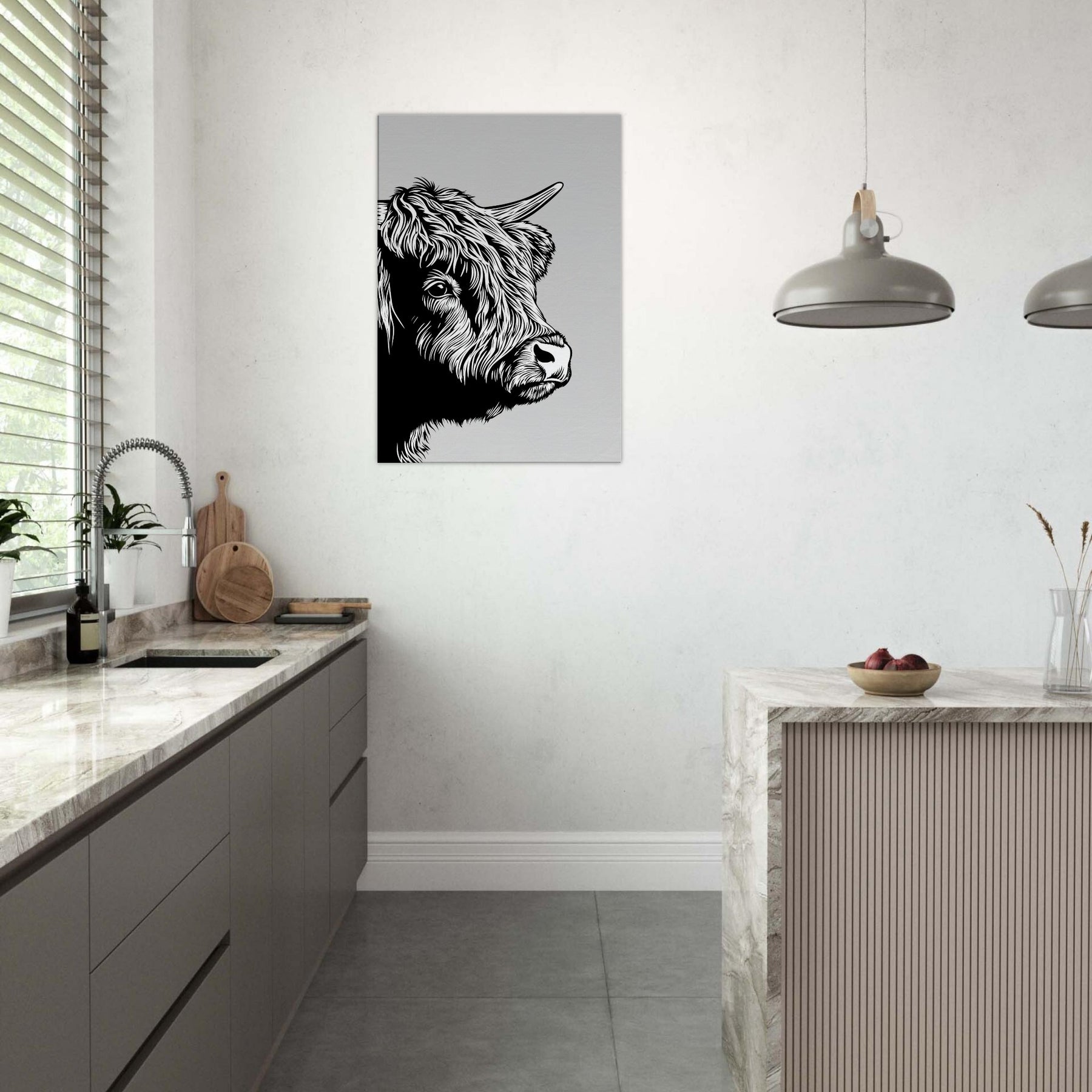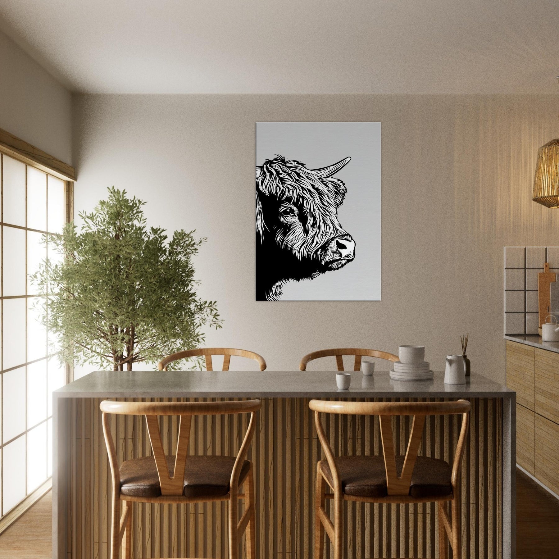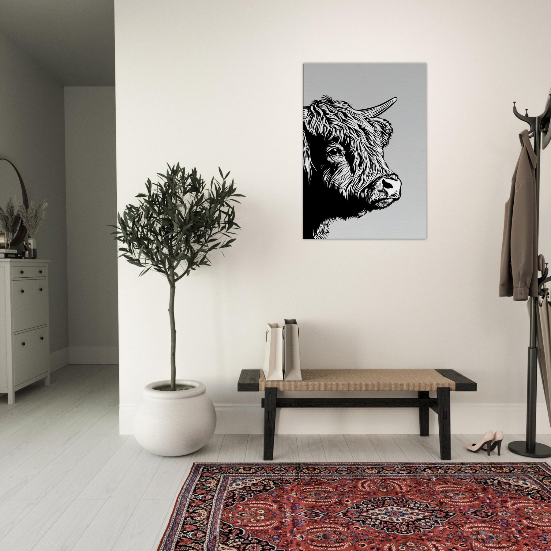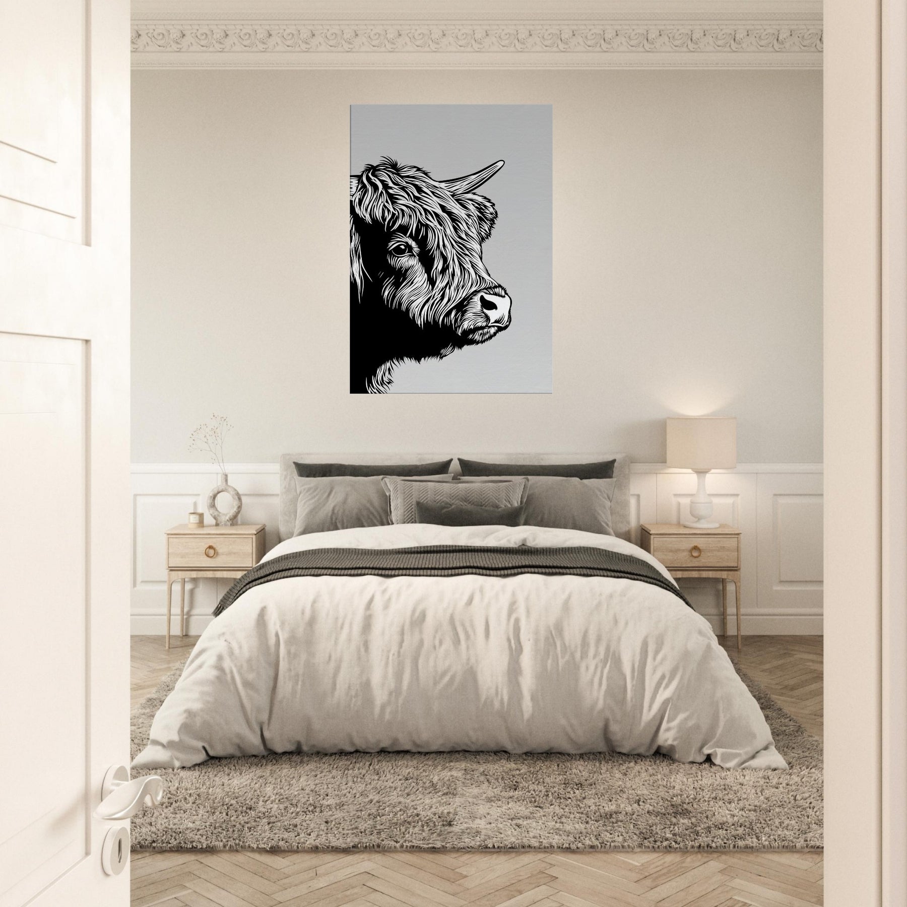 Step close to a quiet hillside with this Highland Cow line drawing, where bold black ink sculpts soft fur into delicate, roaming lines. The restrained palette and confident contour invite contemplation, turning a wall into a window of calm. Perfect for a living room or bedroom, it pairs rustic warmth with modern clarity, adding texture without clutter. The subject's gentle presence anchors the space, inviting slow breaths and easy conversation, an elegant reminder of nature's simple grace.
