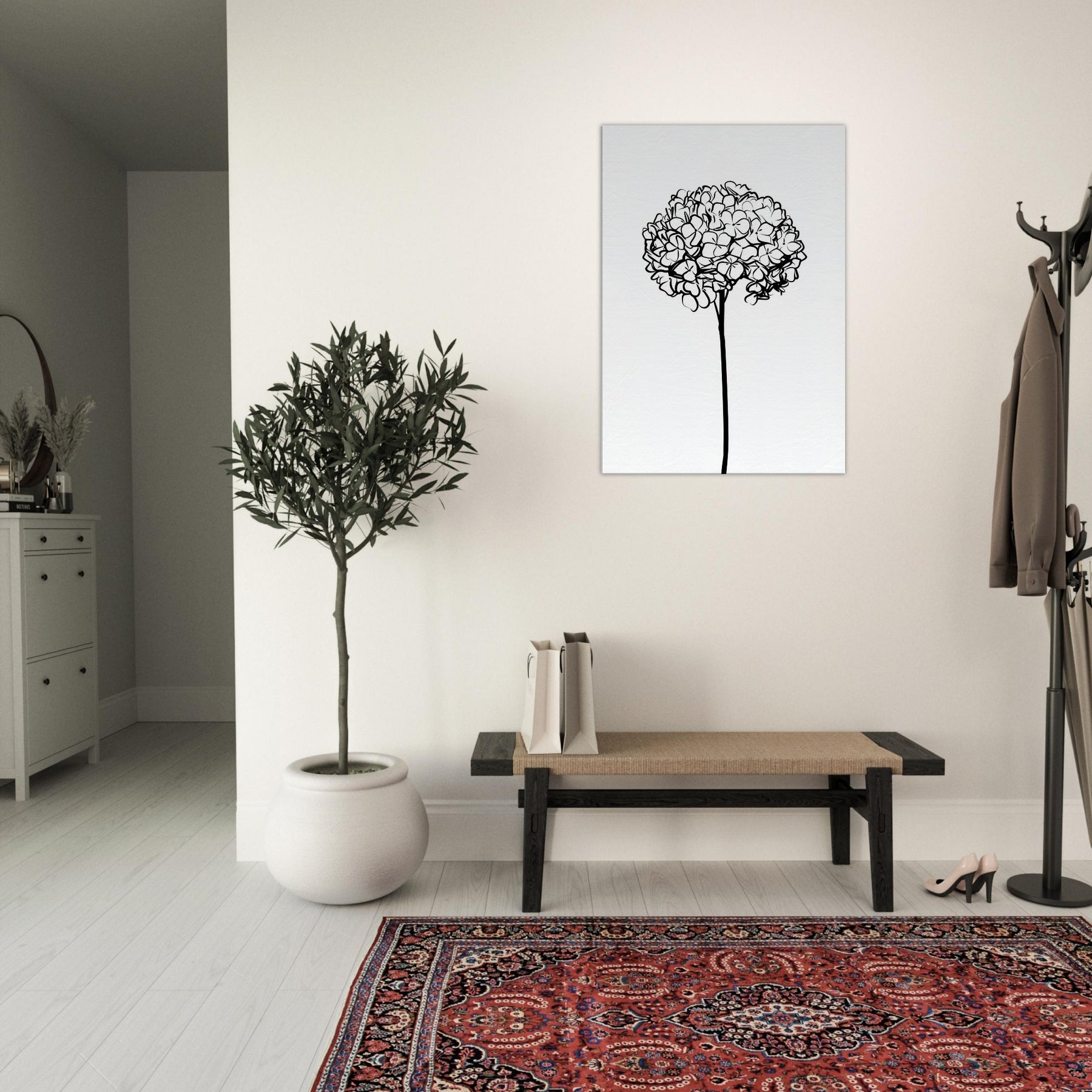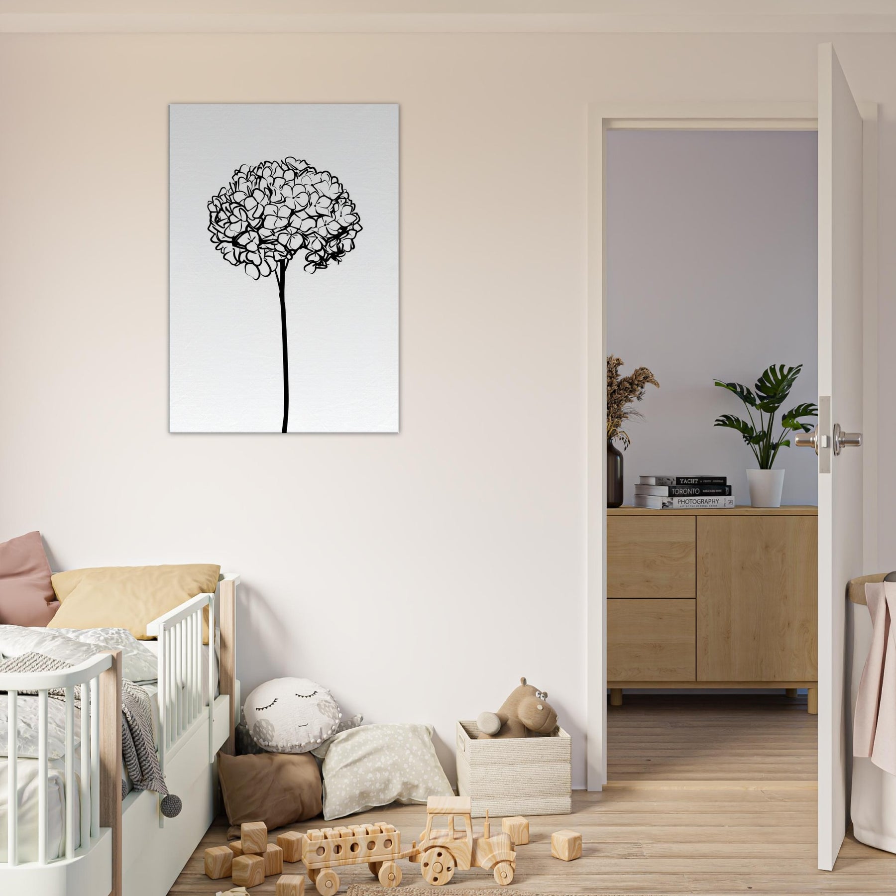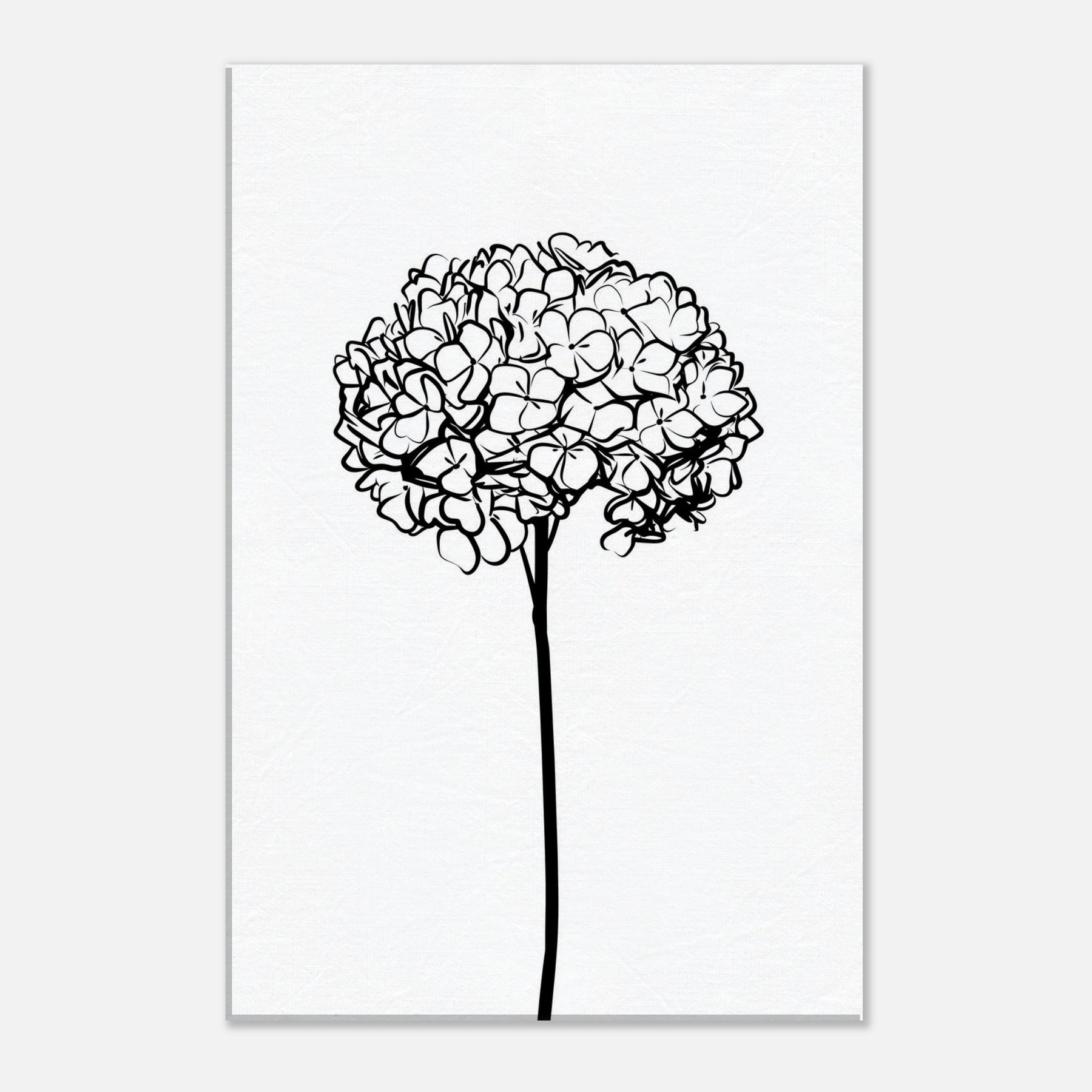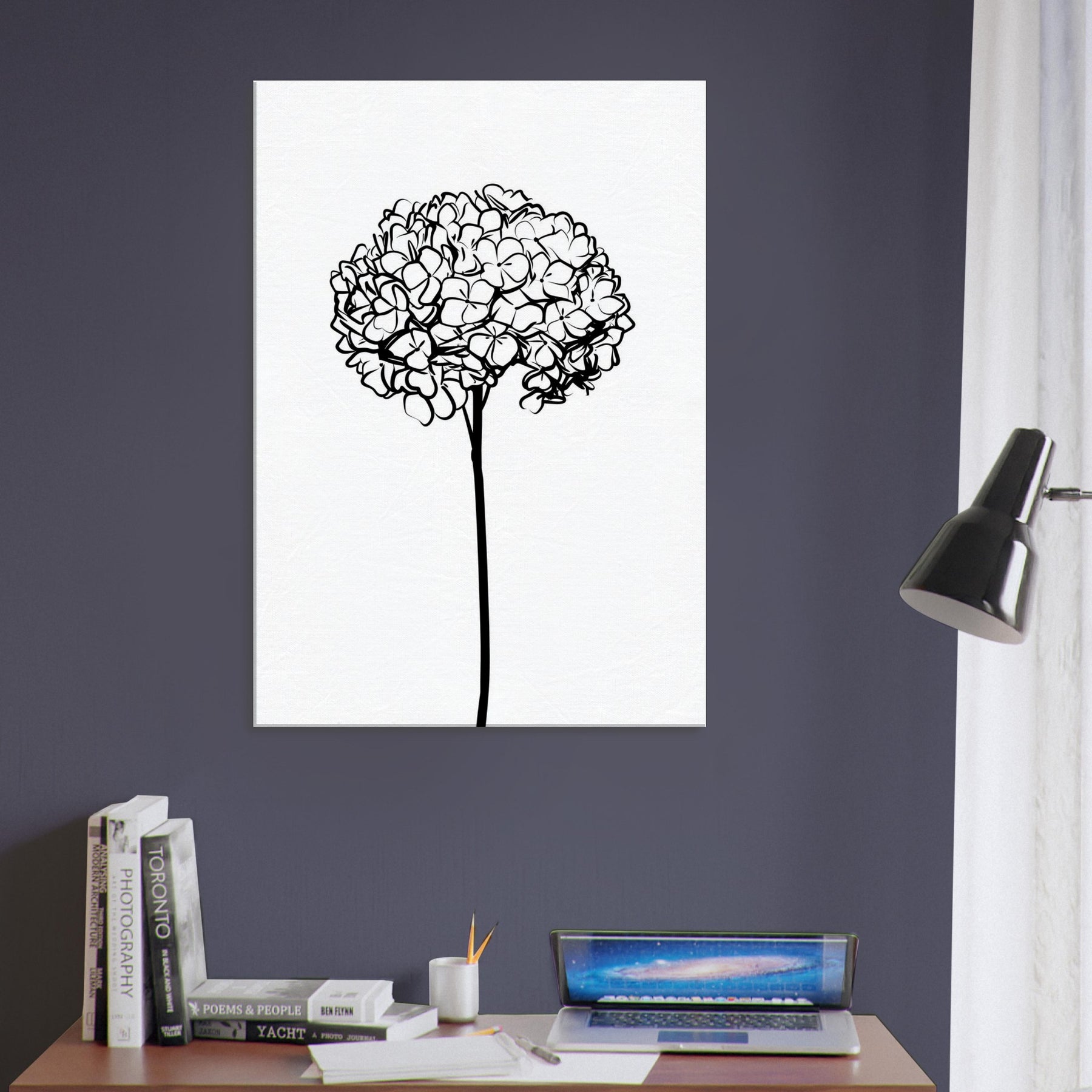 Hydrangea Bloom in line art captures the quiet drama of a single bloom lifted by a slender stem. The clean black contours trace each petal with a luminescent simplicity, letting light and space mingle around it. This botanical study brings a moment of garden serenity into your living space, pairing well with neutral palettes or bold accents. It invites slow, contemplative moments, turning a wall into a breathing centerpiece. Ideal for lounge, bedroom, or hallway, it elevates atmosphere without shouting, adding lasting grace to any decor.