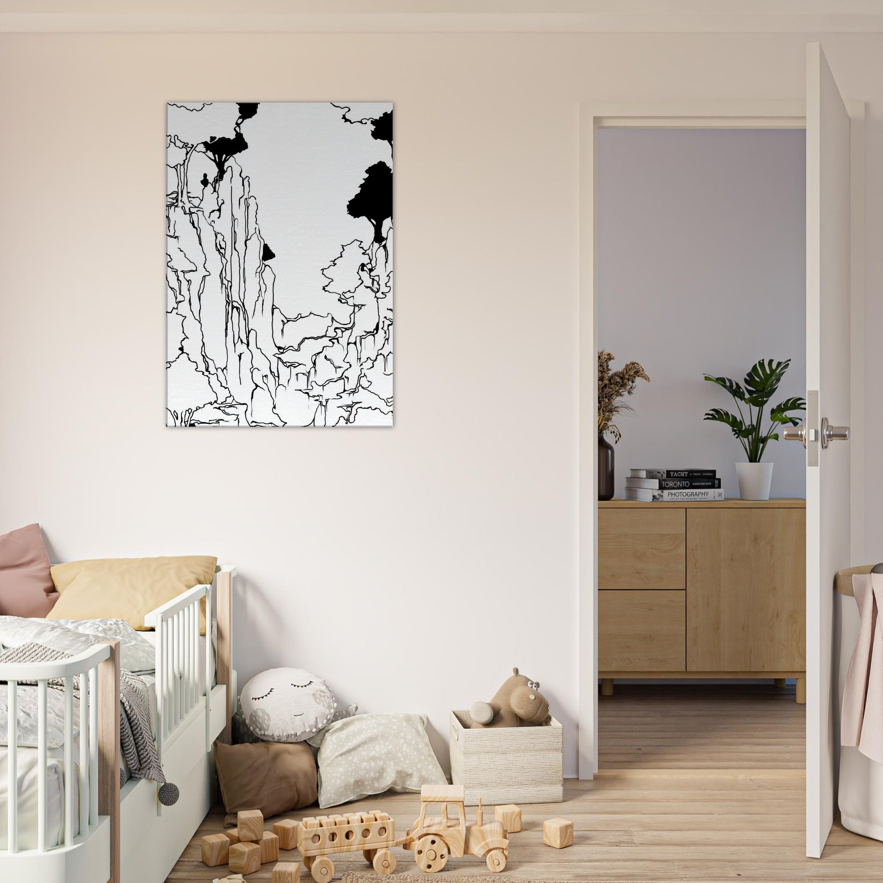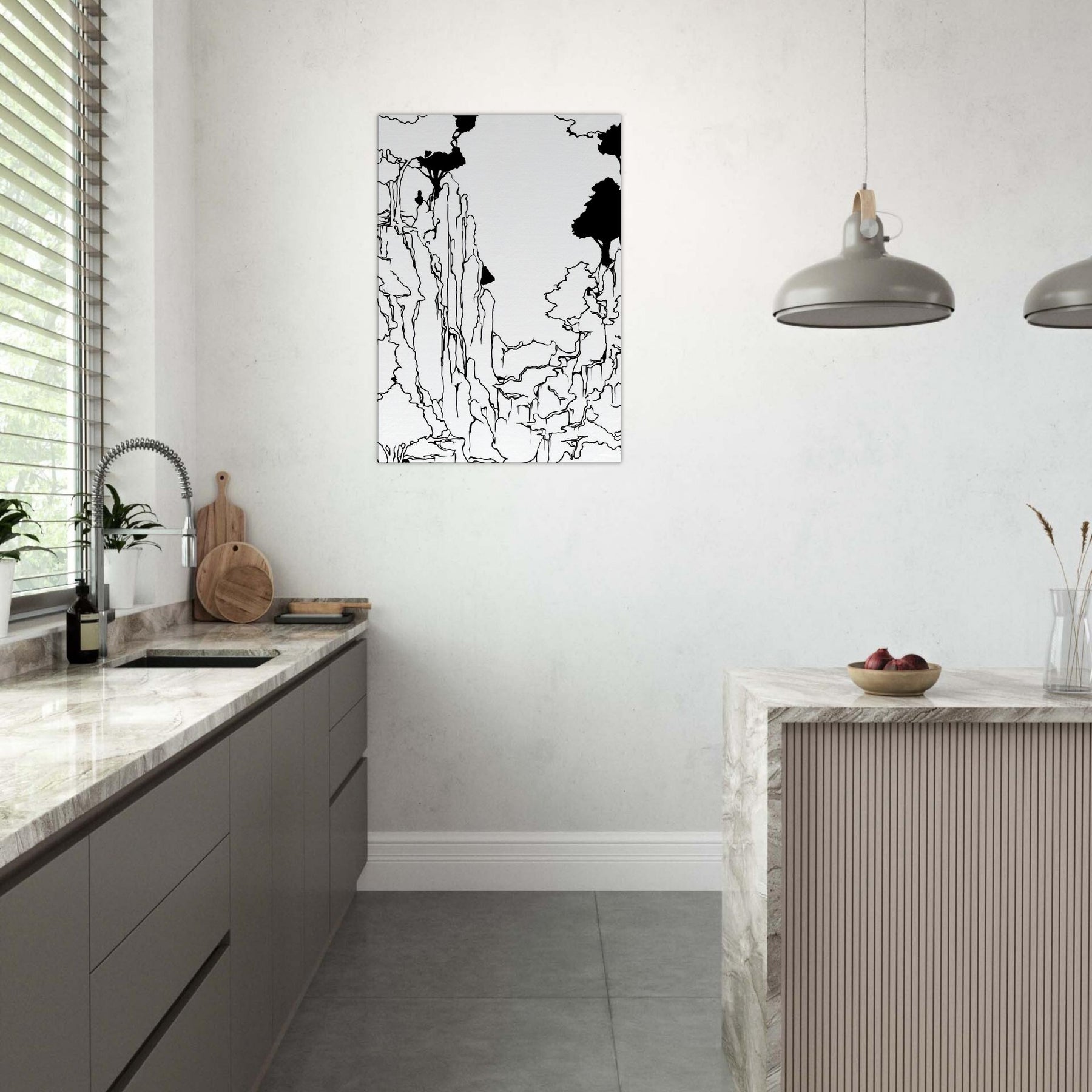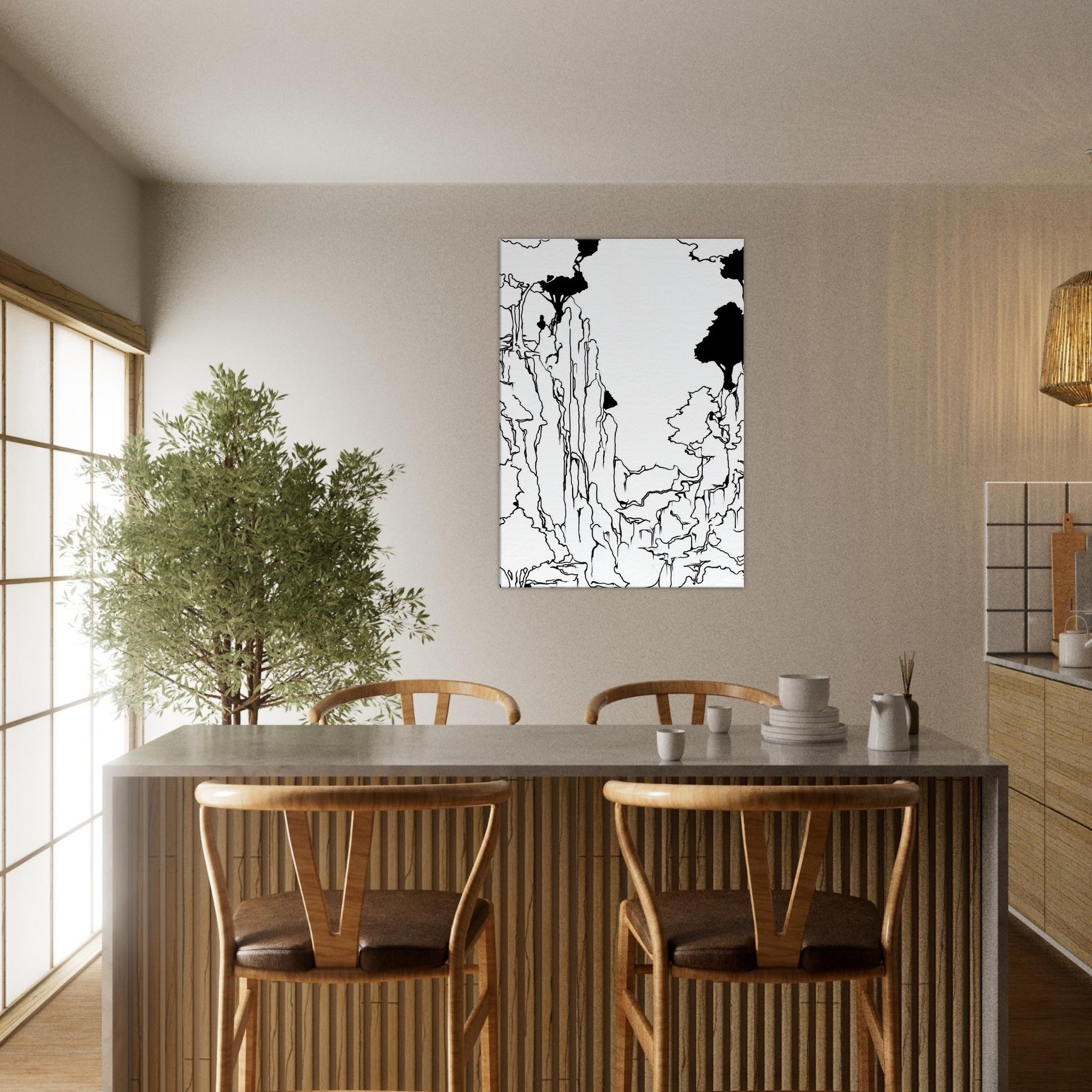 Witness the living geometry of the Jungle in a refined line drawing that breathes with quiet gravity. This monochrome study traces treetop silhouettes and serrated rock forms with effortless ease, turning a wall into a window where imagination roams. The bold contrasts invite light to play across your space, lending serene drama to a sofa, desk, or entryway. Crafted as a contemporary keepsake, it anchors nature’s presence in a tidy, modern home an invitation to pause, breathe, and dream.