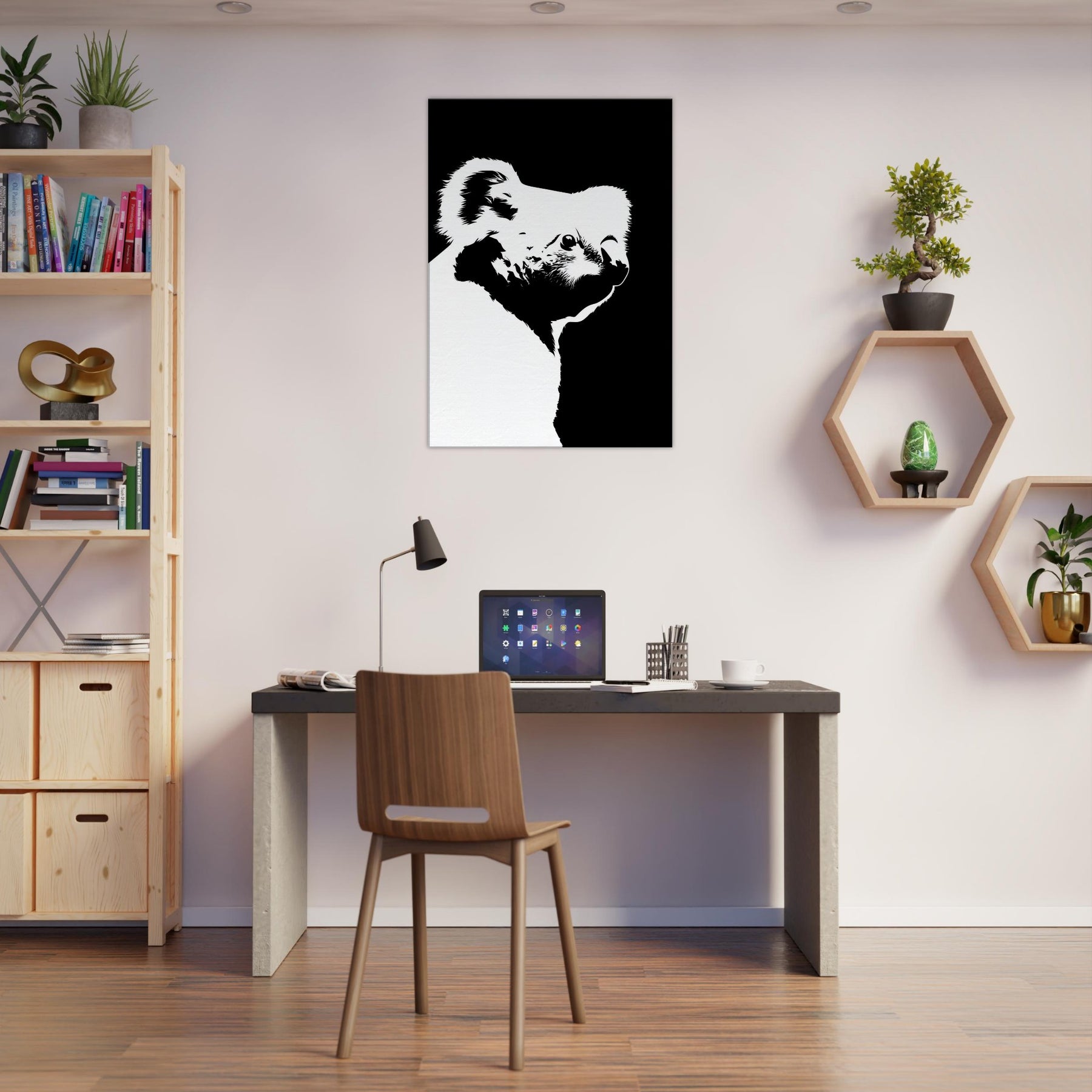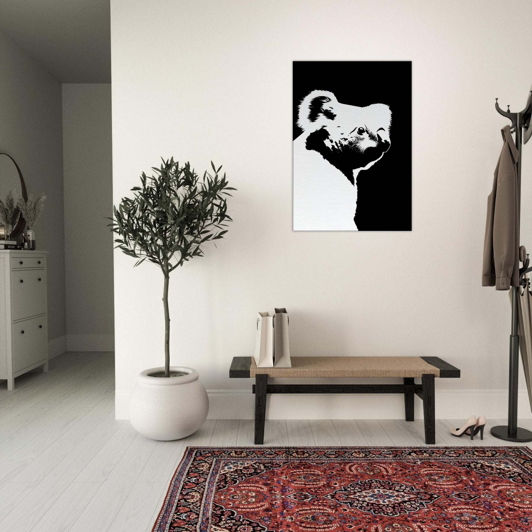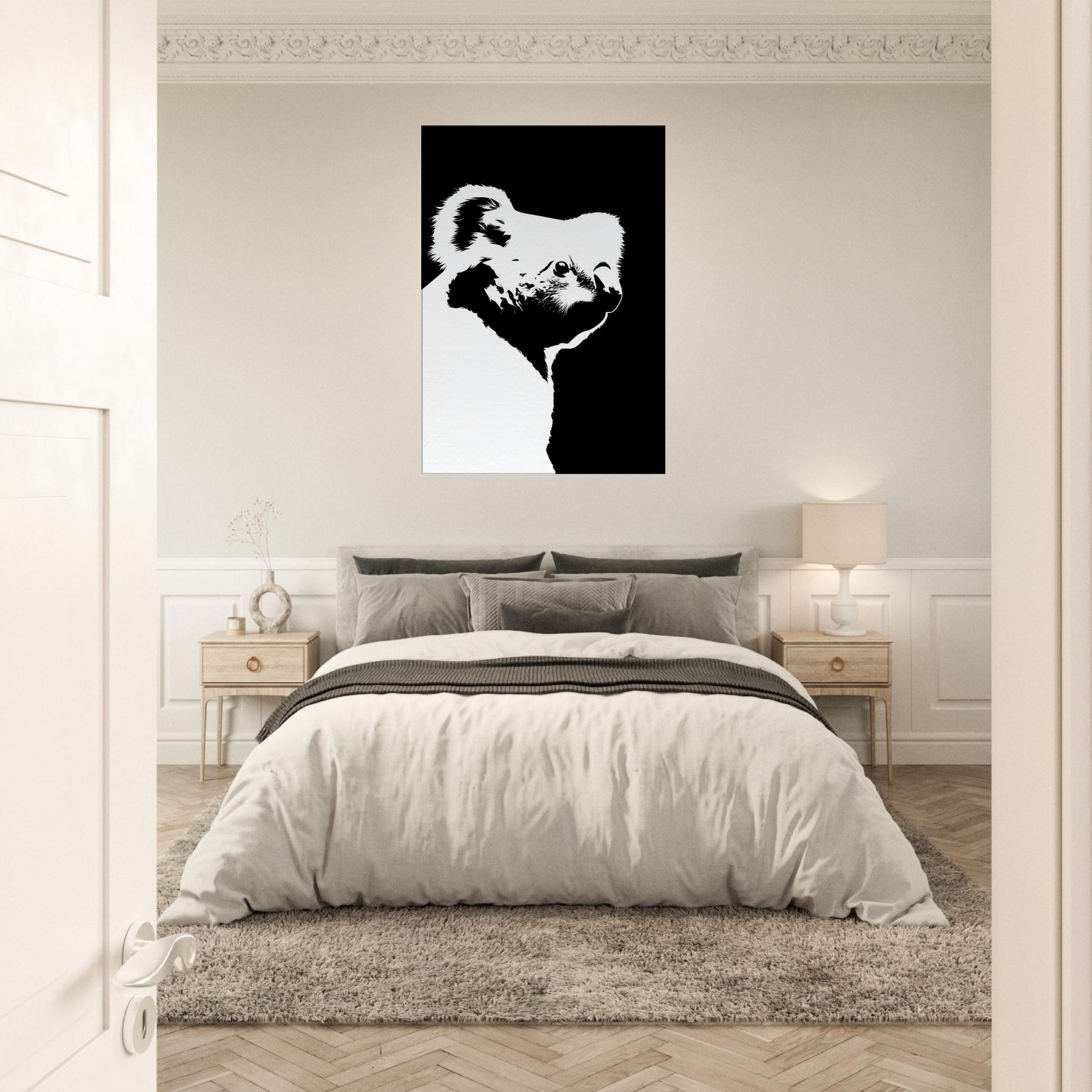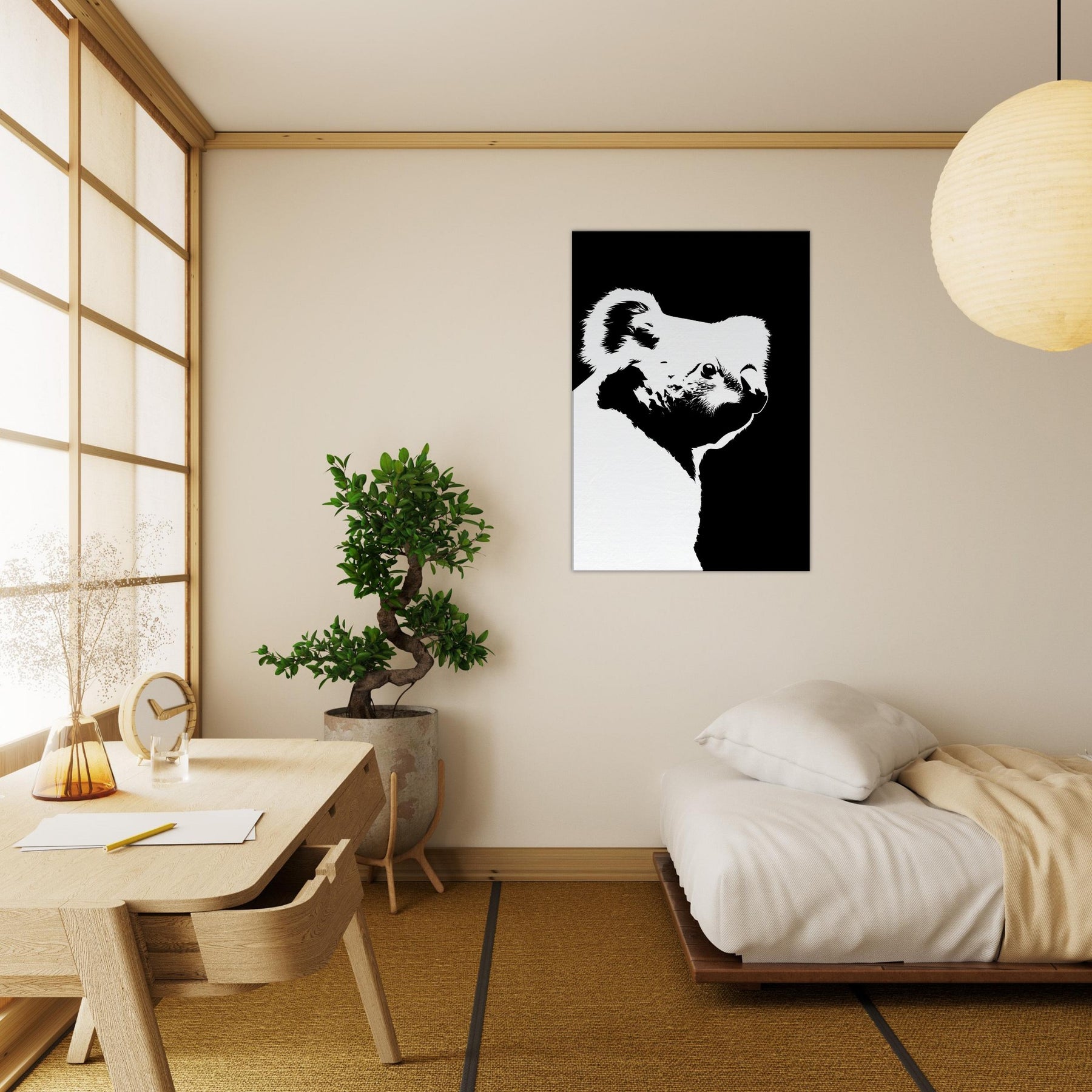 Let this Koala line drawing bring a quiet, elegant pulse to your living space. The bold black and white contrast, rendered in clean, continuous lines, suggests both innocence and wonder as if the forest has been sketched into your walls. It pairs best with muted furniture and natural textures, turning a corner into a moment of calm. The primary subject Koala gazes with a gentle, knowing smile, inviting reflection and conversation. This wall art cultivates a serene, contemporary atmosphere perfect for bedrooms, lounges, or studies seeking softer edges and clarity.