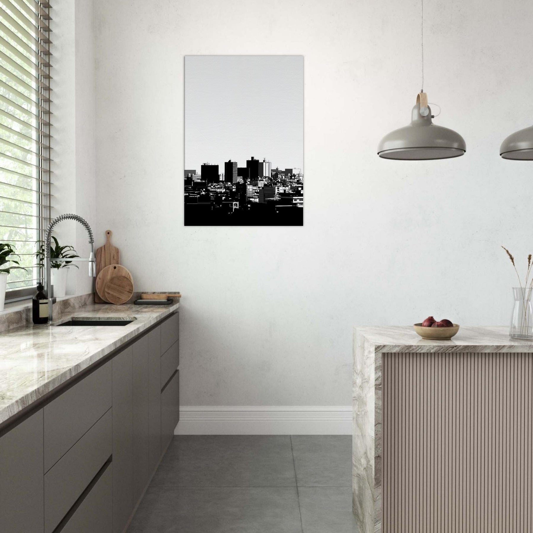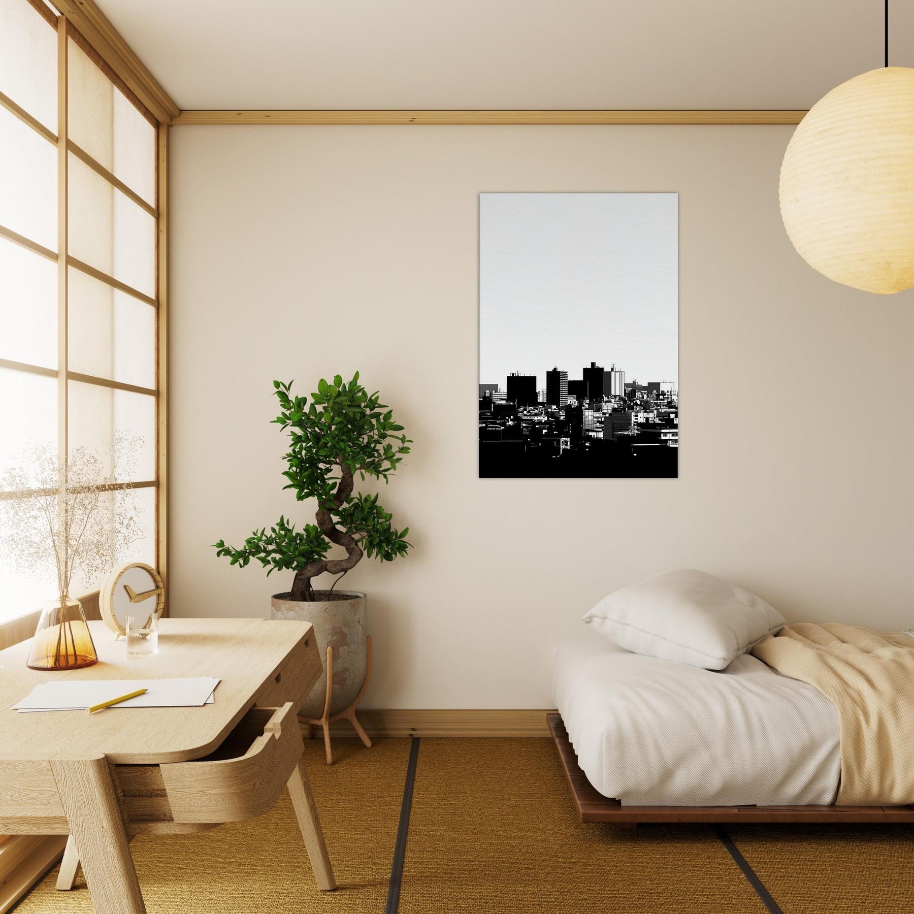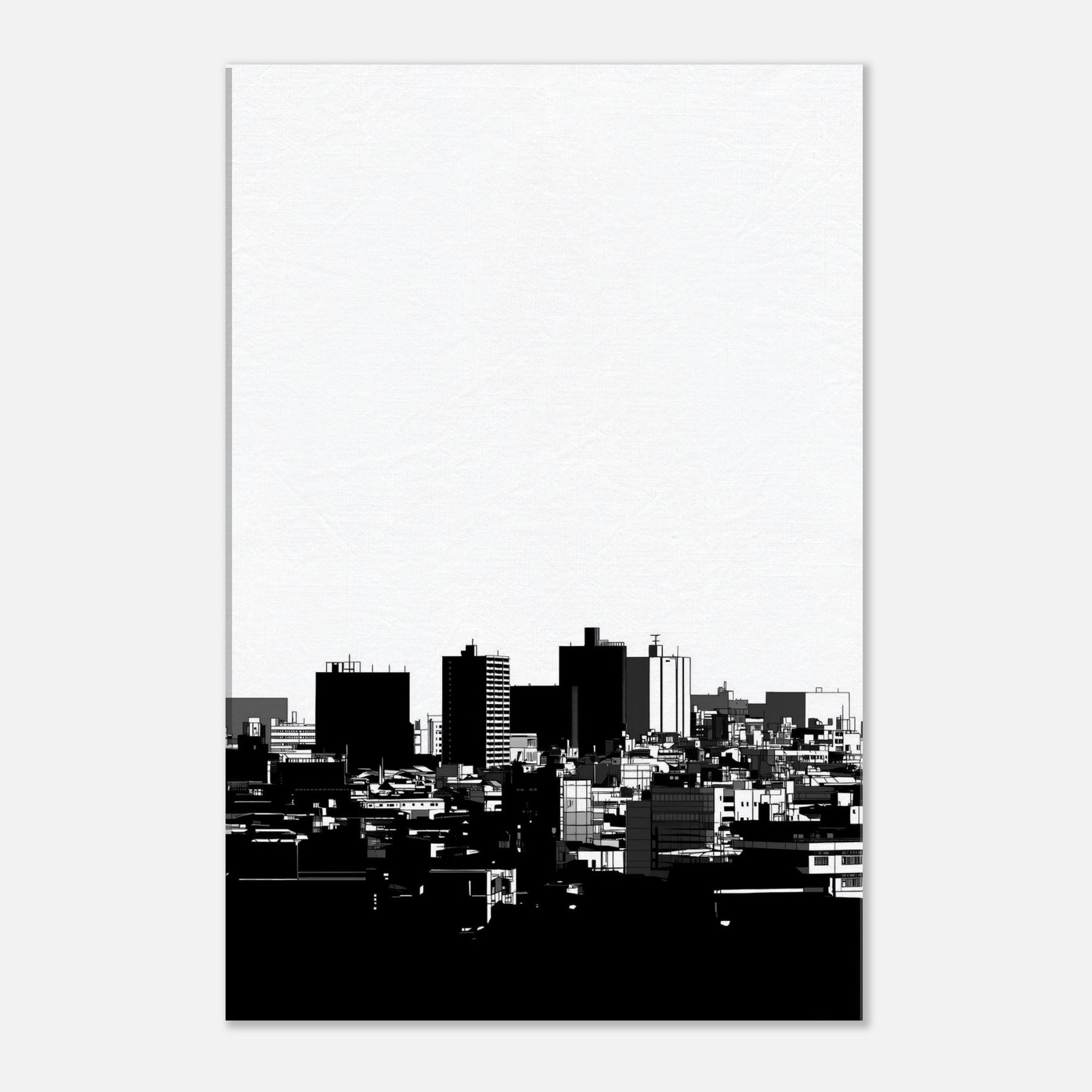 Kyoto in clean, confident line art, an urbanscape reduced to its essential silhouettes. The high contrast black and white gathers the rhythm of distant rooftops and modern forms into a quiet, contemplative skyline. This Kyoto study invites calm into any room, its spare lines catching morning light and evening shadows with equal grace. Hang it in a living room, hallway, or office to anchor a palette of creams and charcoals, granting breadth, focus, and a whisper of timeless city serenity.