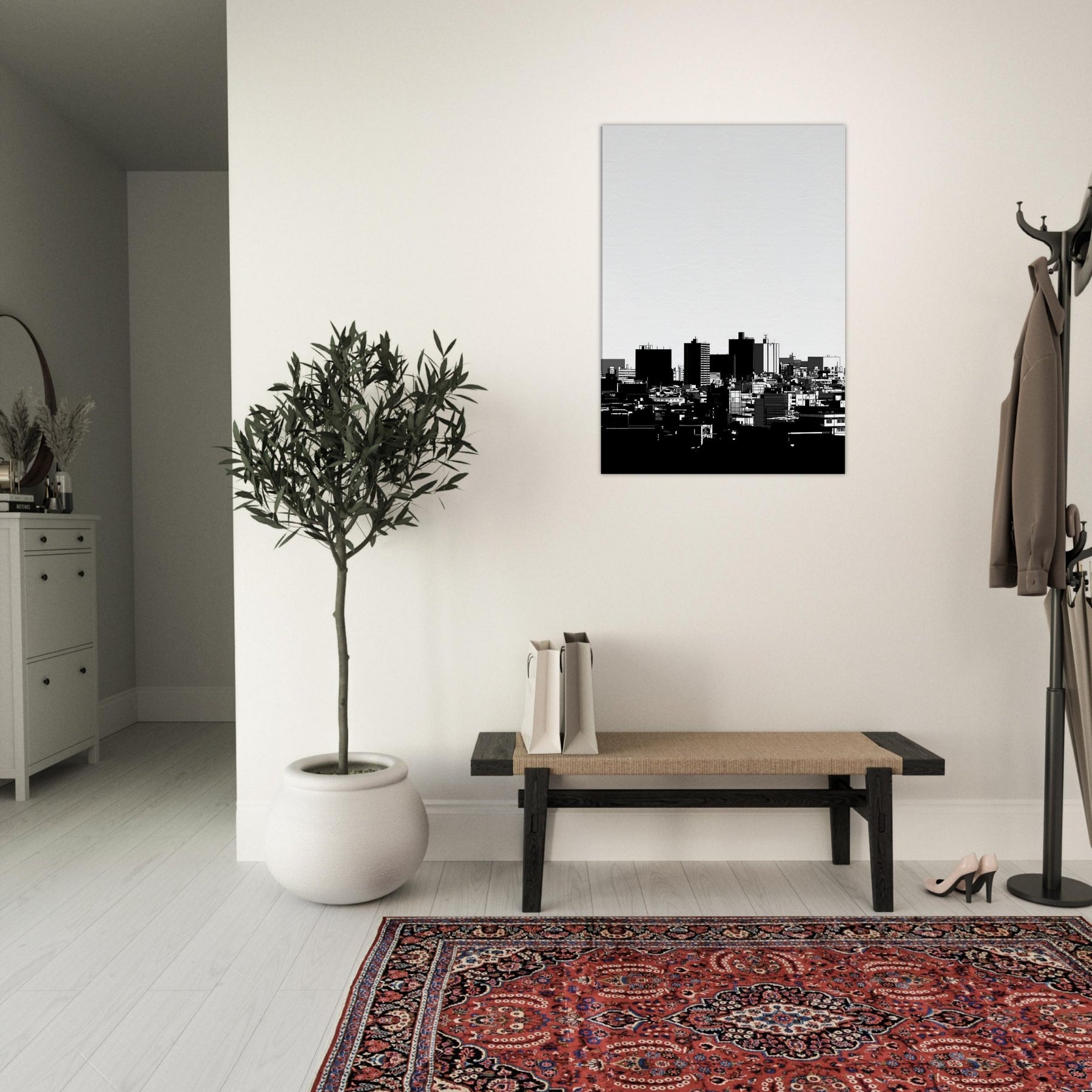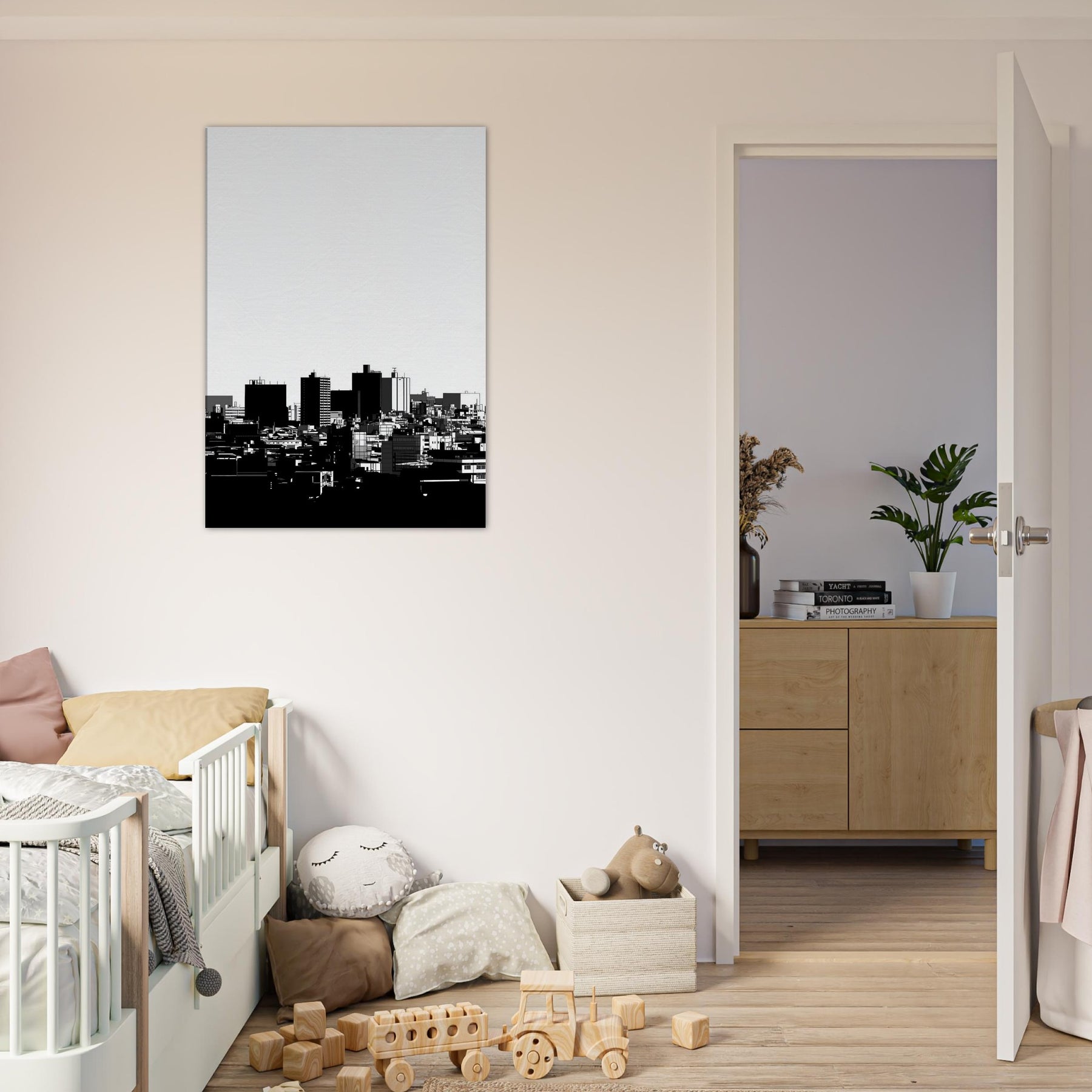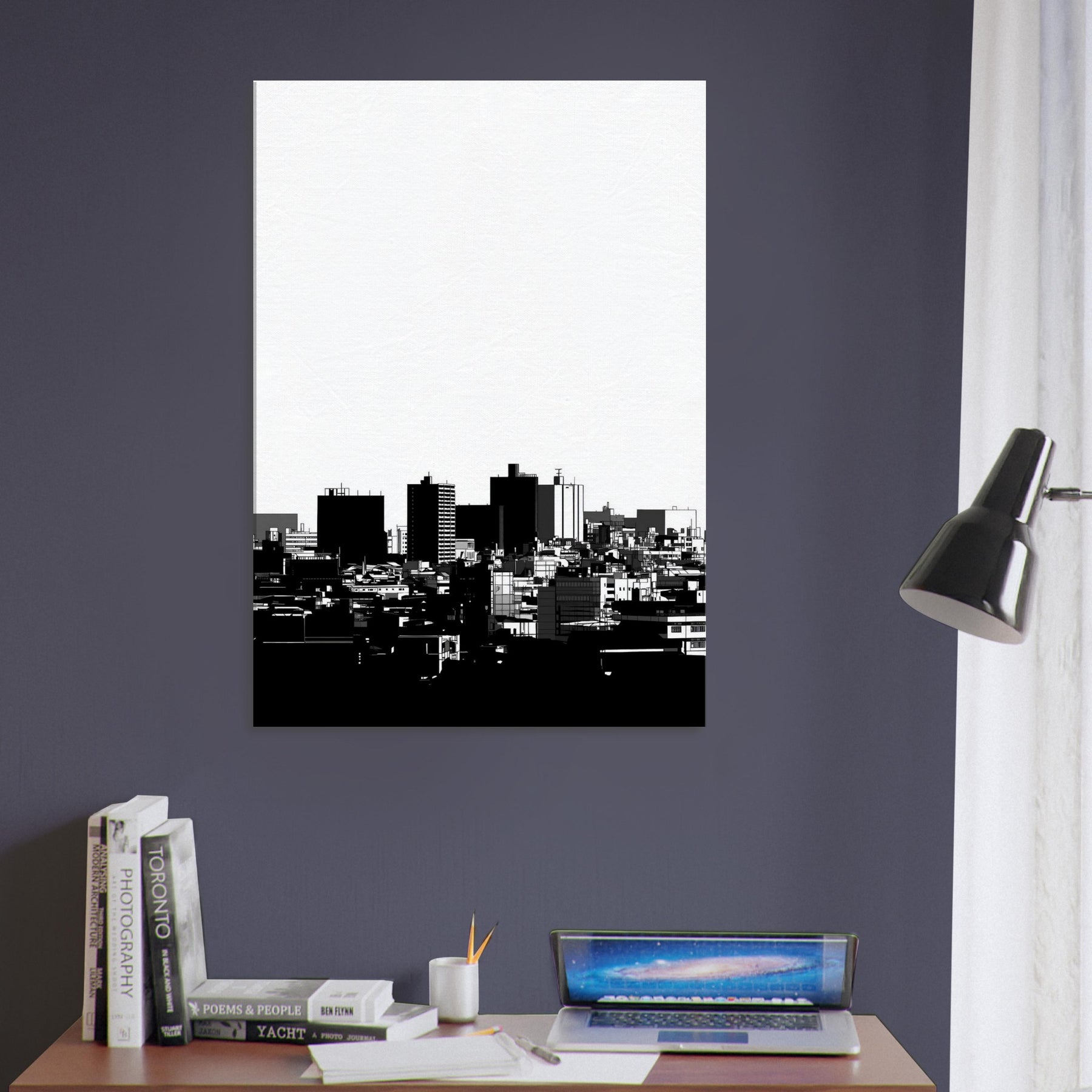 Kyoto in clean, confident line art, an urbanscape reduced to its essential silhouettes. The high contrast black and white gathers the rhythm of distant rooftops and modern forms into a quiet, contemplative skyline. This Kyoto study invites calm into any room, its spare lines catching morning light and evening shadows with equal grace. Hang it in a living room, hallway, or office to anchor a palette of creams and charcoals, granting breadth, focus, and a whisper of timeless city serenity.