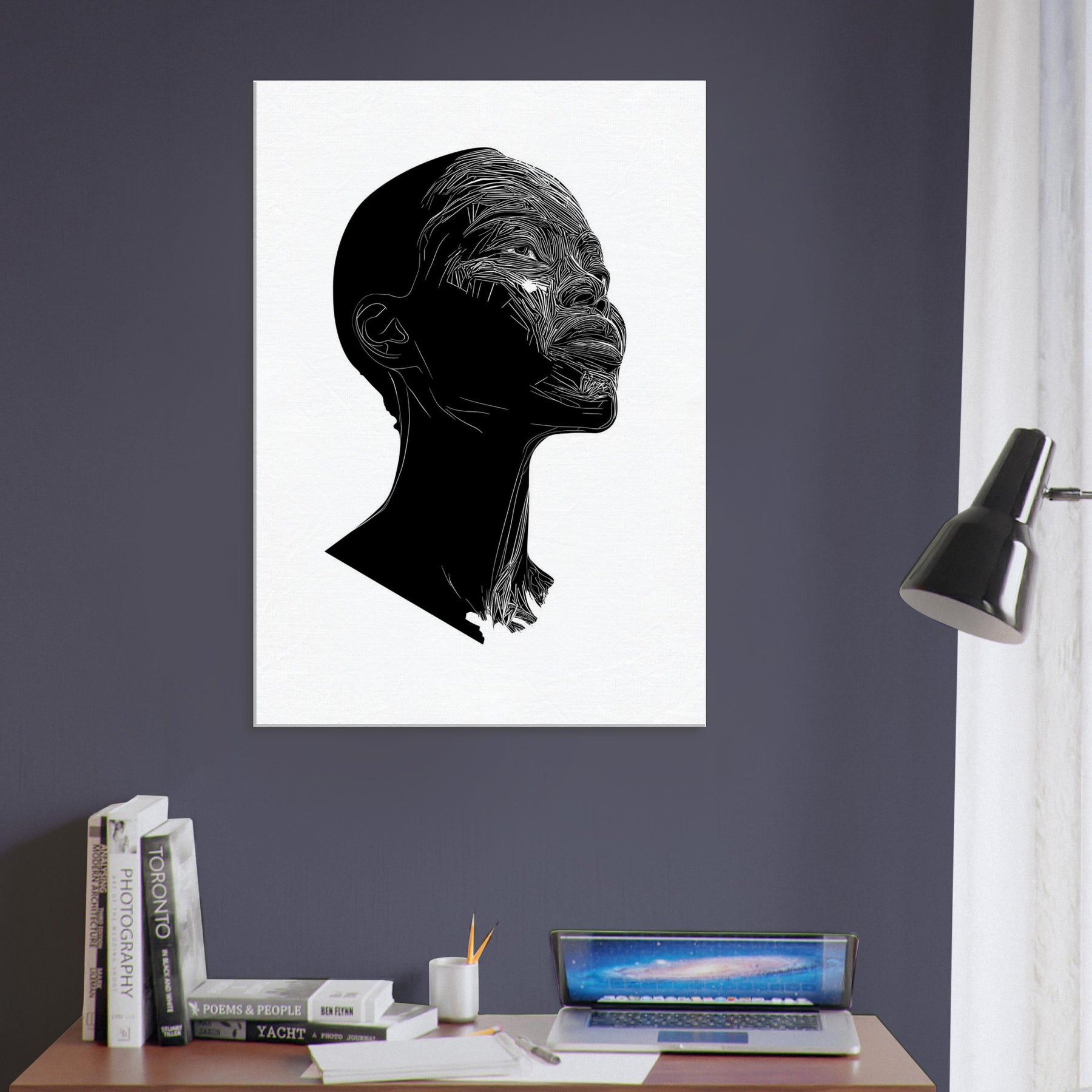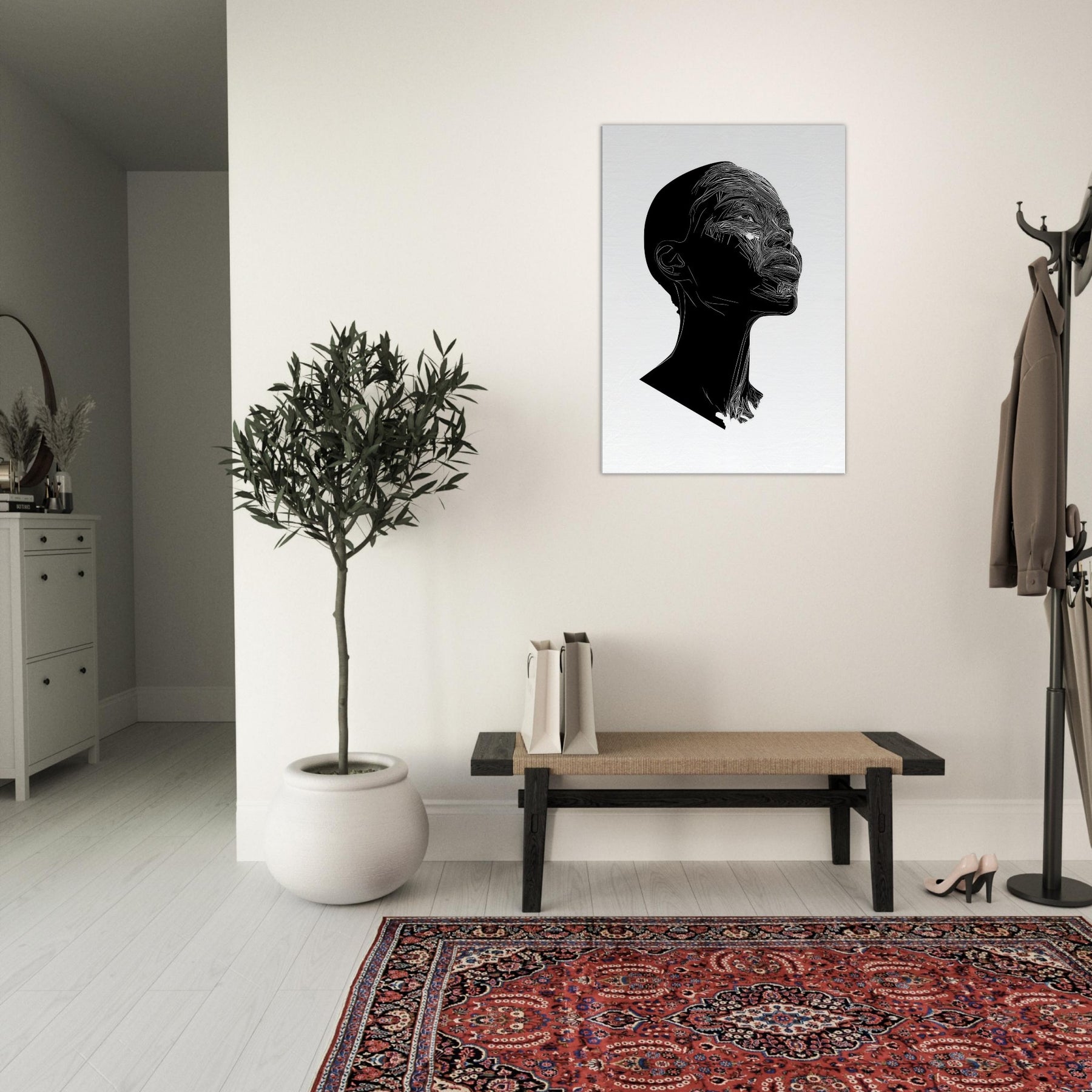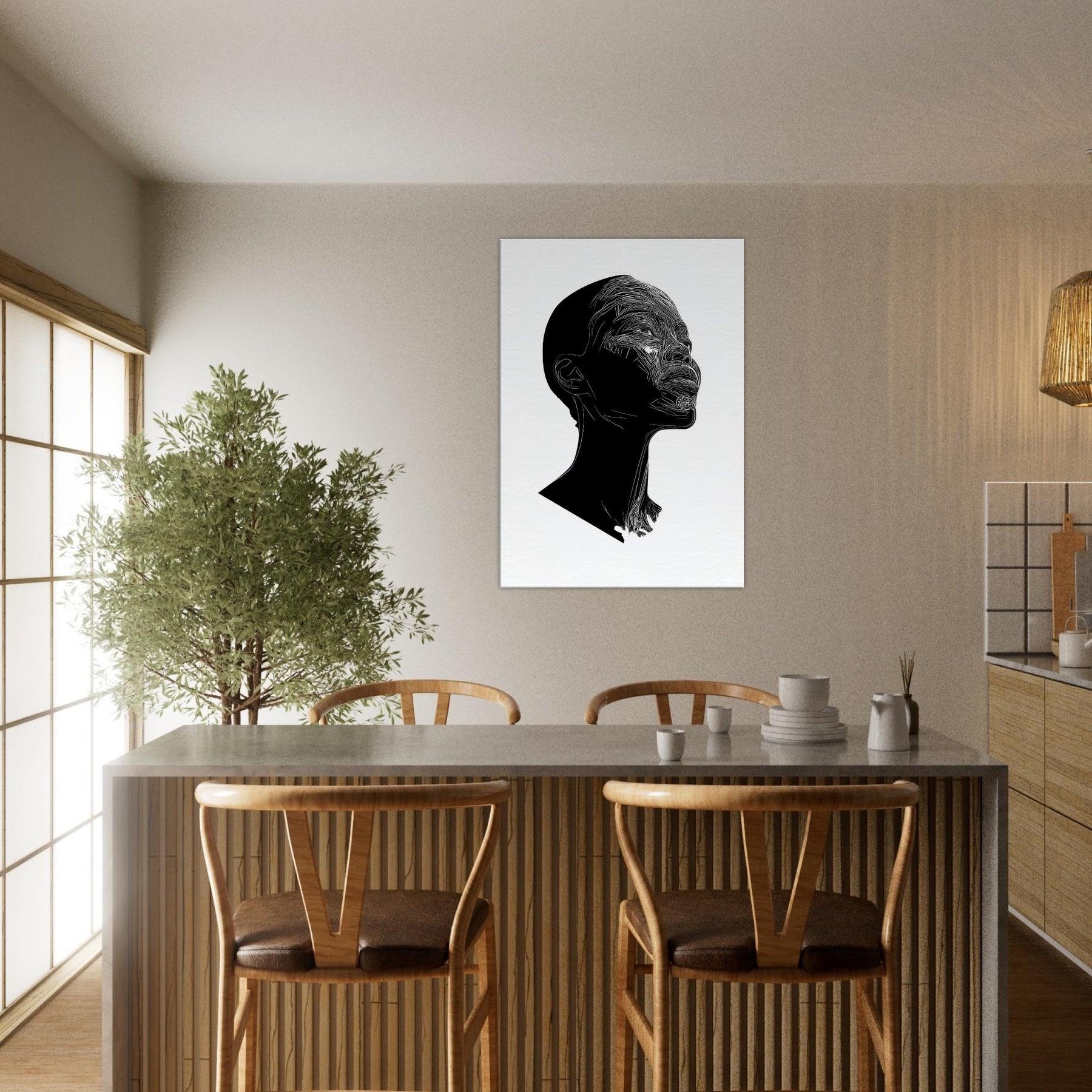 This African Woman unfolds in delicate linework, a study in restraint and expression. The stark black silhouette, etched with pale, glimmering threads, captures a quiet dignity and a whisper of ascent. Framed in negative space, the piece exudes modern elegance, inviting light to play across walls and soften living spaces. It pairs best with minimalist furnishings, adds depth to a lounge, or anchors a bedroom with a contemplative mood. A timeless, sculptural presence that feels both intimate and expansive.