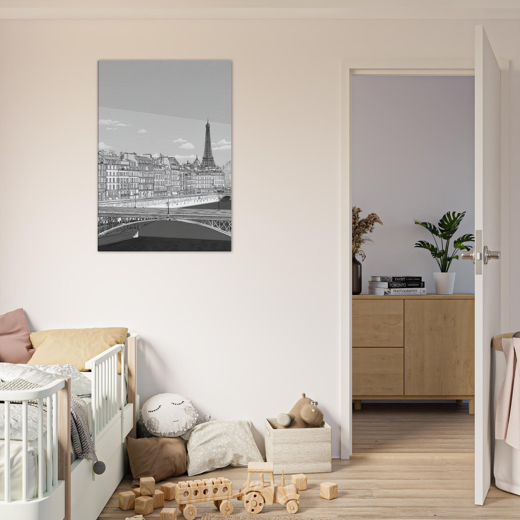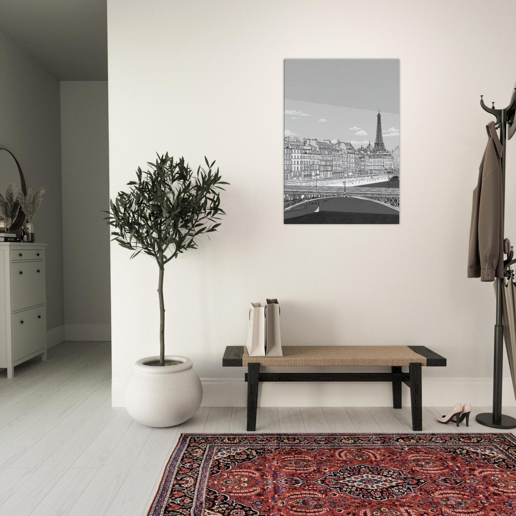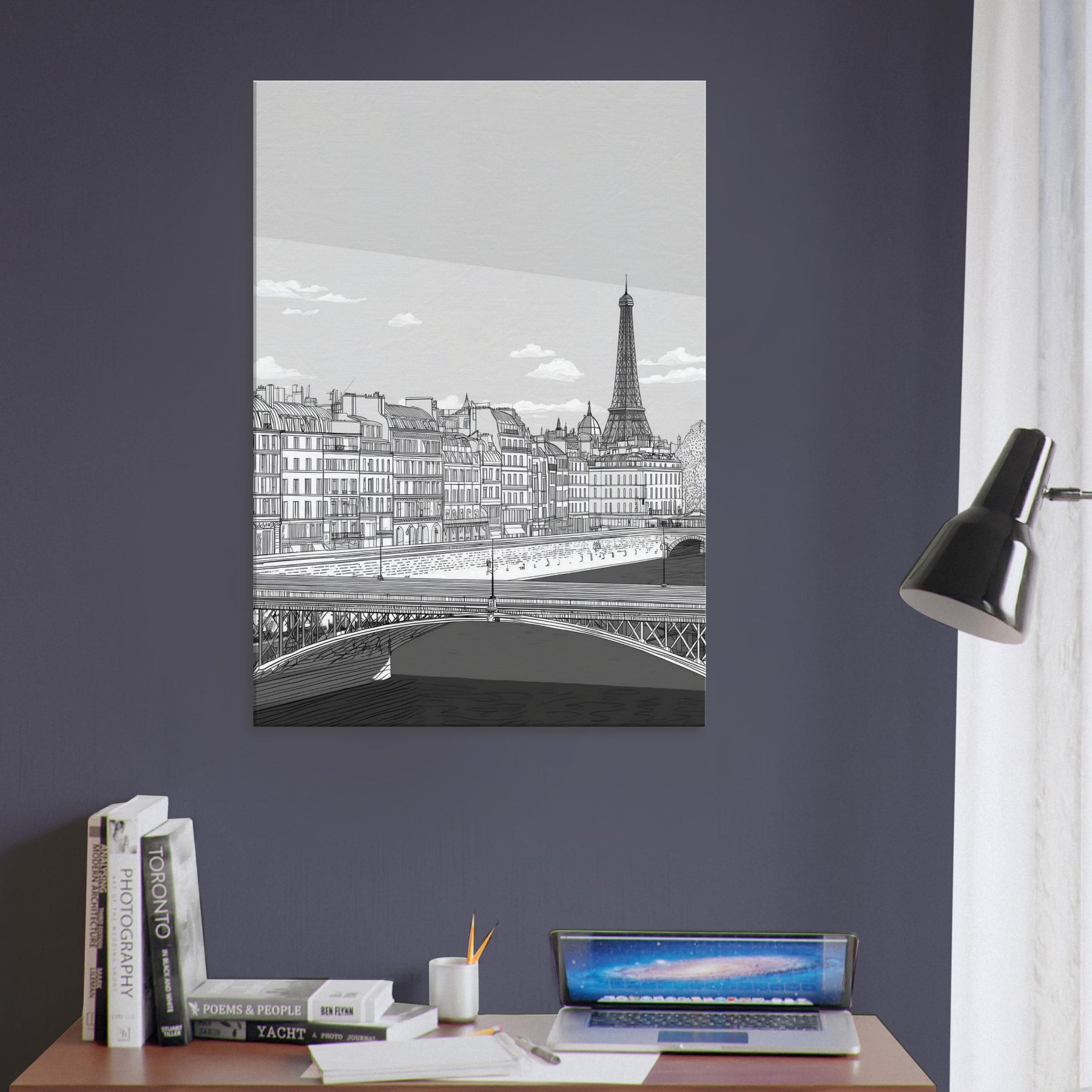 A restrained procession of Paris unfolds in clean black lines, capturing the rhythm of riverbanks, rooftops, and glistening weaves of light without a drop of color. This line drawing evokes dawn over the Seine, the Eiffel Tower tracing a delicate arc above graceful façades. The atmosphere is quiet and contemplative, inviting a sense of space and memory into your room. Hung above a sofa or in a hallway, it lends Parisian elegance and urban poetry to everyday living.