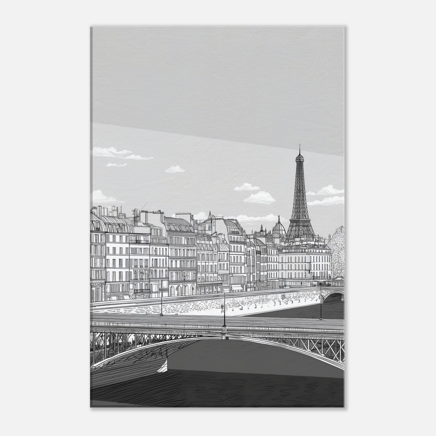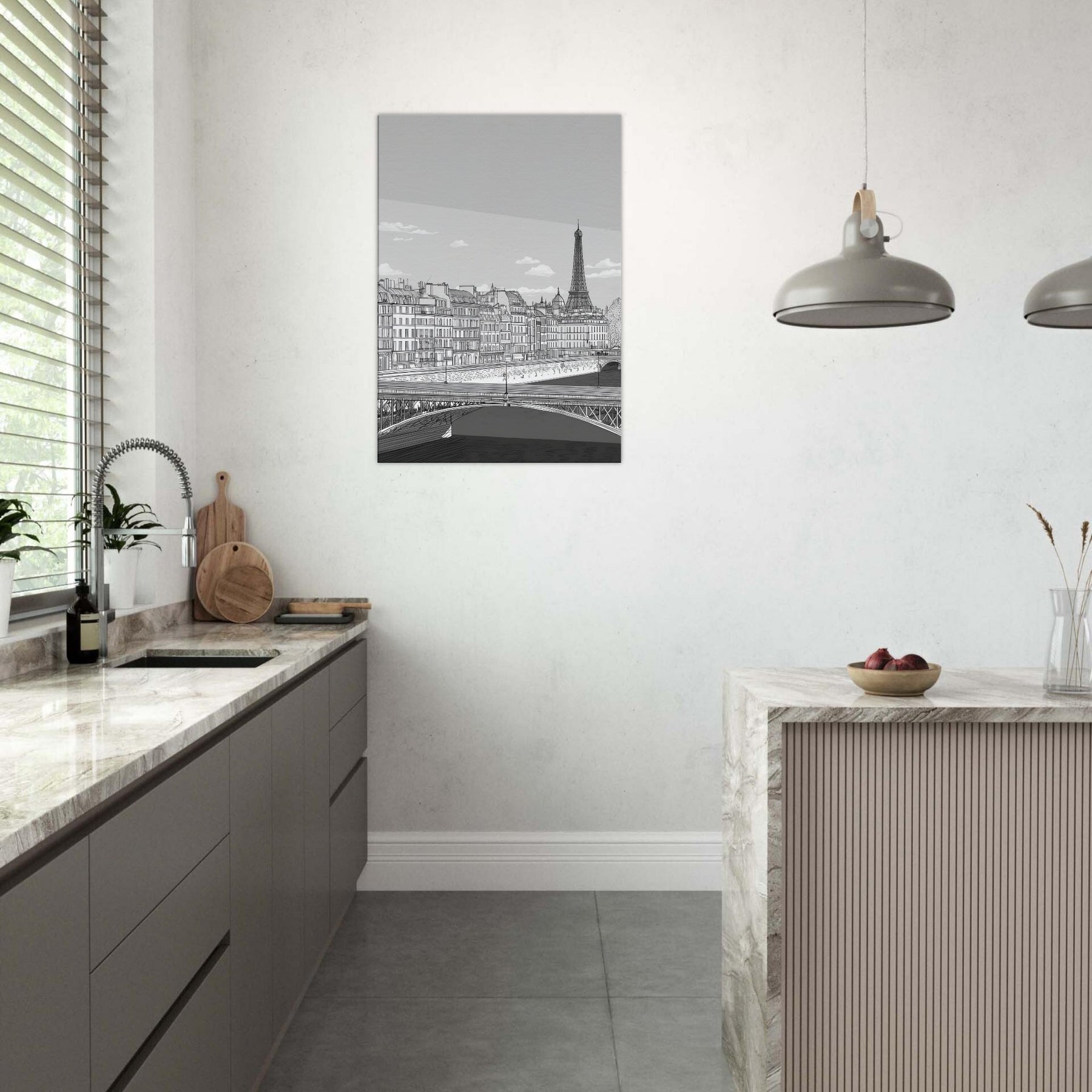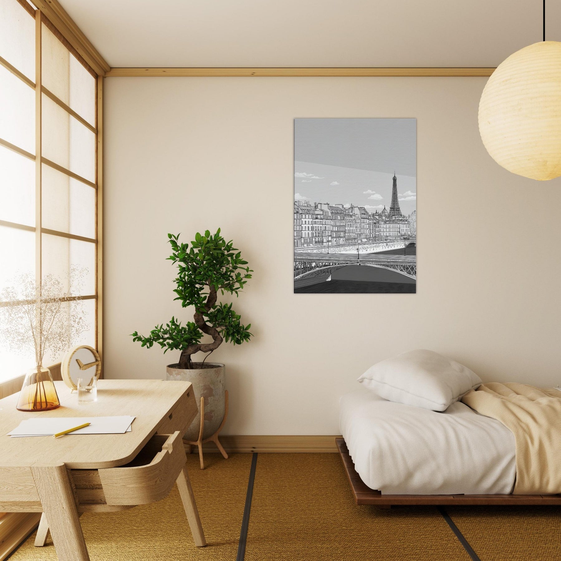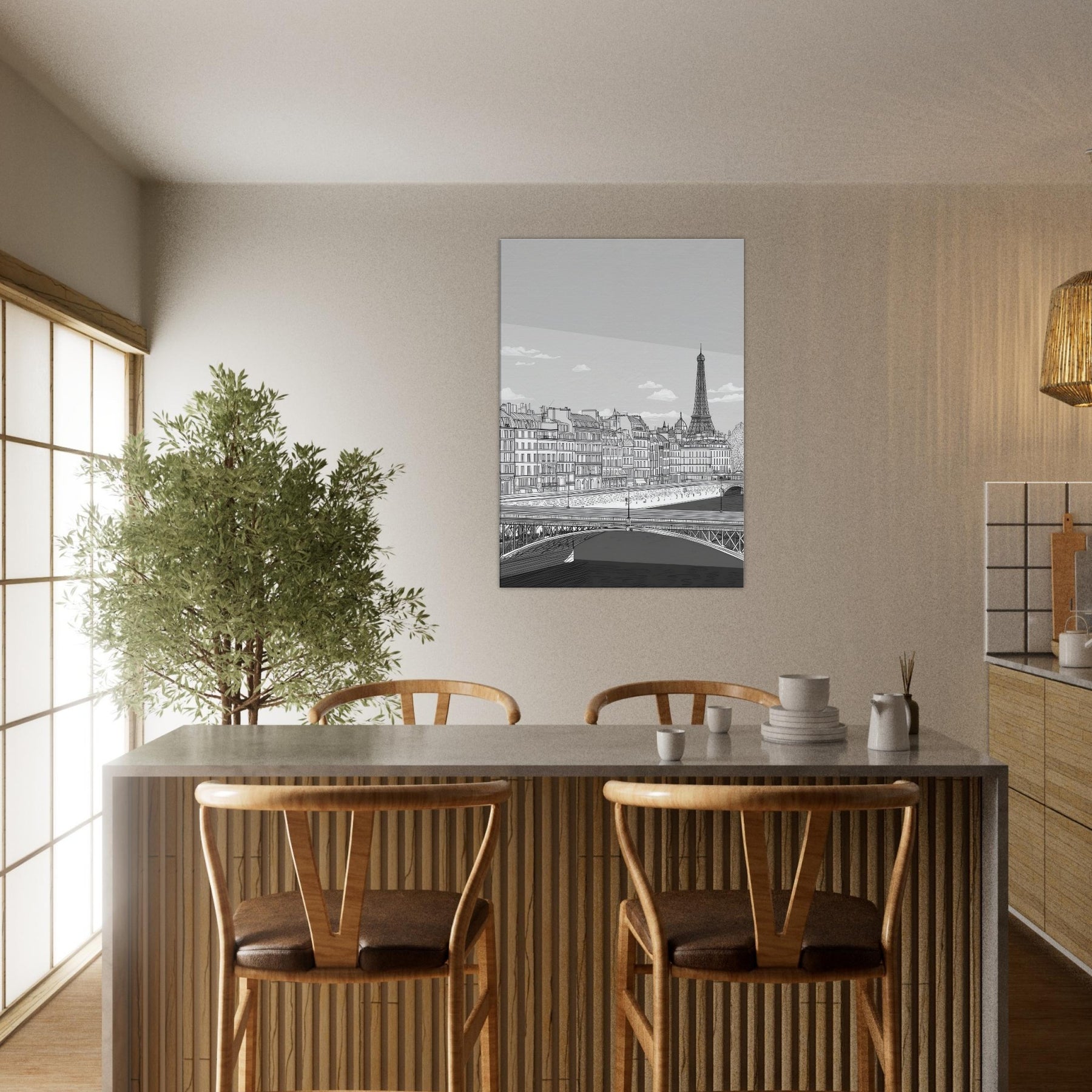 A restrained procession of Paris unfolds in clean black lines, capturing the rhythm of riverbanks, rooftops, and glistening weaves of light without a drop of color. This line drawing evokes dawn over the Seine, the Eiffel Tower tracing a delicate arc above graceful façades. The atmosphere is quiet and contemplative, inviting a sense of space and memory into your room. Hung above a sofa or in a hallway, it lends Parisian elegance and urban poetry to everyday living.
