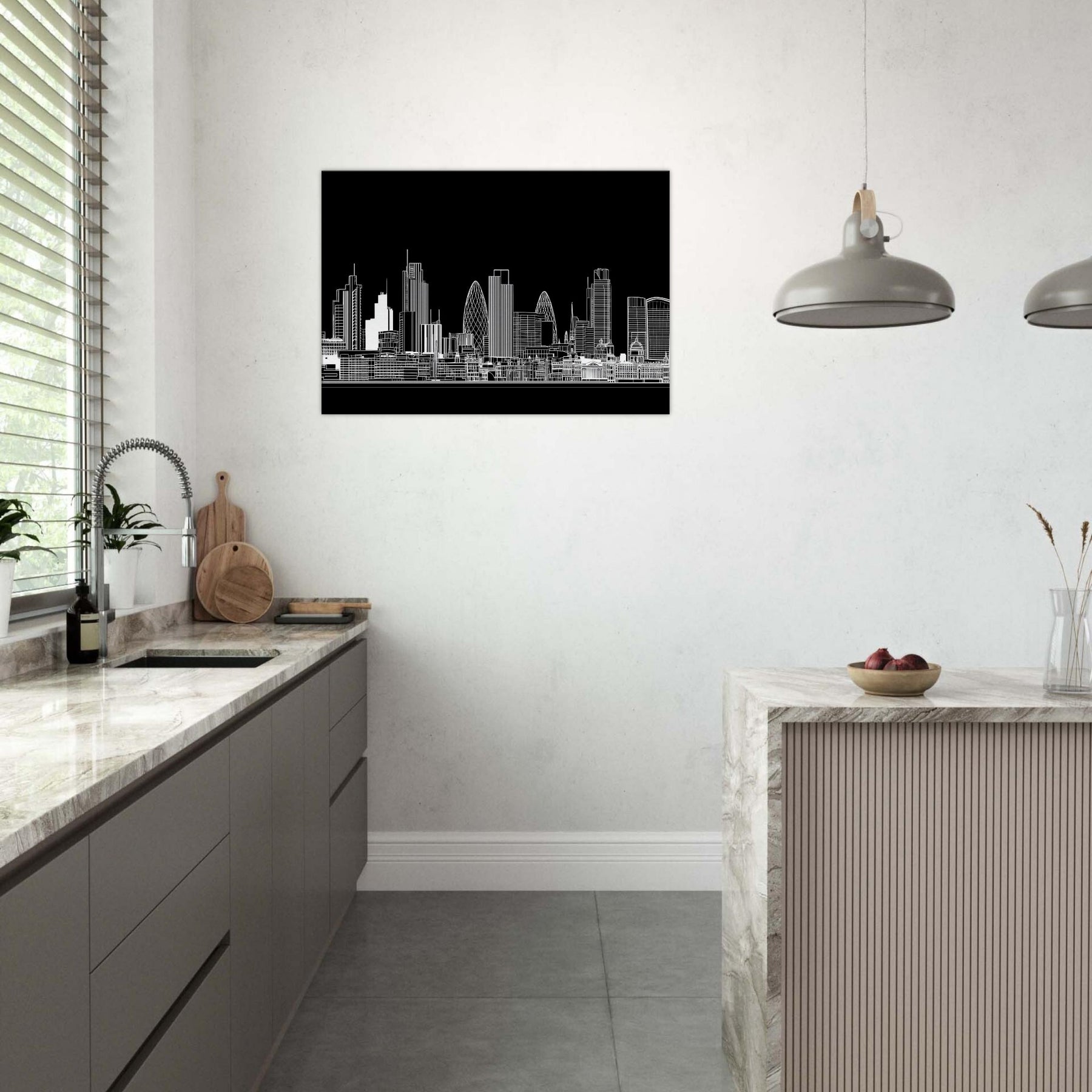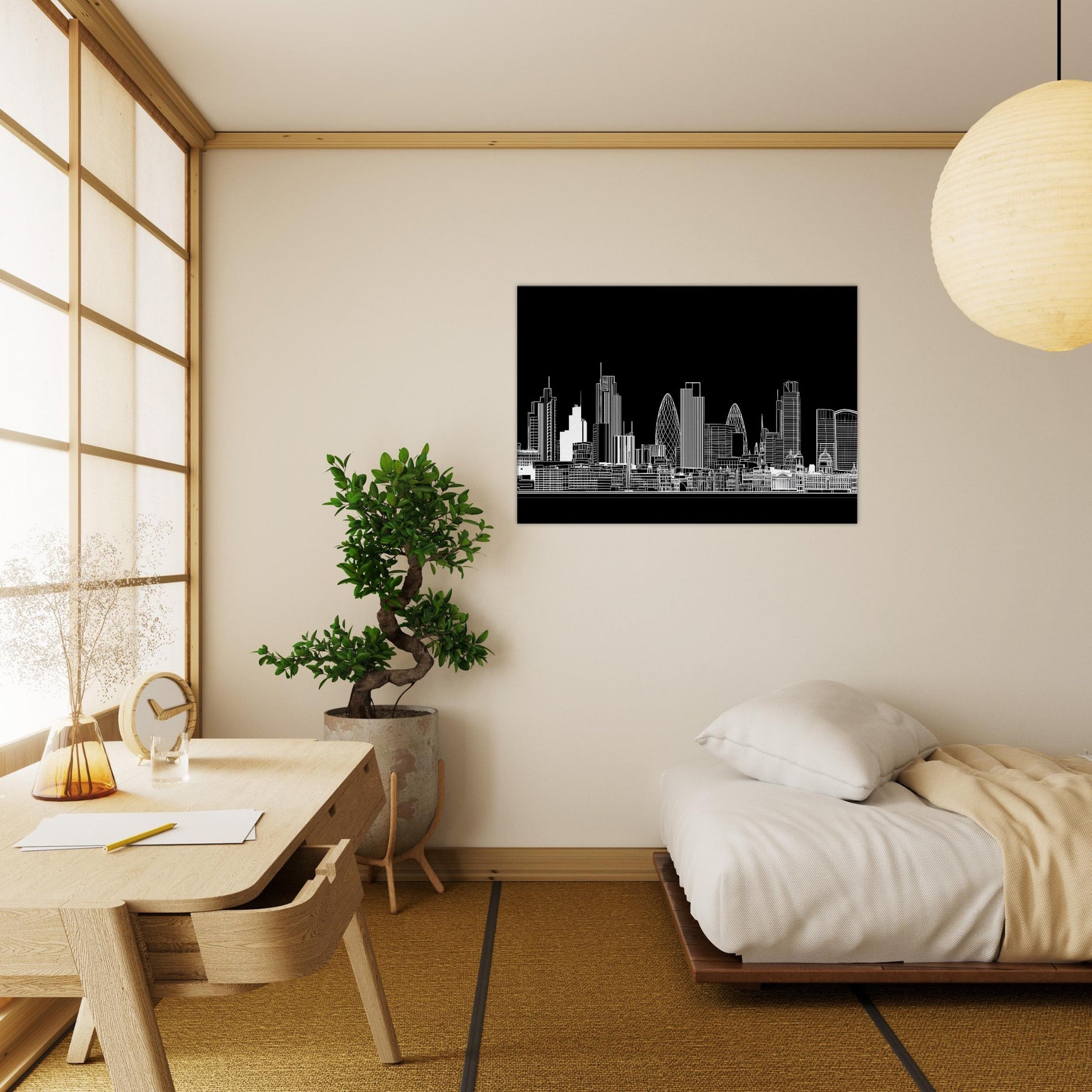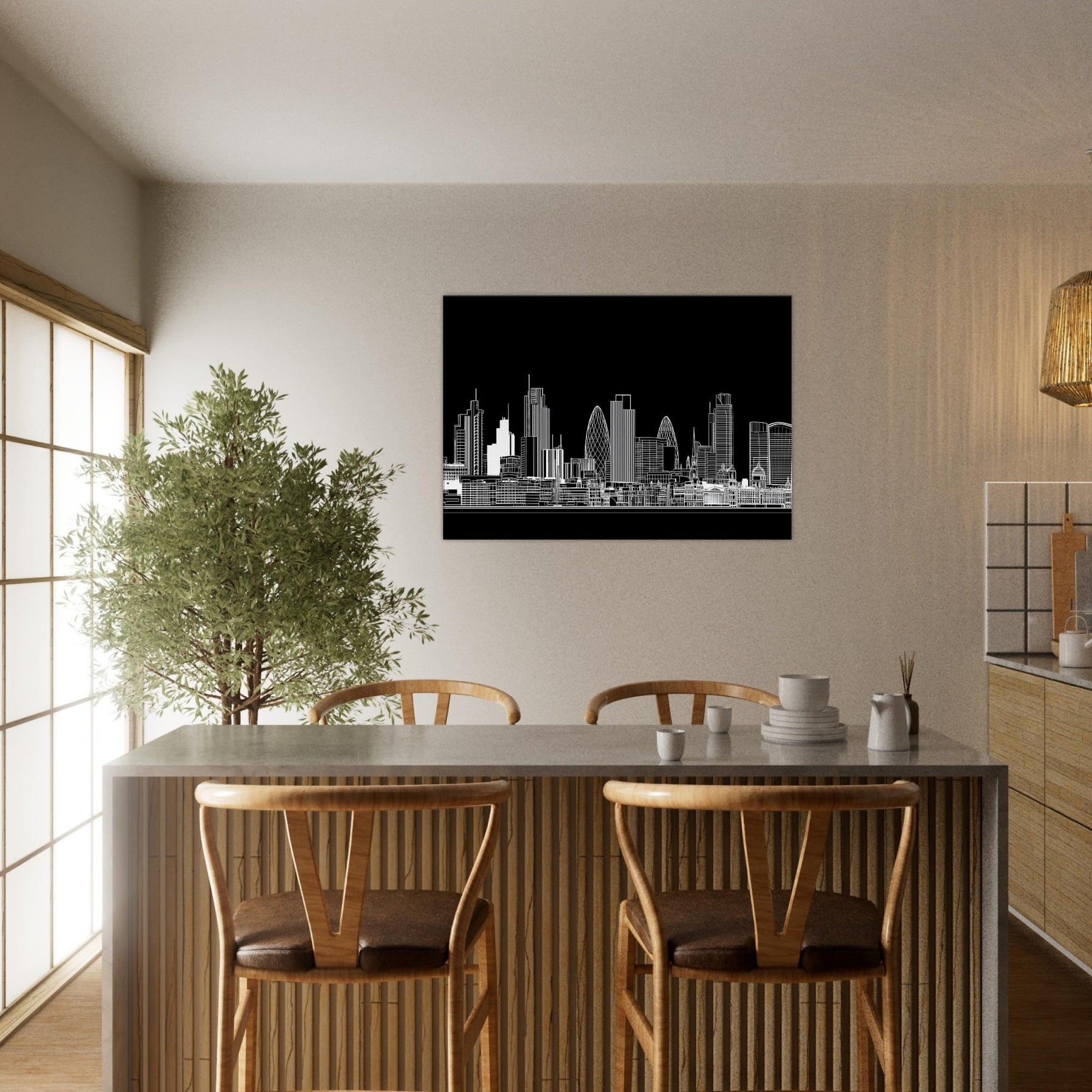 London comes alive in a single, graceful sweep of line. This monochrome skyline blends iconic silhouettes with a quiet rhythm, inviting calm reflection and urban wonder. The crisp white contour against a dark wall creates a living poem perfect above a sofa, in a hallway, or a study where focus and style meet. Feel the memory of brick and glass in the spaces between lines, and let the atmosphere transform a room into a sophisticated harbor for thoughts, travel, and memories.