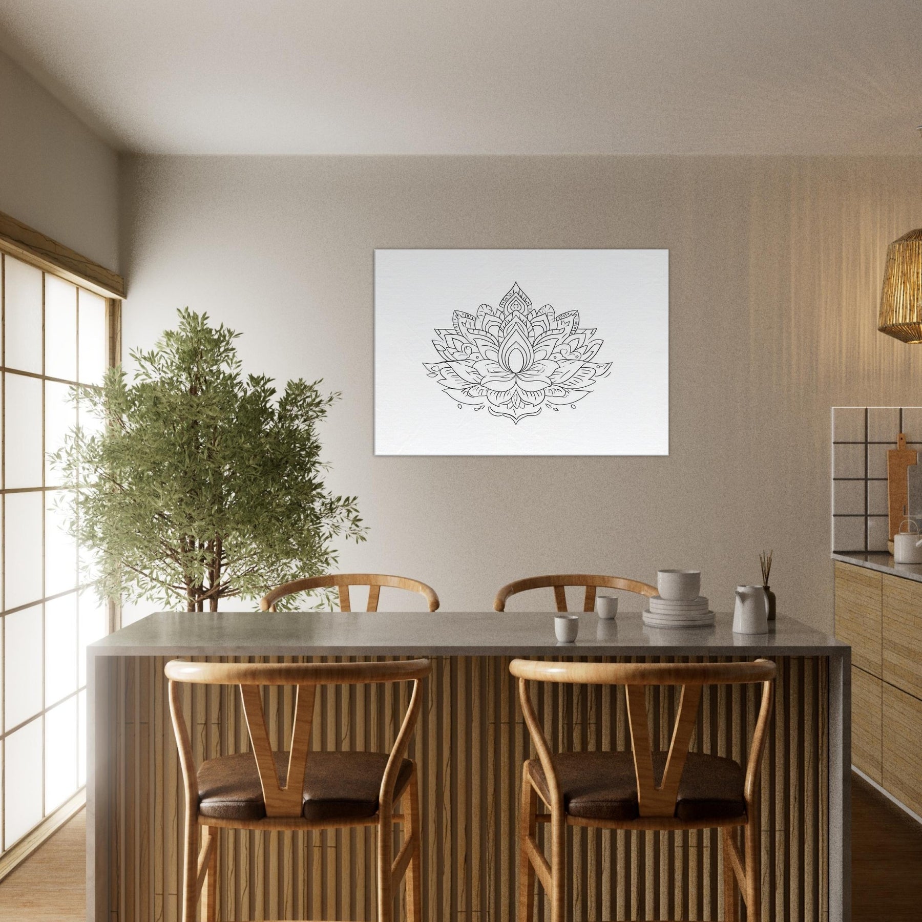 Invite Lakshmi into your space with this graceful line drawing, a portal of calm and abundance. Clean, flowing lines form a lotus centered crown that radiates balance, enriching living rooms, bedrooms, and studios with quiet energy. The mystical silhouette invites mindful pauses, soft light, and lingering conversations as the walls glow with considered elegance. Printed on pristine paper, it pairs beautifully with warm woods and airy neutrals, elevating every space with serene refinement and timeless grace.