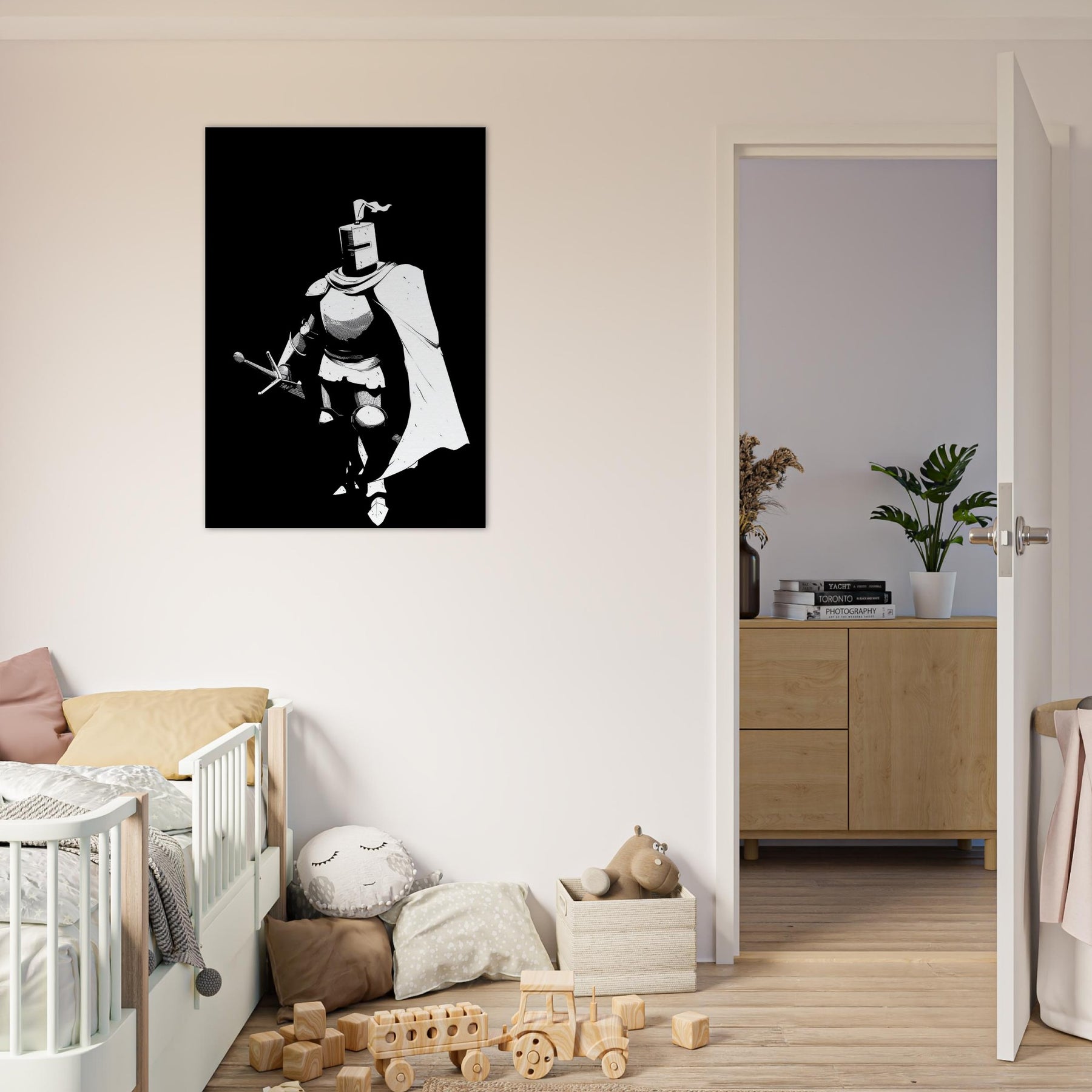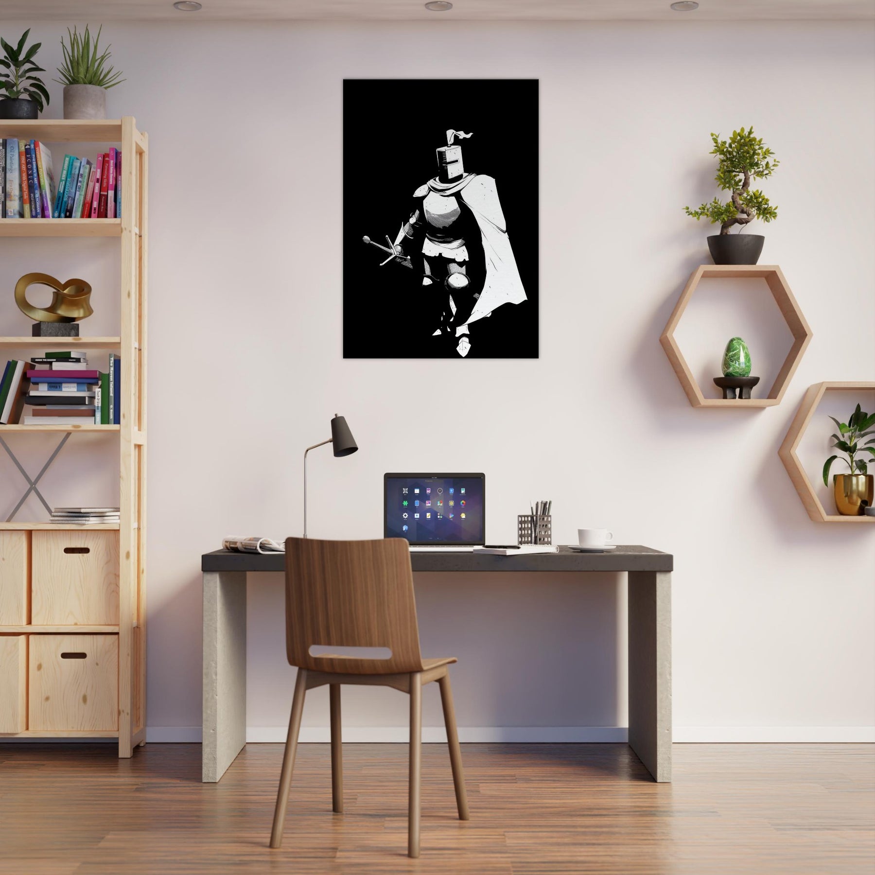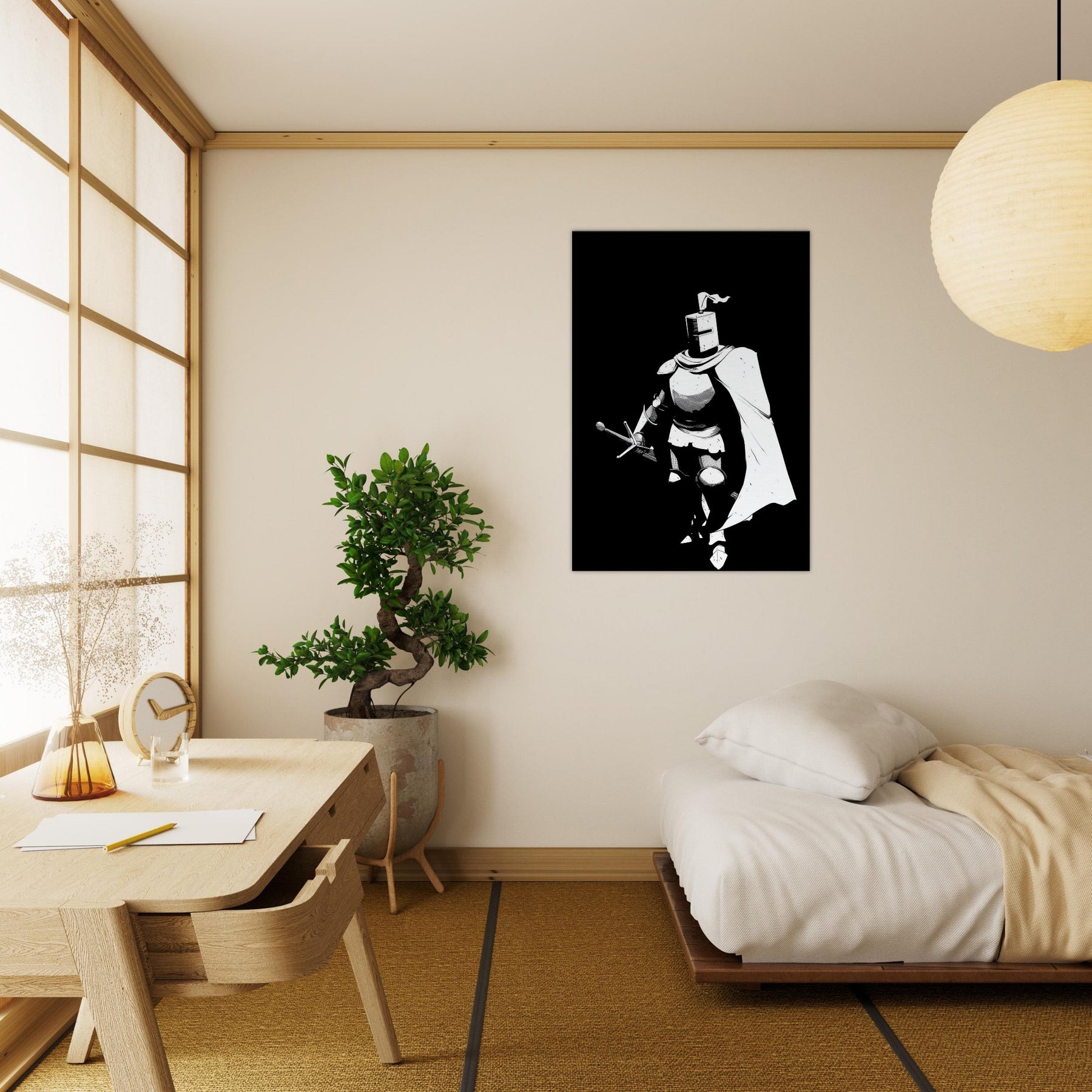 Immerse your space in the stoic glow of a Gallant Knight in Shining Armor, captured in bold line art that breathes with quiet motion. The stark black and white composition distills legend into a single, elegant silhouette, a reminder of courage and grace in a modern home. Perfect for a living room or study, this piece adds dramatic contrast and refined drama without overpowering the space. Its graphic clarity invites contemplation, turning walls into a gallery of myth, strategy, and steady, aspirational energy.