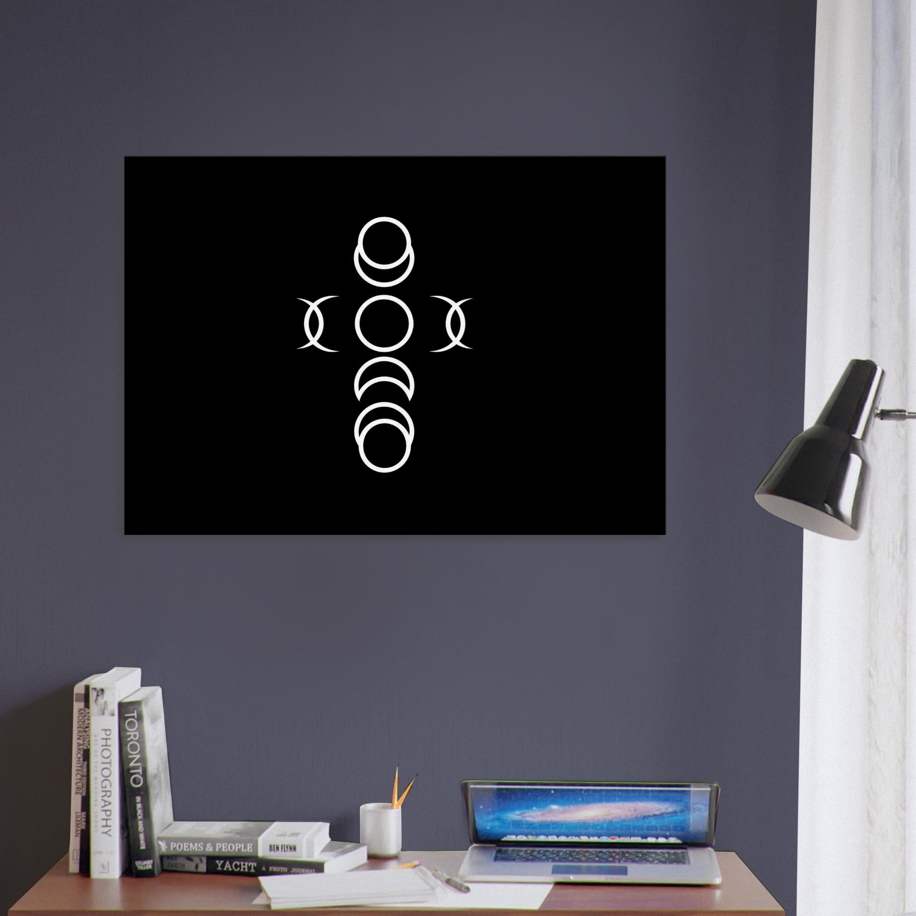 Let the Moon Phases drift across your wall, a quiet study in balance and breath. This line art composition circles the night’s soft cycles in clean, luminous crescents, landing gently in a moonlit cross that feels timeless and meditative. The stark black backdrop enhances every curve, inviting calm and curiosity into your living space. Hang it where you want a subtle, mystical focal point a reminder that cycles, like design, can be endlessly renewed and softly illuminated.